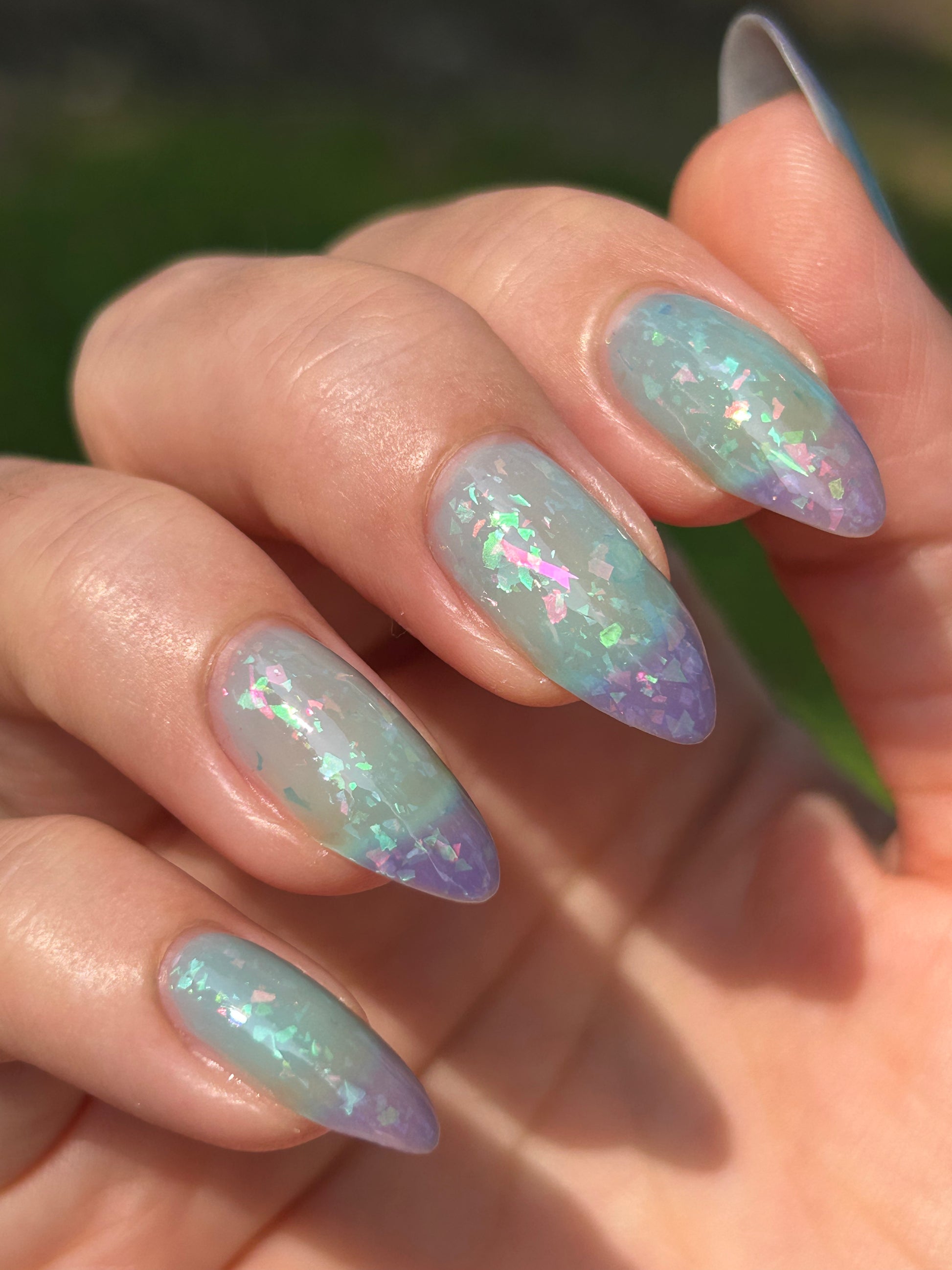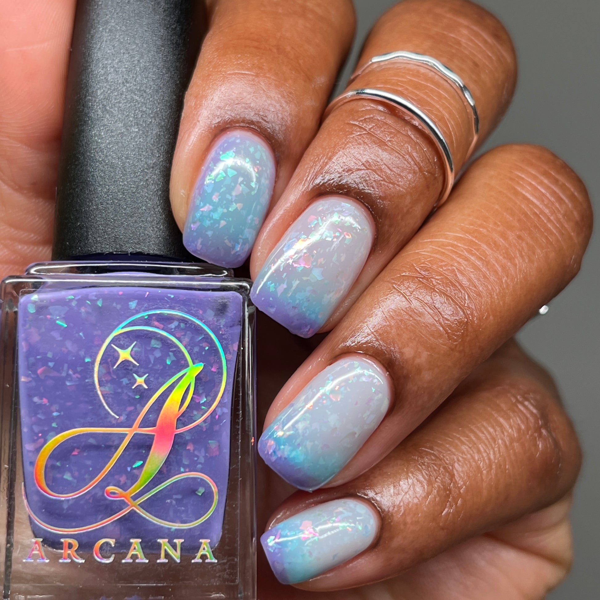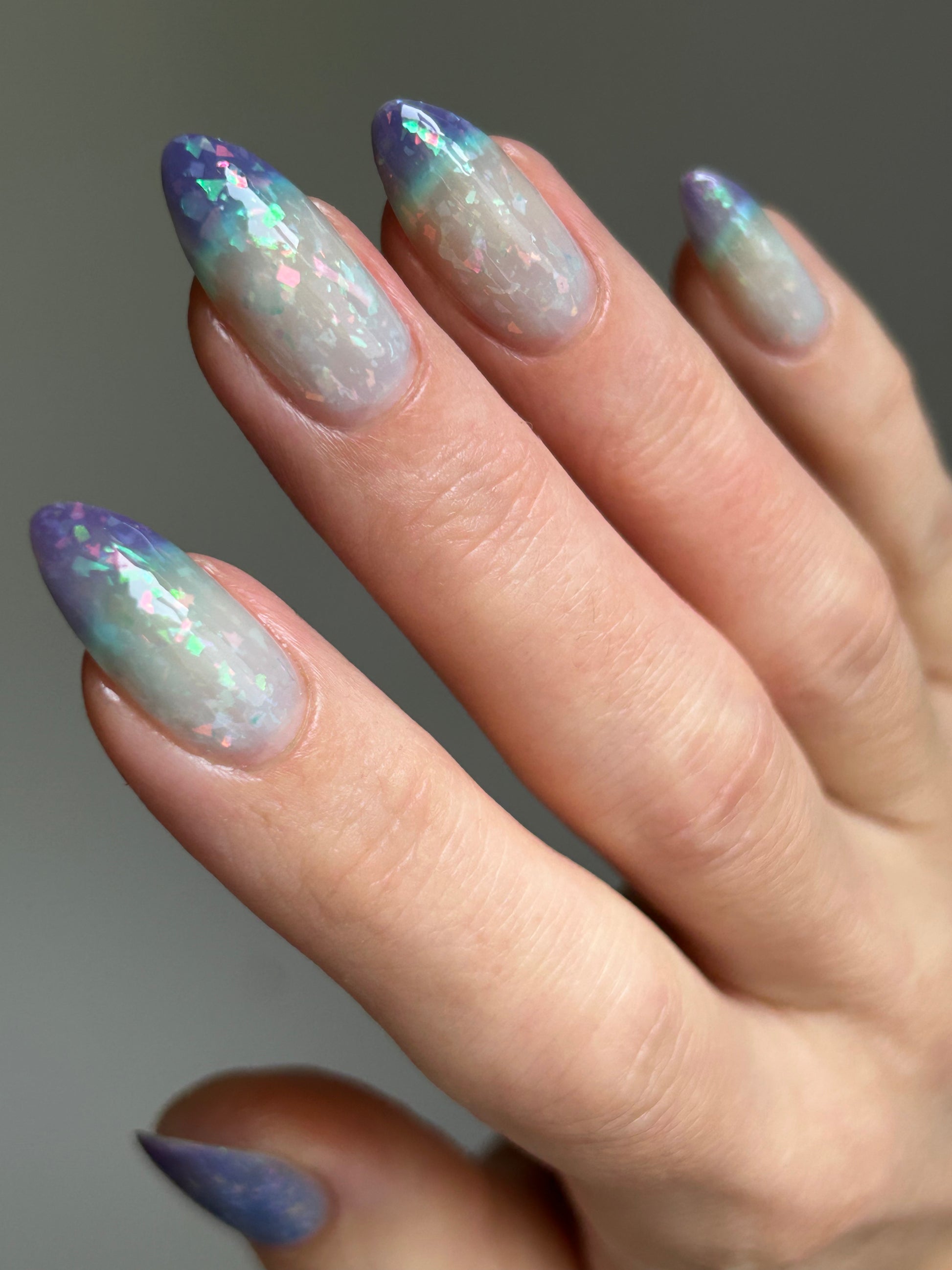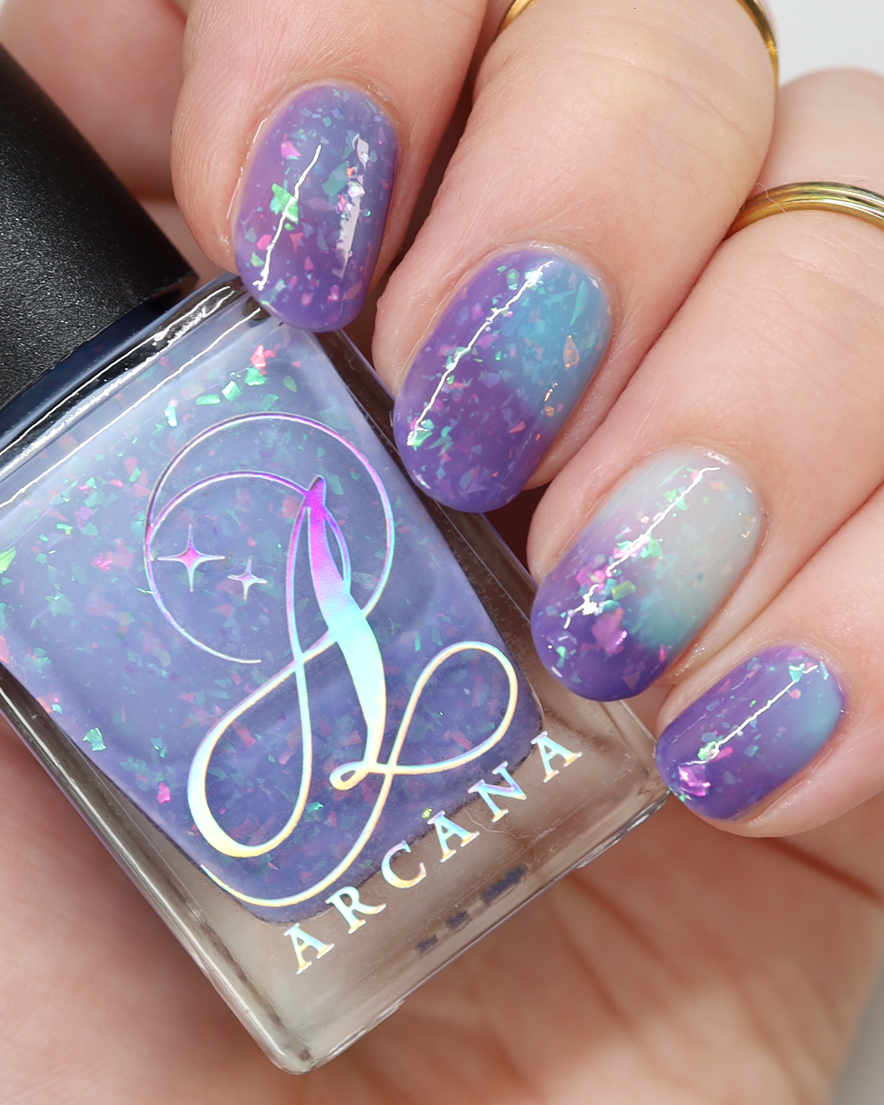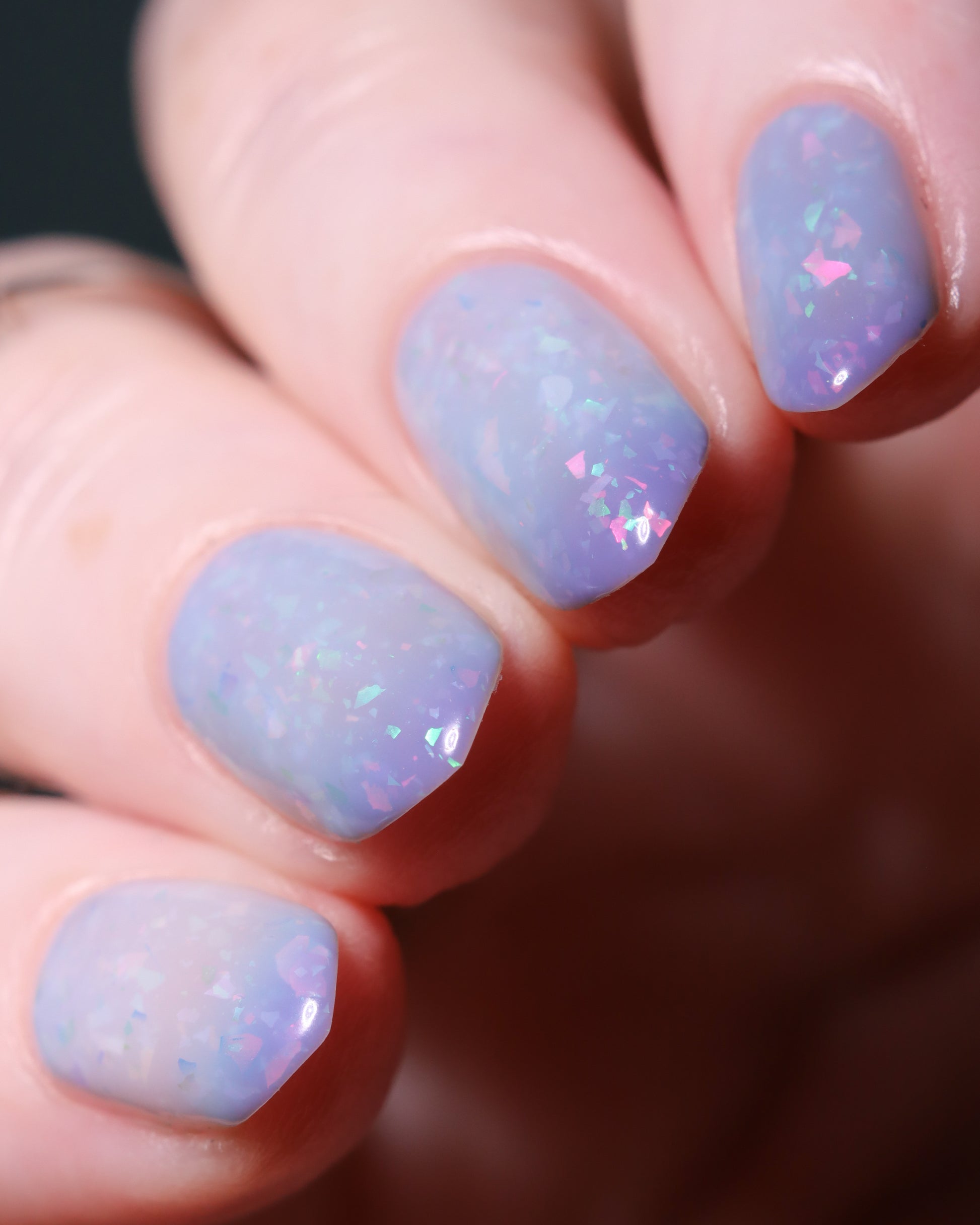 This polish features a thermal base that goes from light lavendar (cold) to sky blue (warm) to white (hot). It also has both pink and green flakes!