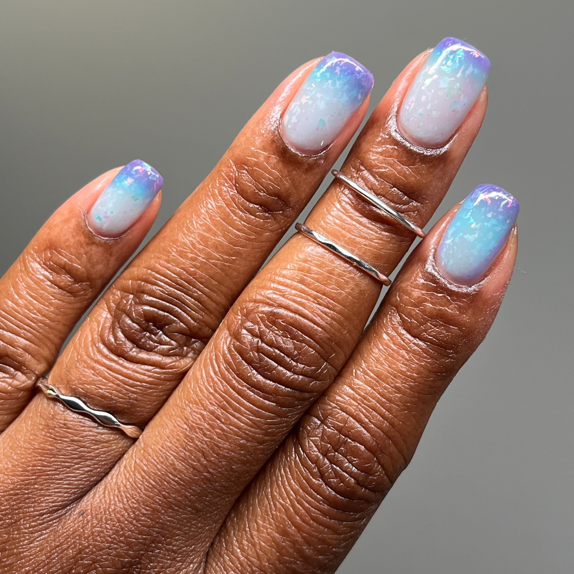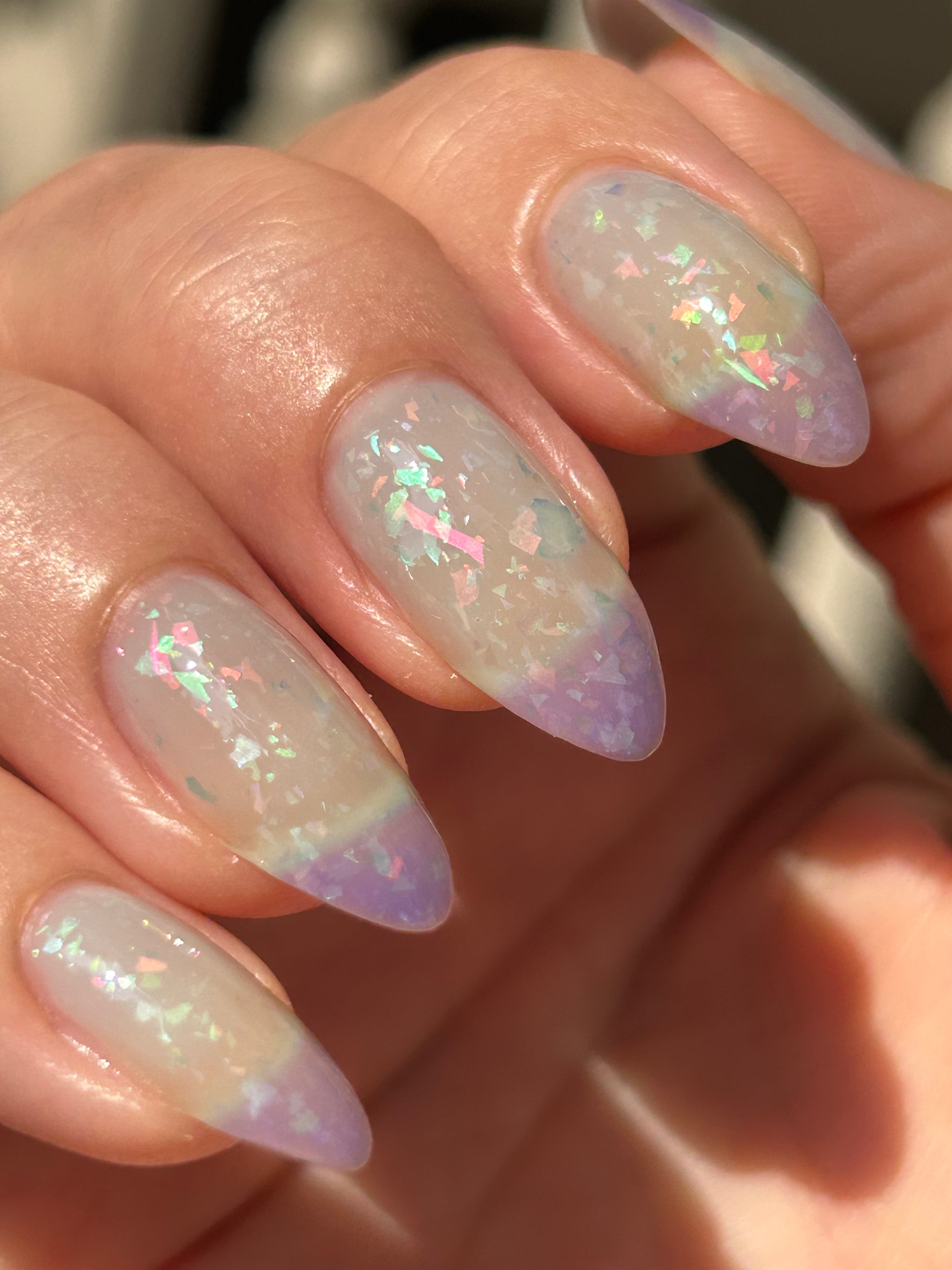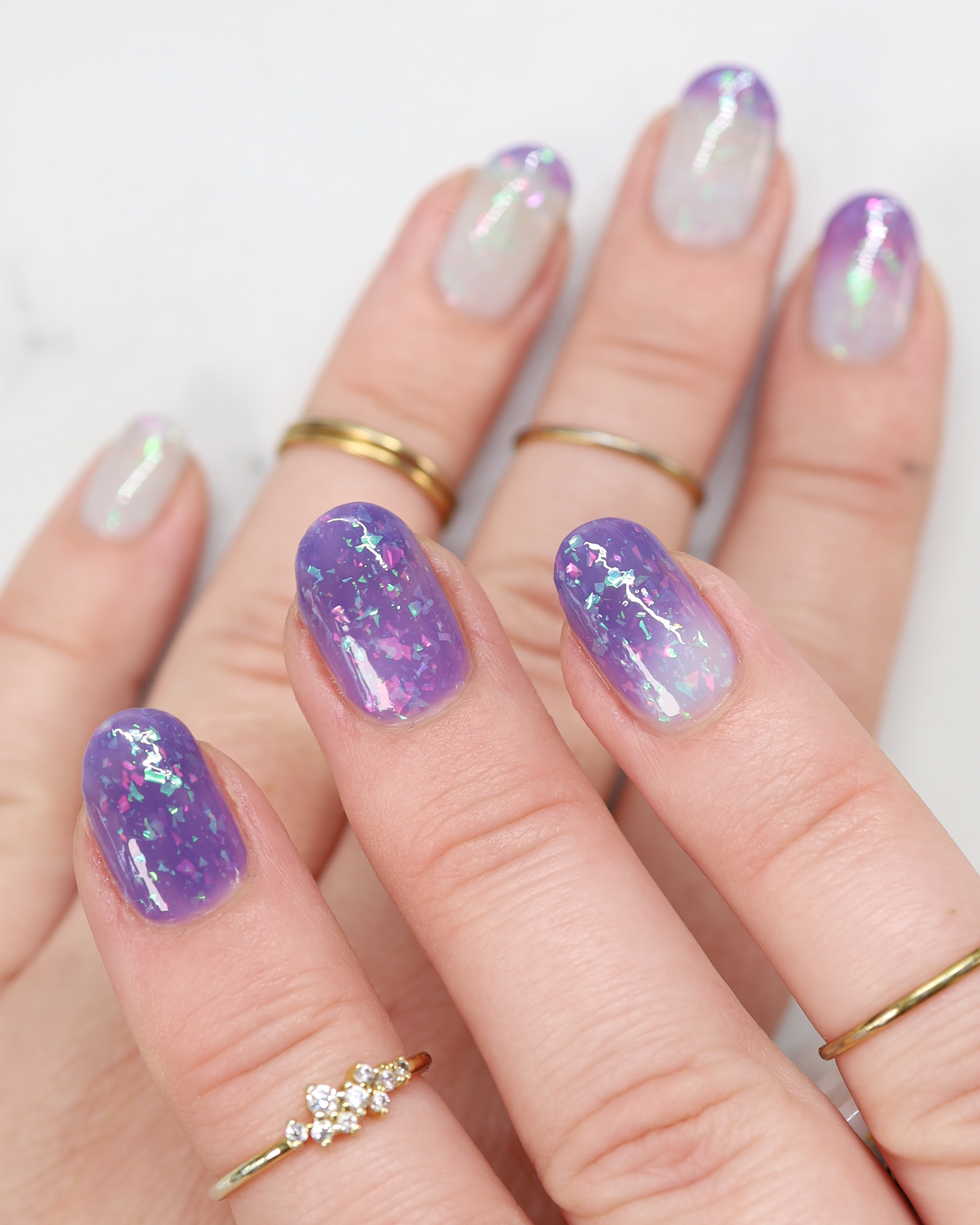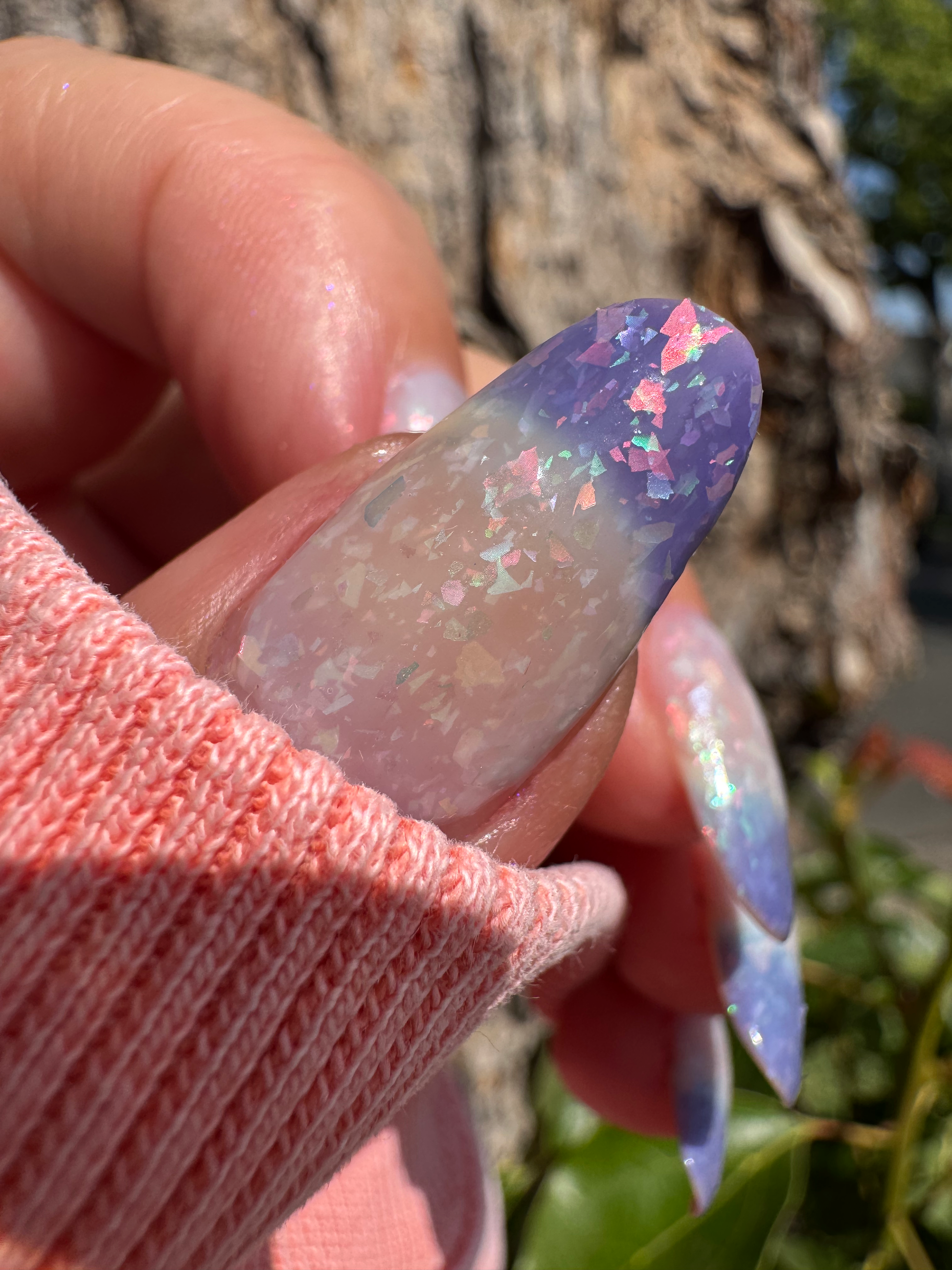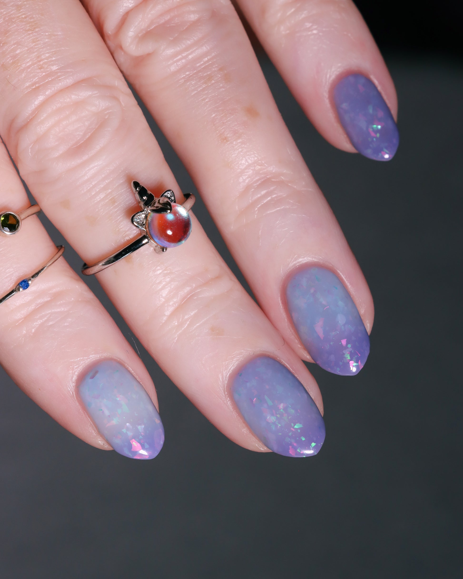 This polish features a thermal base that goes from light lavendar (cold) to sky blue (warm) to white (hot). It also has both pink and green flakes!
