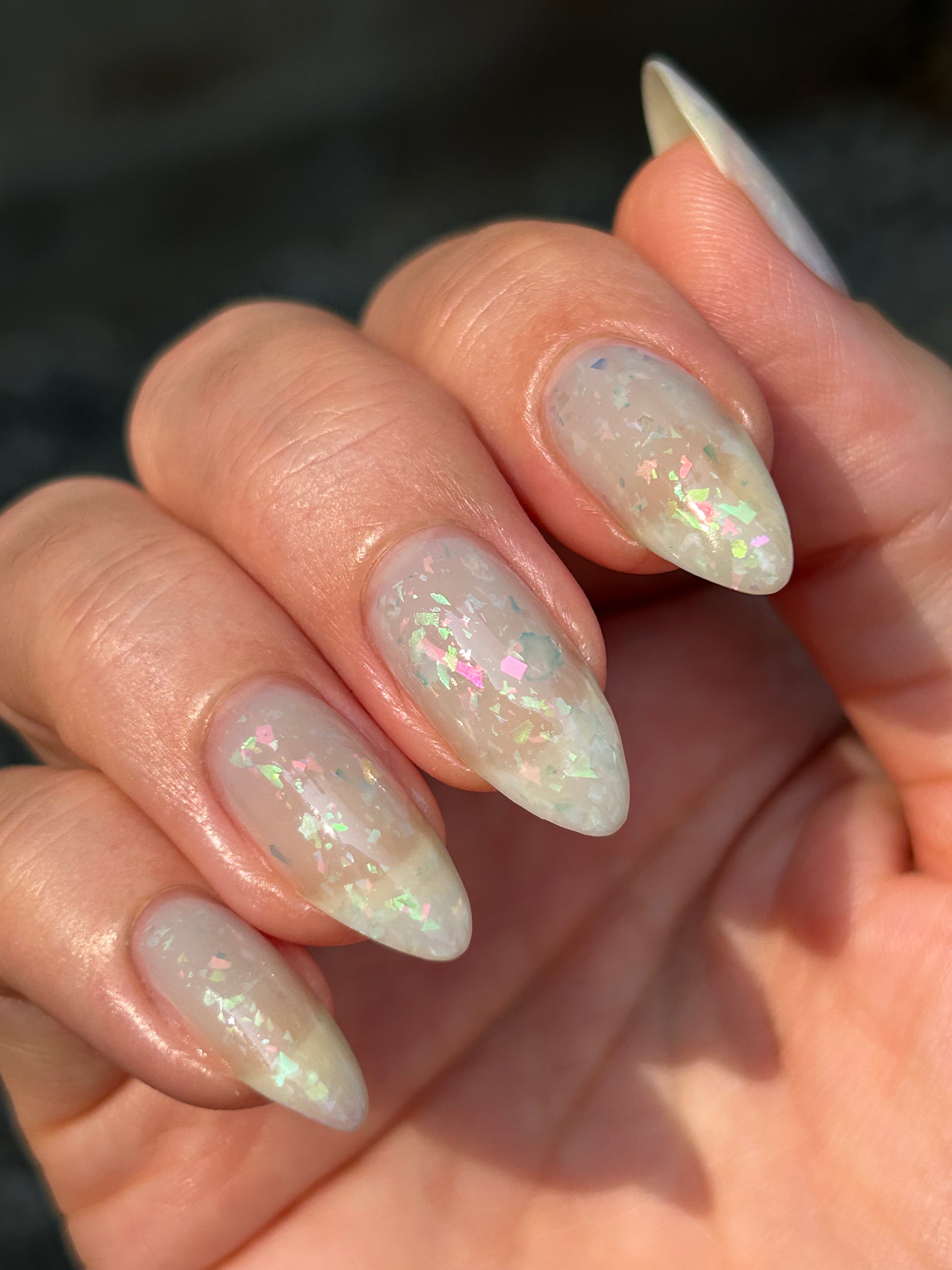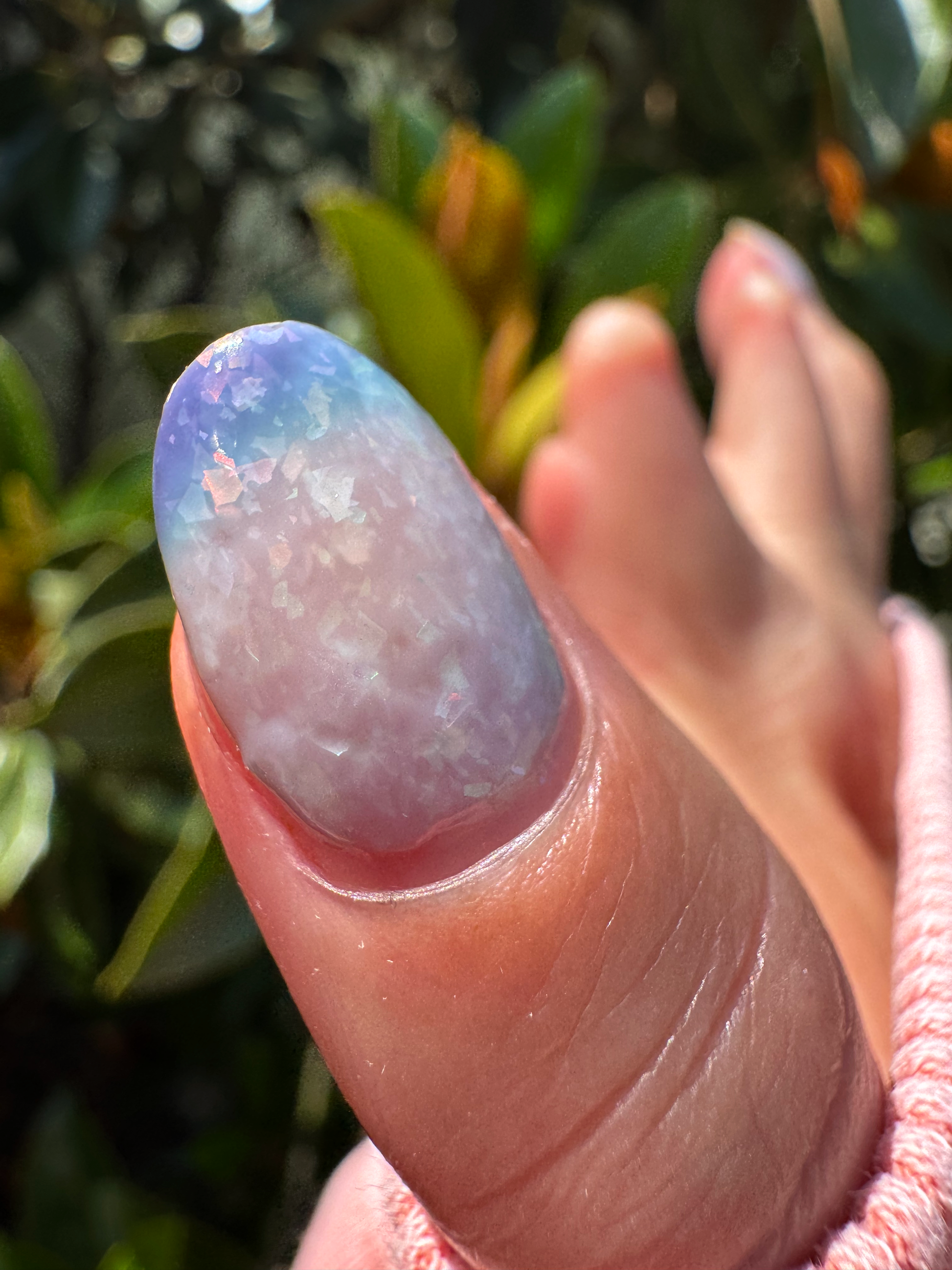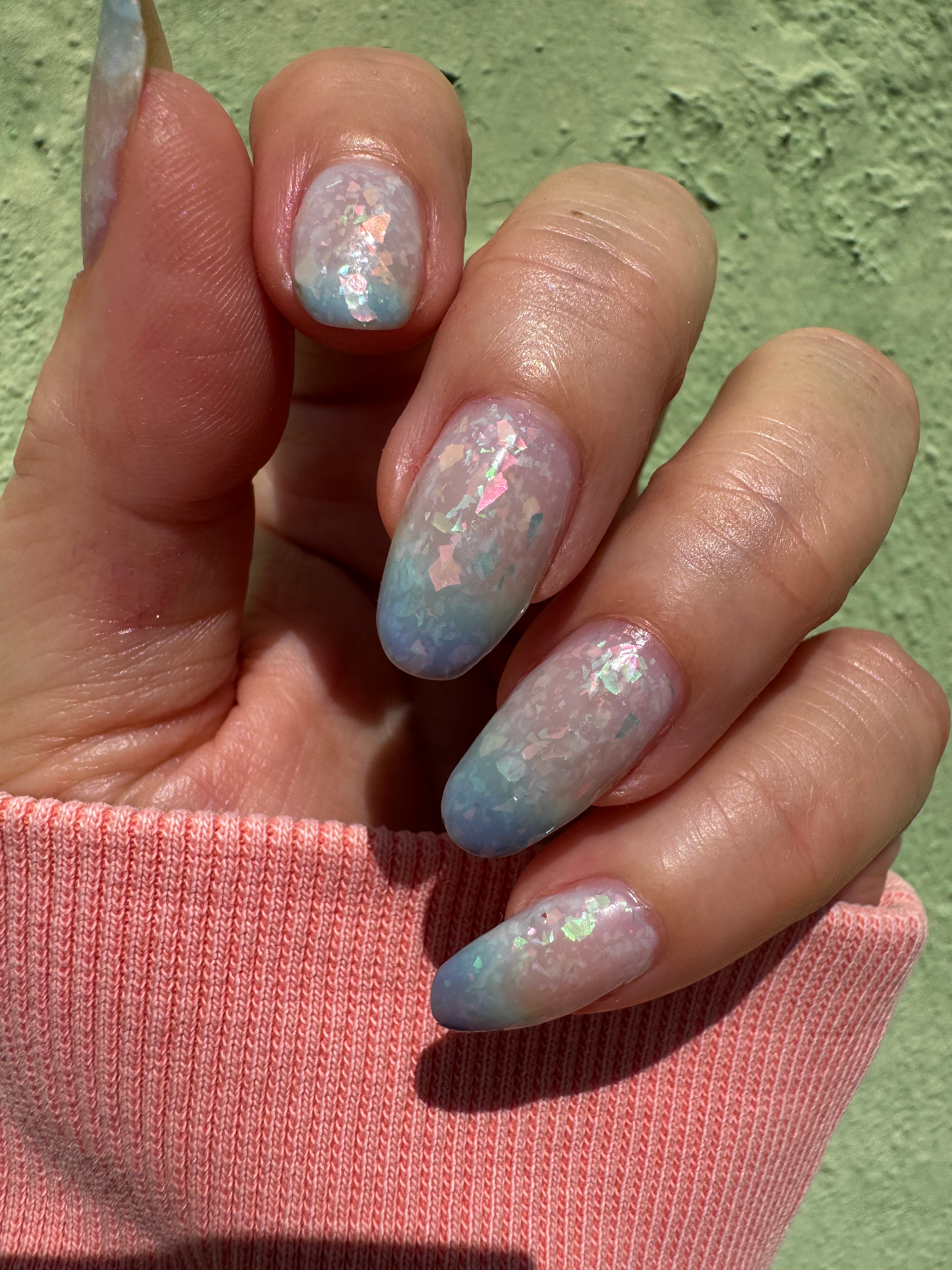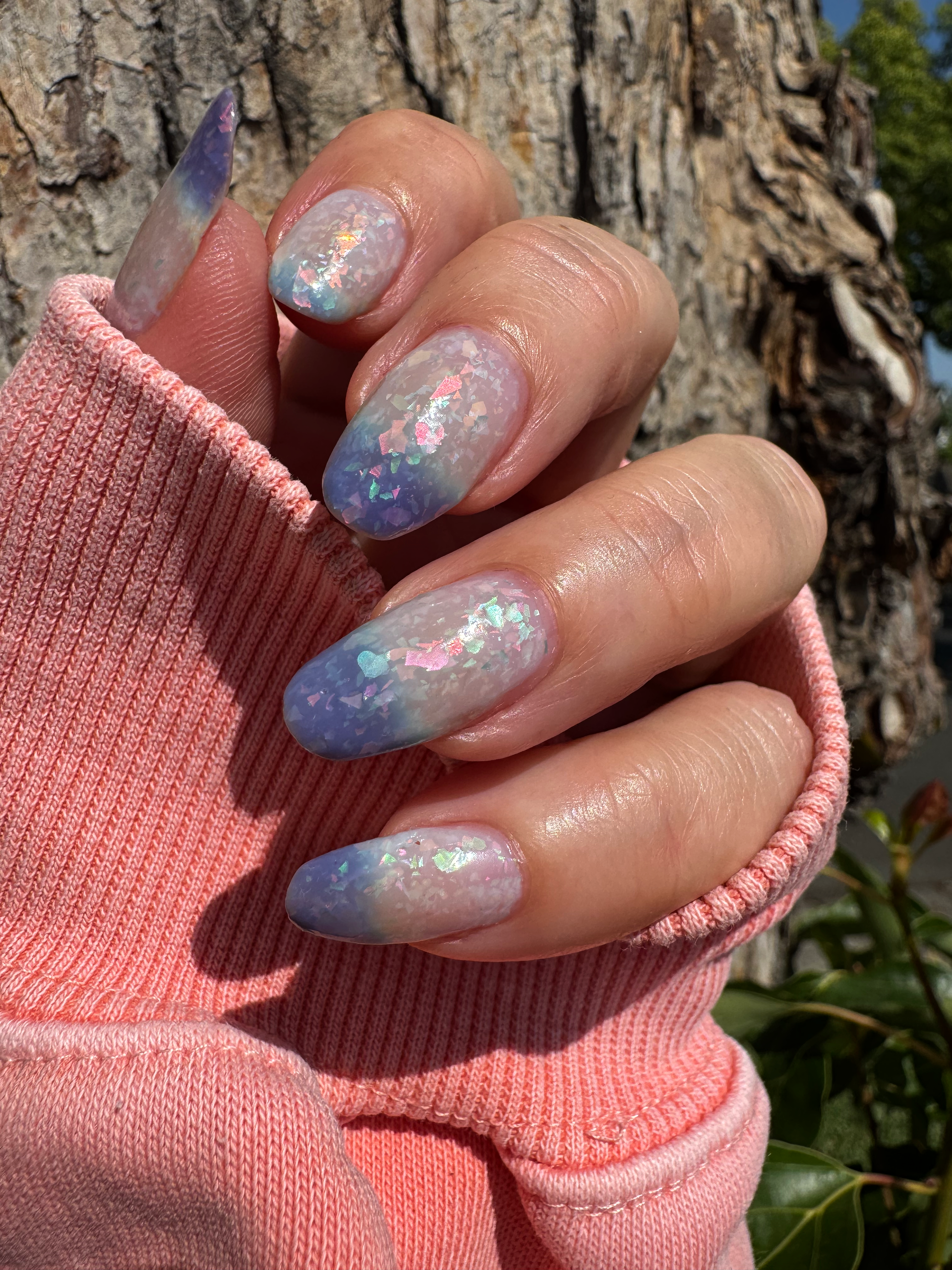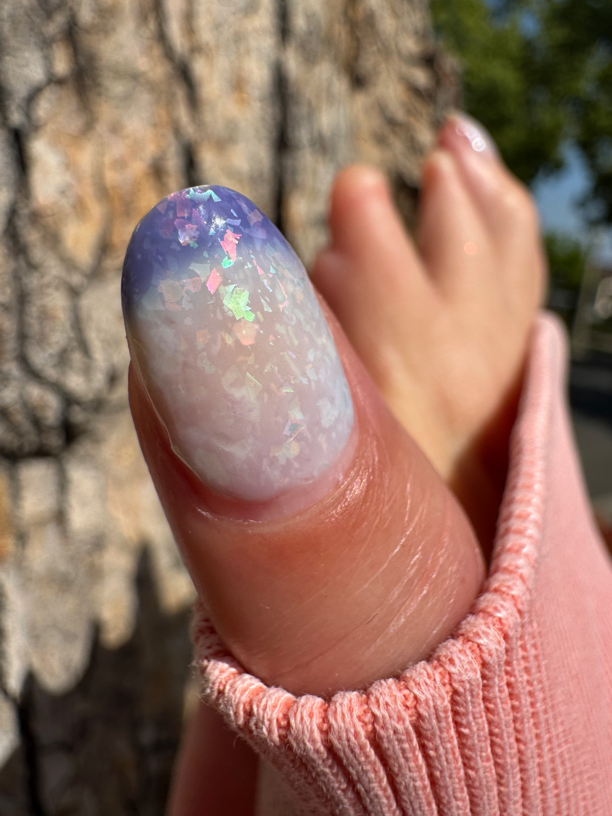 This polish features a thermal base that goes from light lavendar (cold) to sky blue (warm) to white (hot). It also has both pink and green flakes!