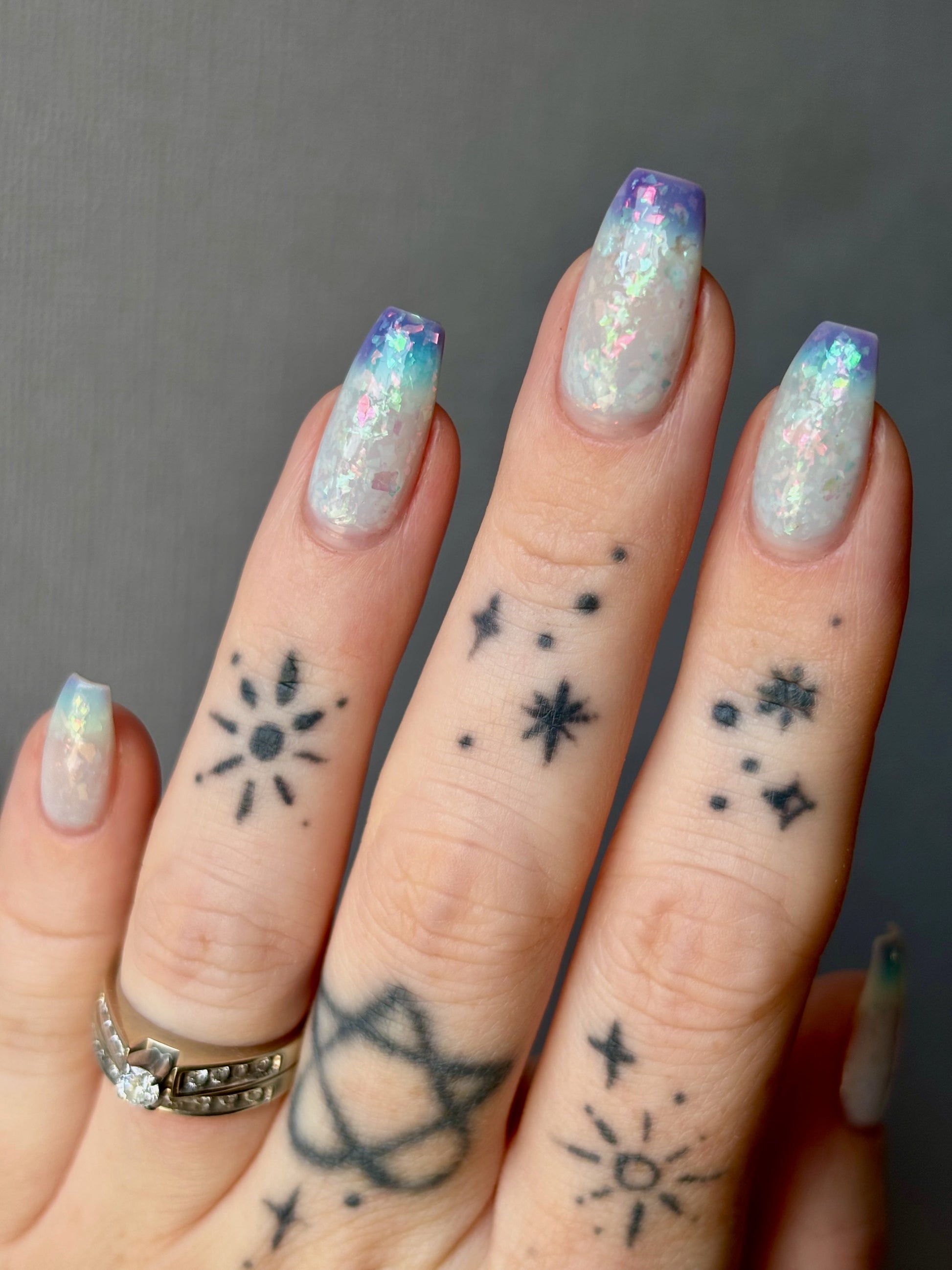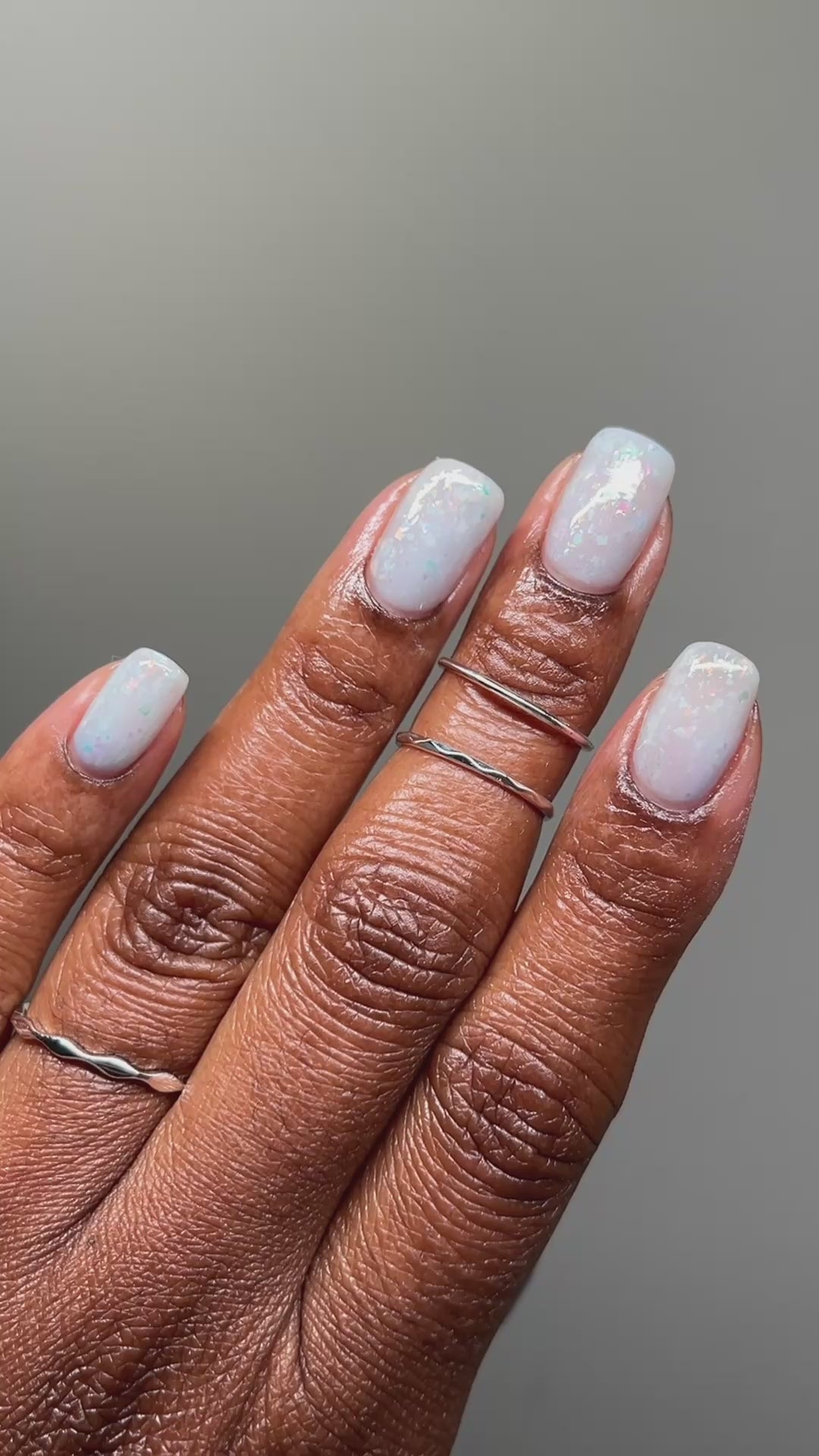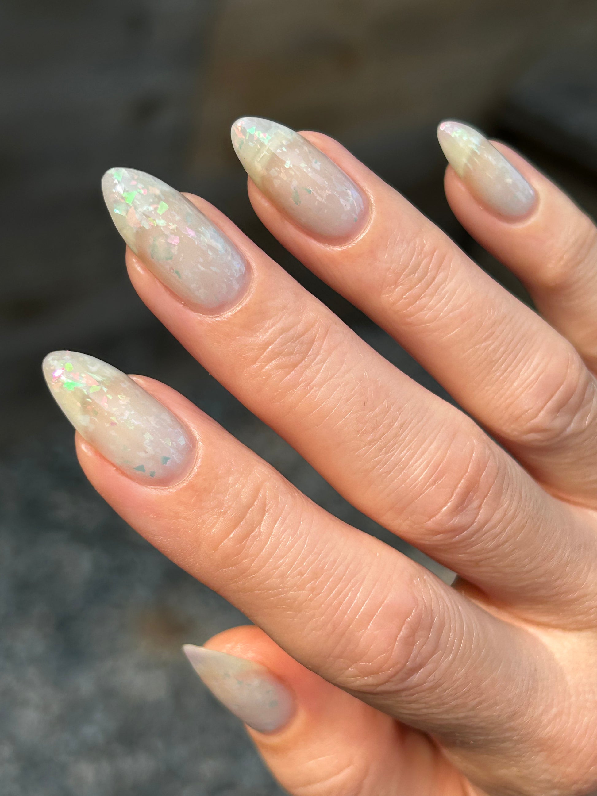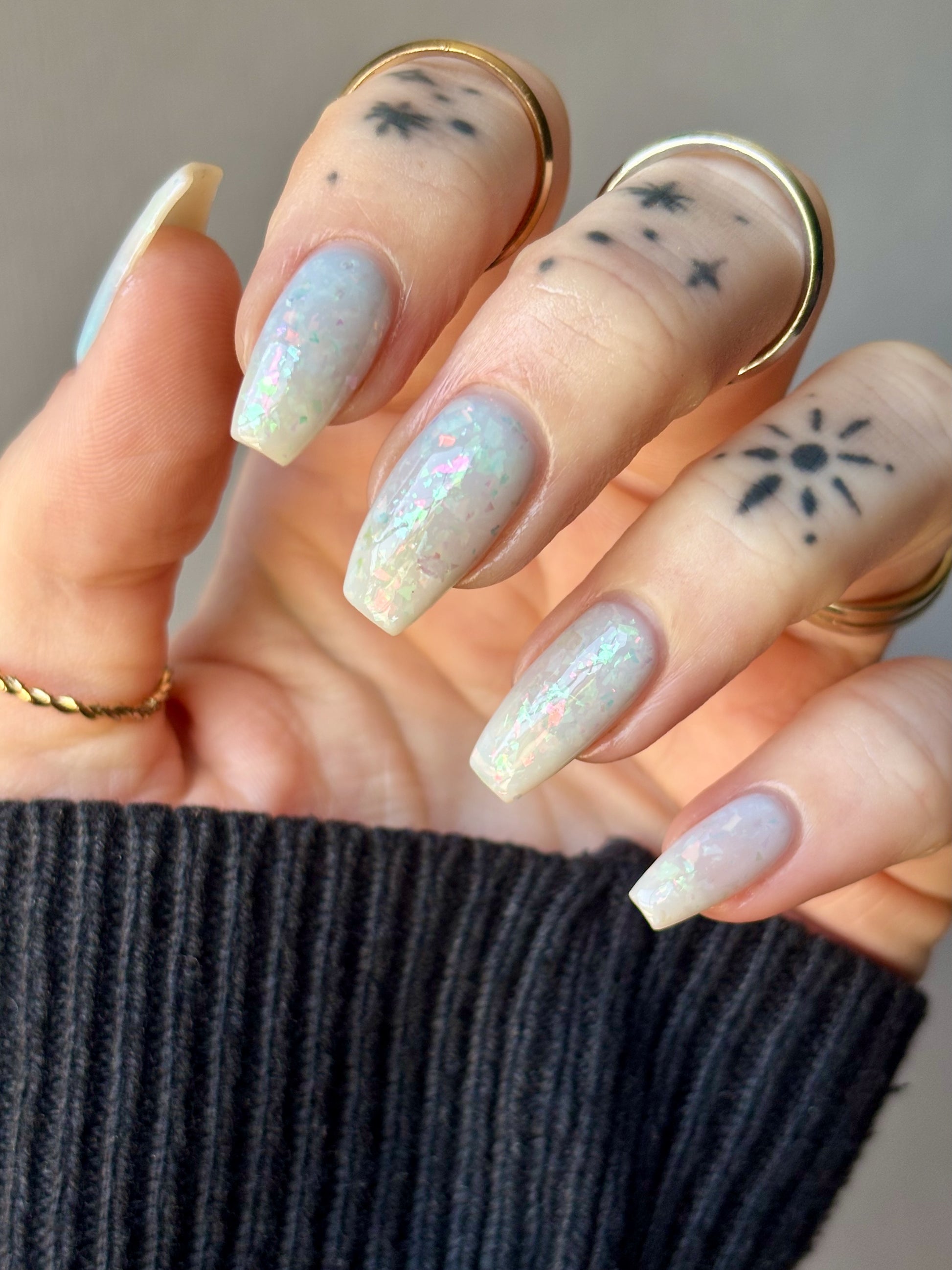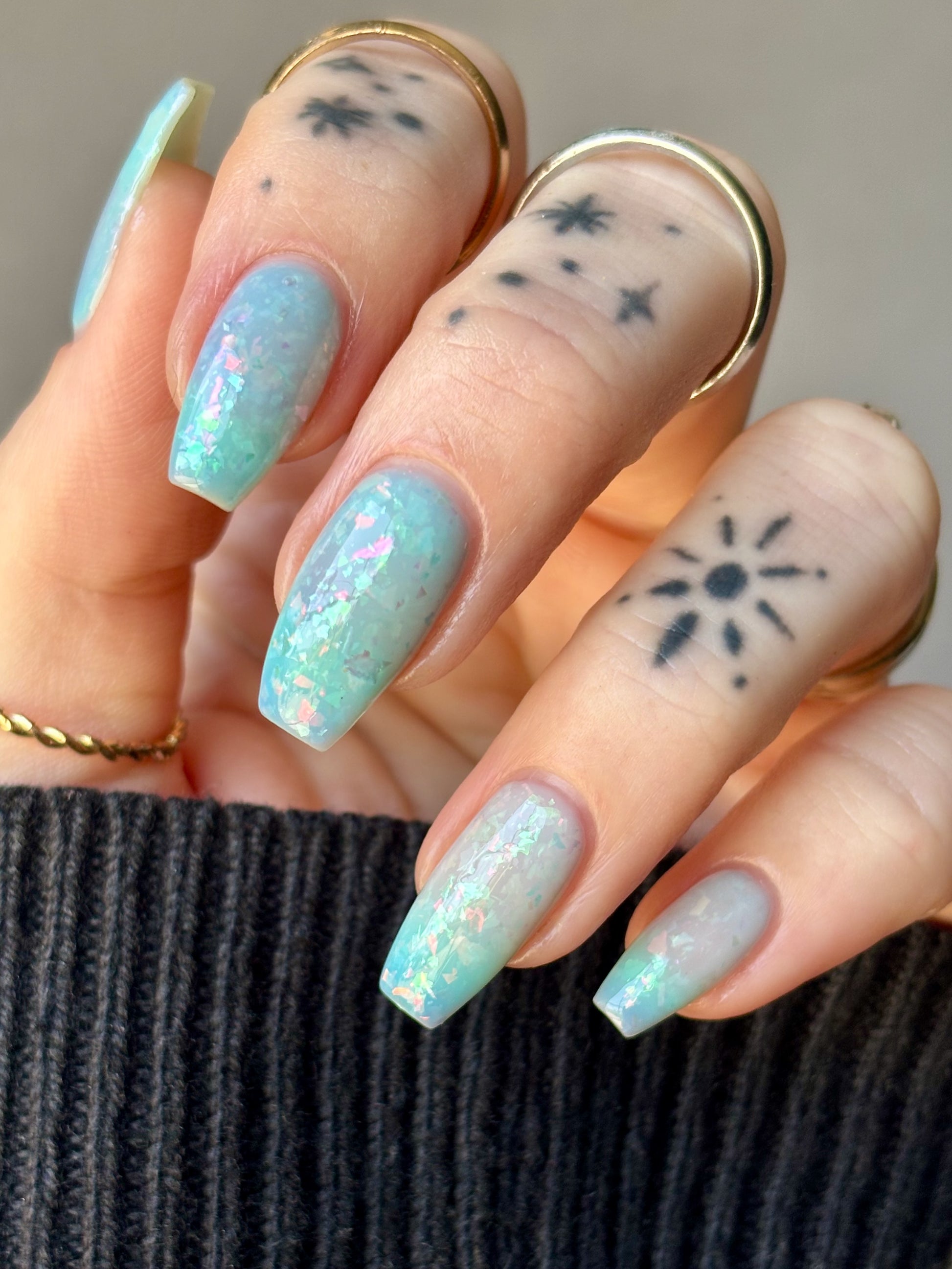 This polish features a thermal base that goes from light lavendar (cold) to sky blue (warm) to white (hot). It also has both pink and green flakes!