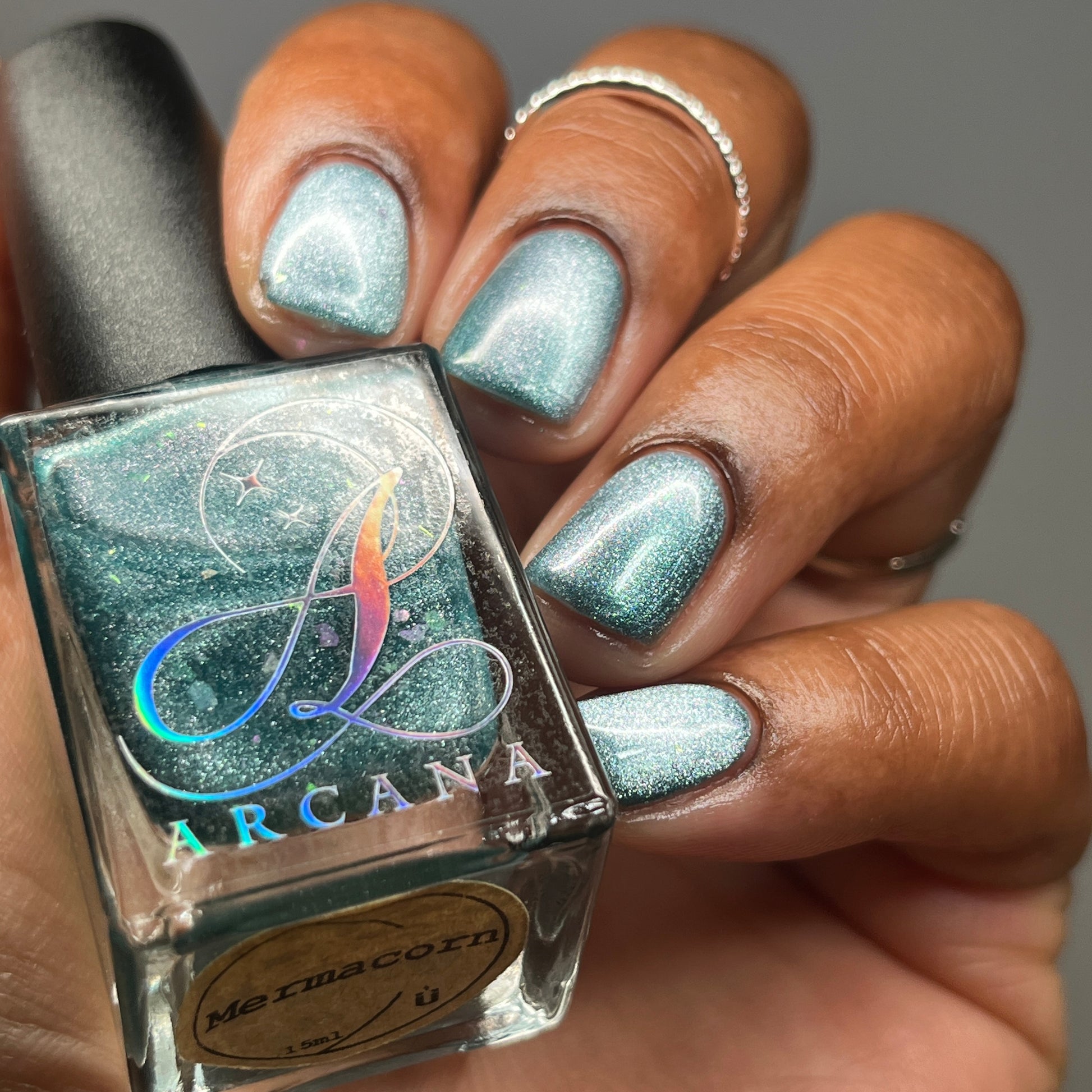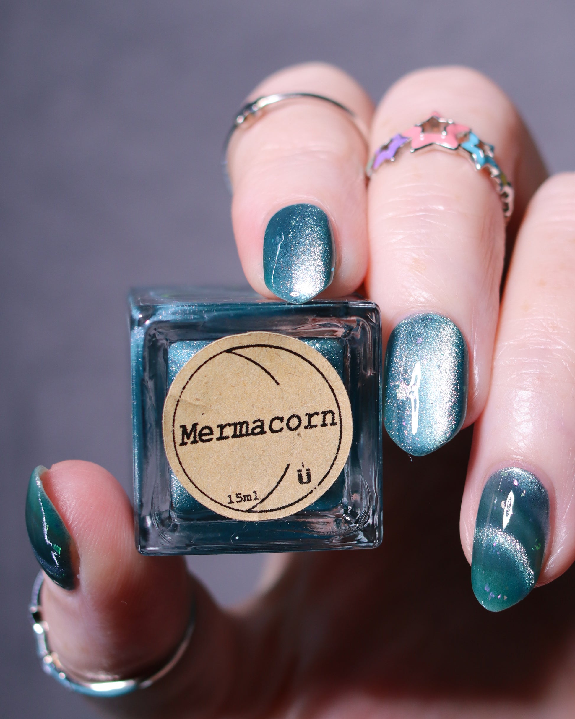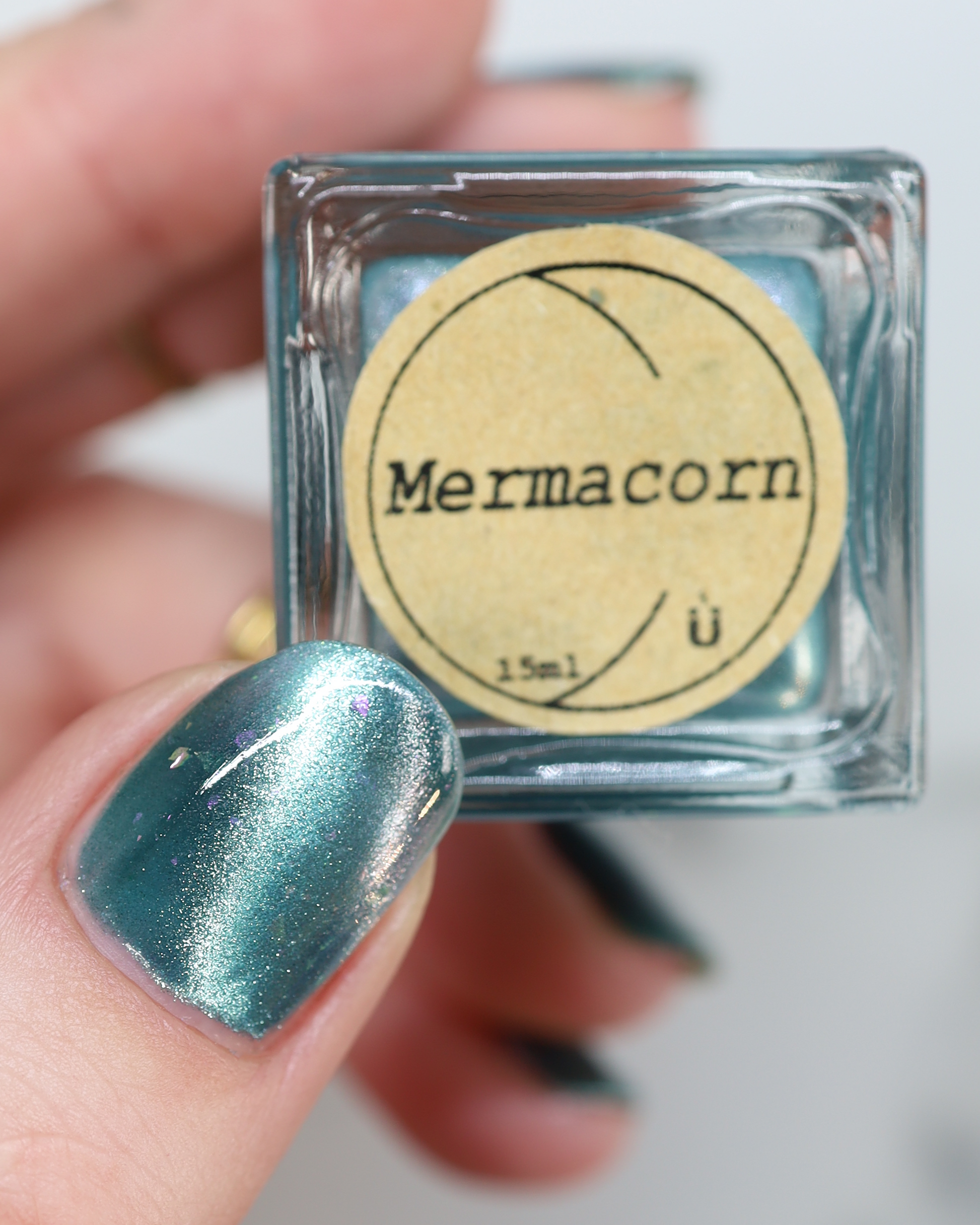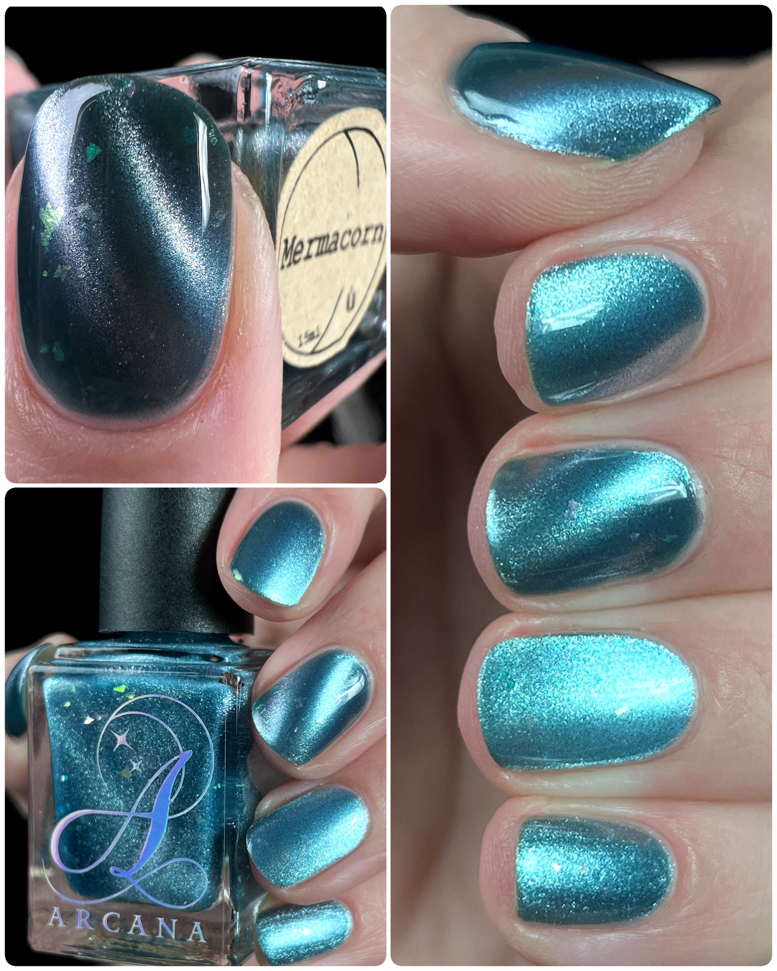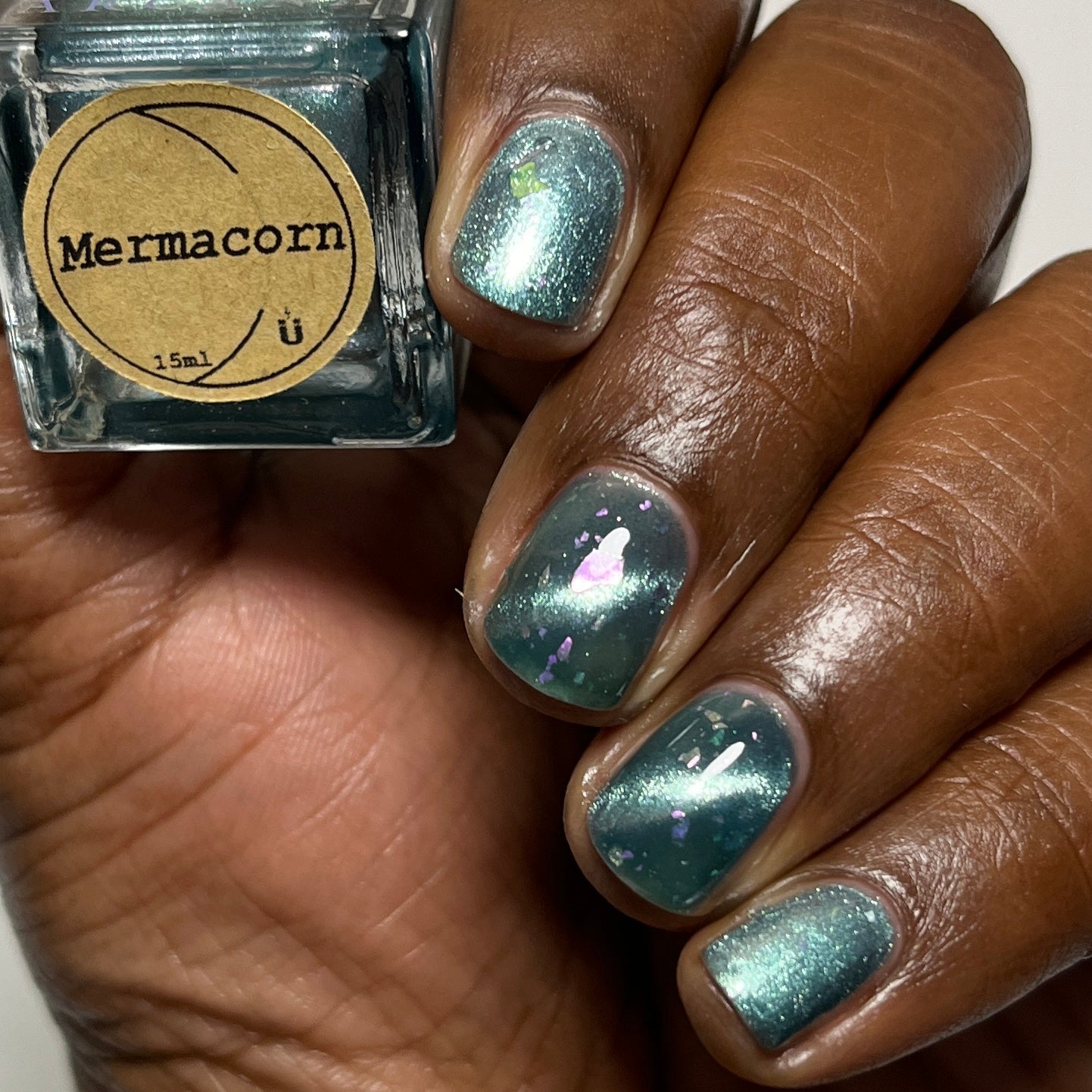 Mermacorn has a teal base with pink to purple and green to blue flakes with silver/pastel purple megnetic pigment.
