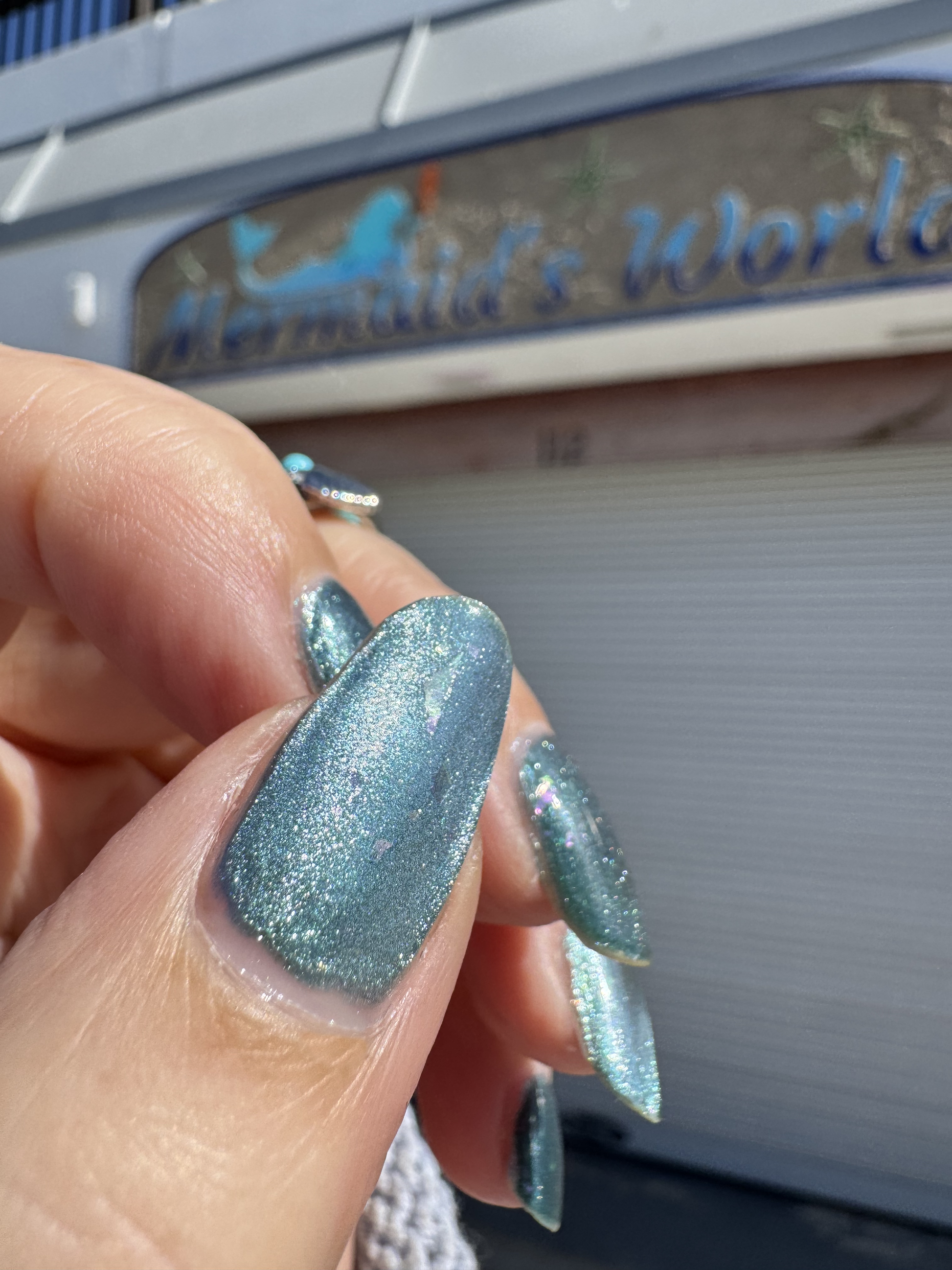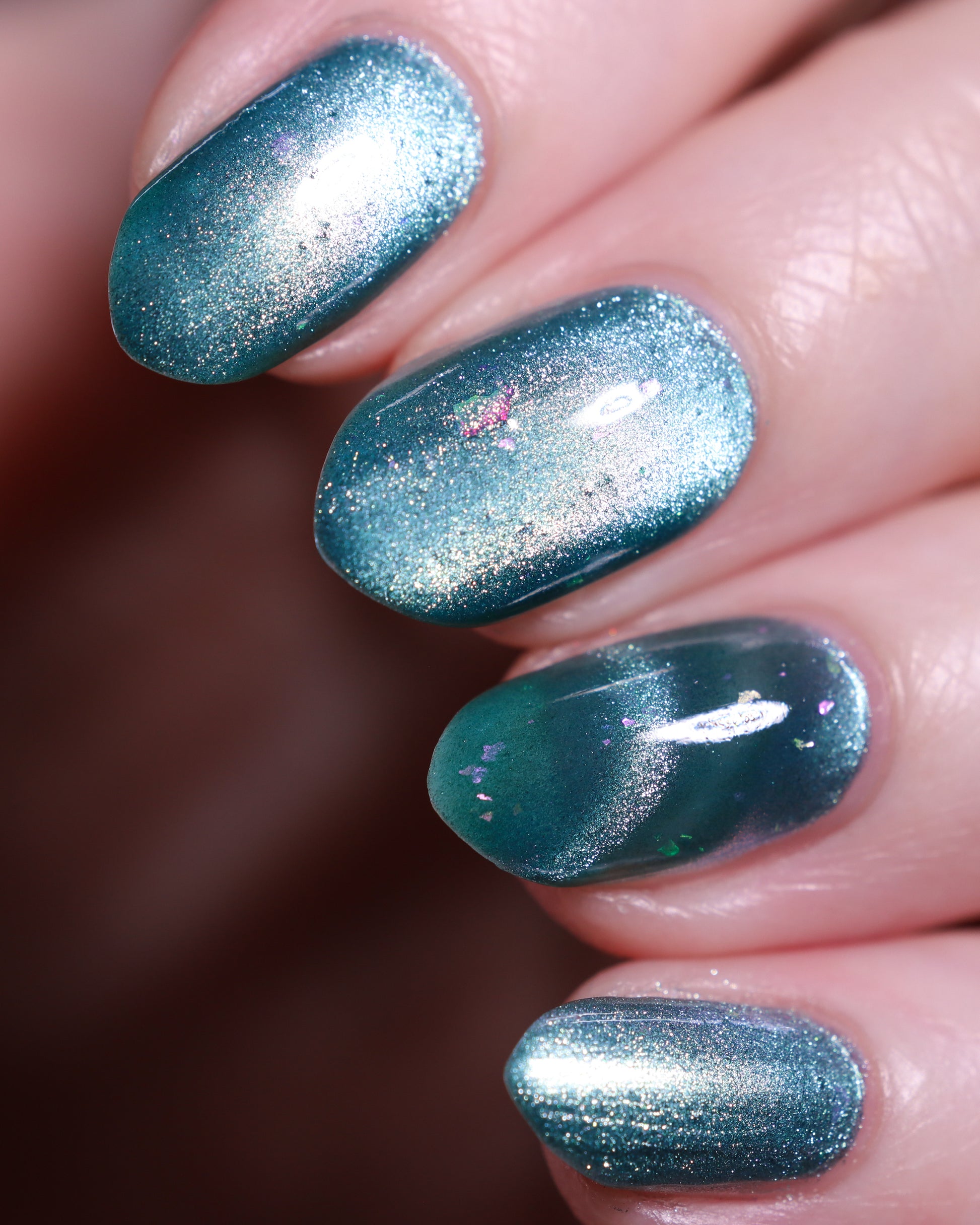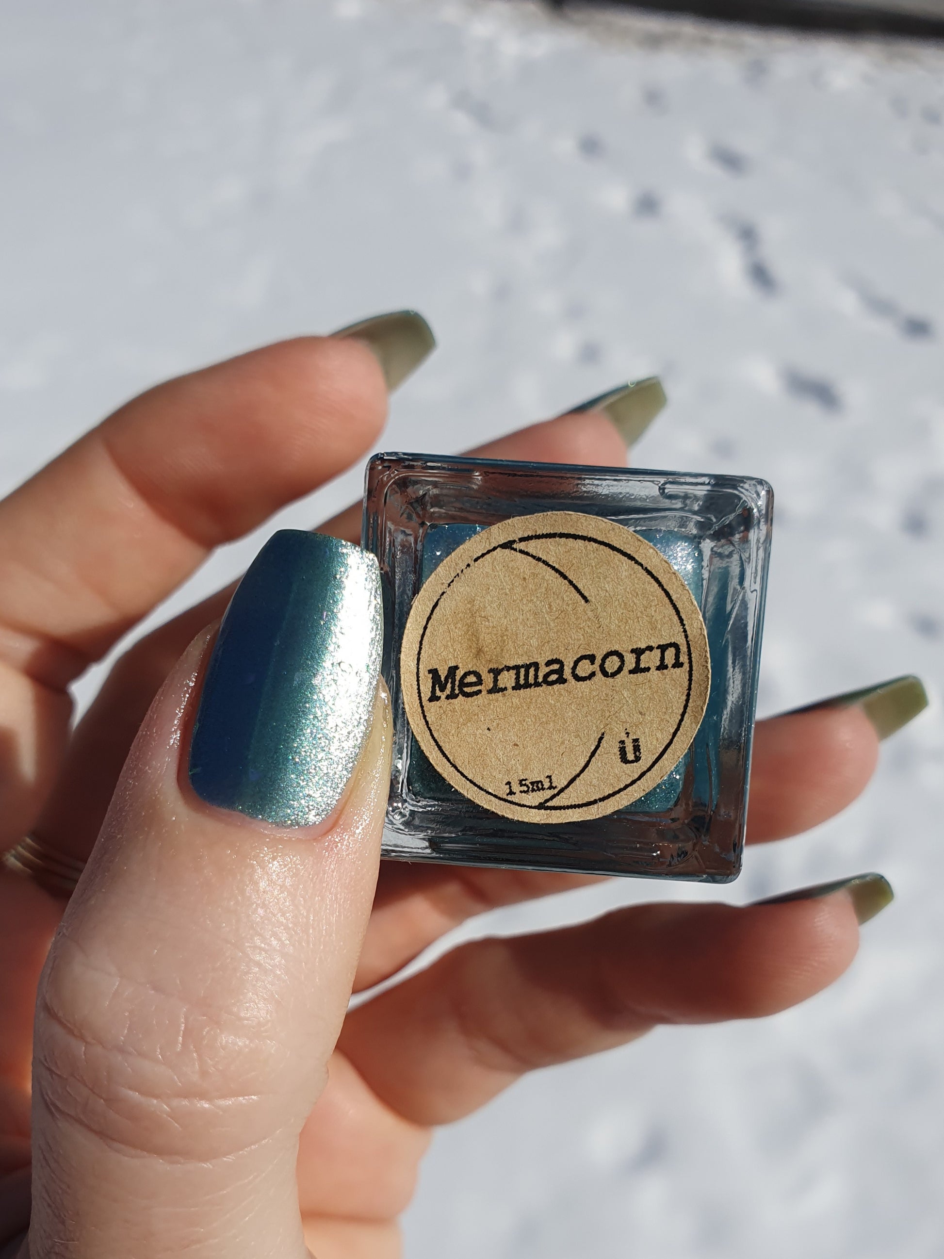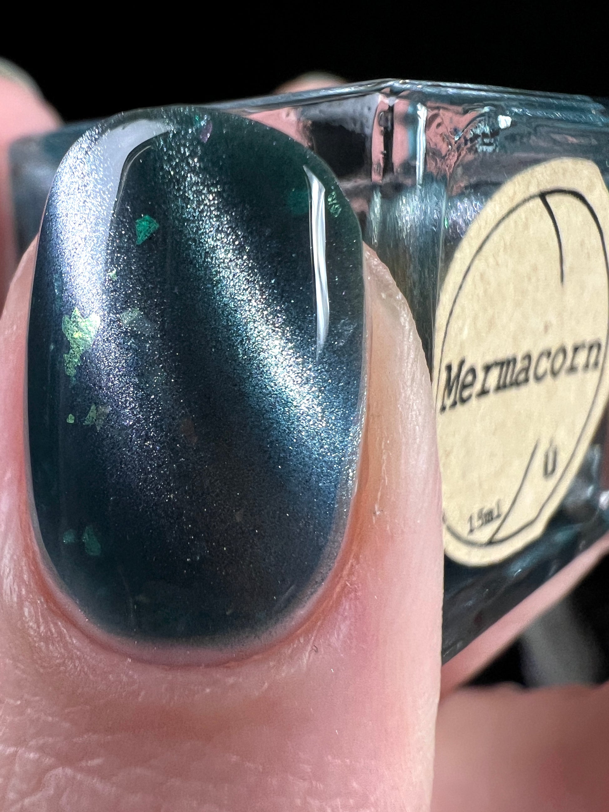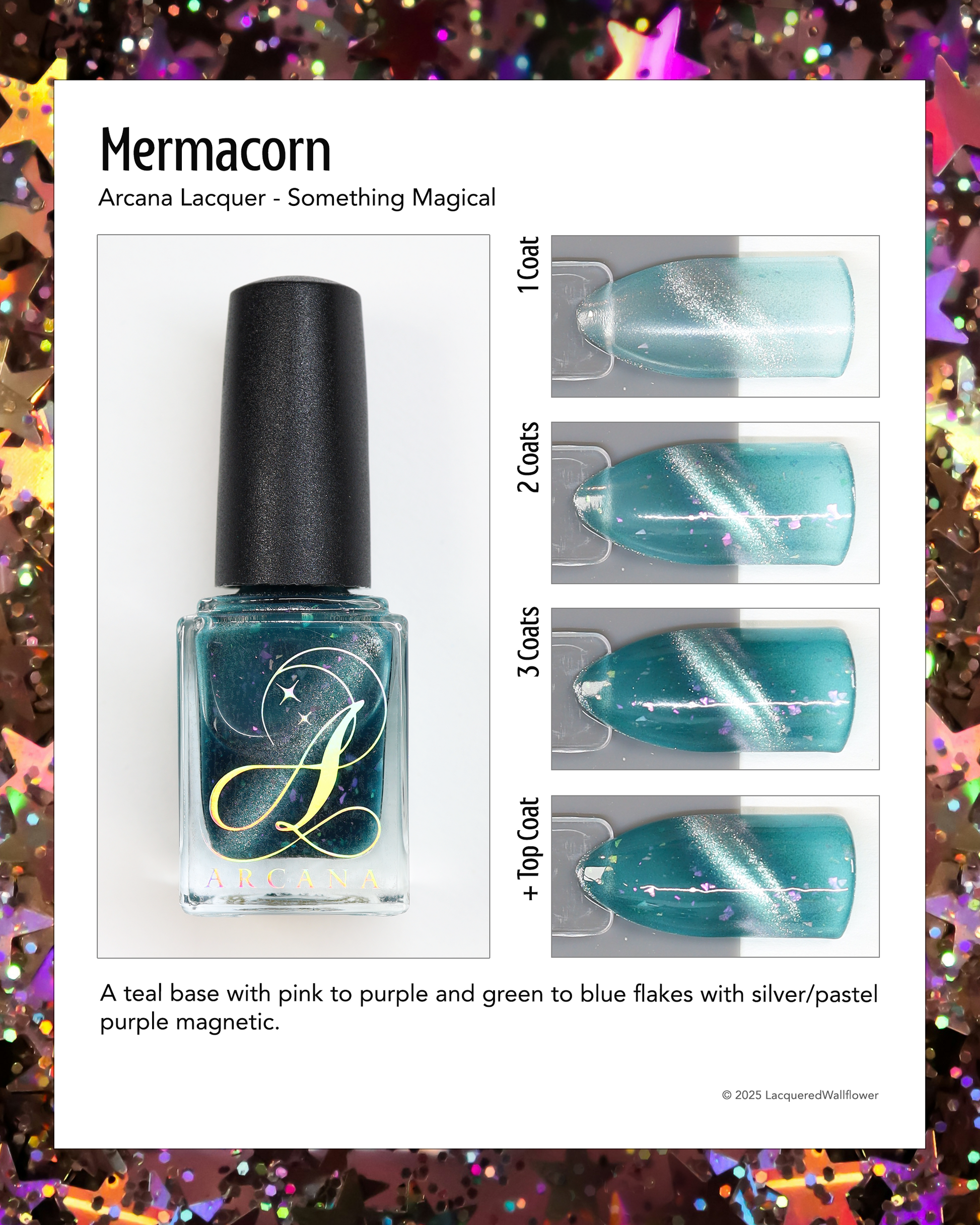 Mermacorn has a teal base with pink to purple and green to blue flakes with silver/pastel purple megnetic pigment.