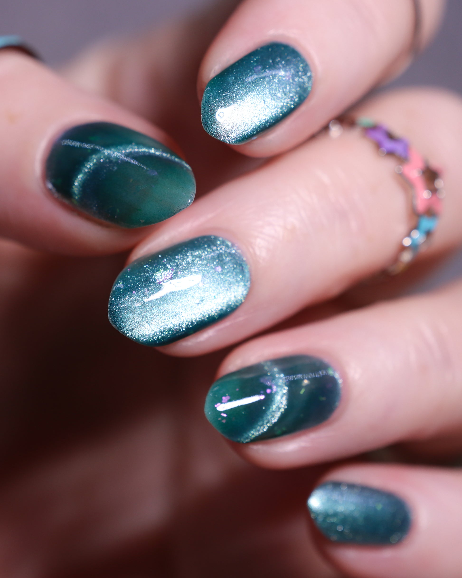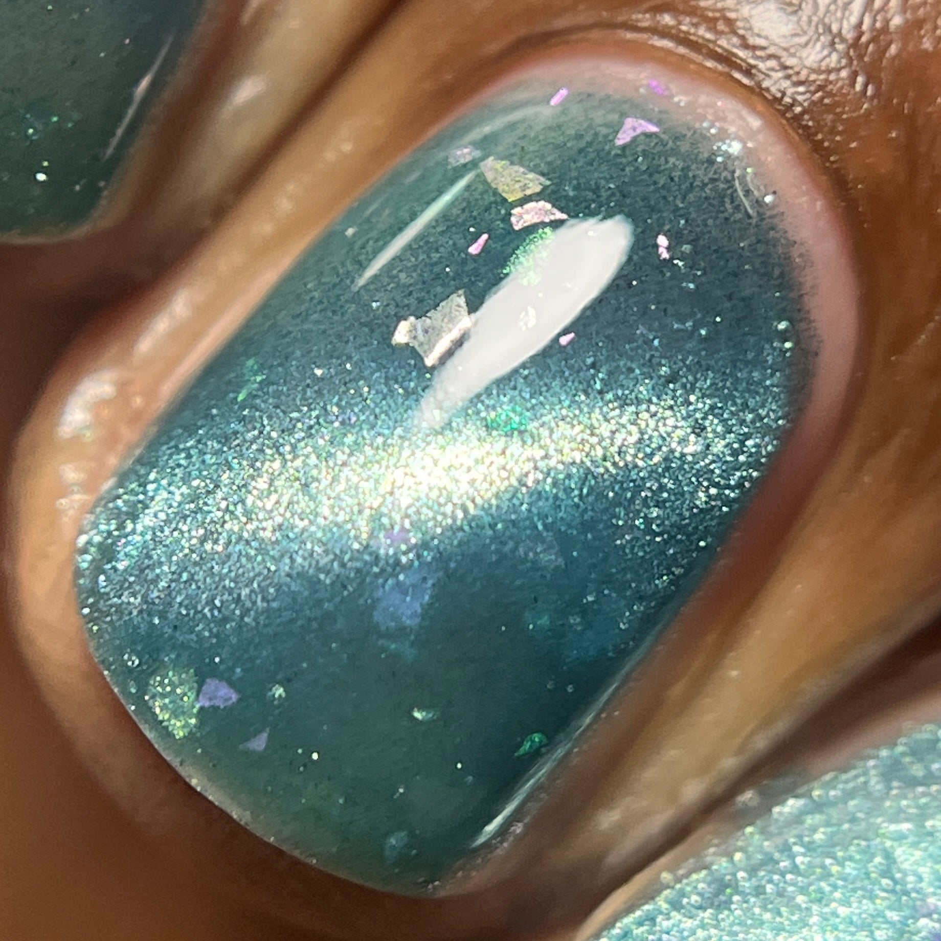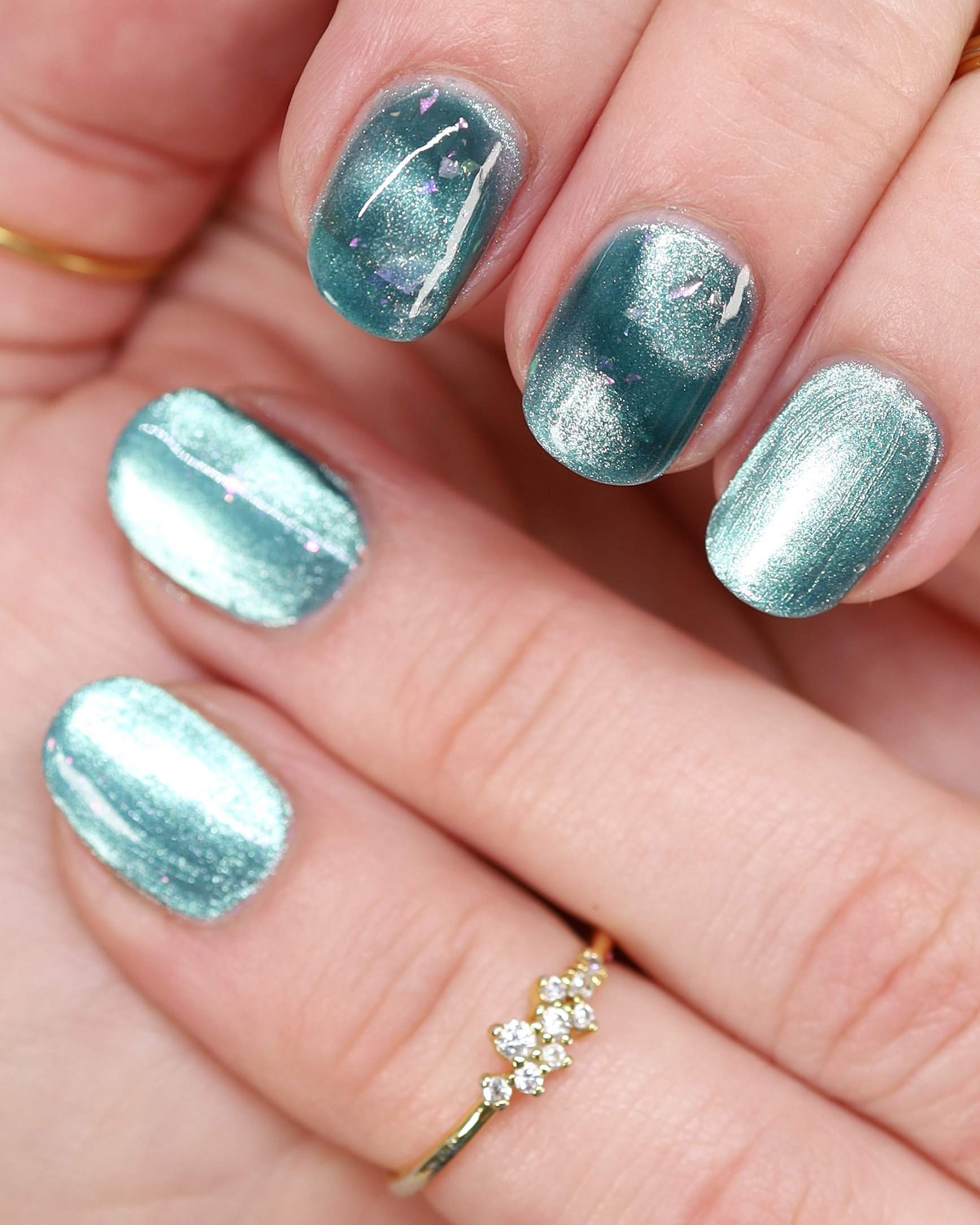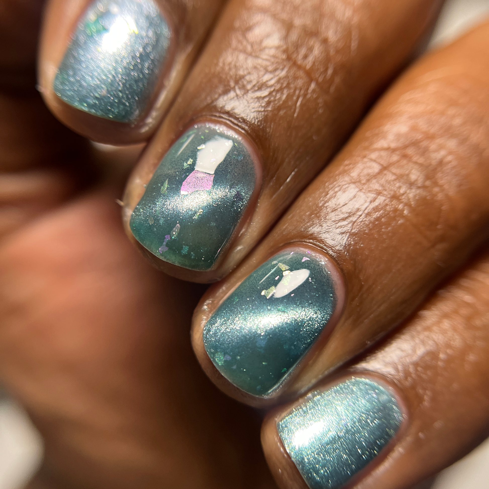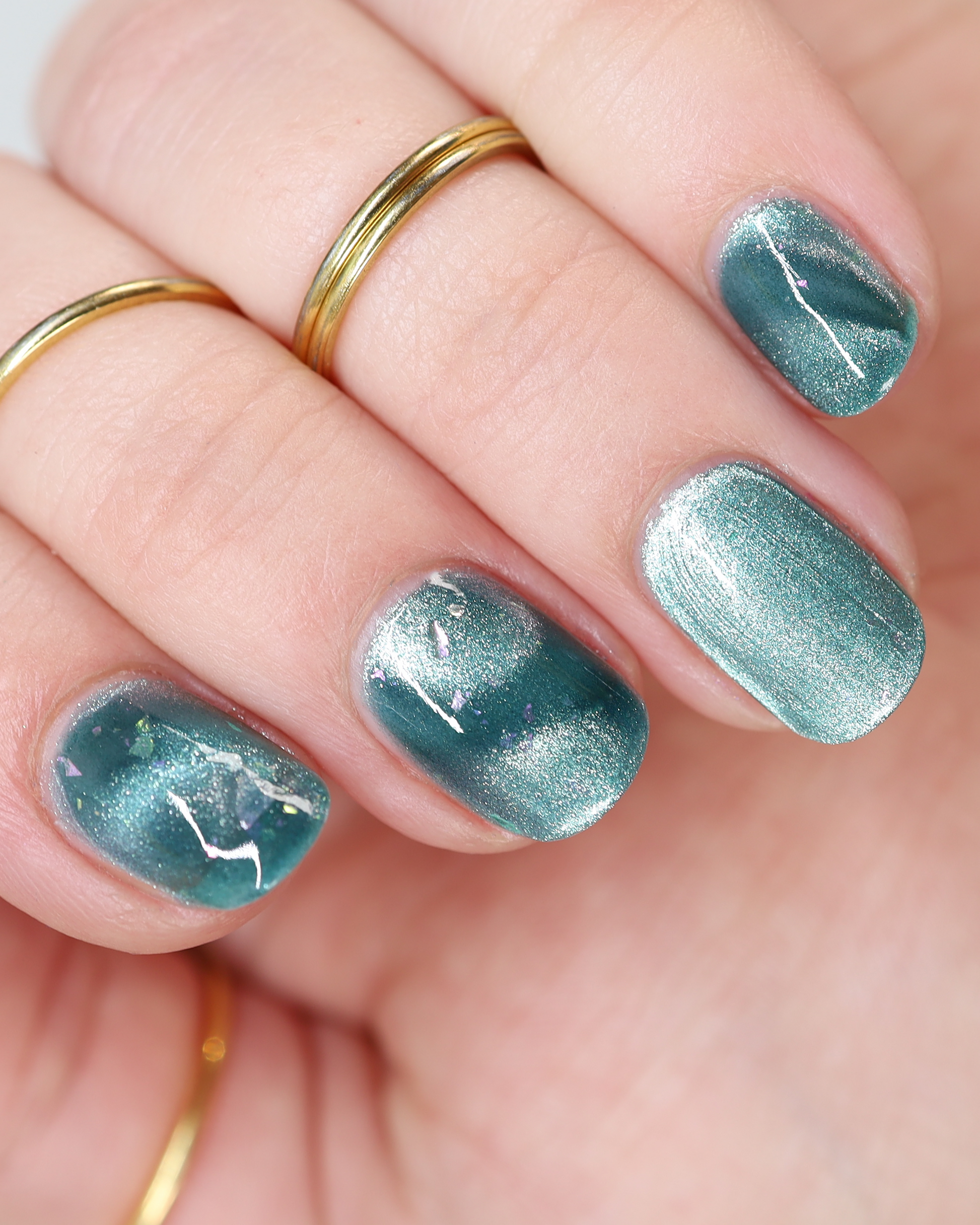 Mermacorn has a teal base with pink to purple and green to blue flakes with silver/pastel purple megnetic pigment.