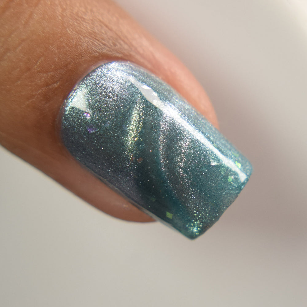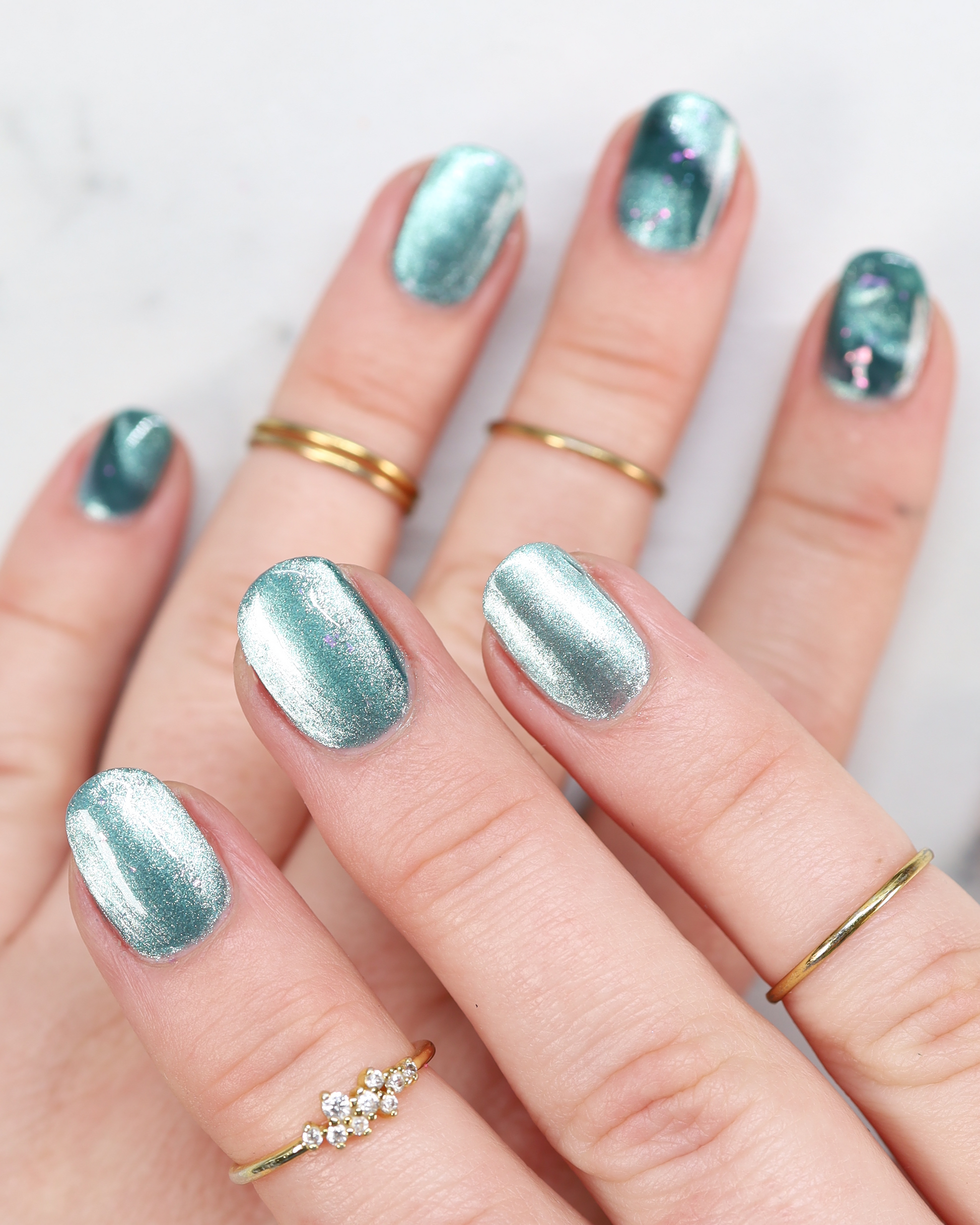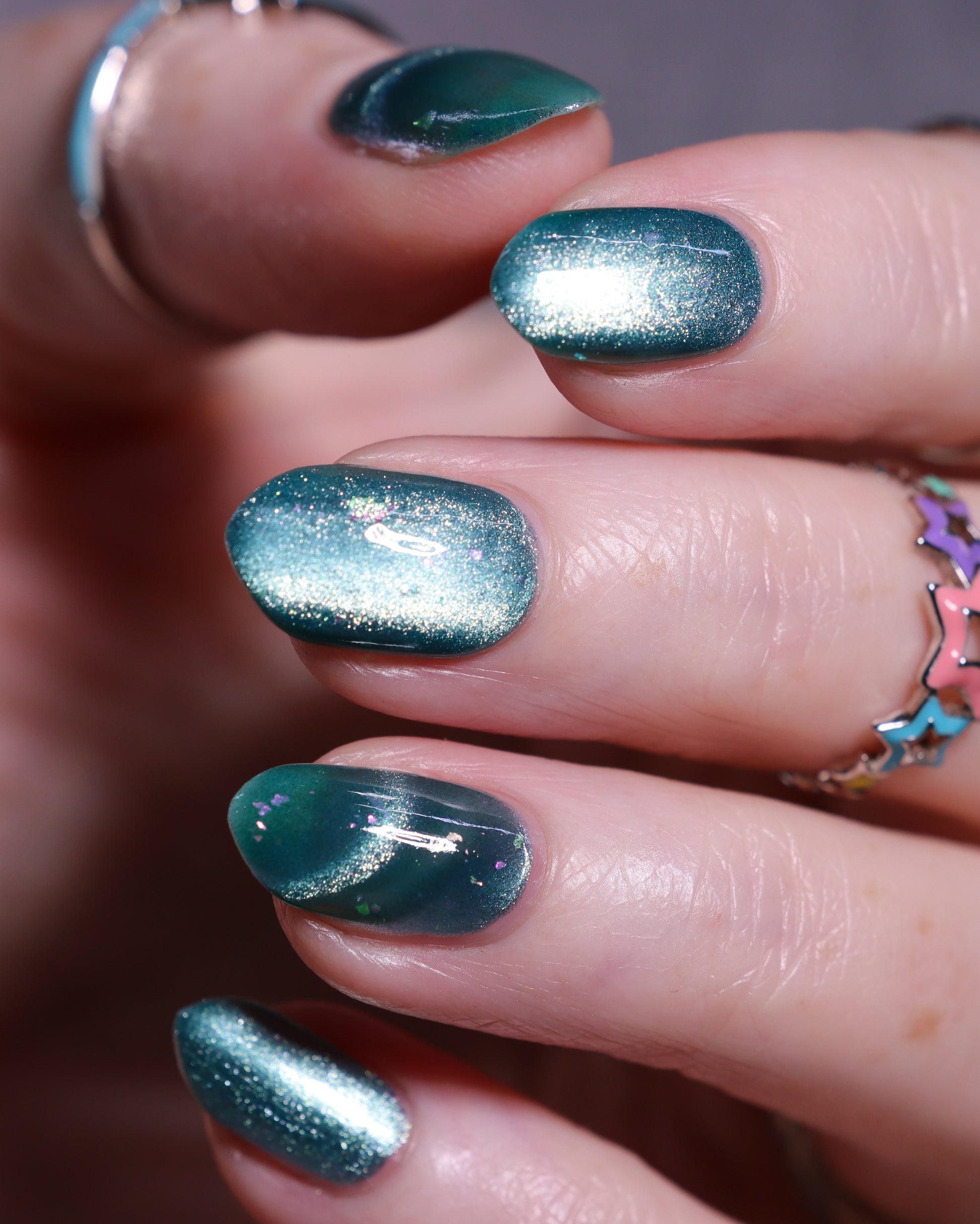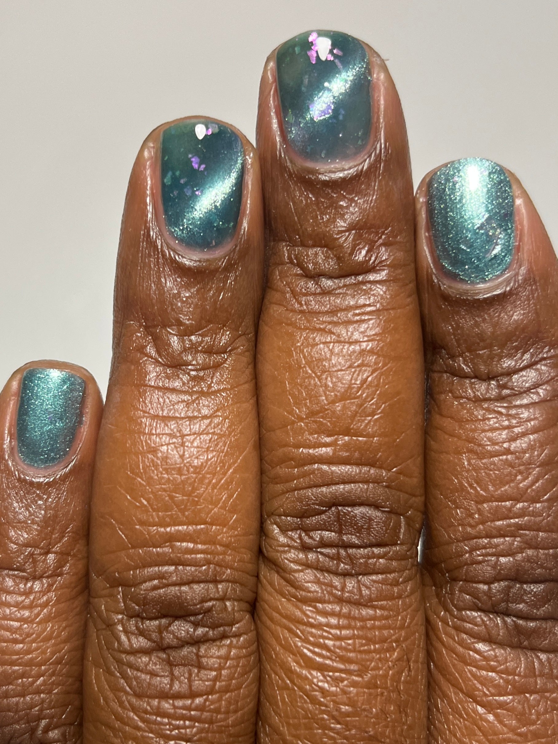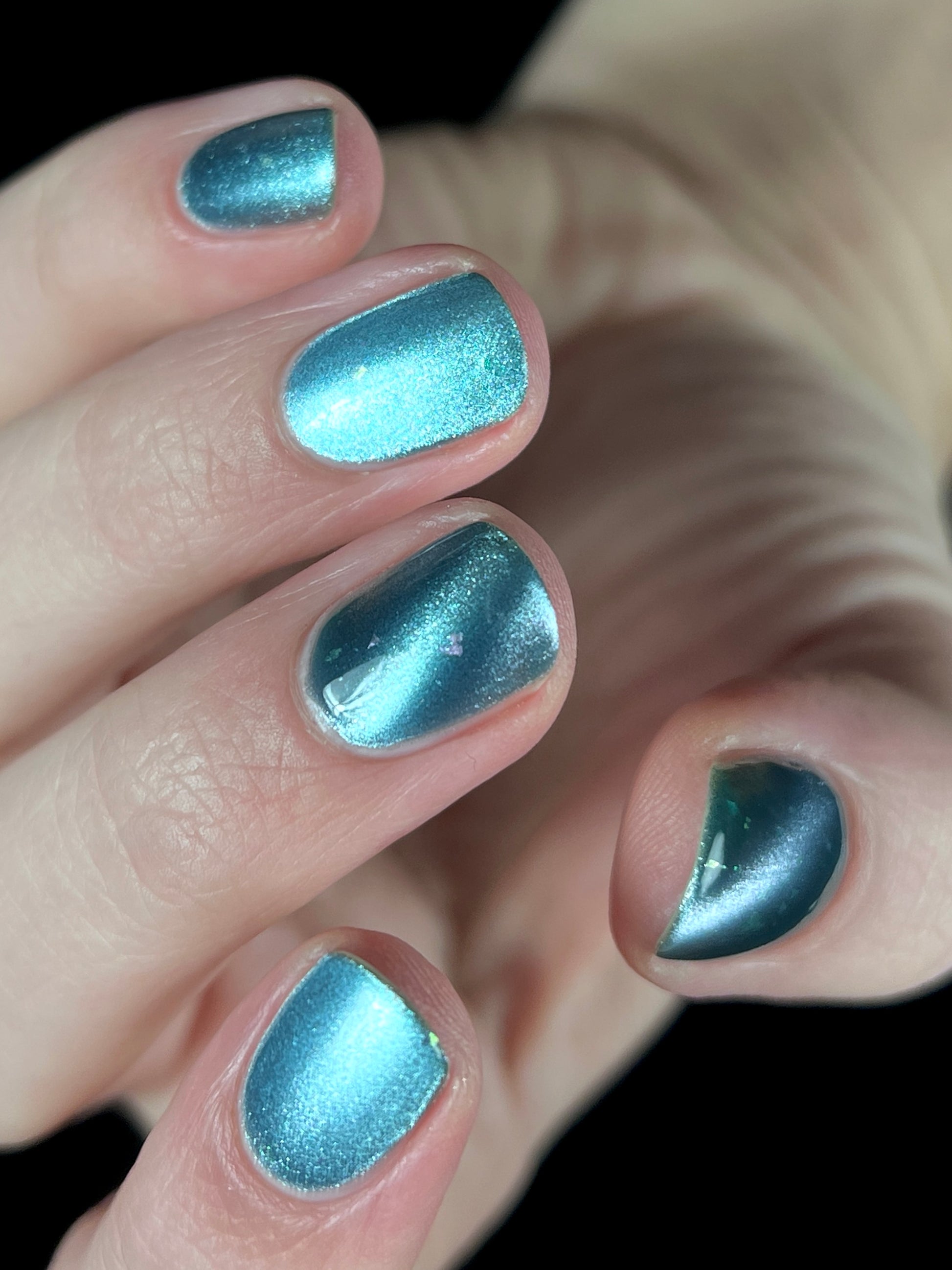 Mermacorn has a teal base with pink to purple and green to blue flakes with silver/pastel purple megnetic pigment.