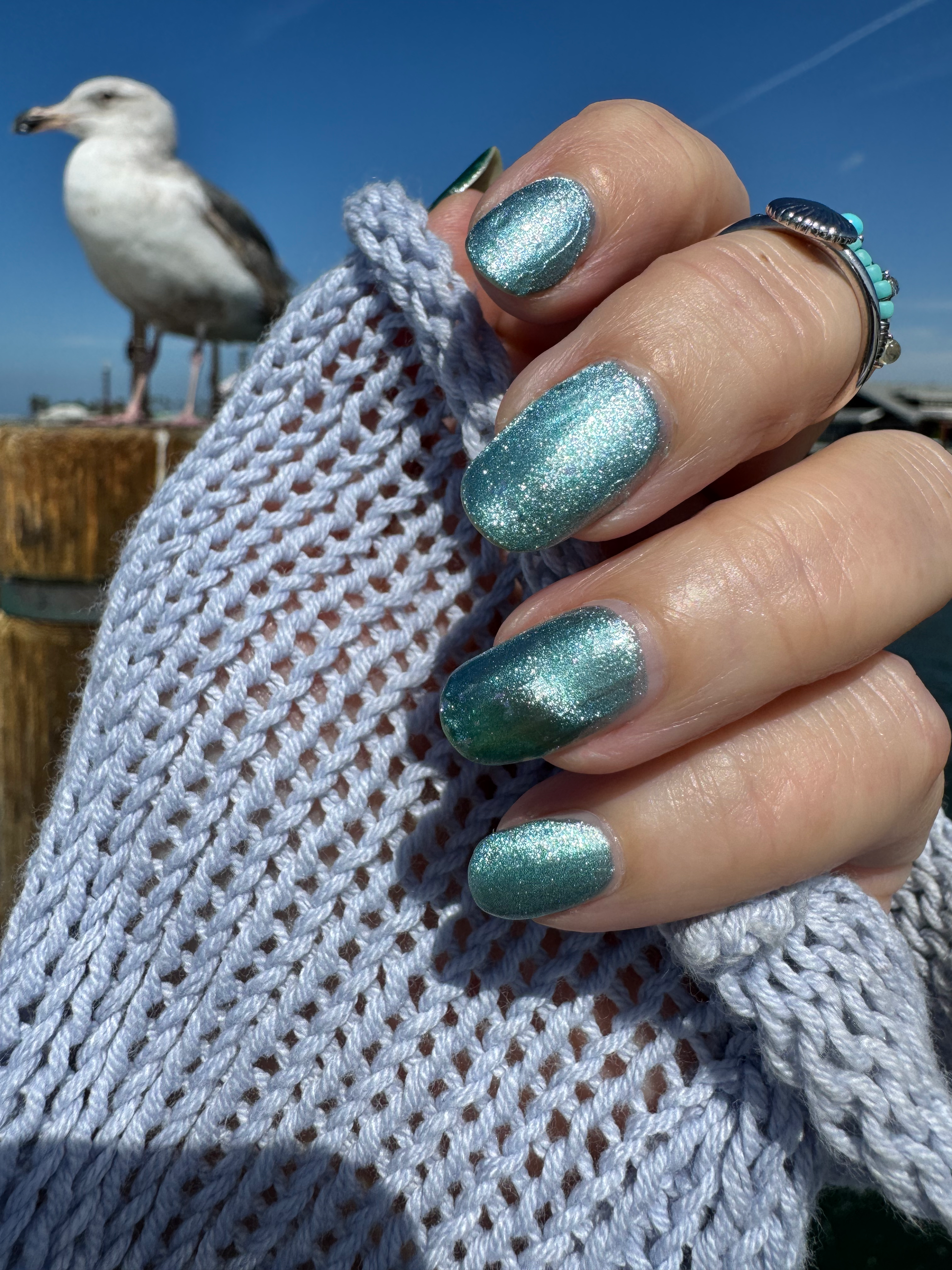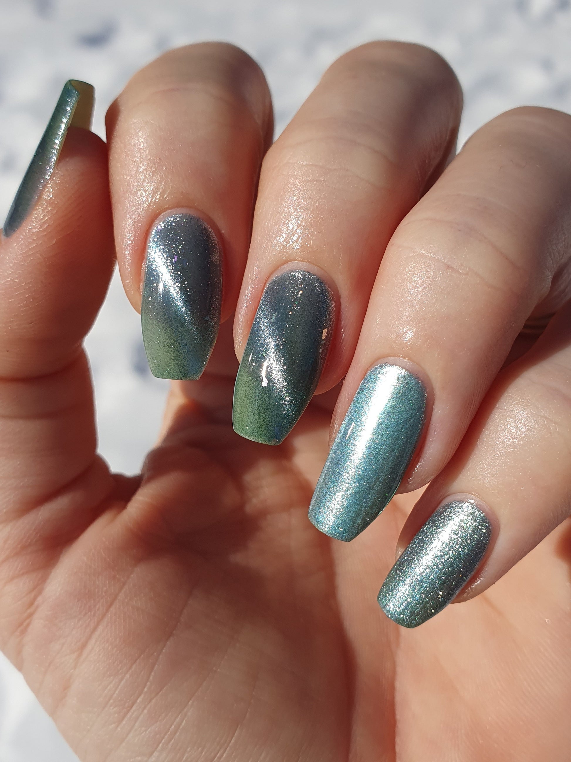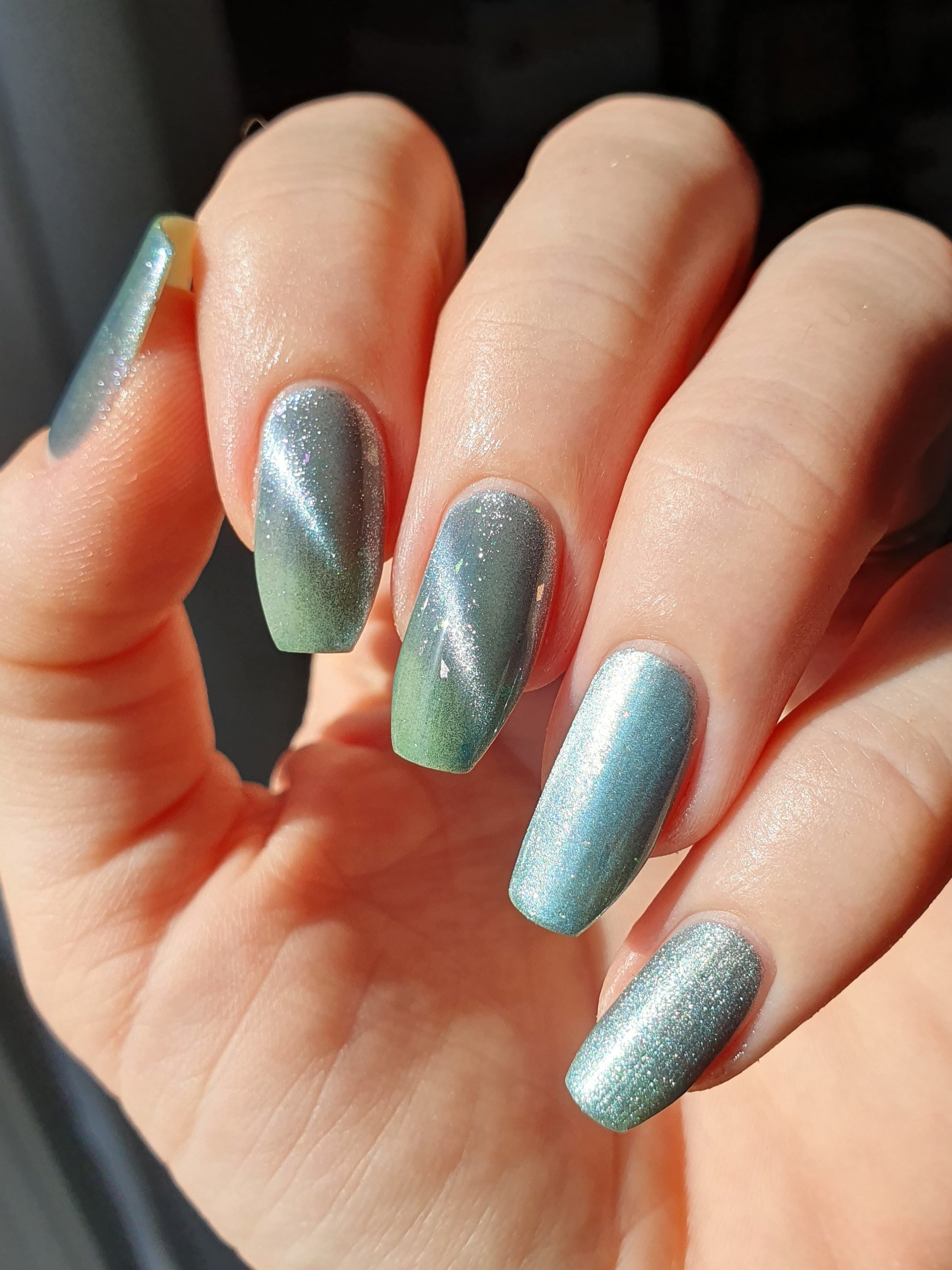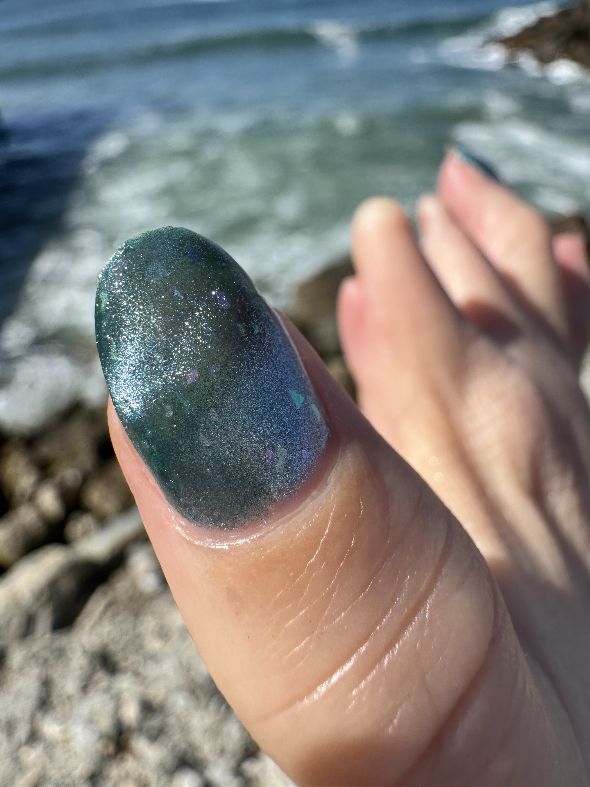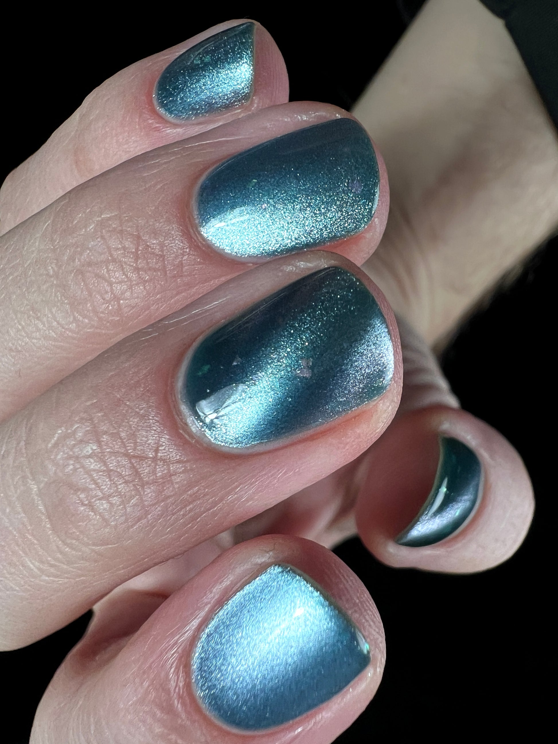 Mermacorn has a teal base with pink to purple and green to blue flakes with silver/pastel purple megnetic pigment.