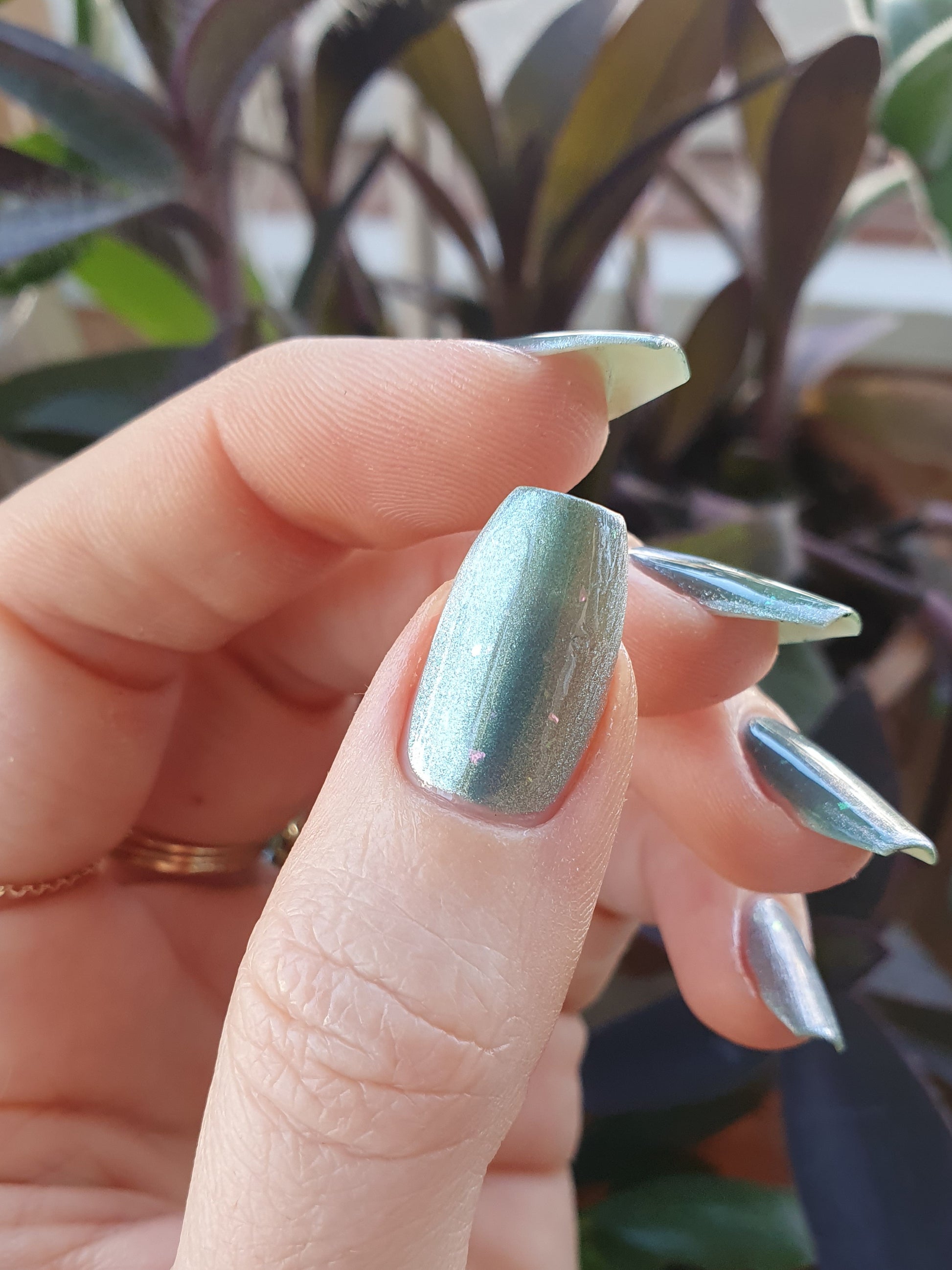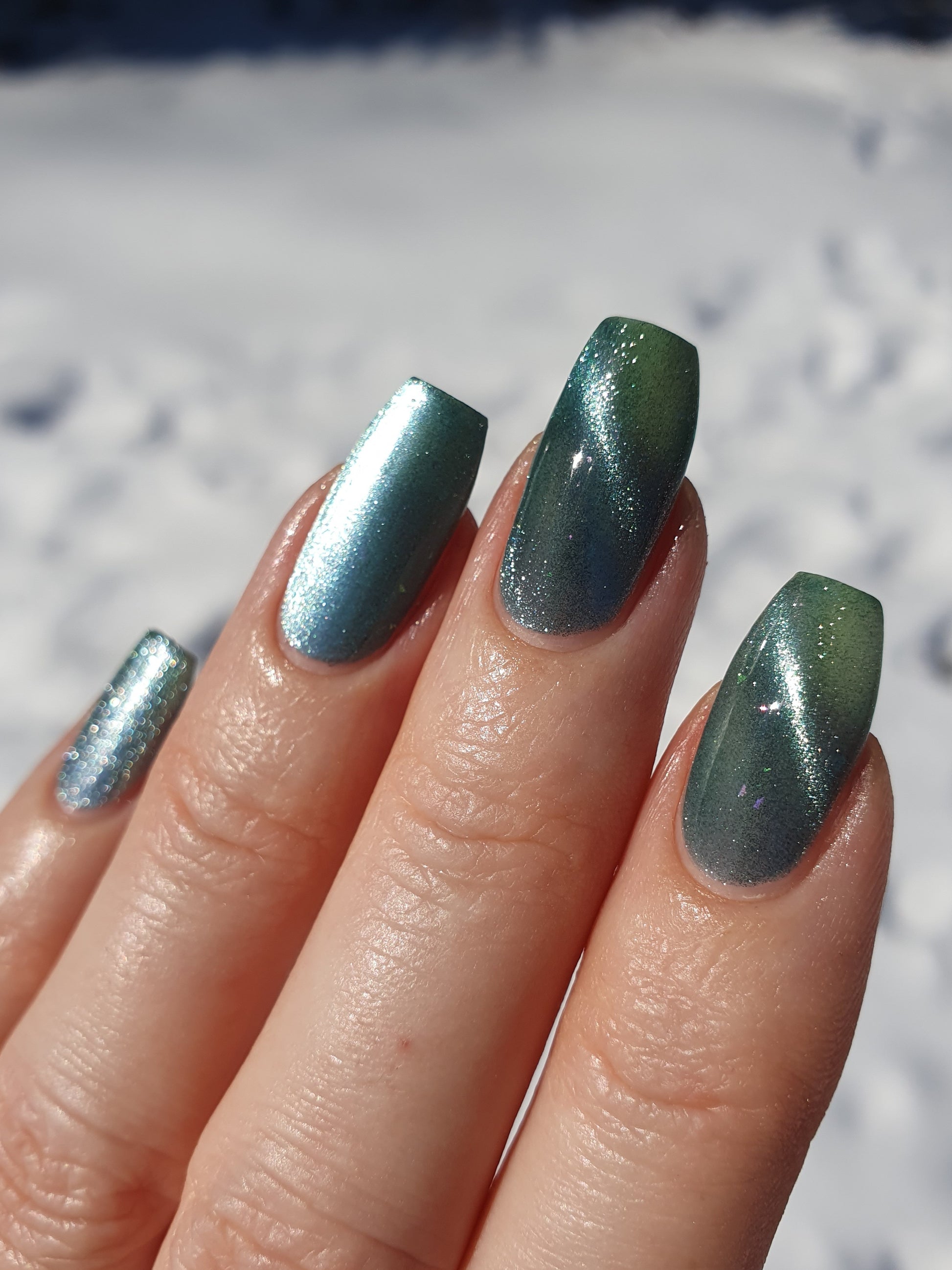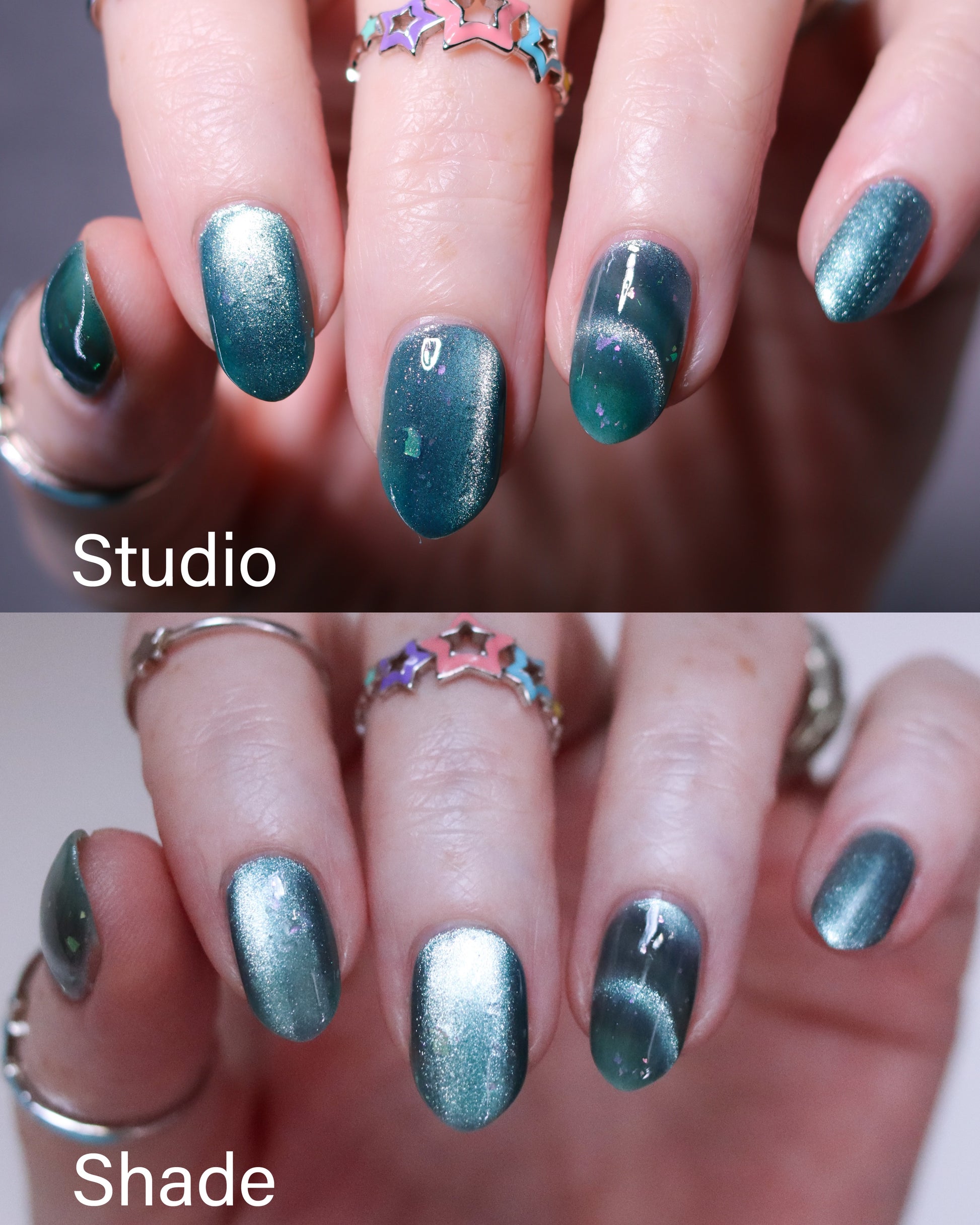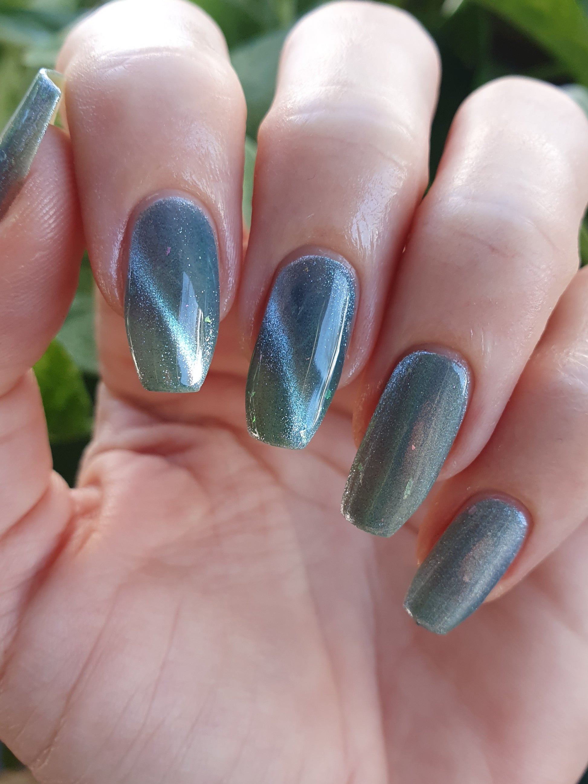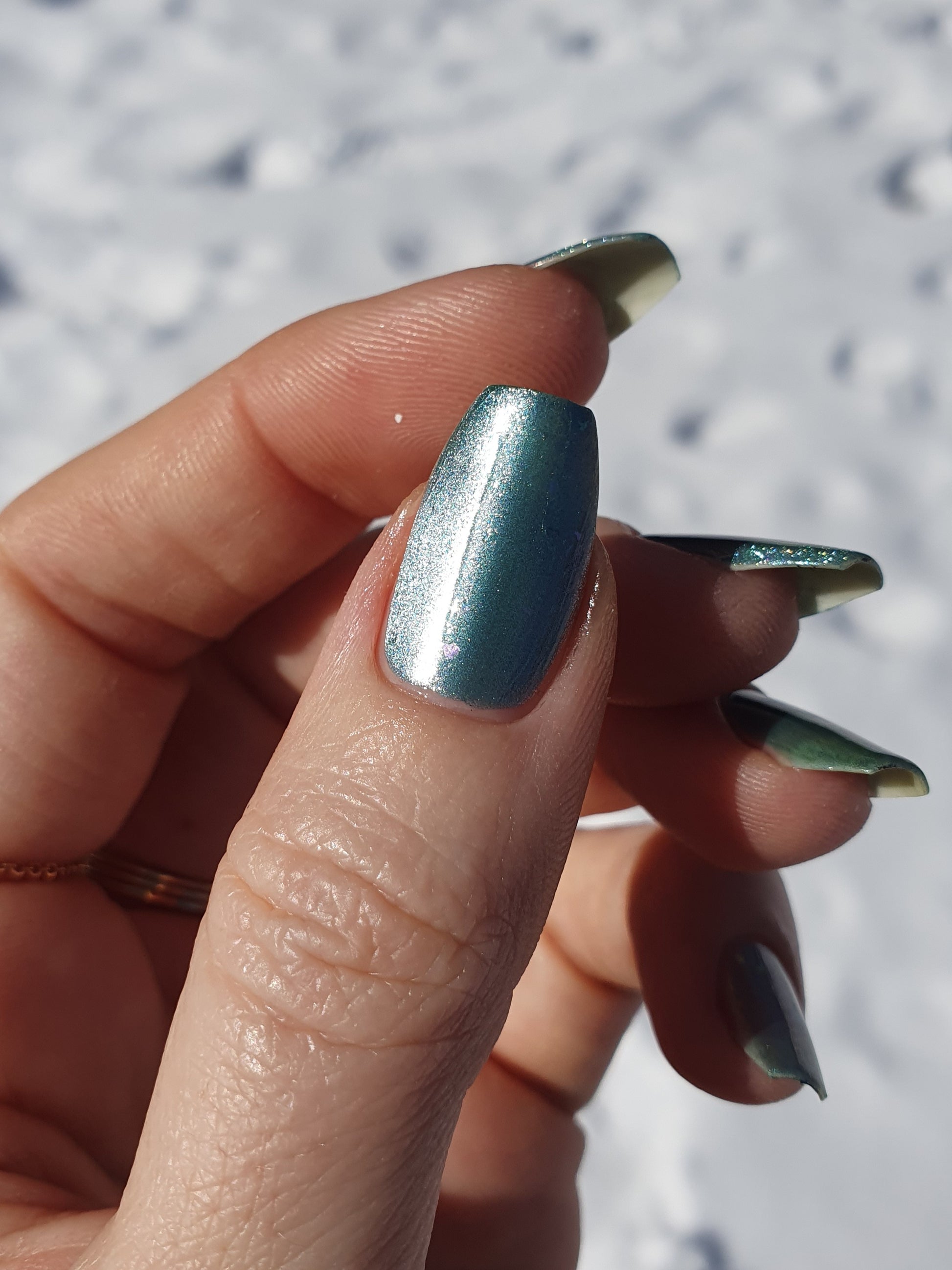 Mermacorn has a teal base with pink to purple and green to blue flakes with silver/pastel purple megnetic pigment.