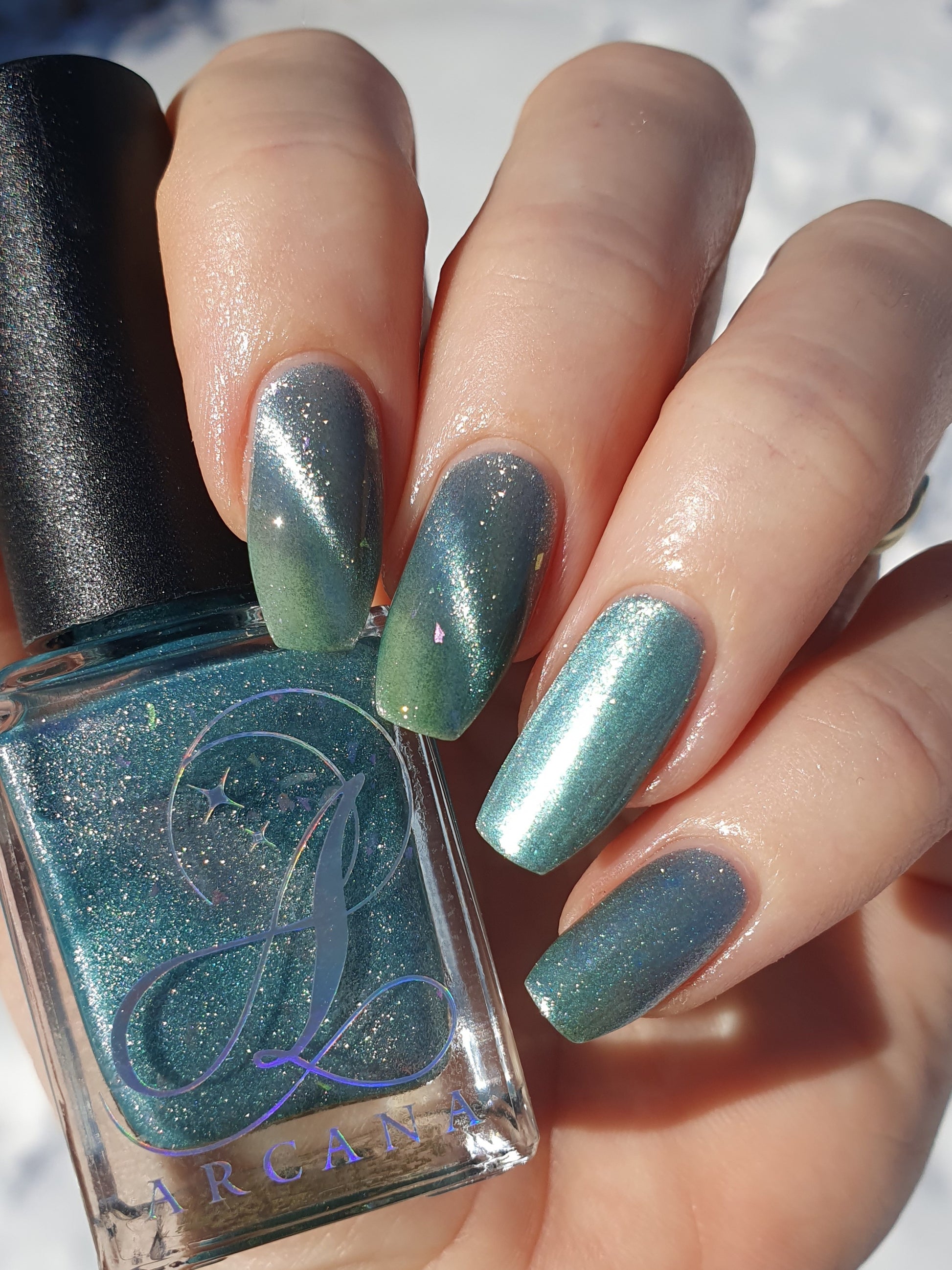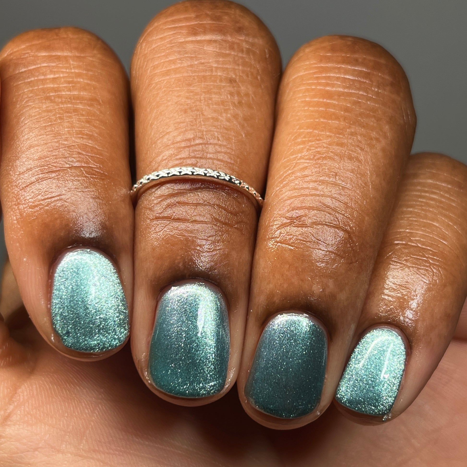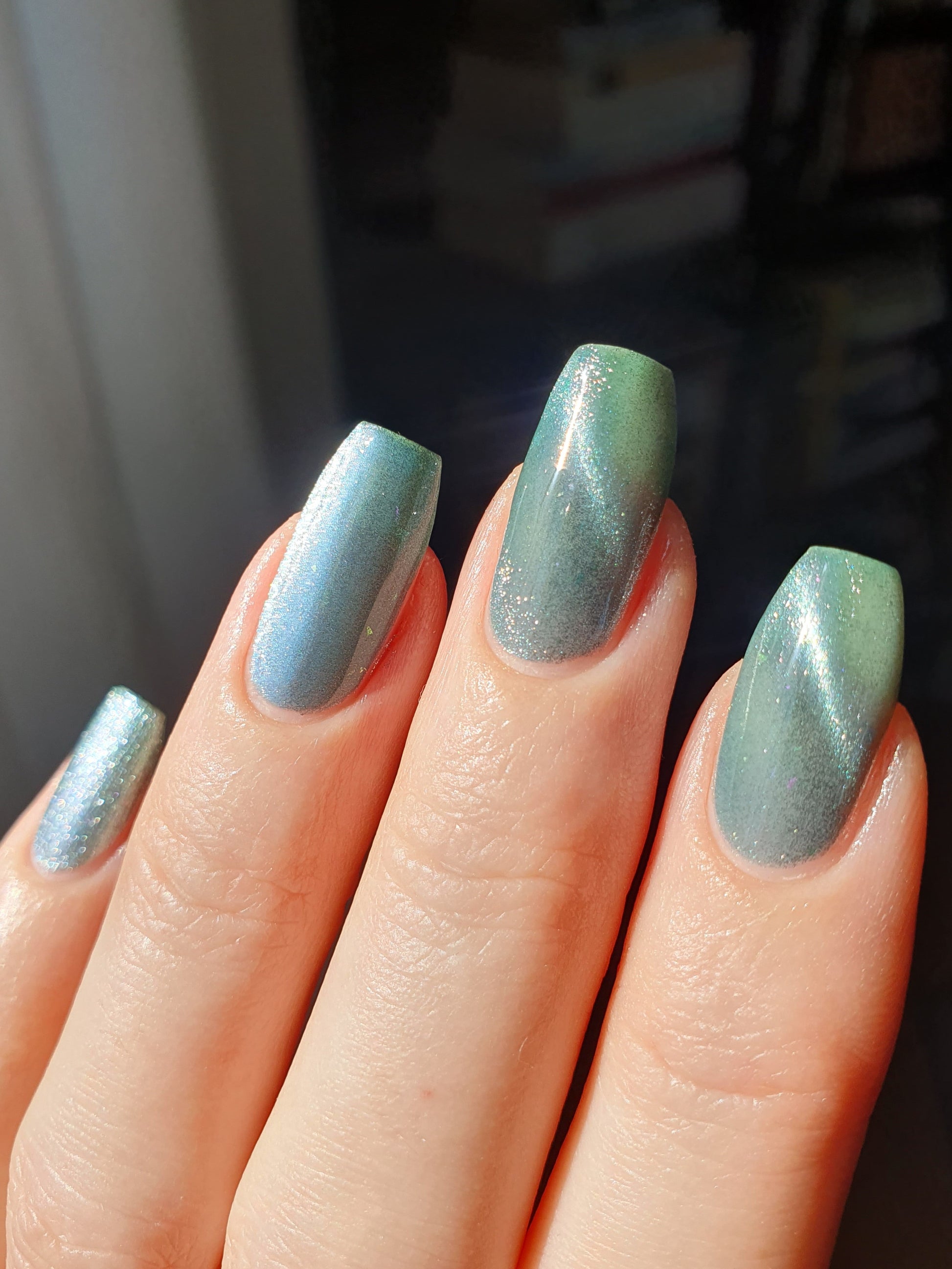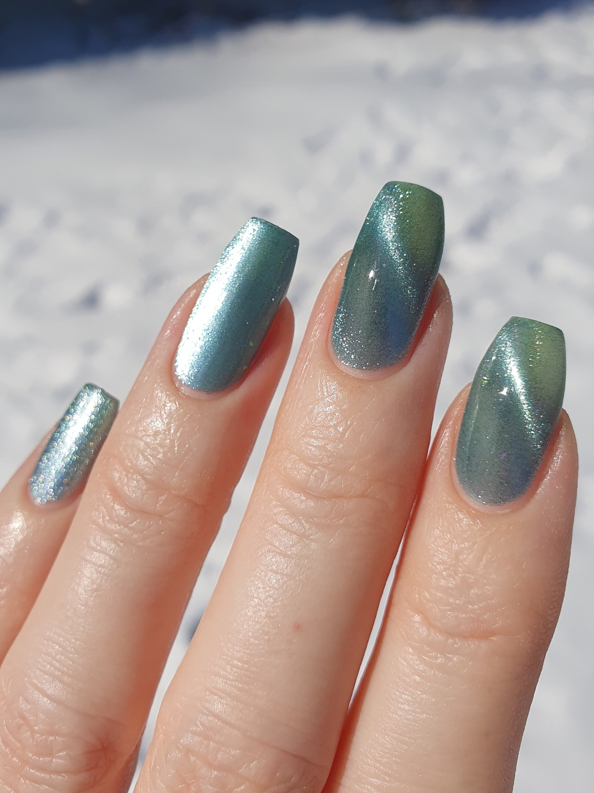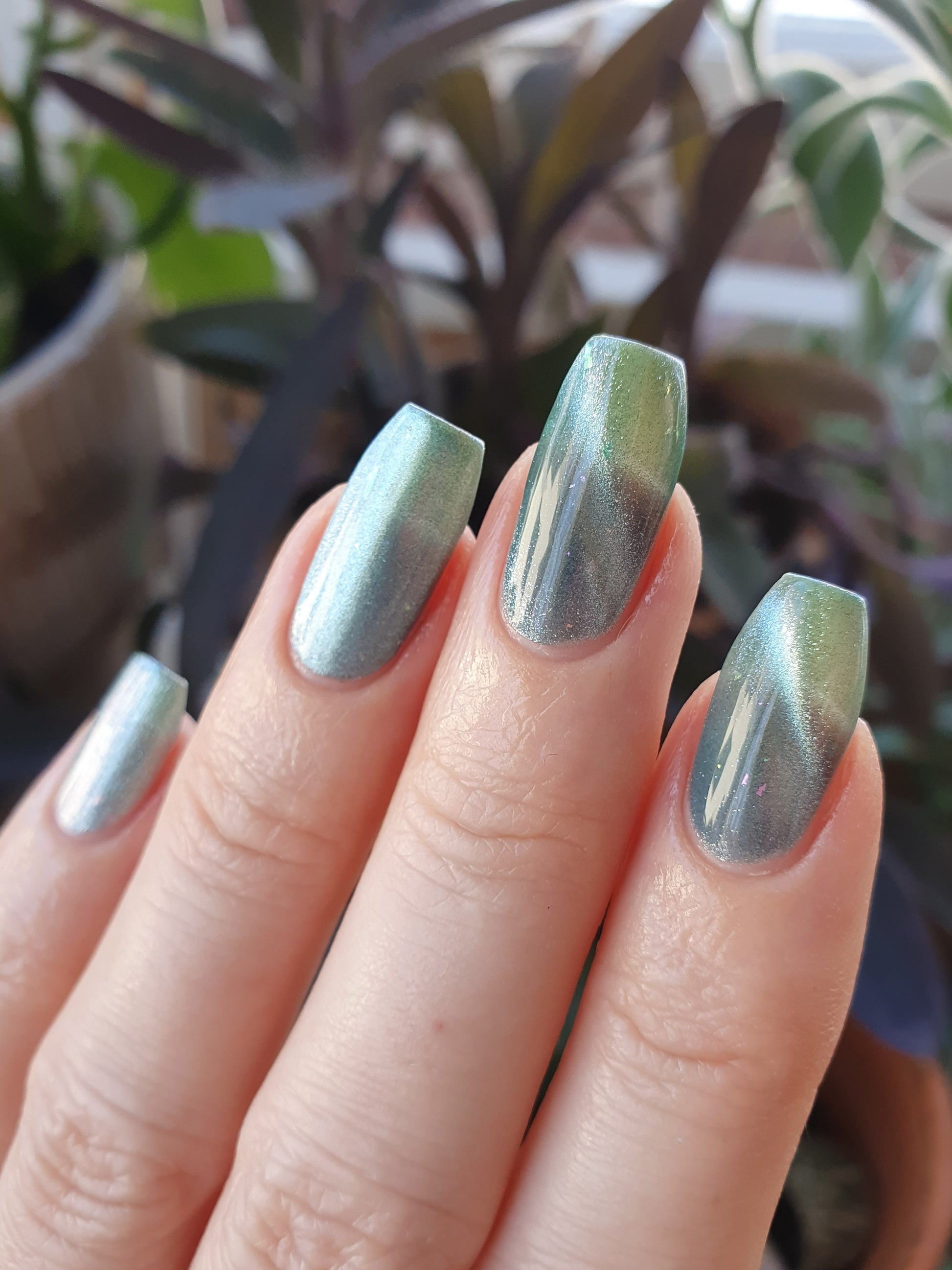 Mermacorn has a teal base with pink to purple and green to blue flakes with silver/pastel purple megnetic pigment.