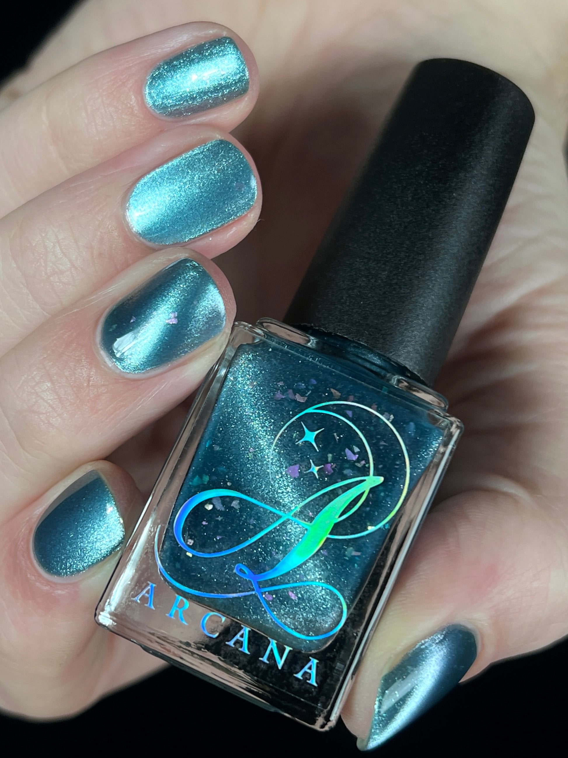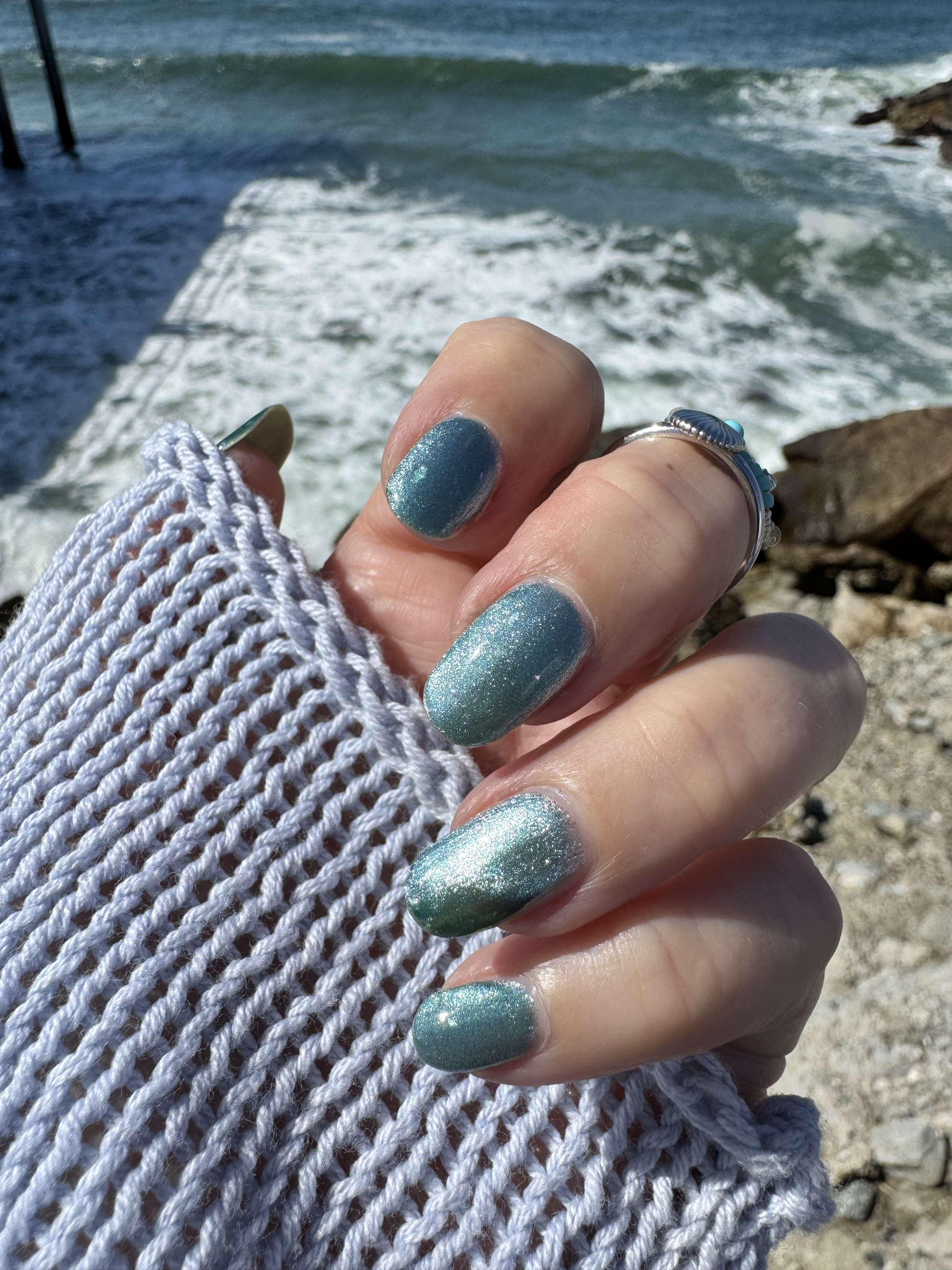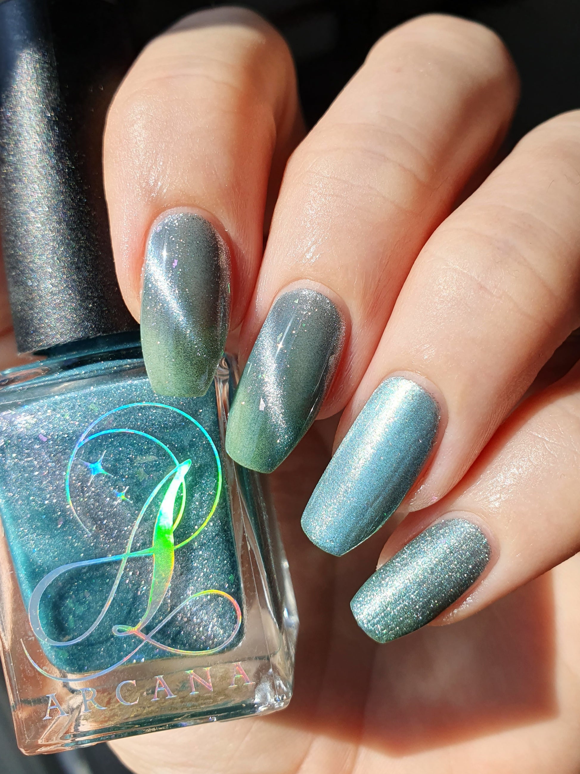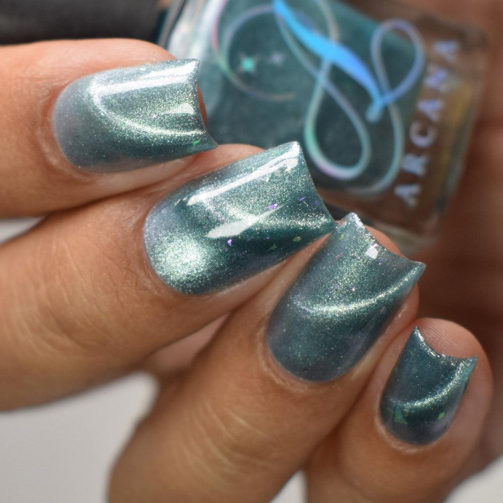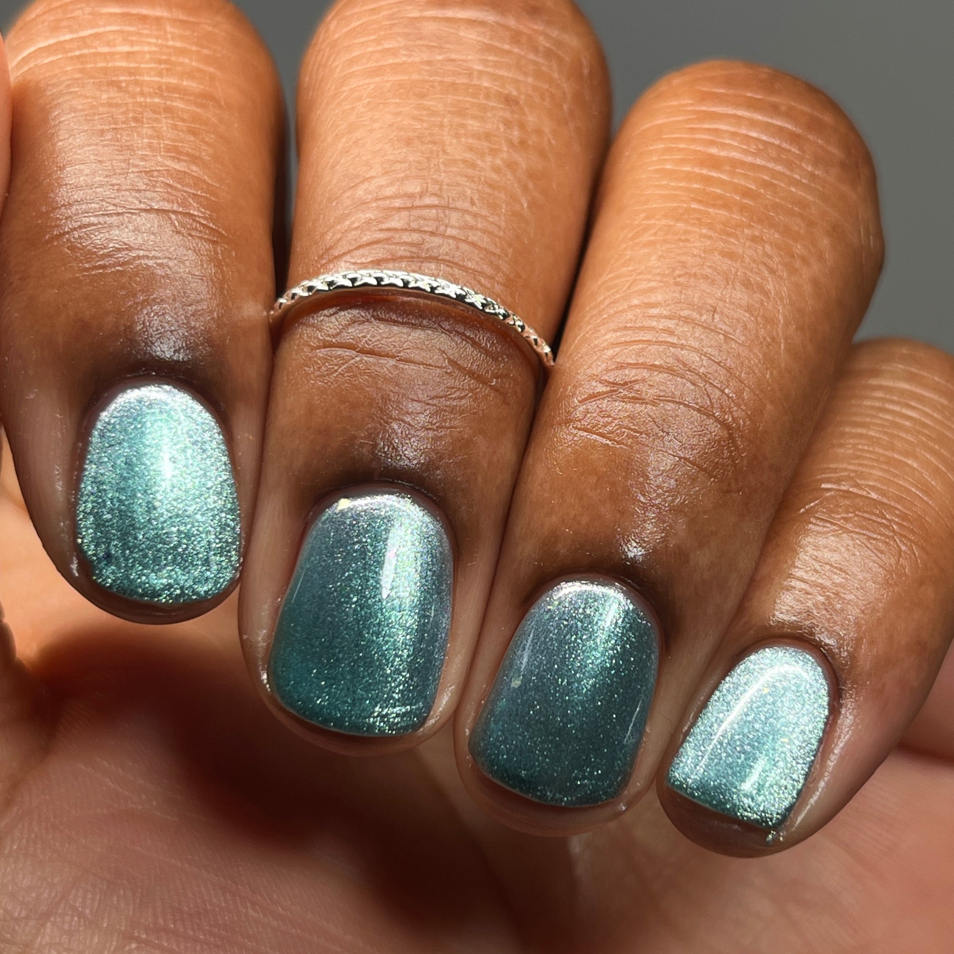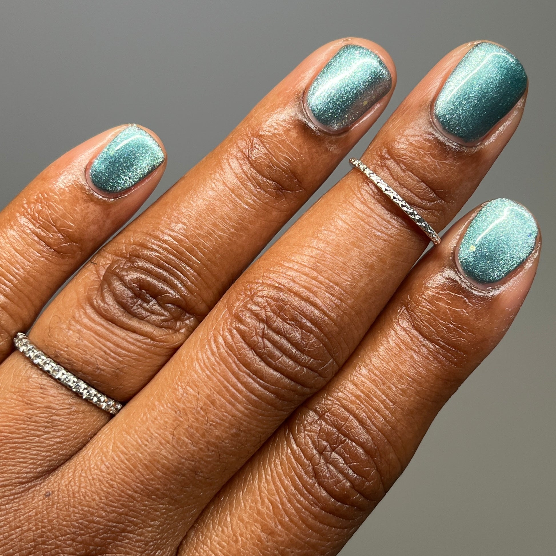 Mermacorn has a teal base with pink to purple and green to blue flakes with silver/pastel purple megnetic pigment.