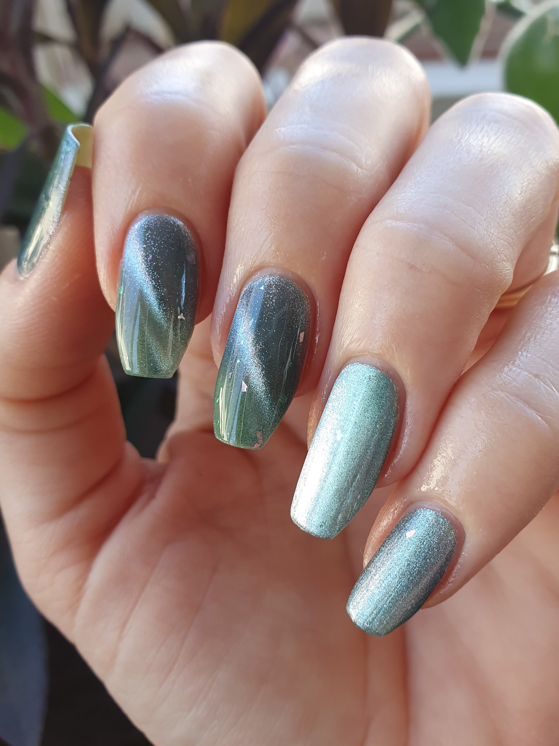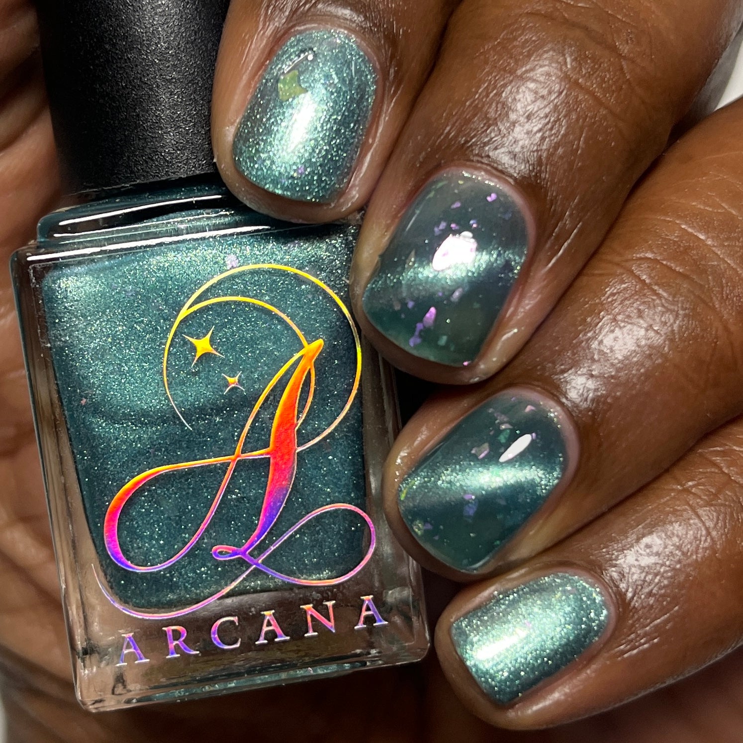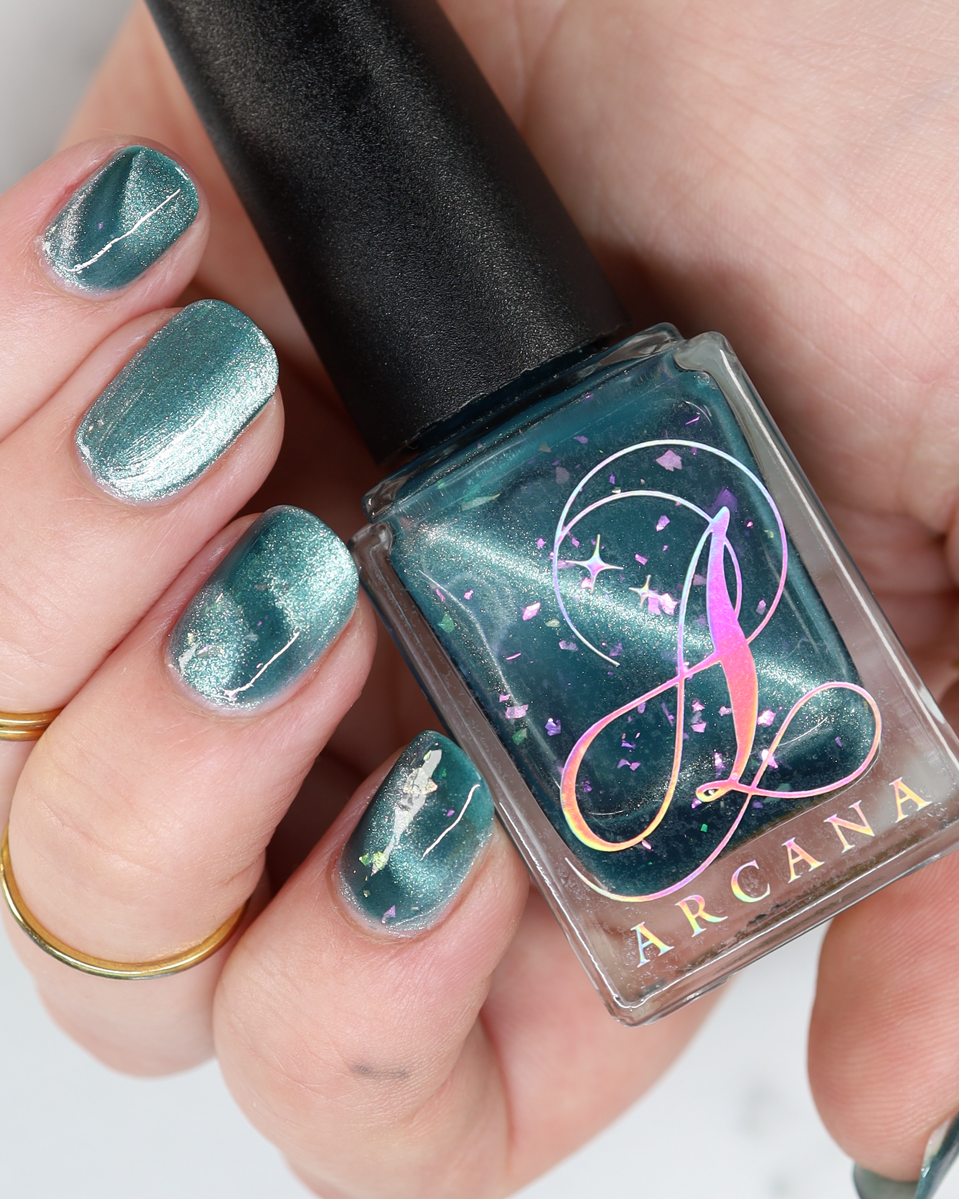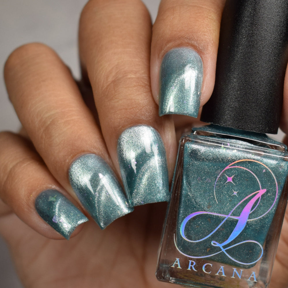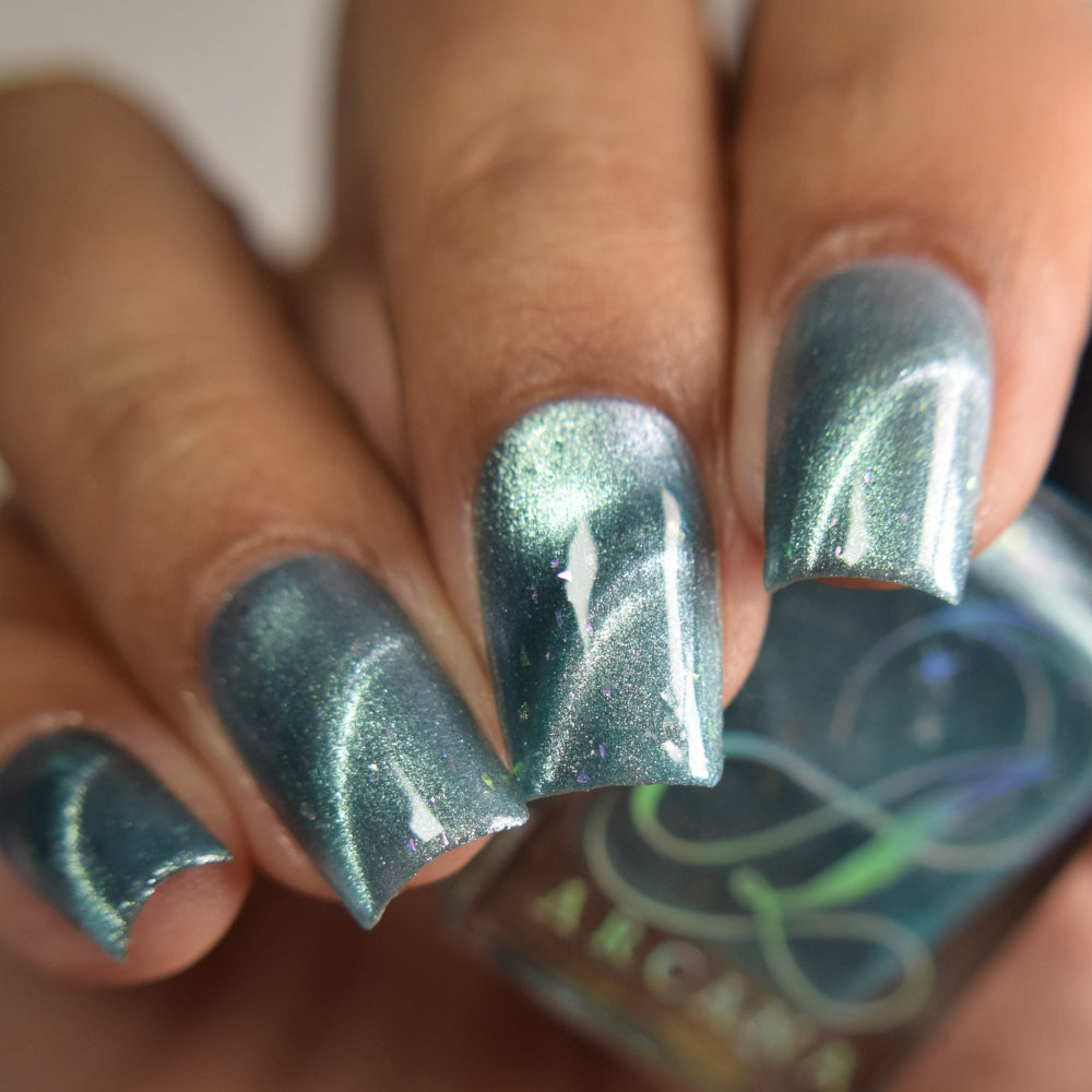 Mermacorn has a teal base with pink to purple and green to blue flakes with silver/pastel purple megnetic pigment.
