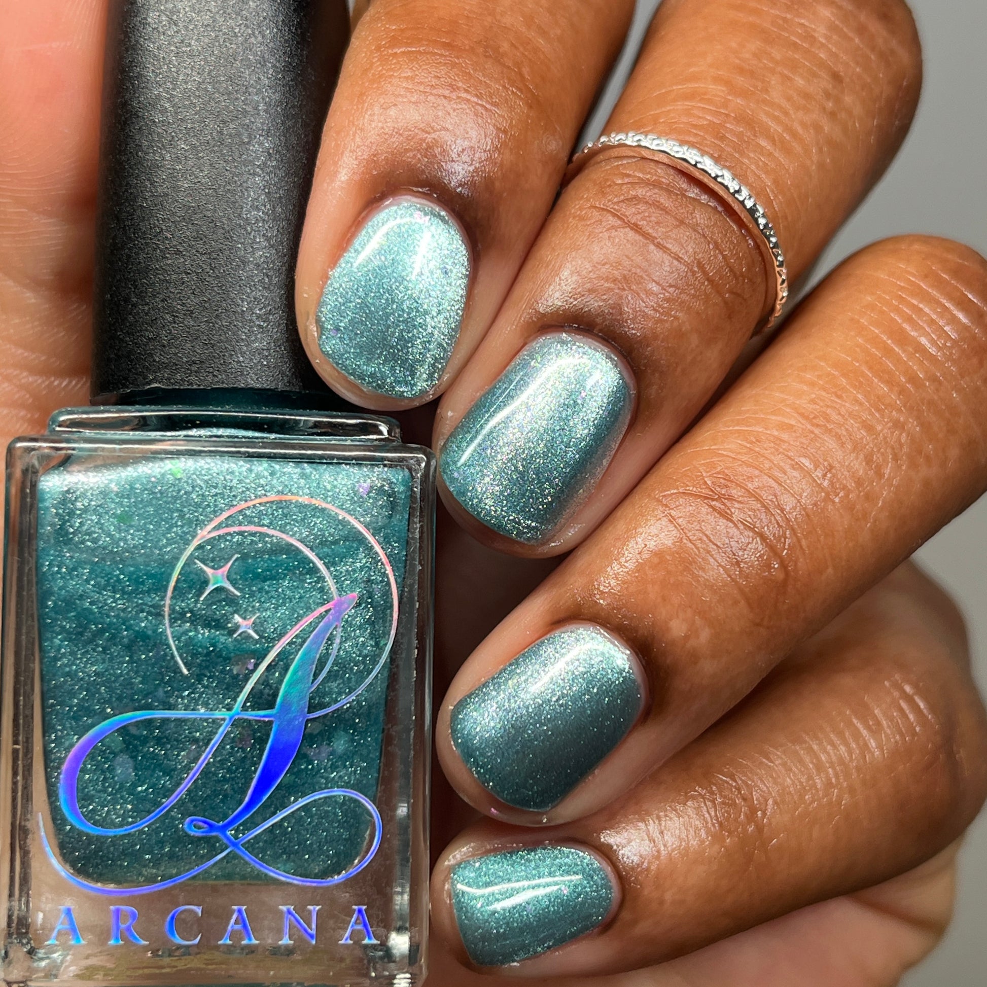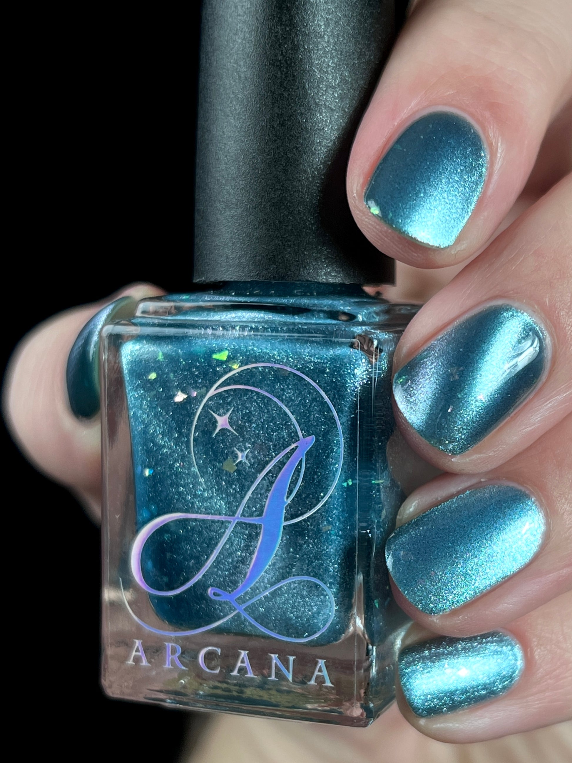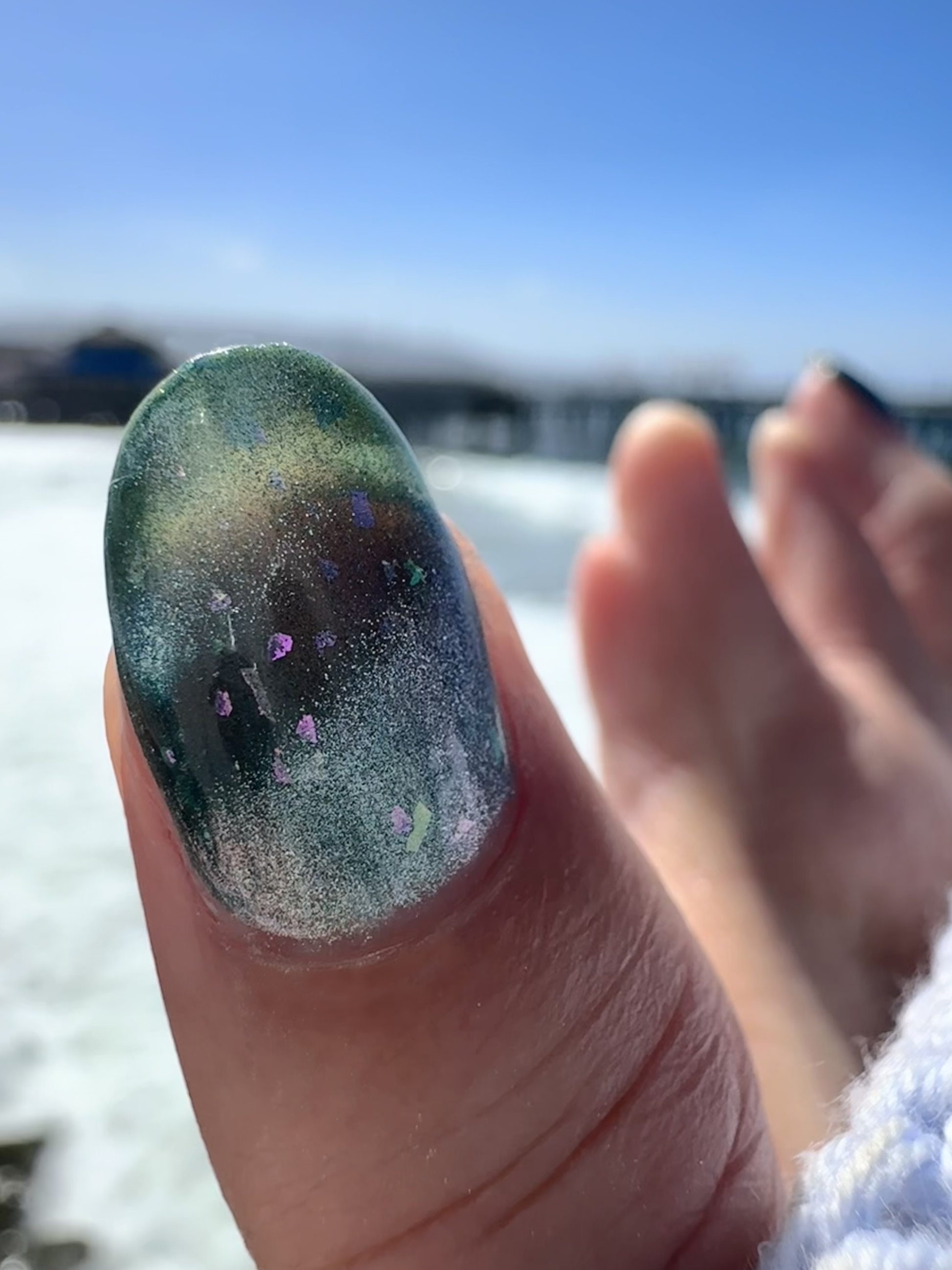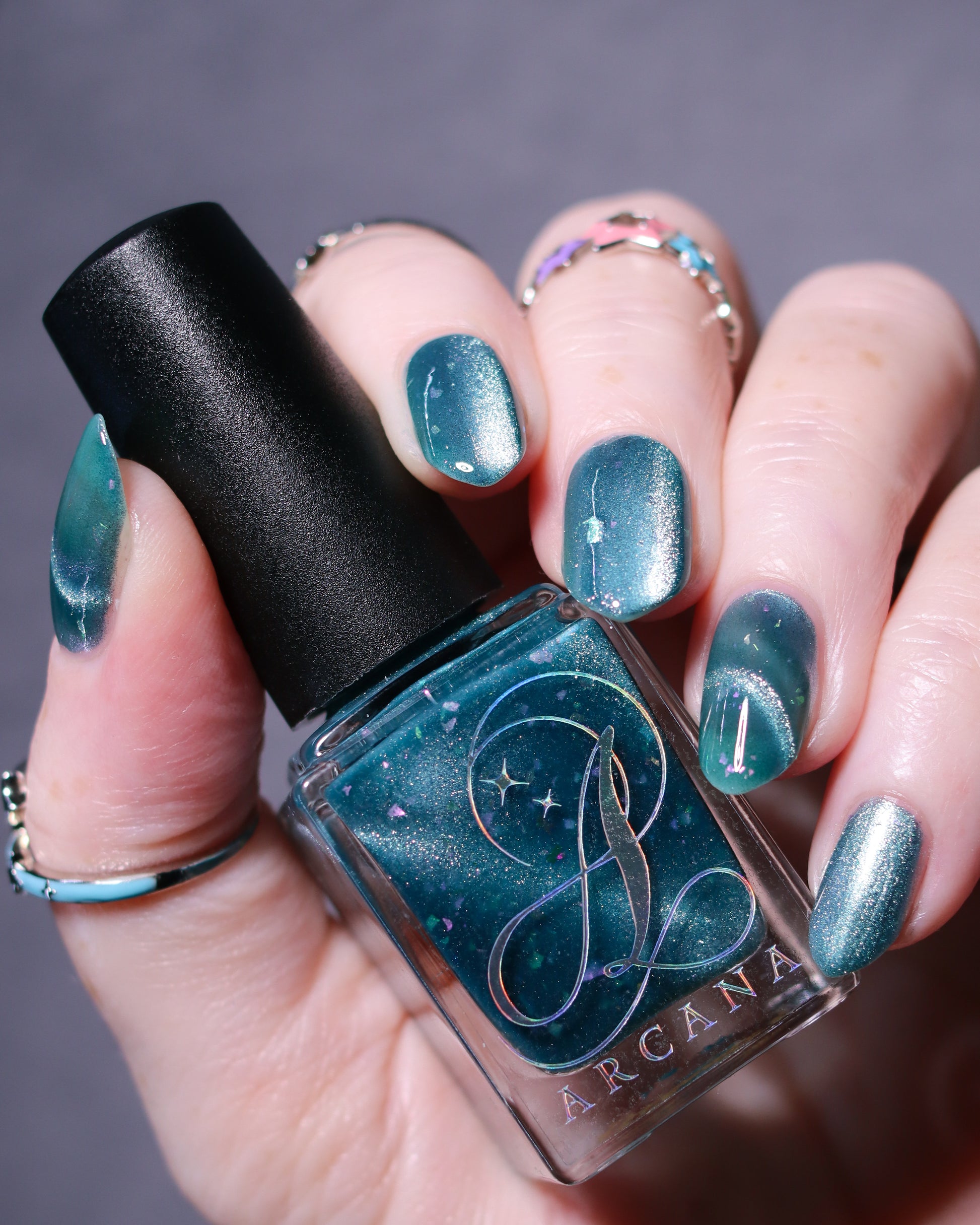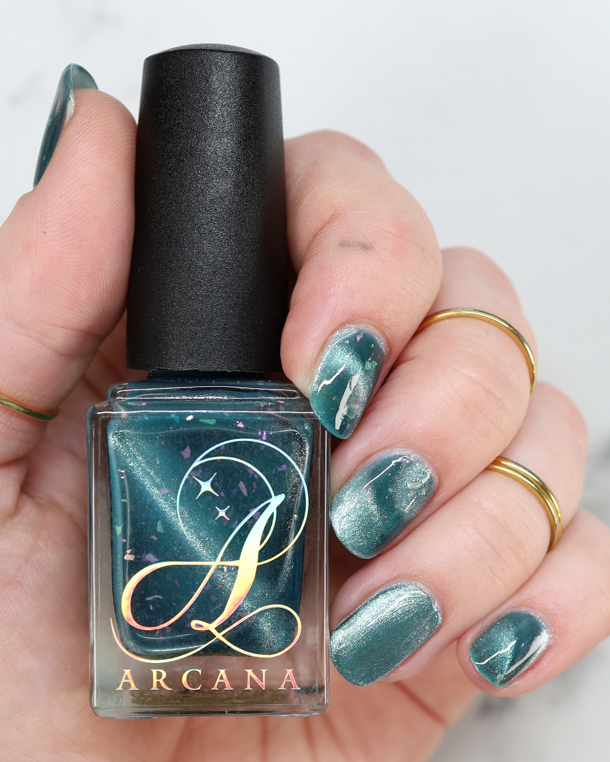 Mermacorn has a teal base with pink to purple and green to blue flakes with silver/pastel purple megnetic pigment.