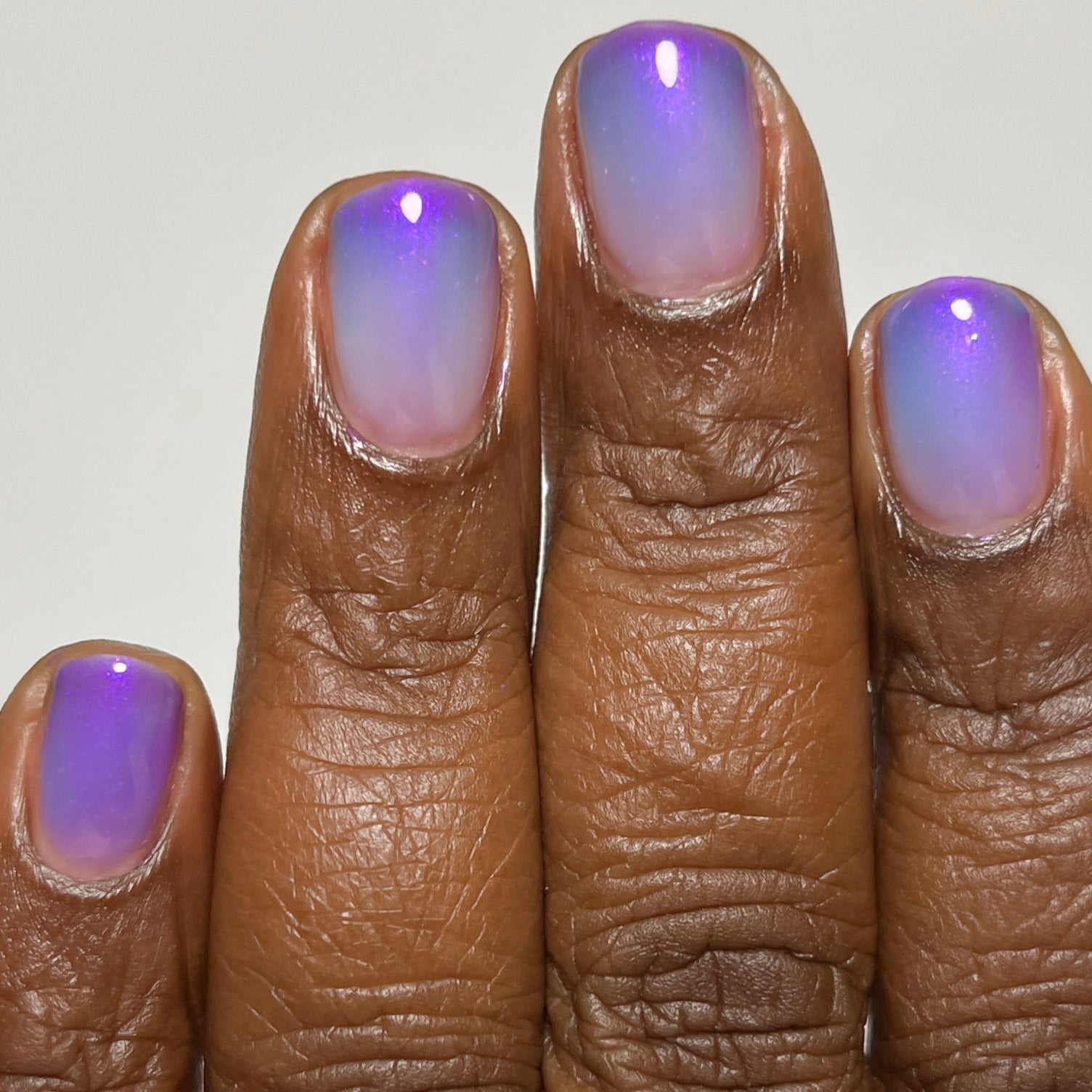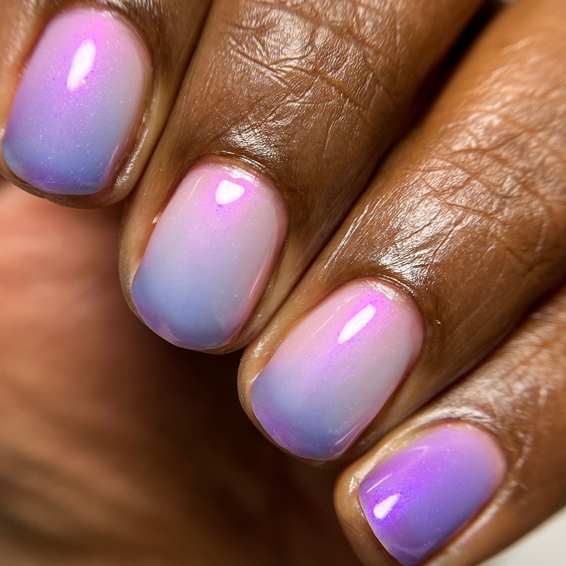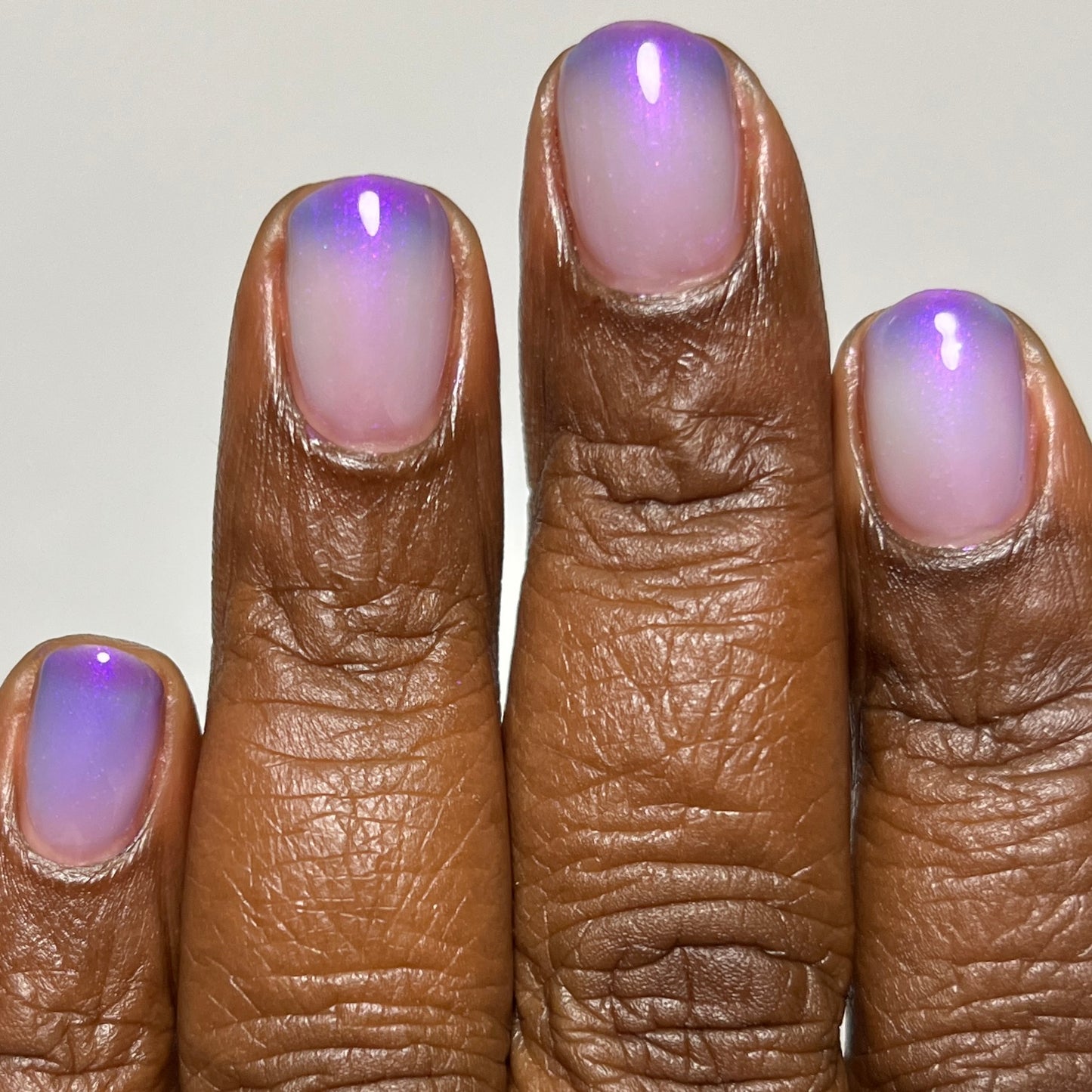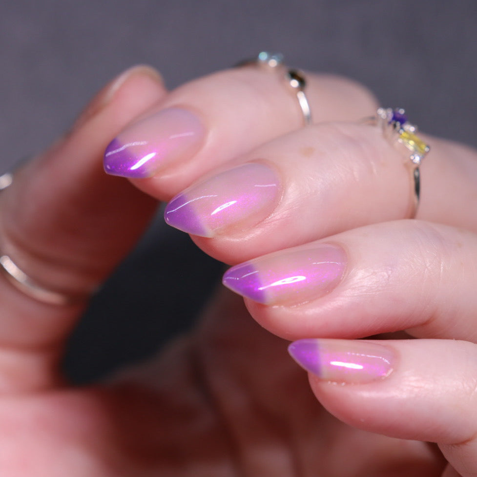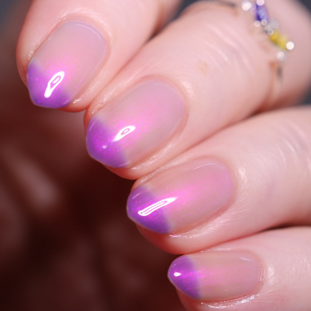 A milky violet (cold) to blue (in-between) to white (warm) tri-thermal with violet to red shimmer.