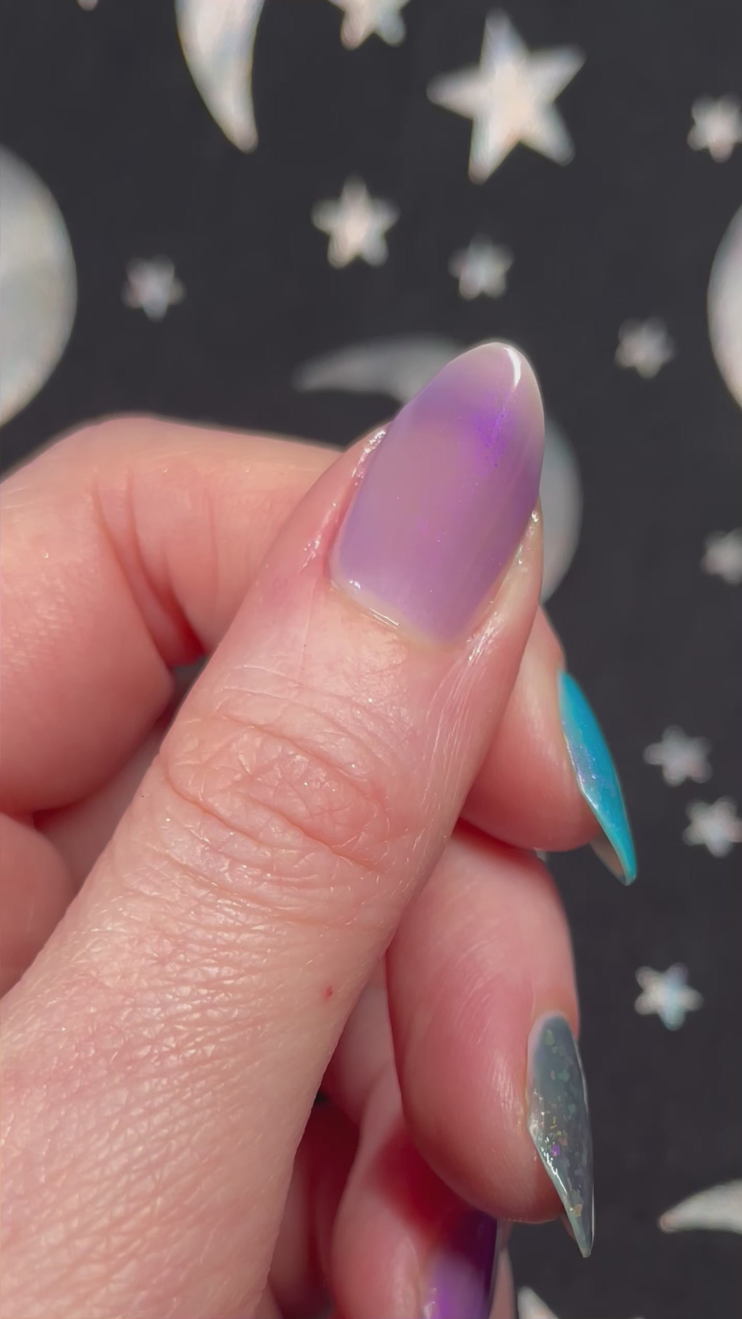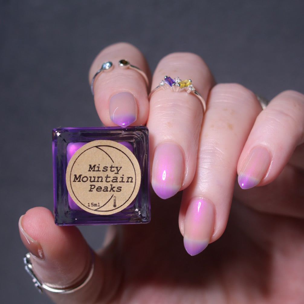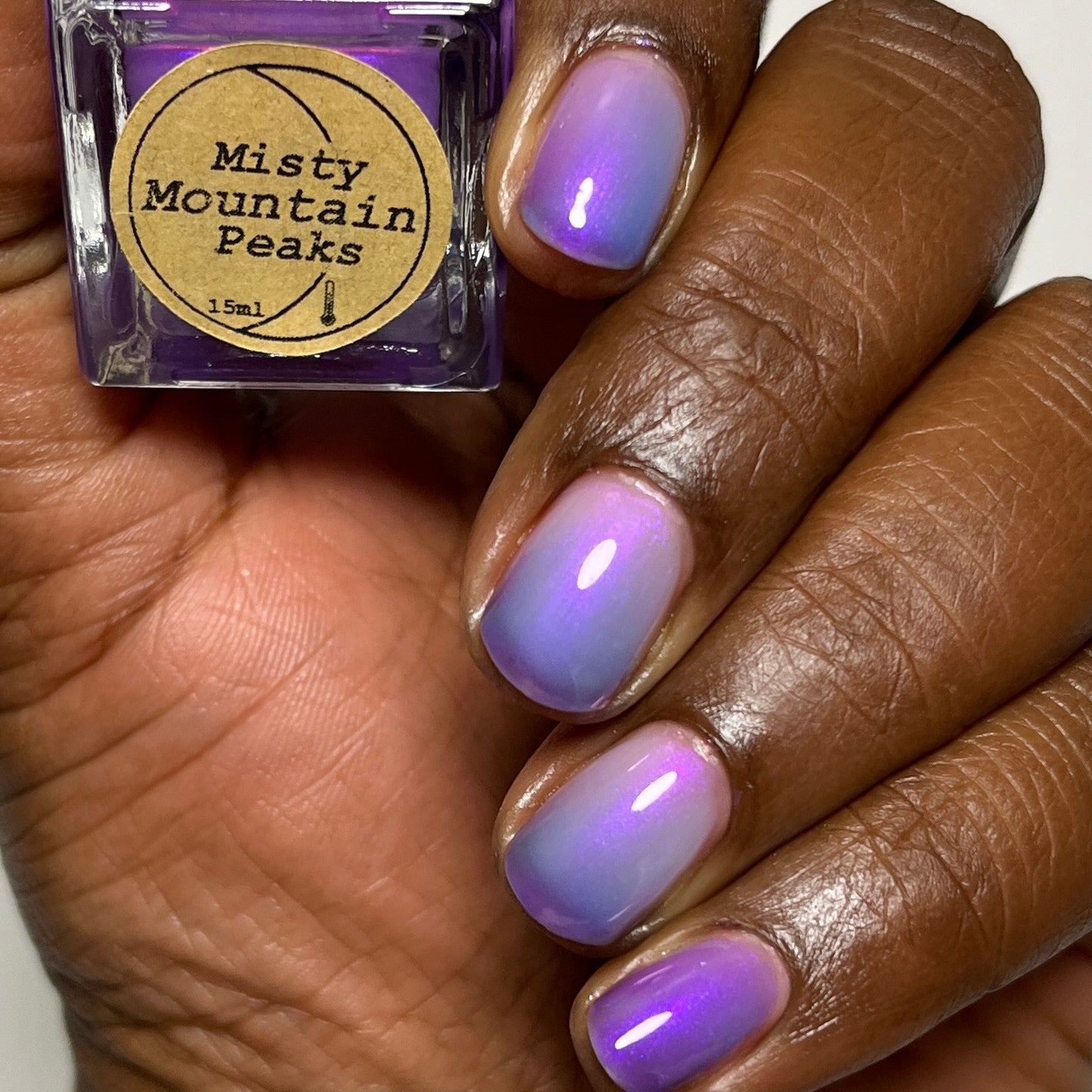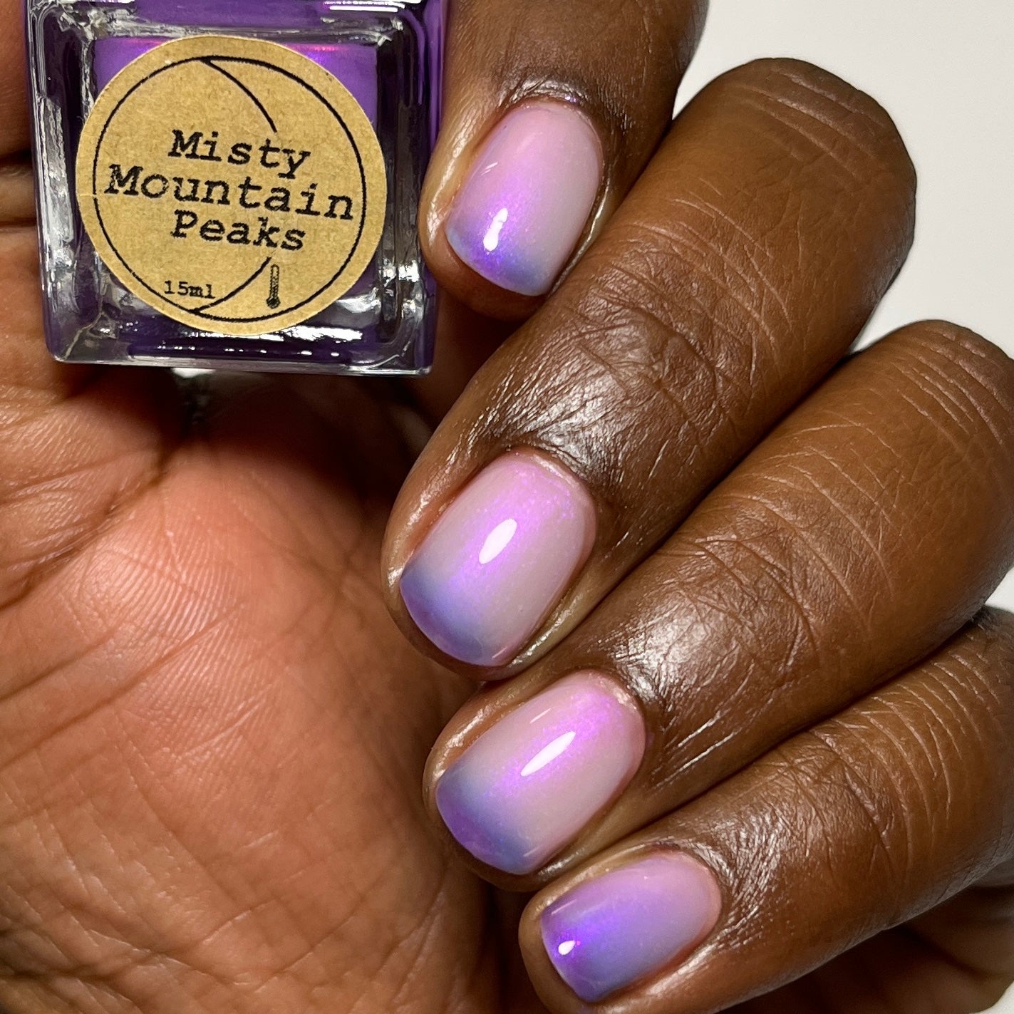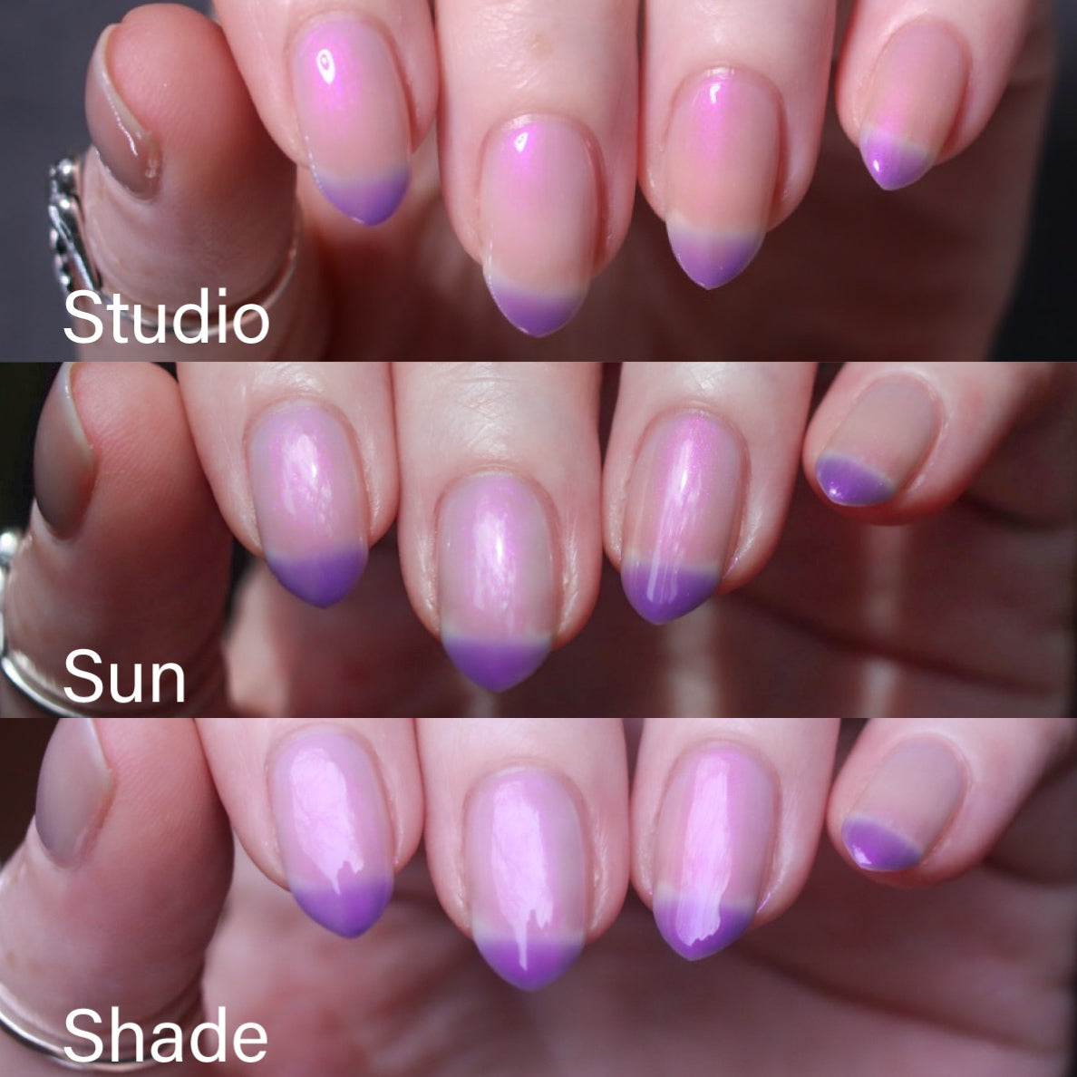 A milky violet (cold) to blue (in-between) to white (warm) tri-thermal with violet to red shimmer.