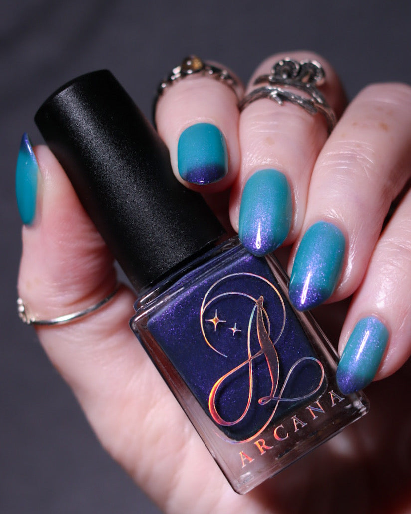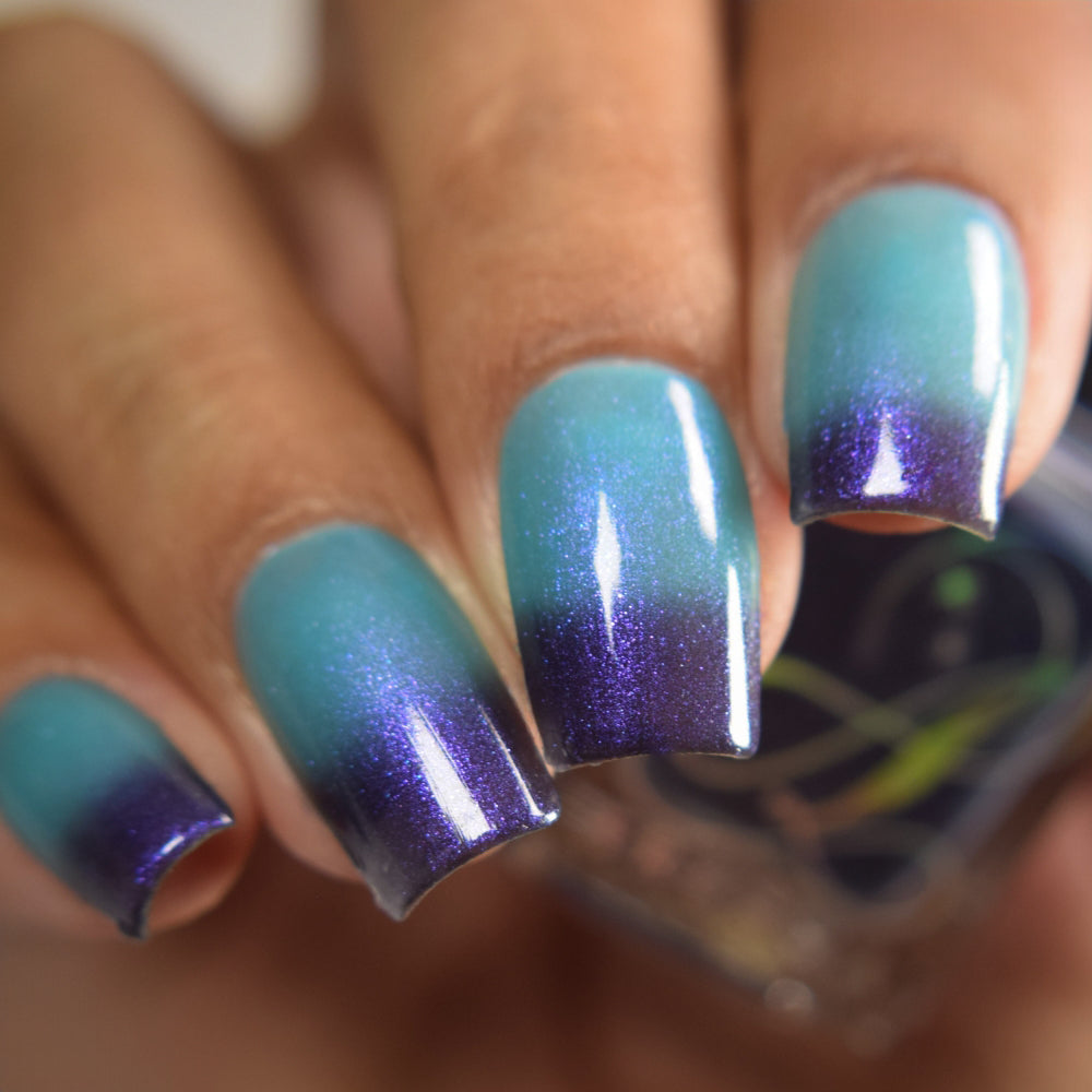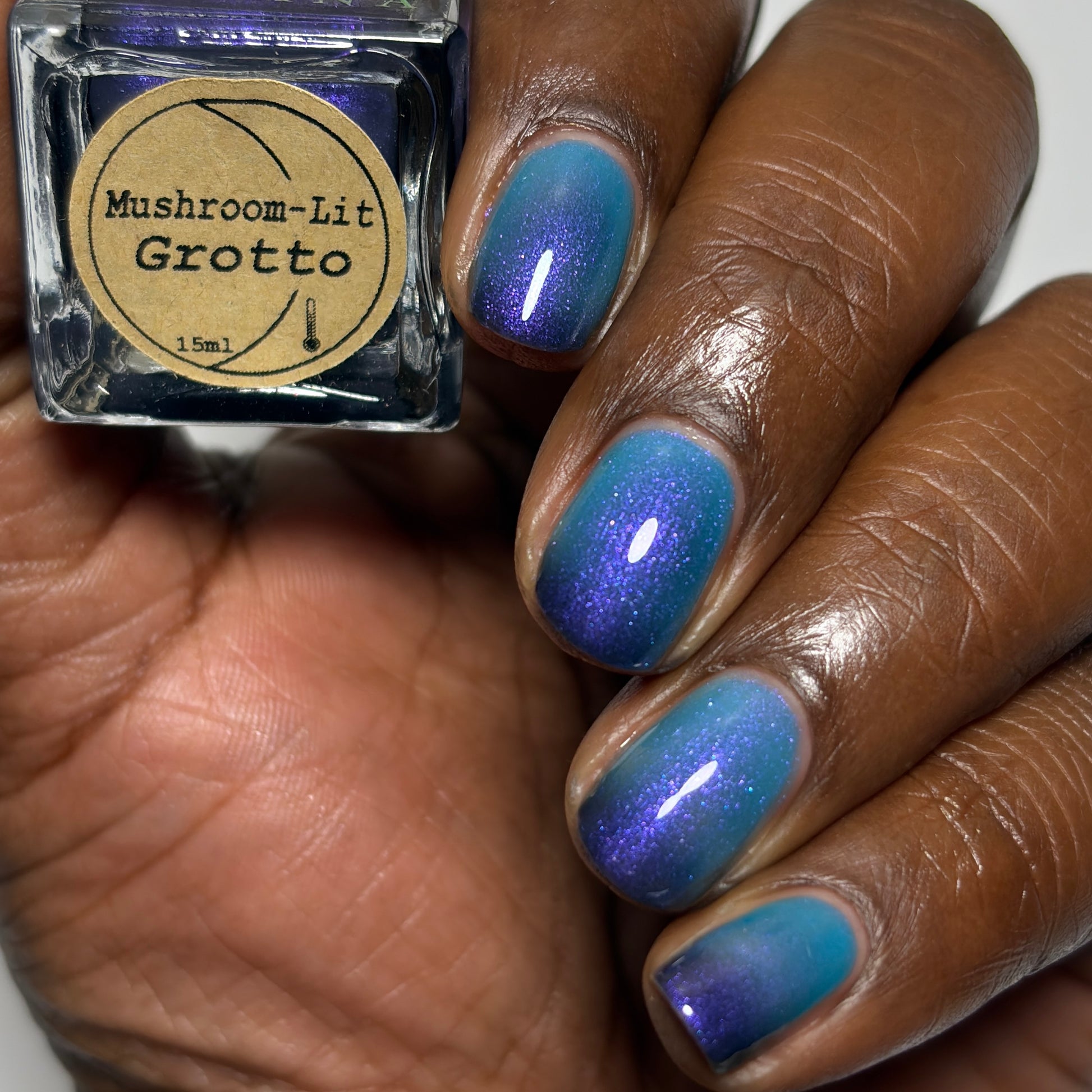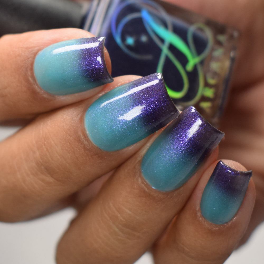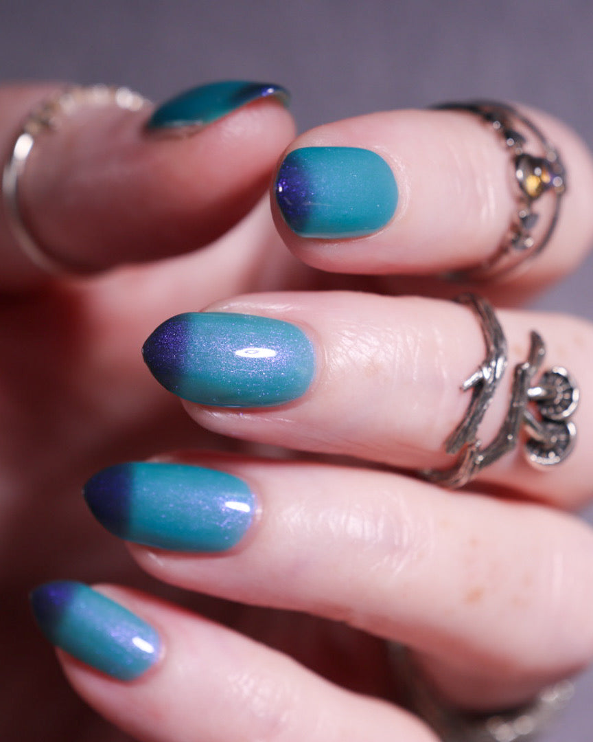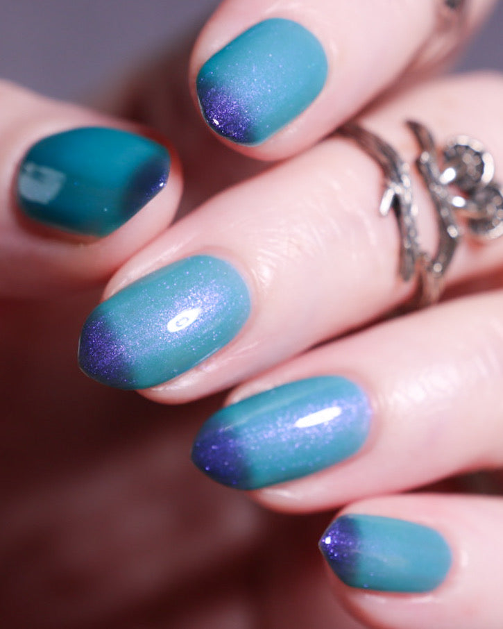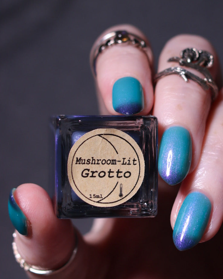 Mushroom-Lit Grotto is a sibling polish to Mushroom-Lit Cavern! This polish features a dark purple (cold) to light teal (warm) thermal with purple to blue shimmer.