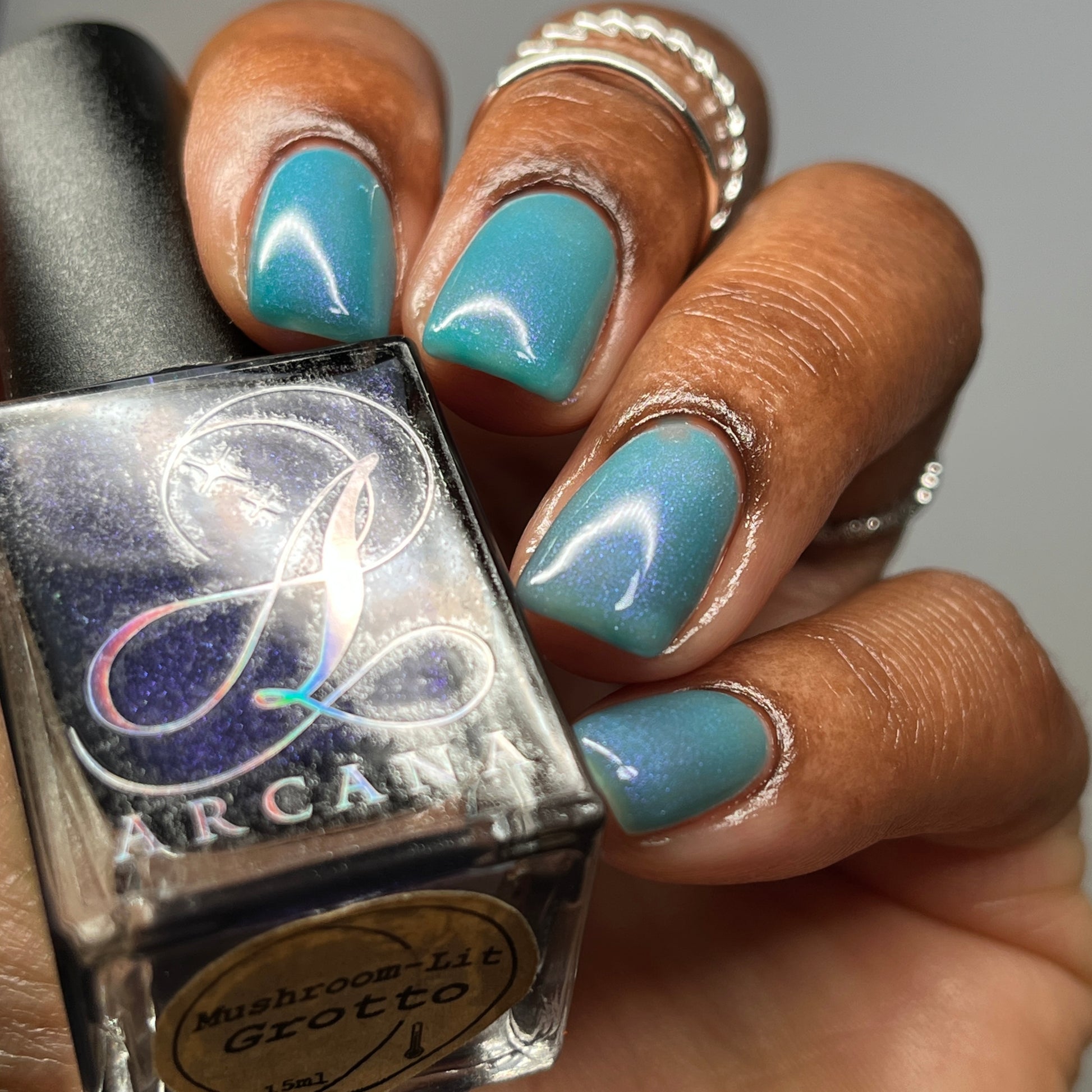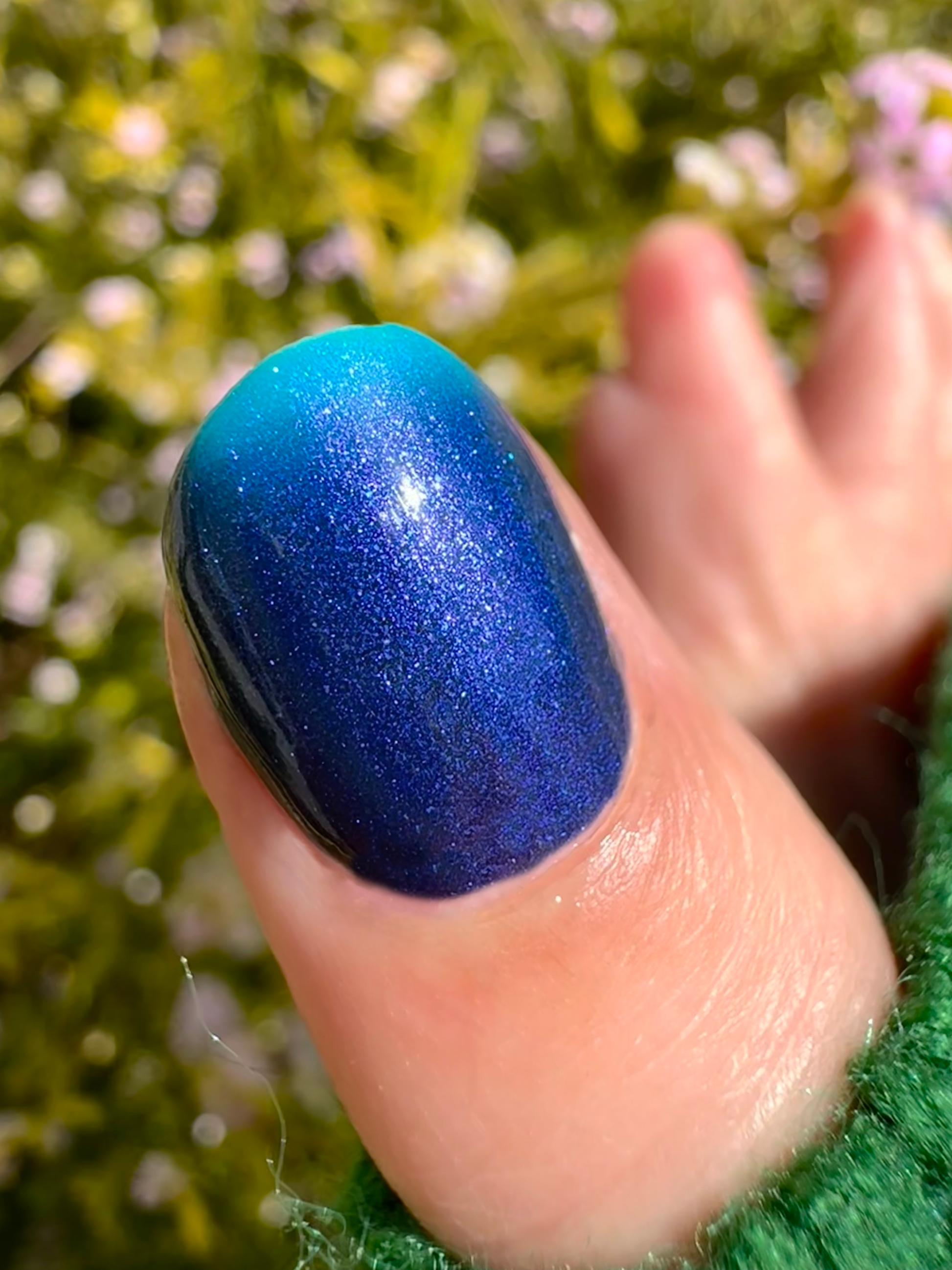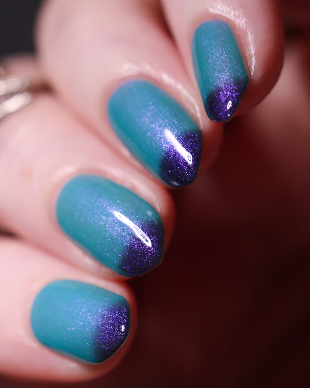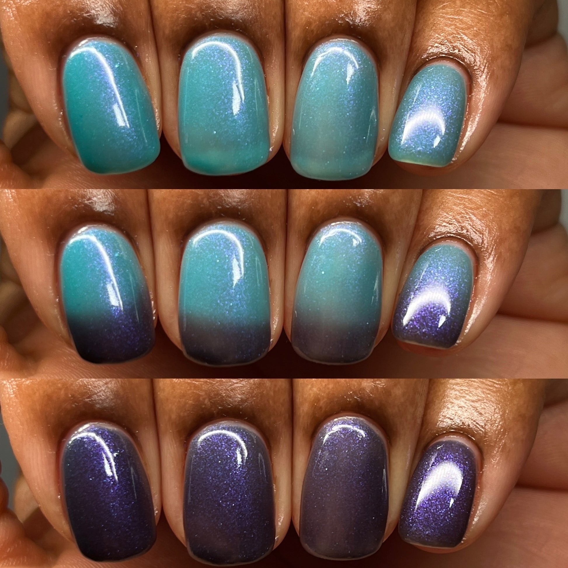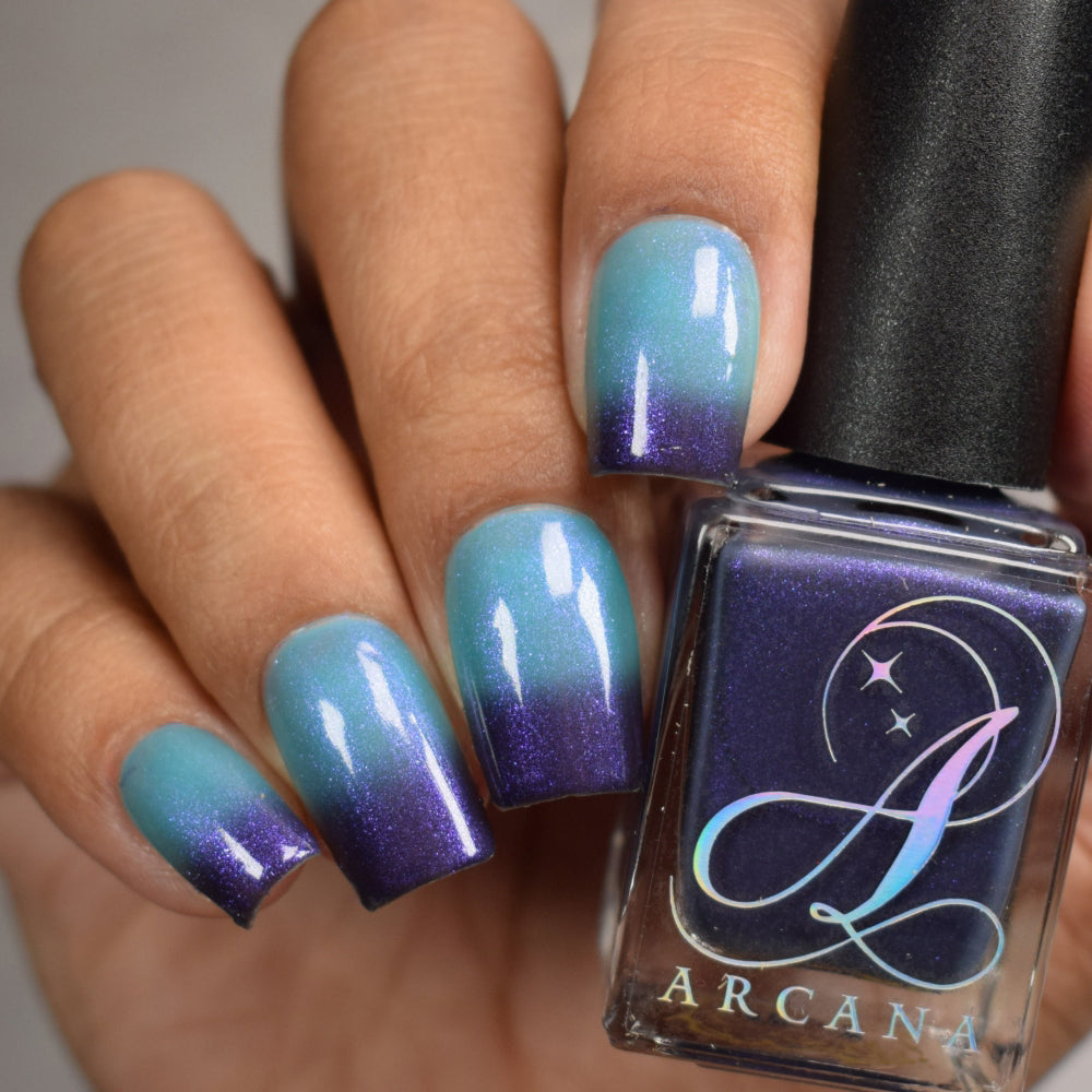 Mushroom-Lit Grotto is a sibling polish to Mushroom-Lit Cavern! This polish features a dark purple (cold) to light teal (warm) thermal with purple to blue shimmer.