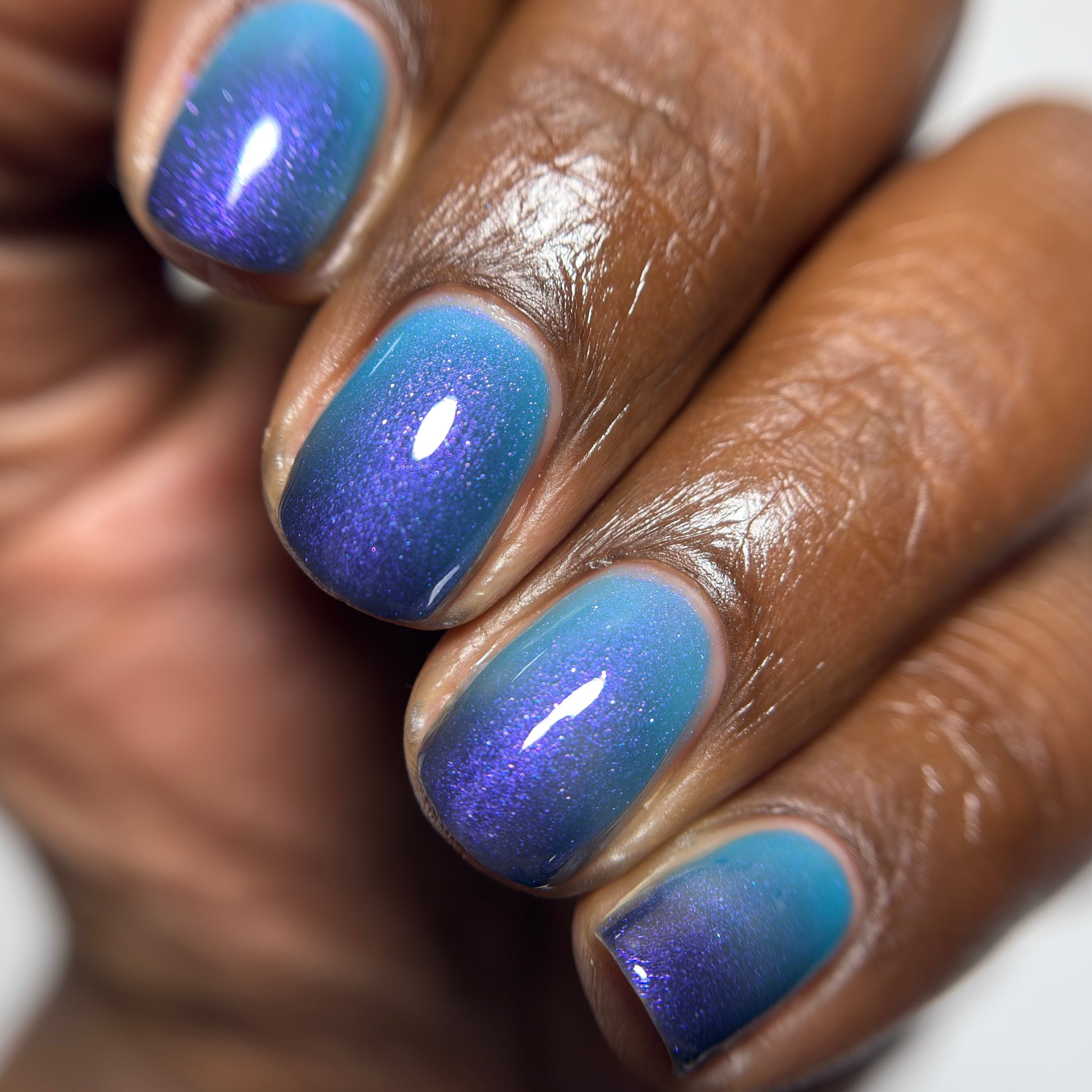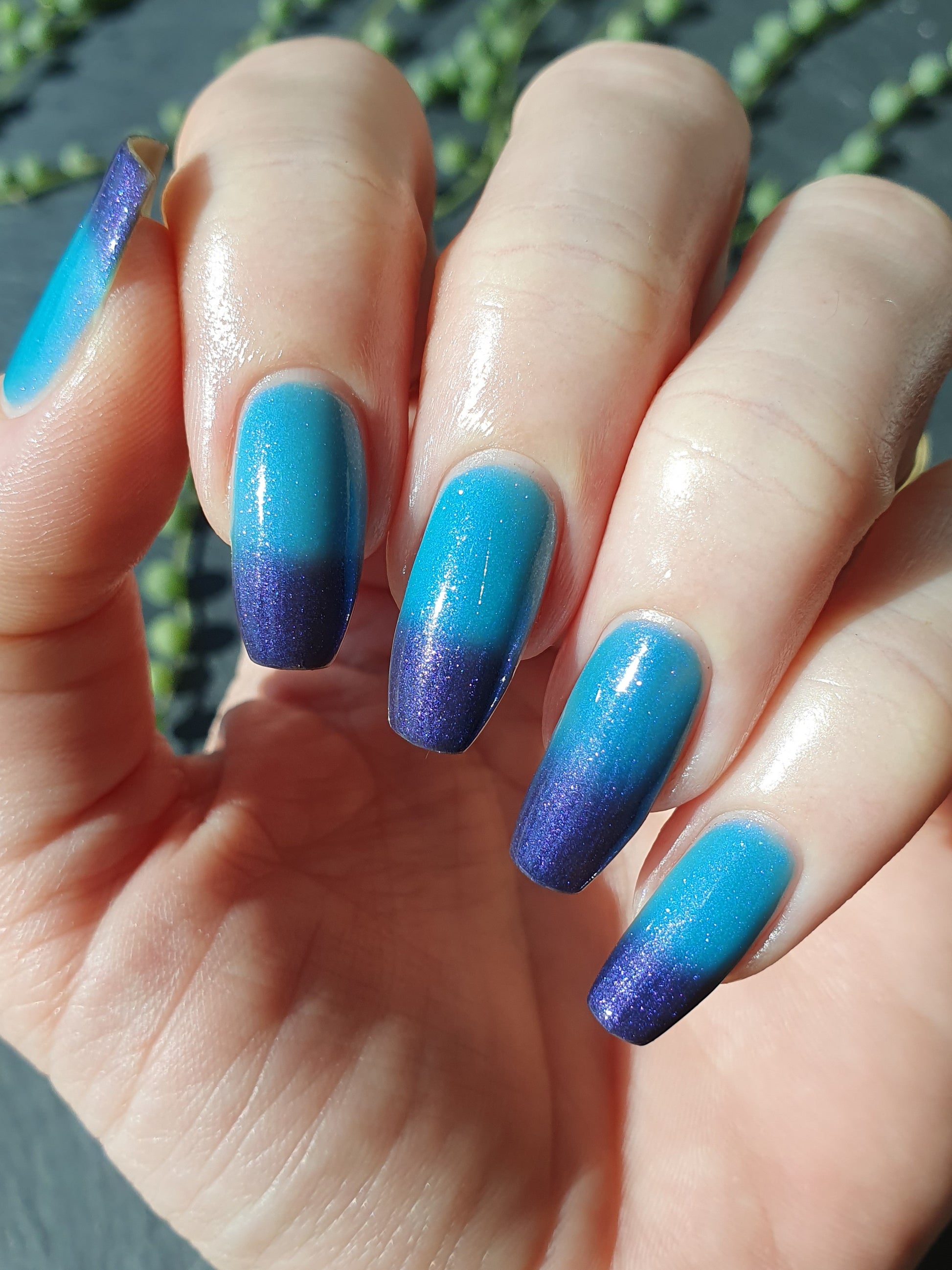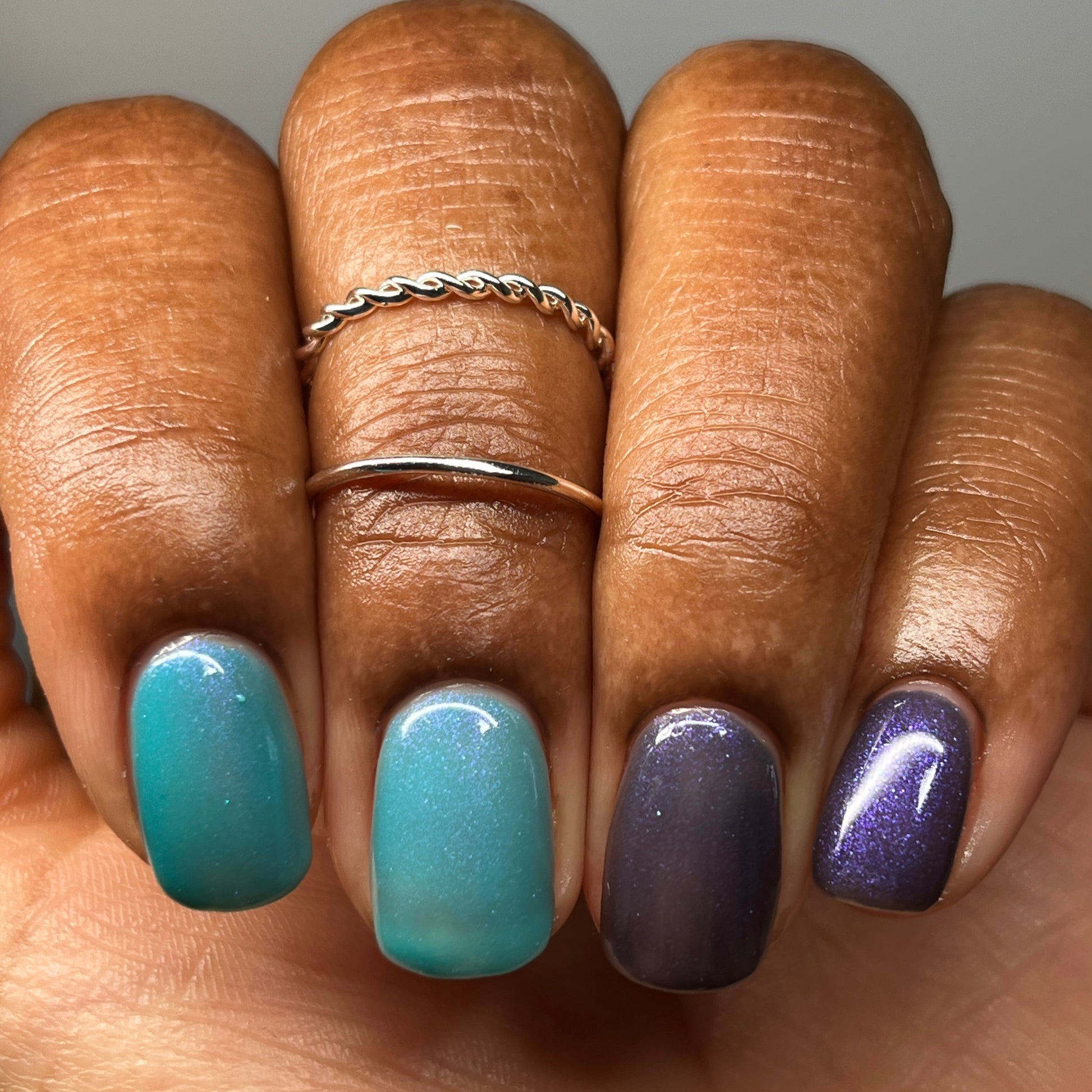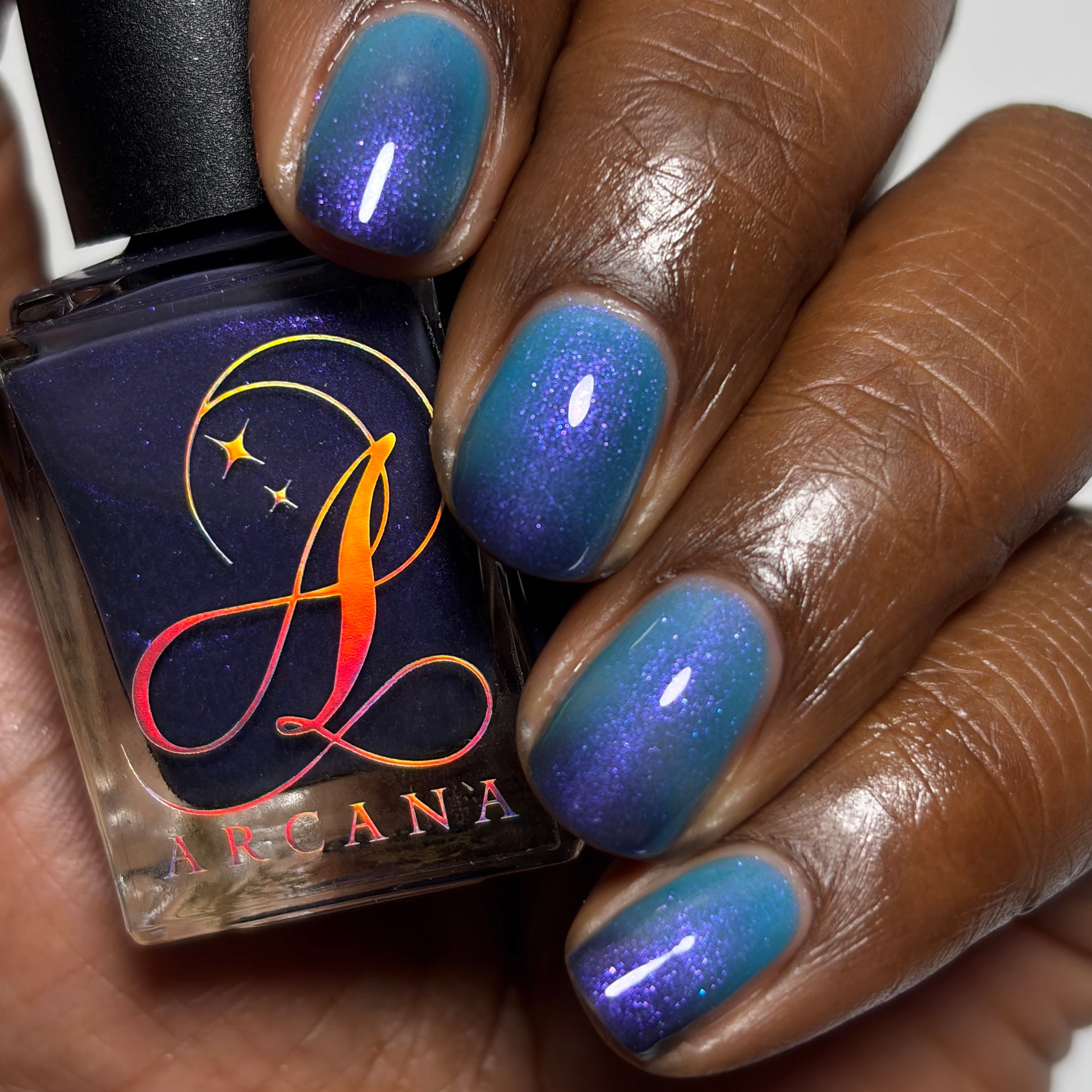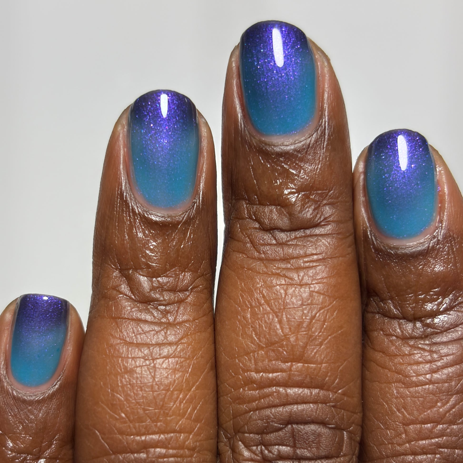 Mushroom-Lit Grotto is a sibling polish to Mushroom-Lit Cavern! This polish features a dark purple (cold) to light teal (warm) thermal with purple to blue shimmer.
