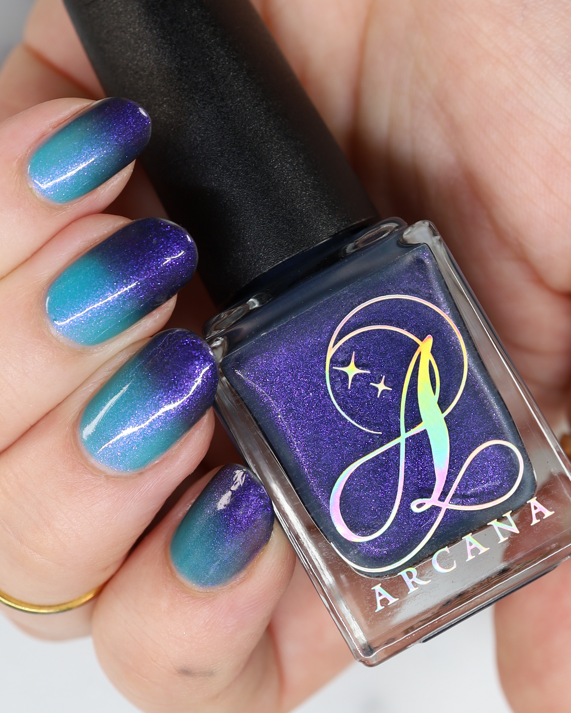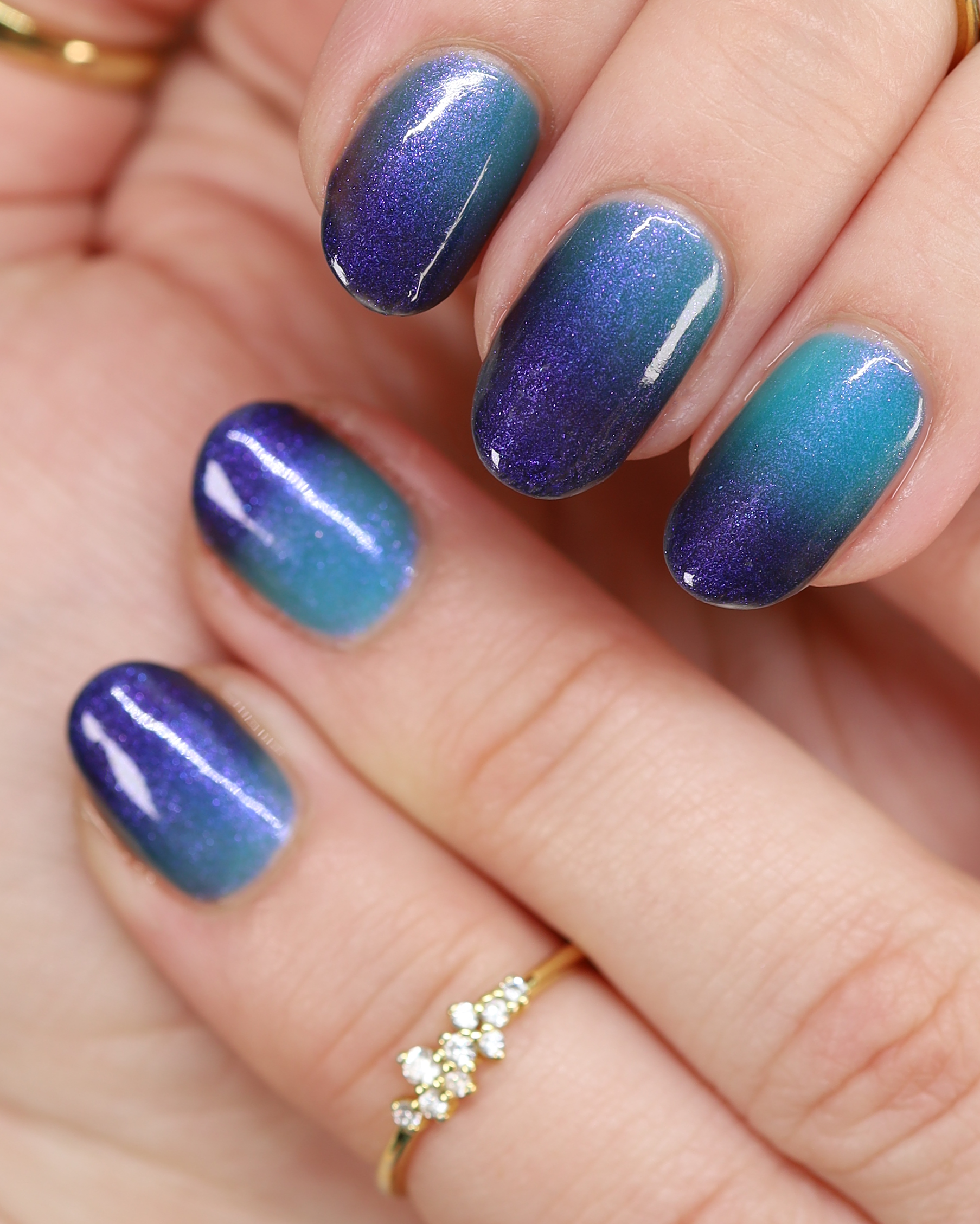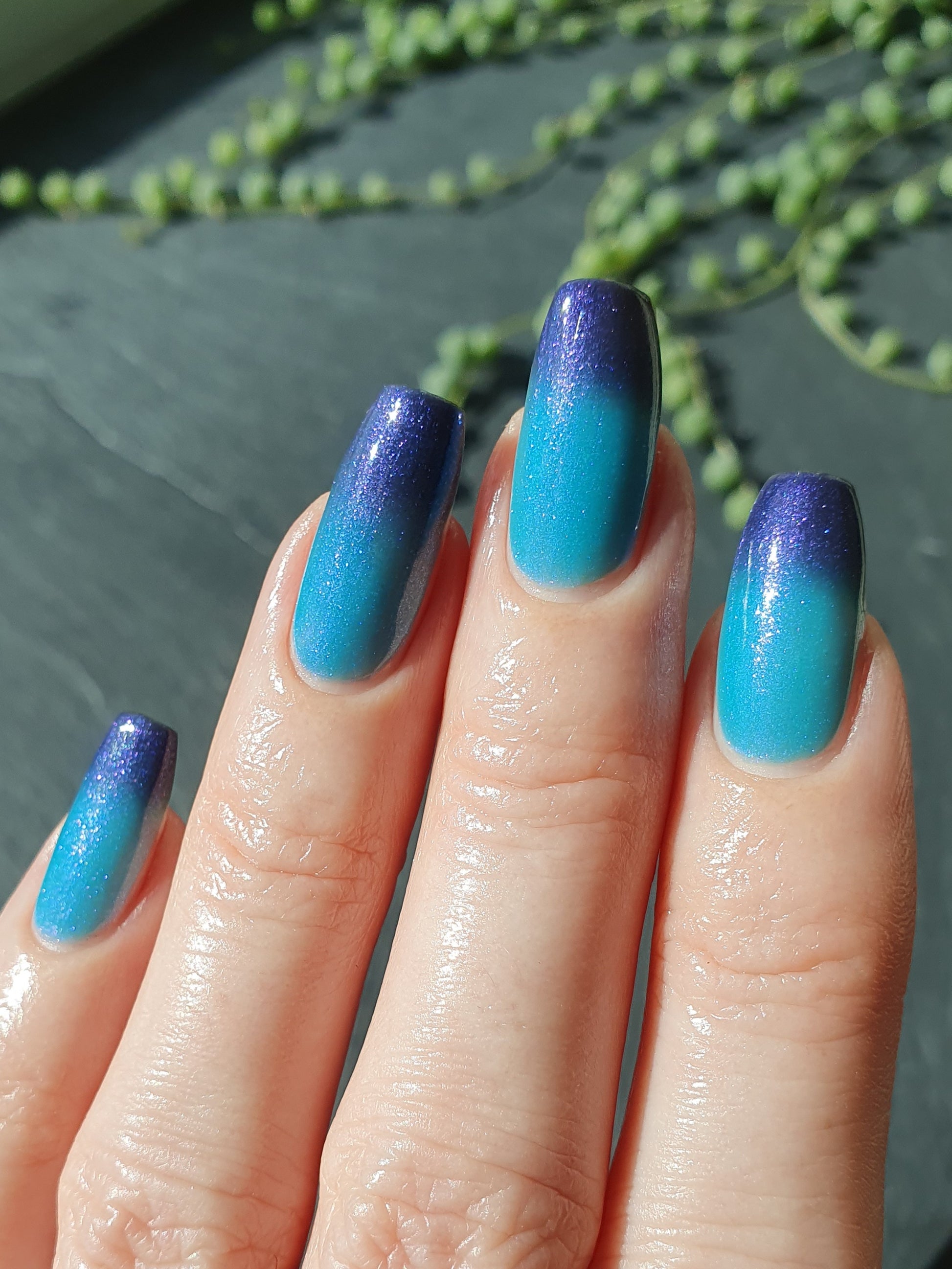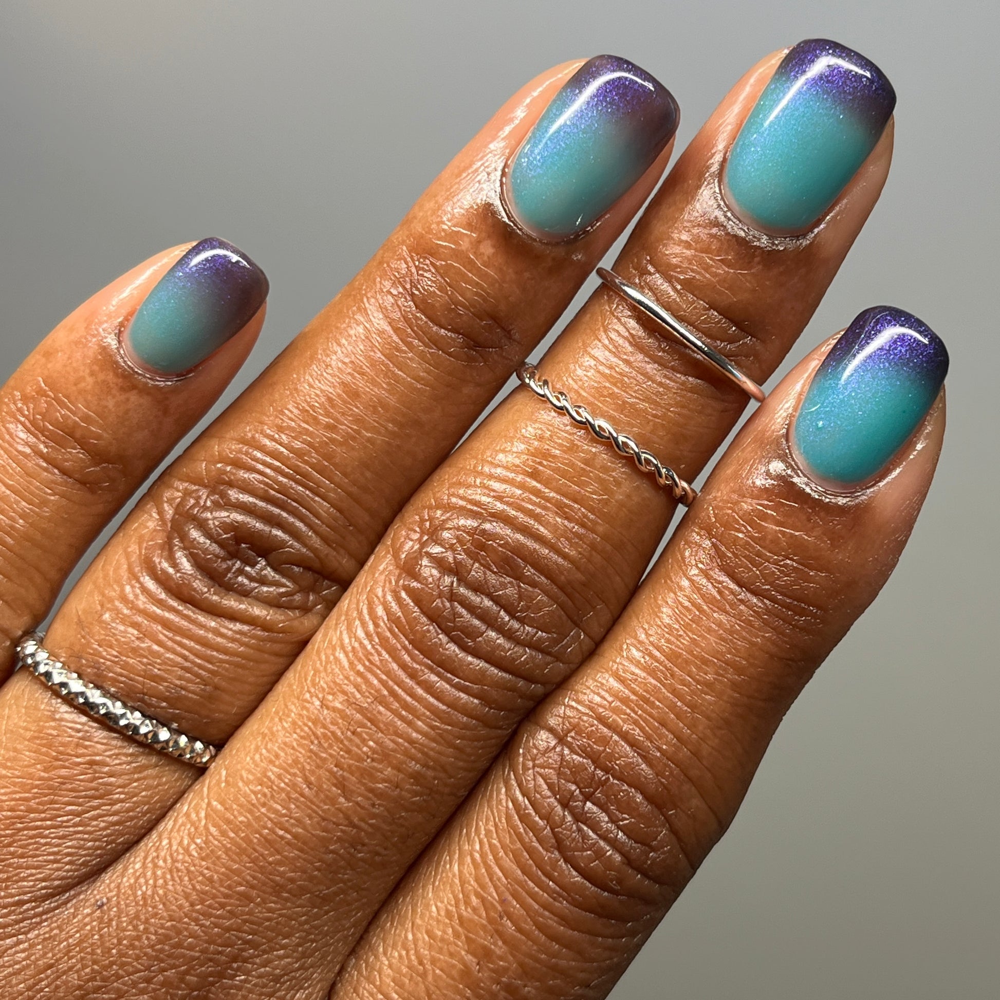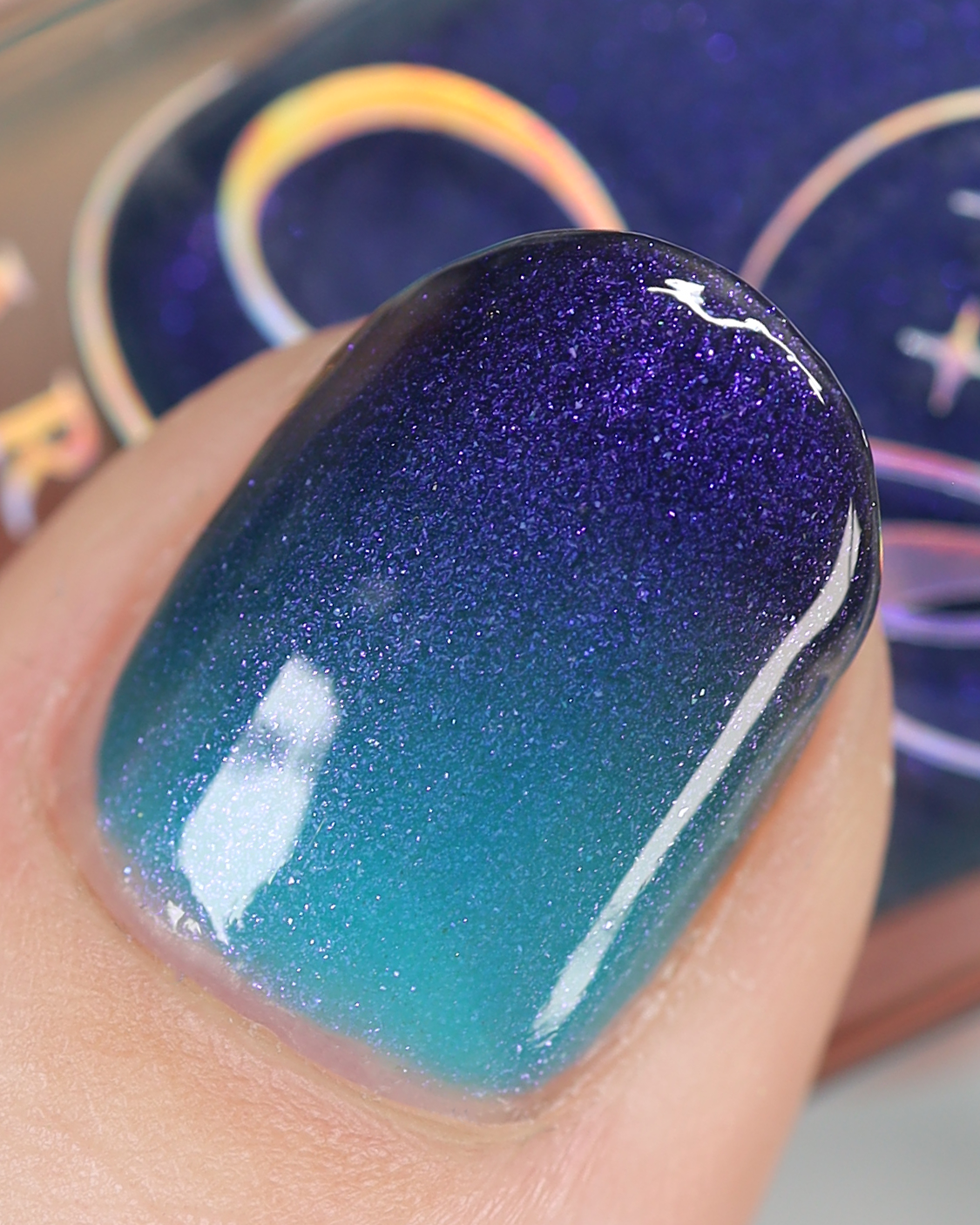 Mushroom-Lit Grotto is a sibling polish to Mushroom-Lit Cavern! This polish features a dark purple (cold) to light teal (warm) thermal with purple to blue shimmer.