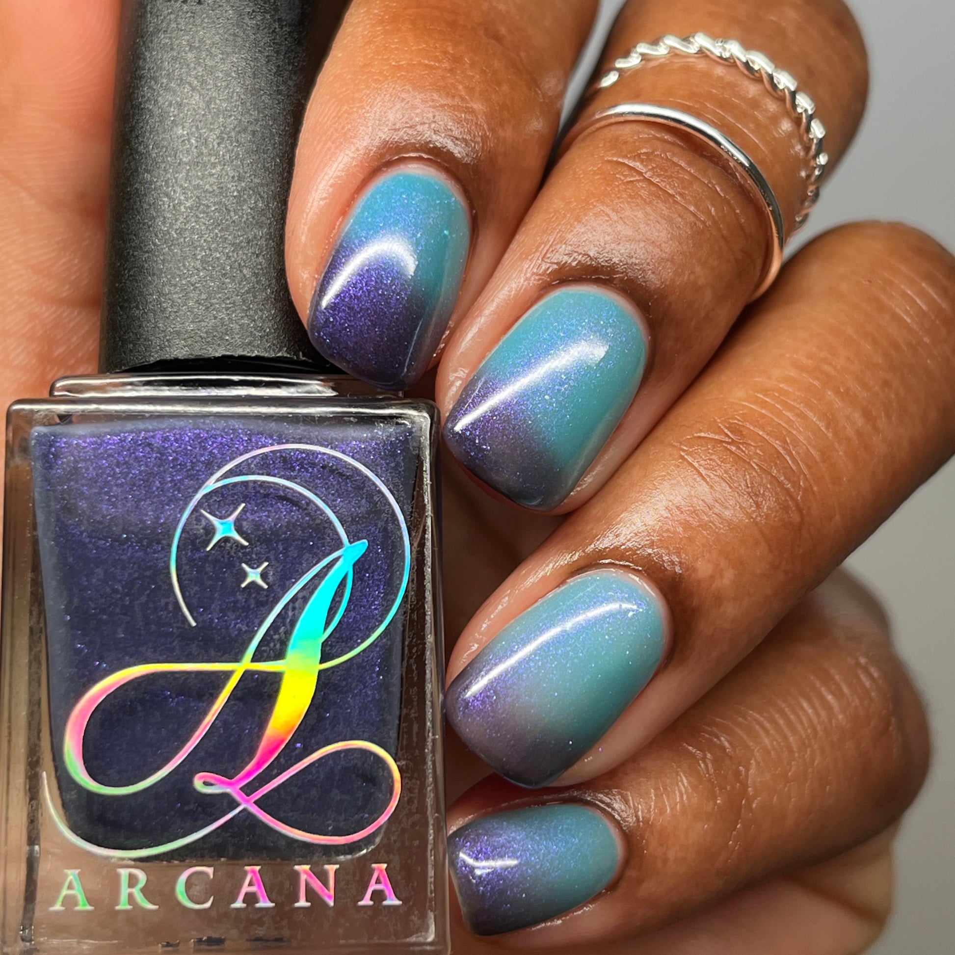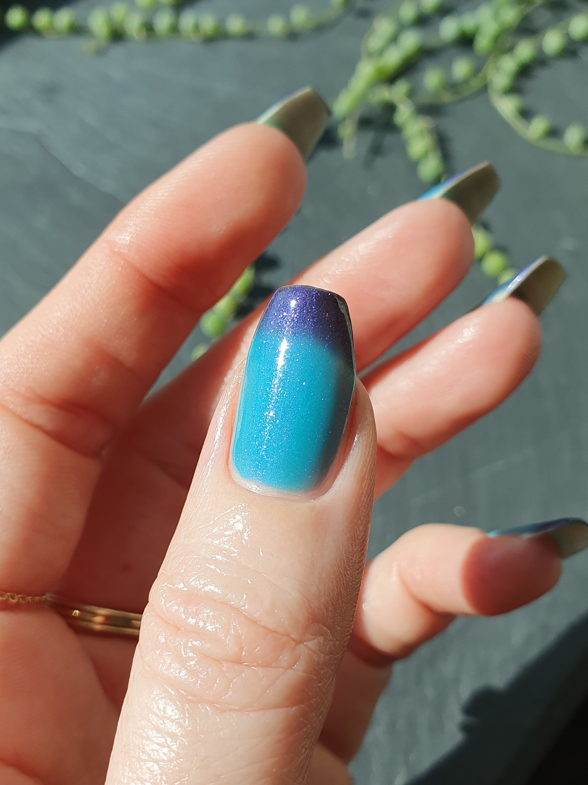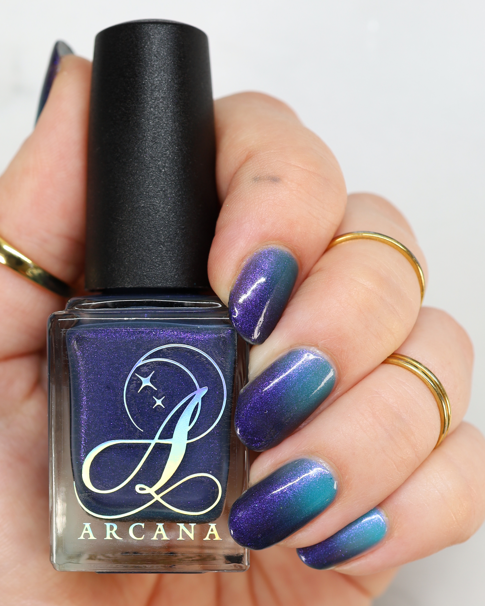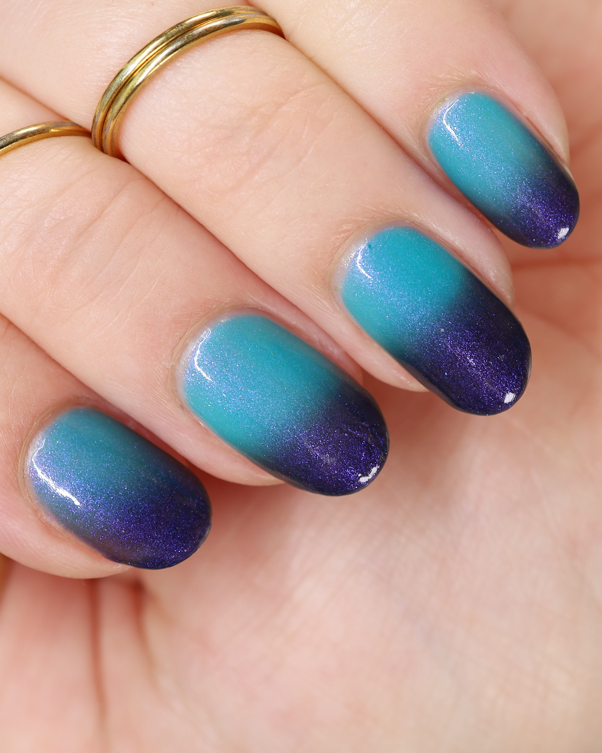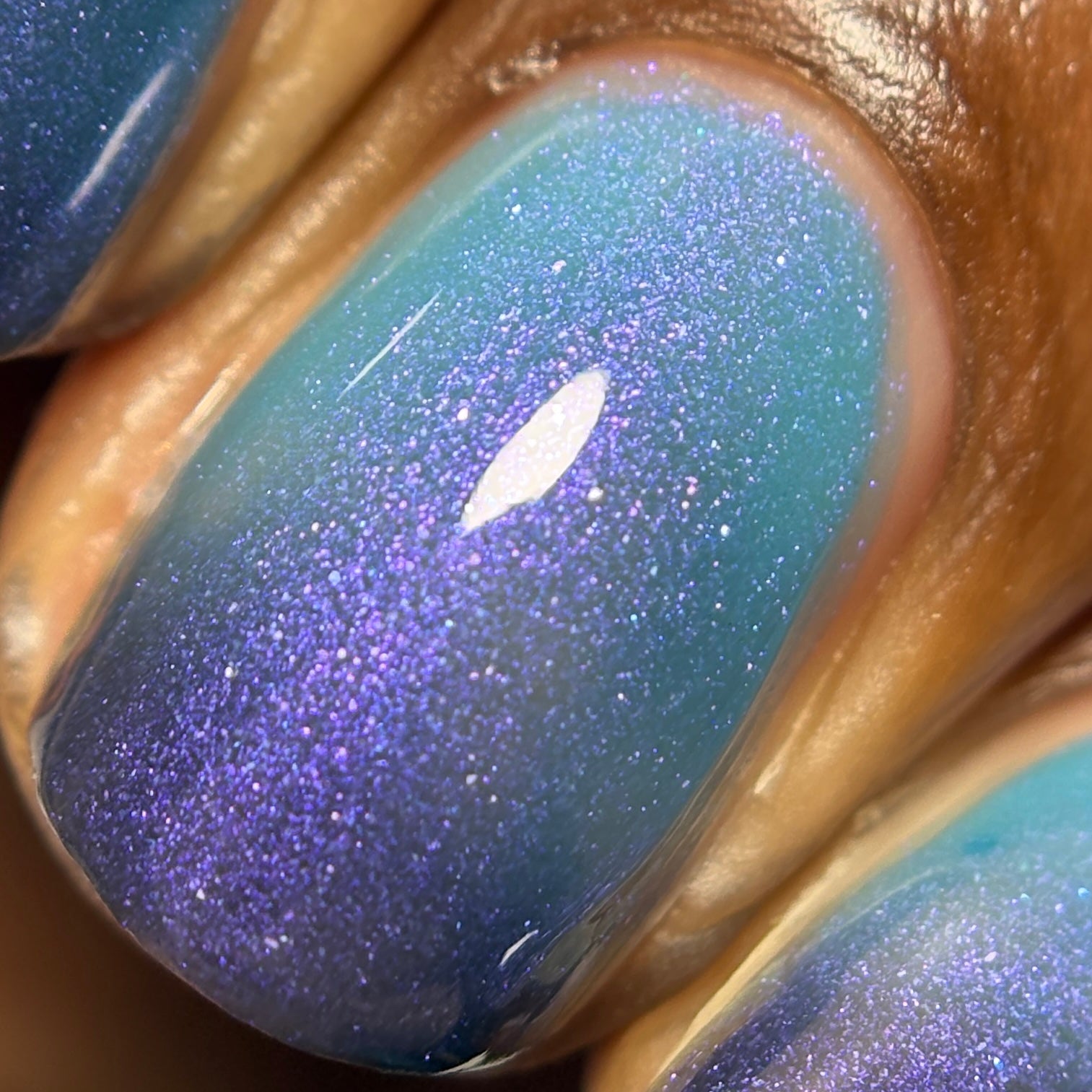 Mushroom-Lit Grotto is a sibling polish to Mushroom-Lit Cavern! This polish features a dark purple (cold) to light teal (warm) thermal with purple to blue shimmer.