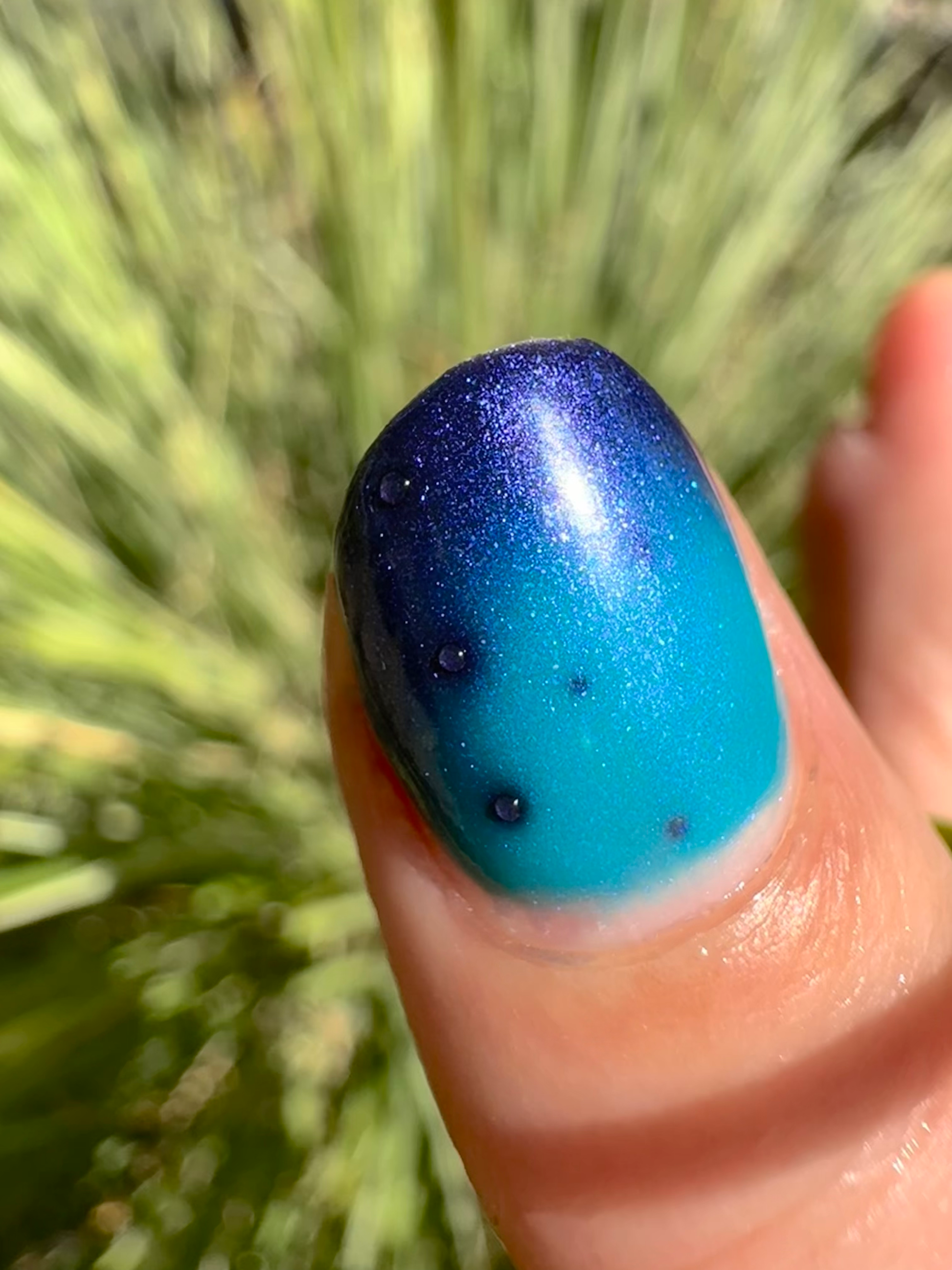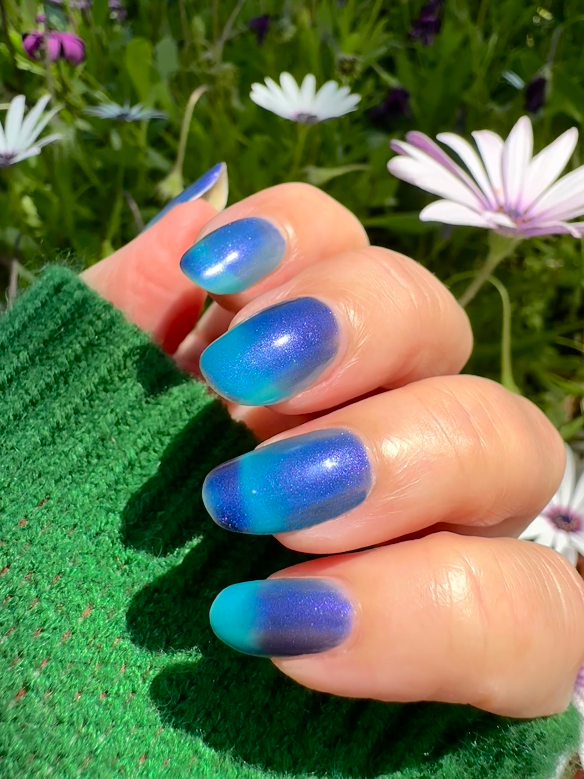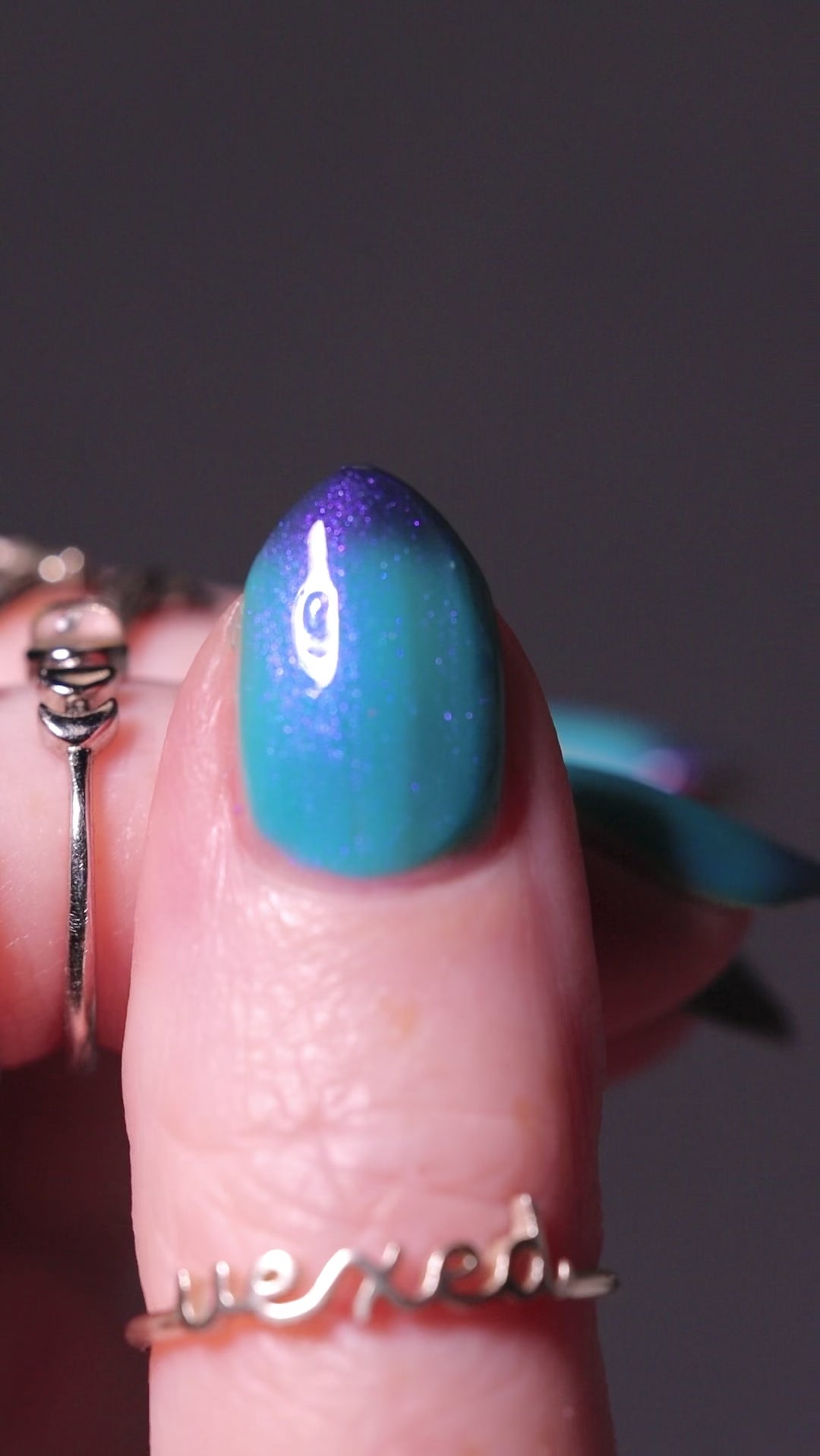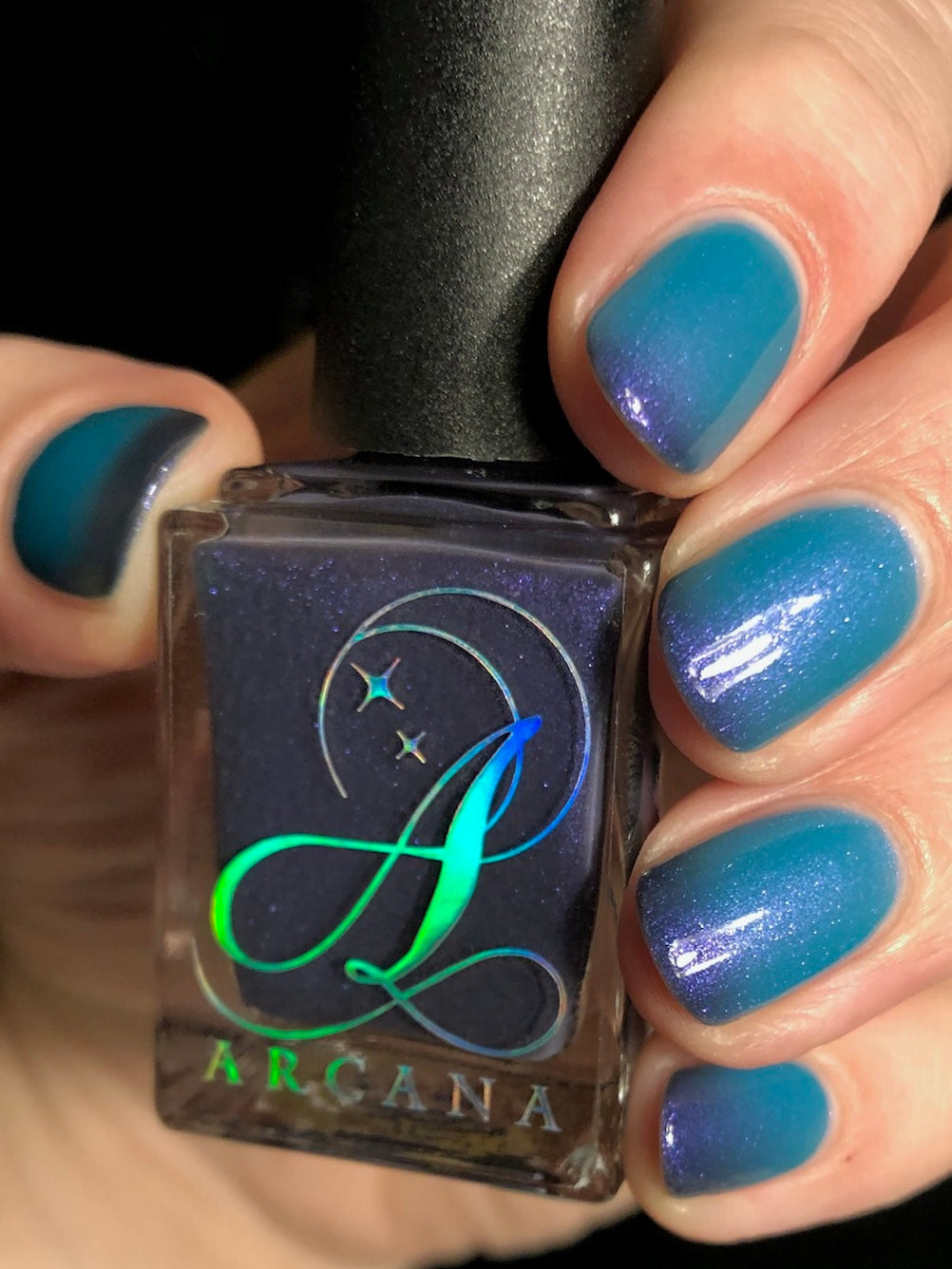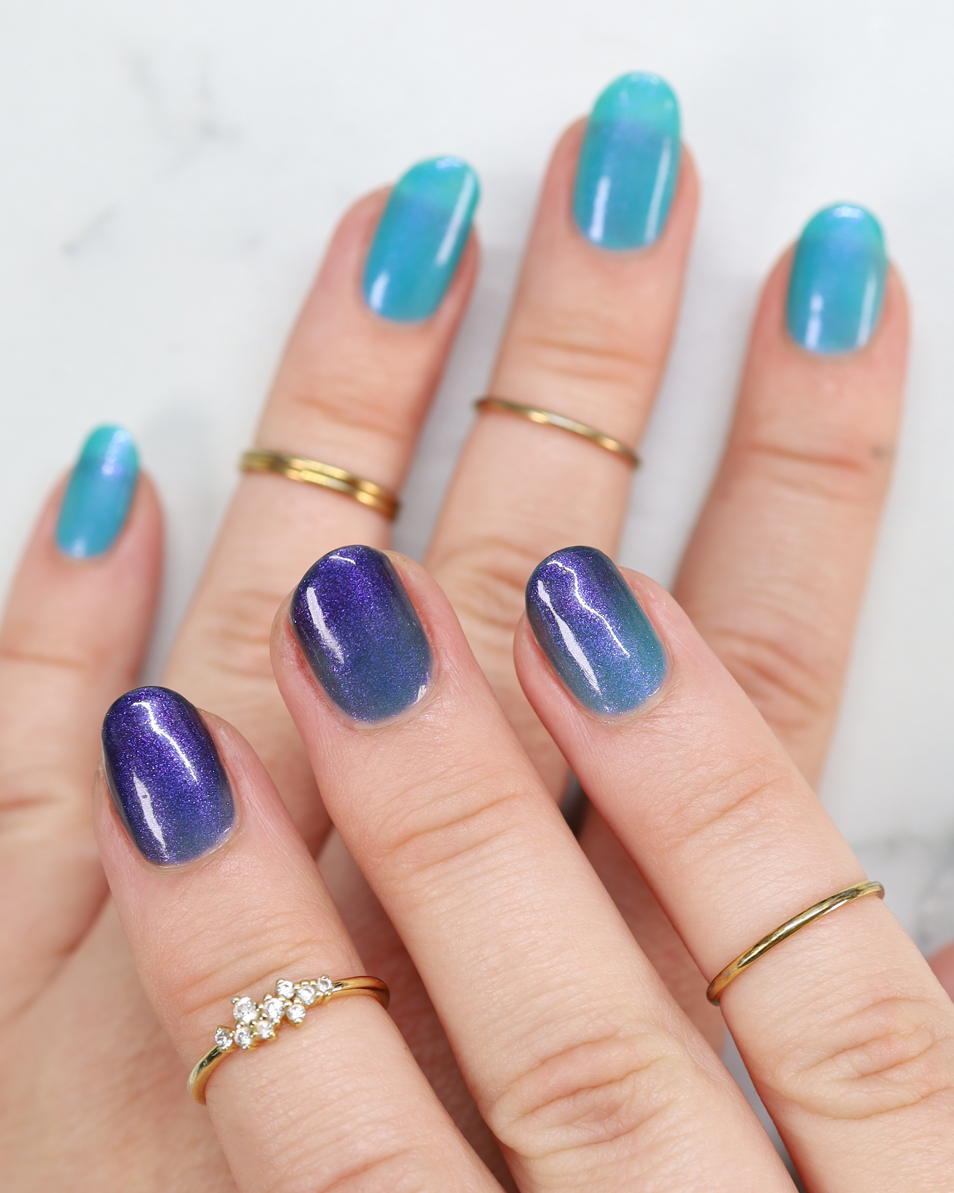 Mushroom-Lit Grotto is a sibling polish to Mushroom-Lit Cavern! This polish features a dark purple (cold) to light teal (warm) thermal with purple to blue shimmer.