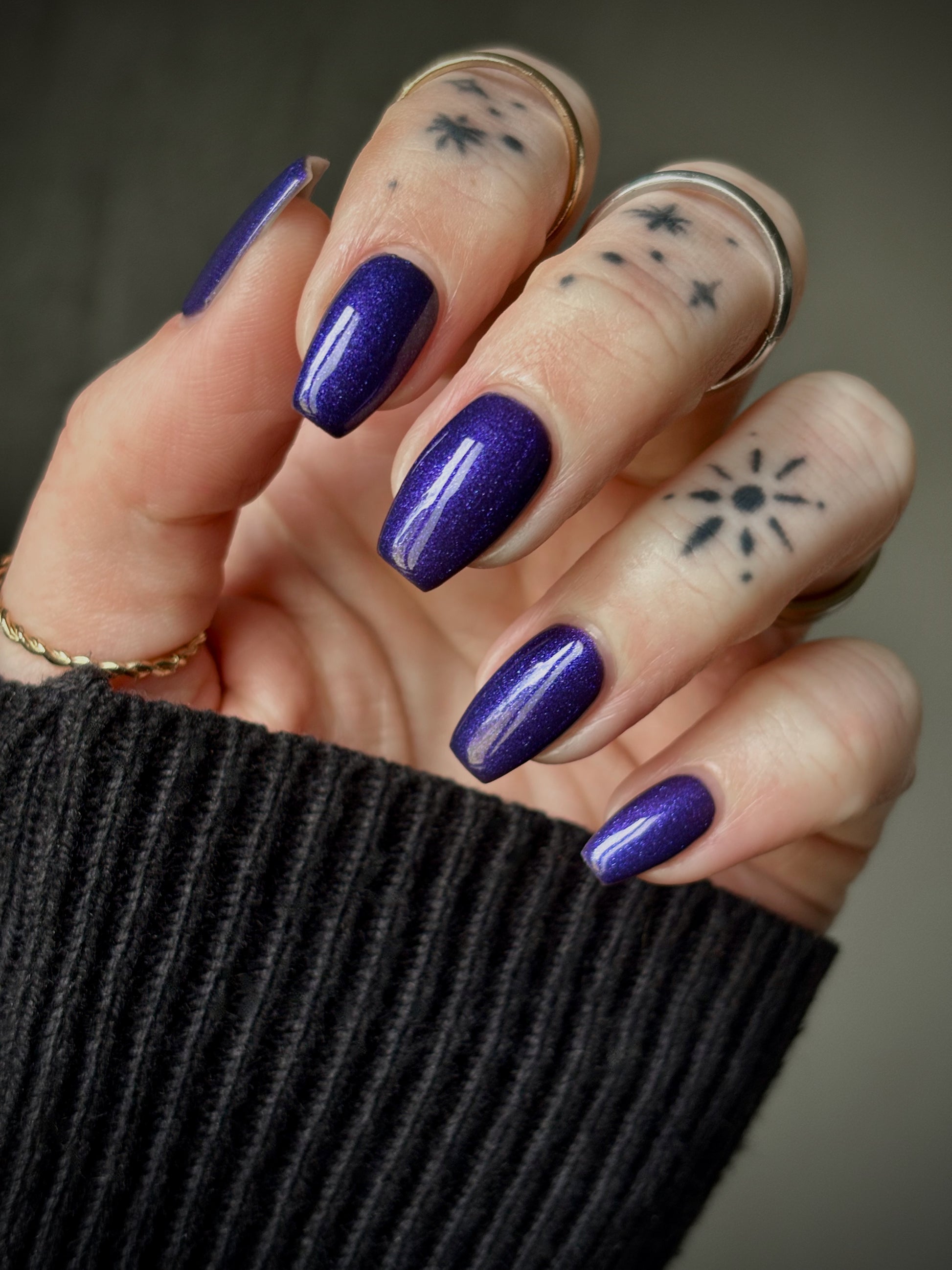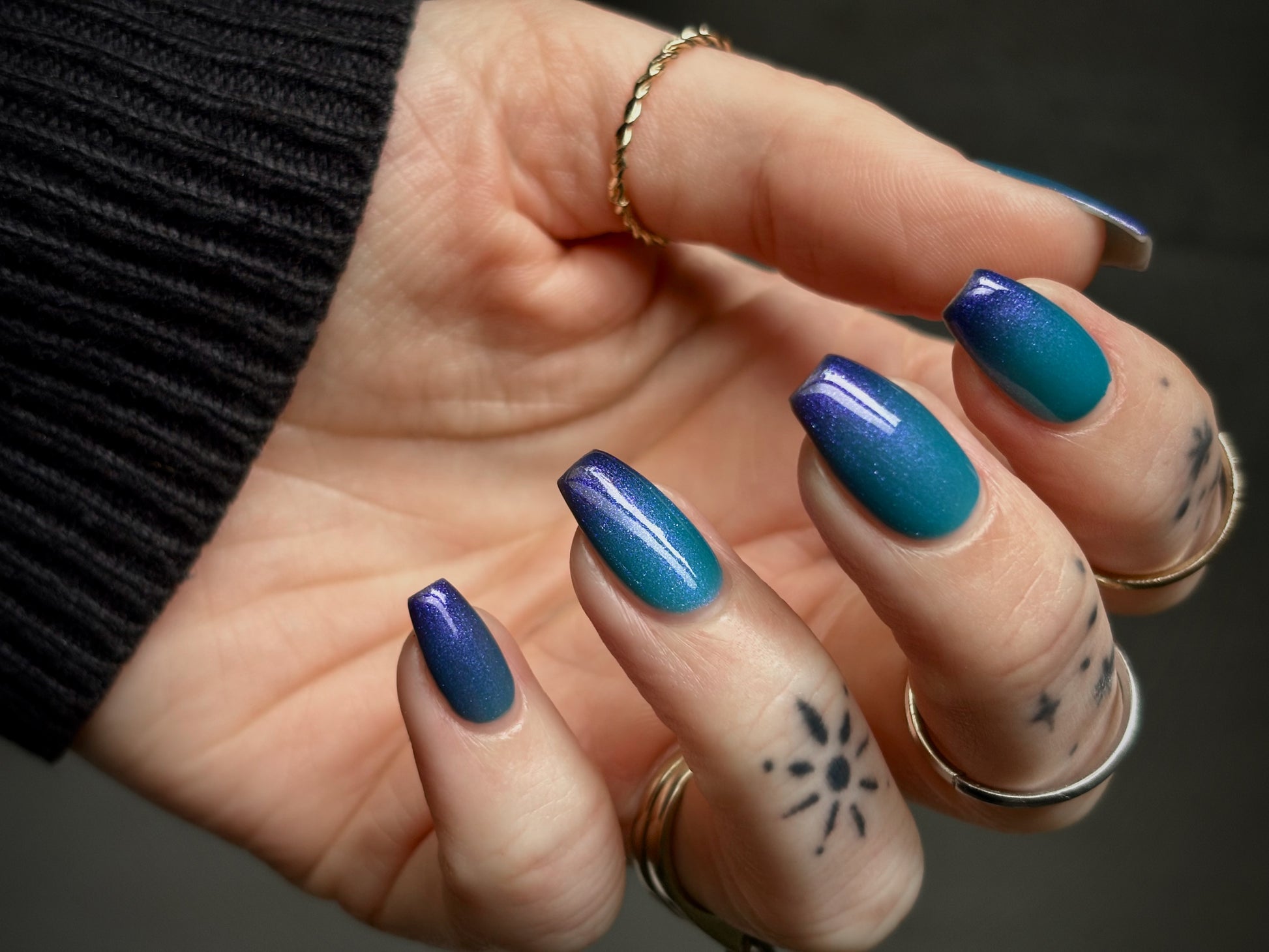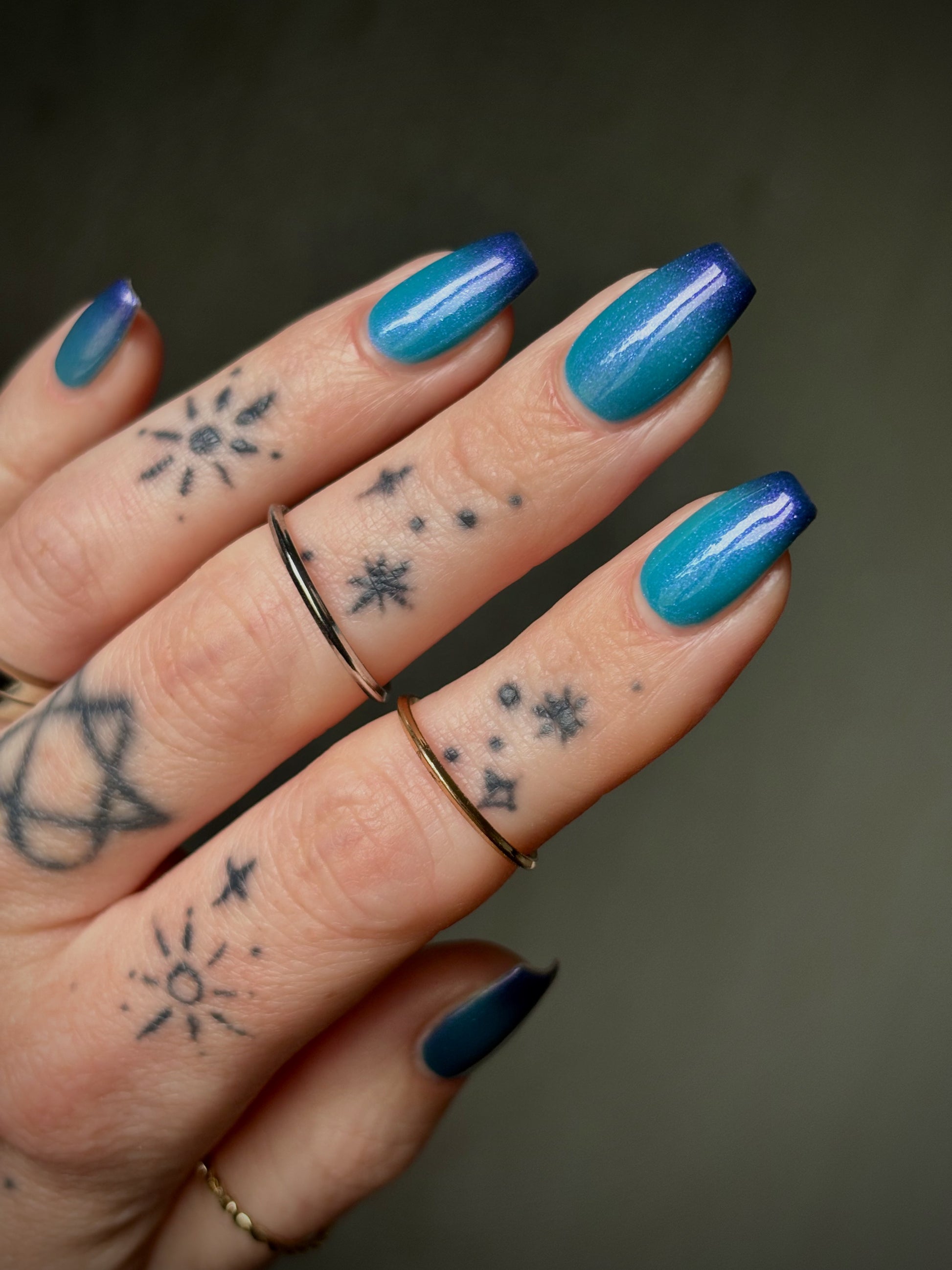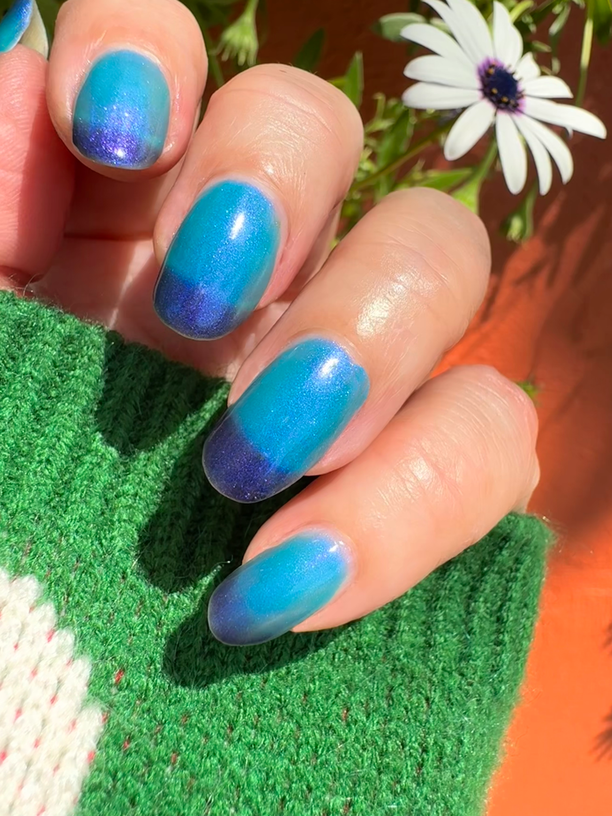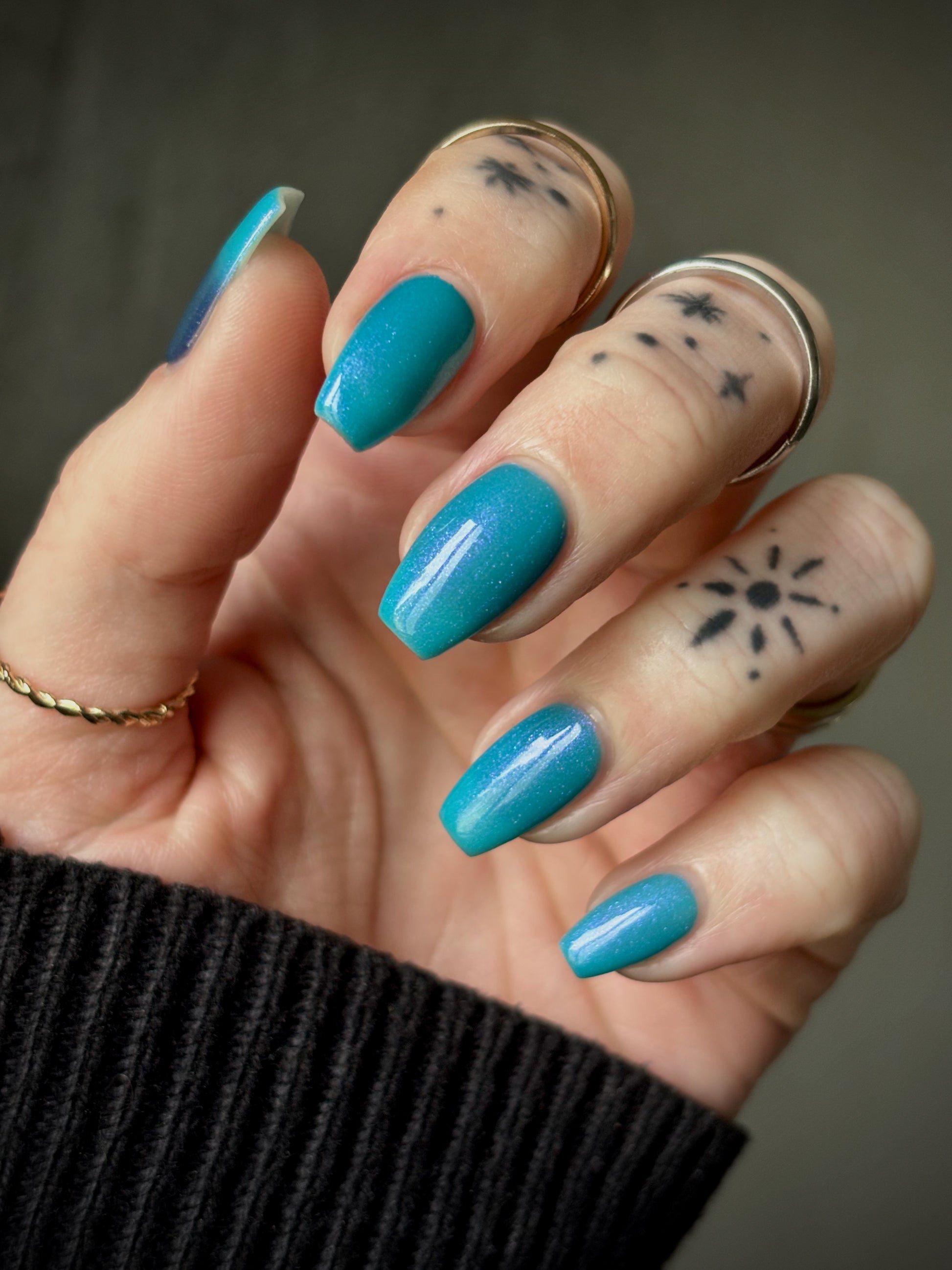Mushroom-Lit Grotto is a sibling polish to Mushroom-Lit Cavern! This polish features a dark purple (cold) to light teal (warm) thermal with purple to blue shimmer.