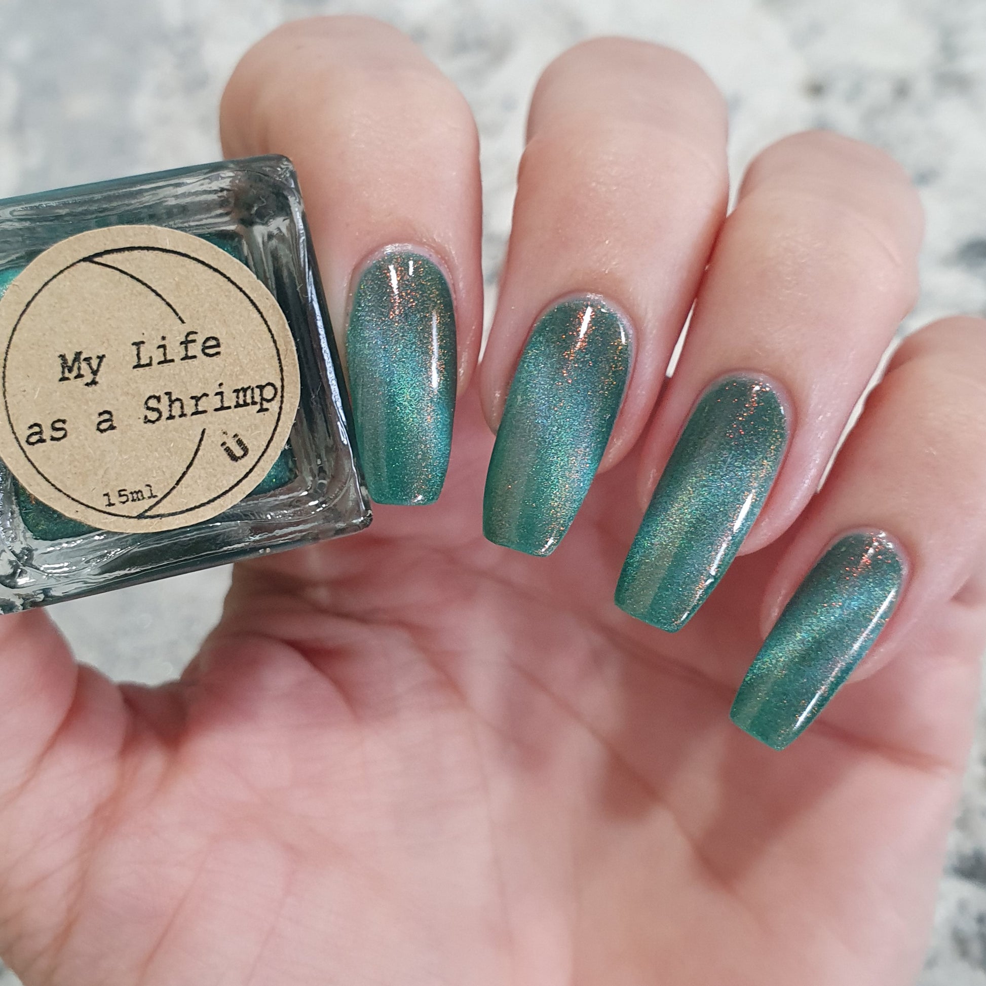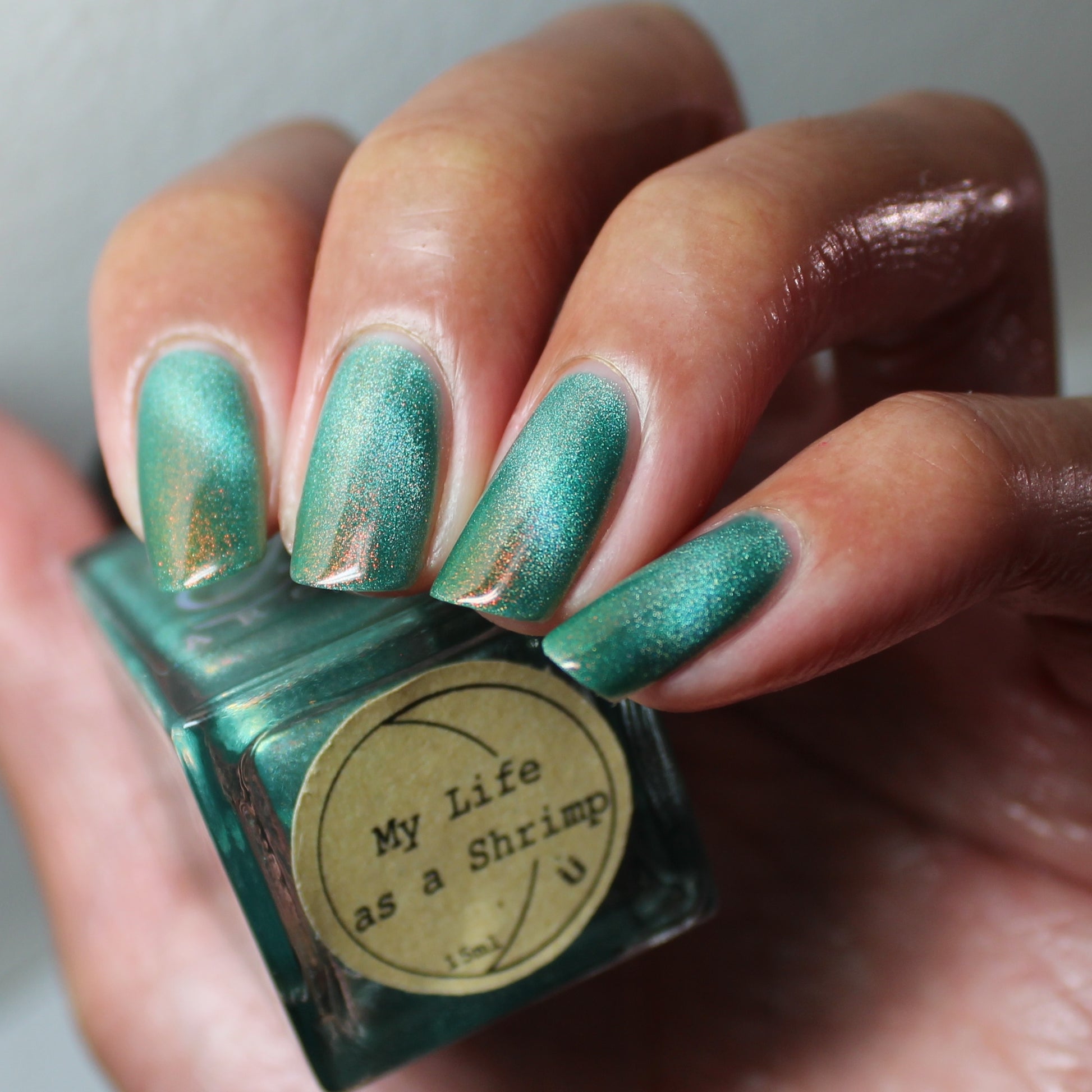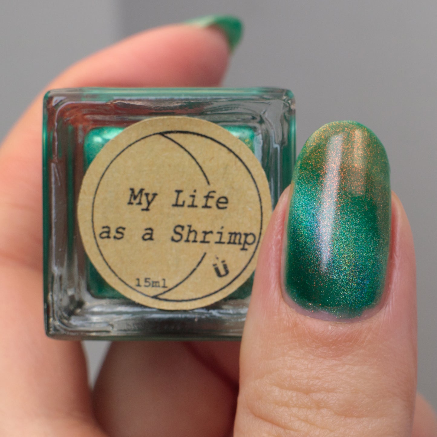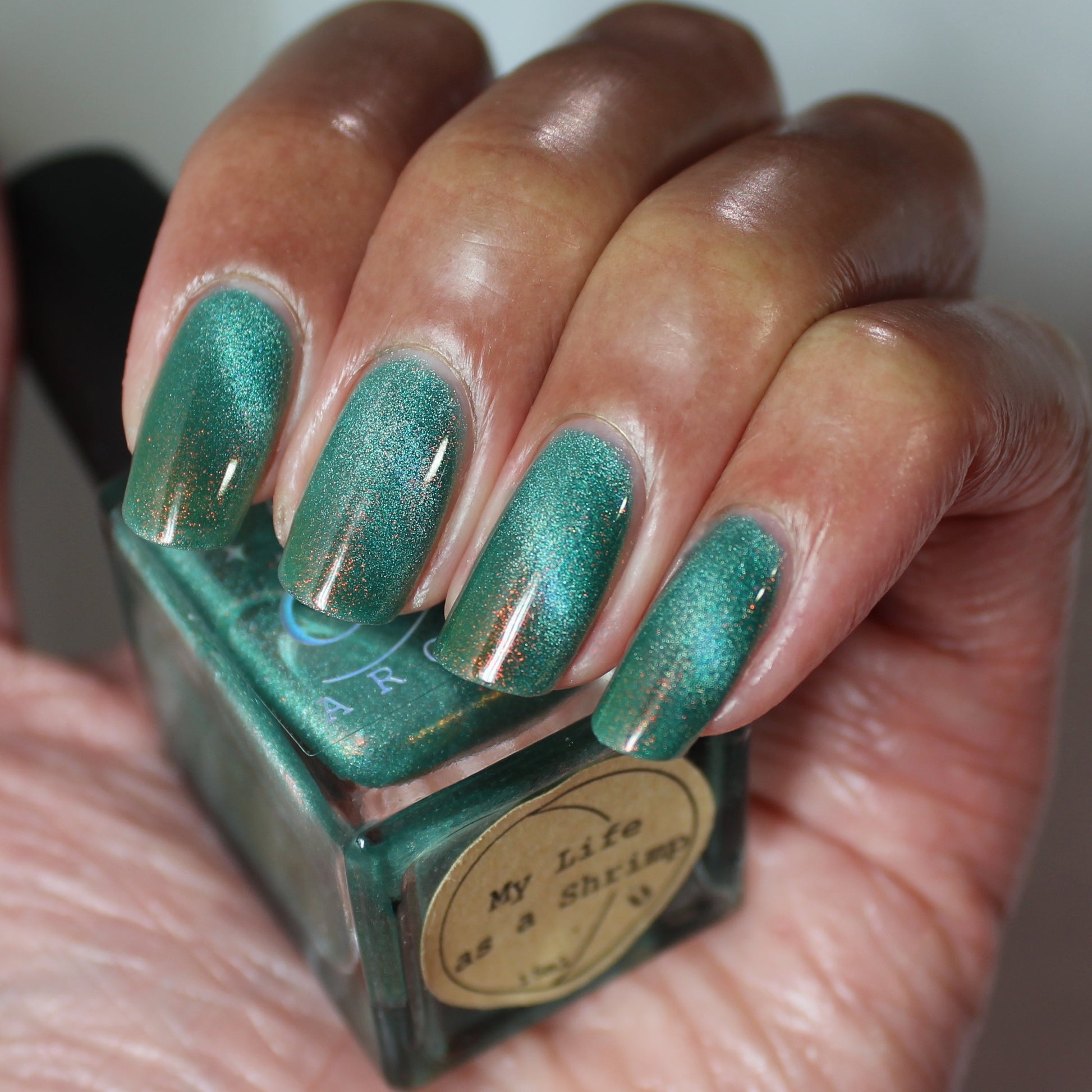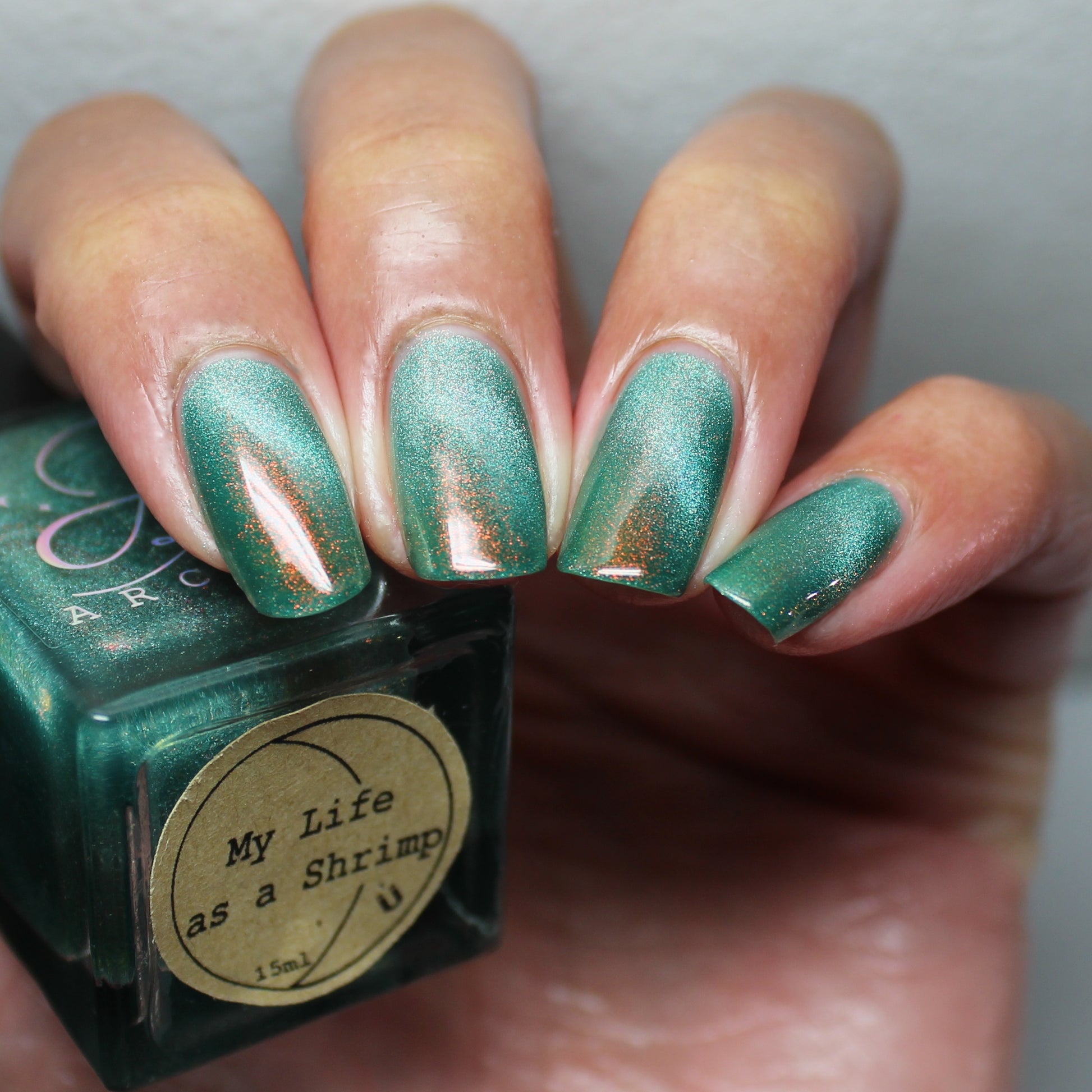 My Life as a Shrimp has a blue-green jelly base and red-orange aurora along with magnetic holo pigment! The magnetic holo in this is mesmerizing. It holds very well with little diffusion in our experience!
