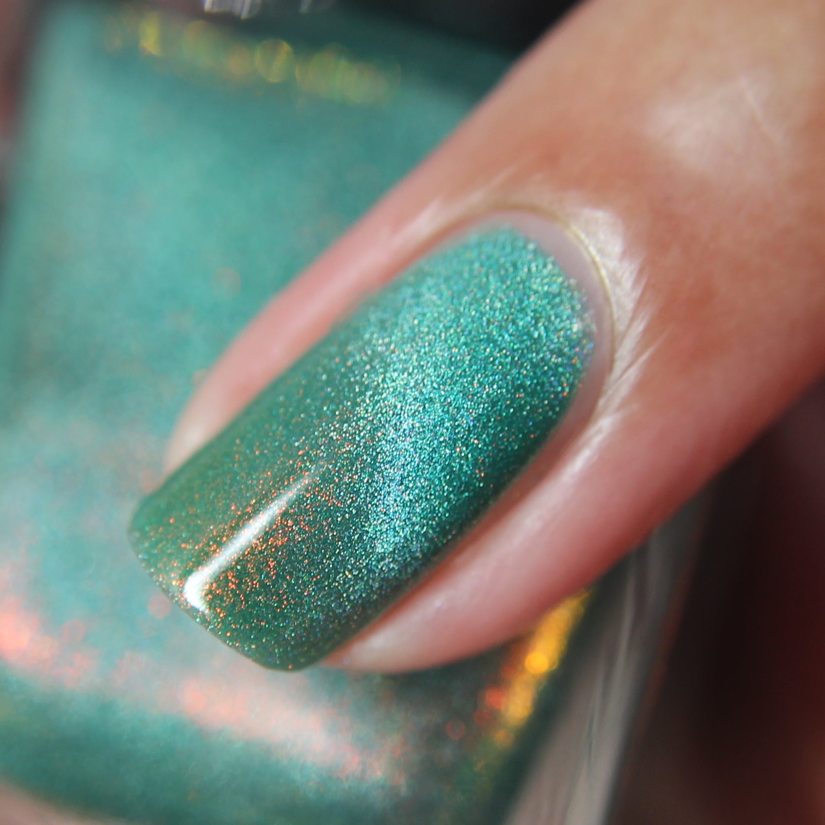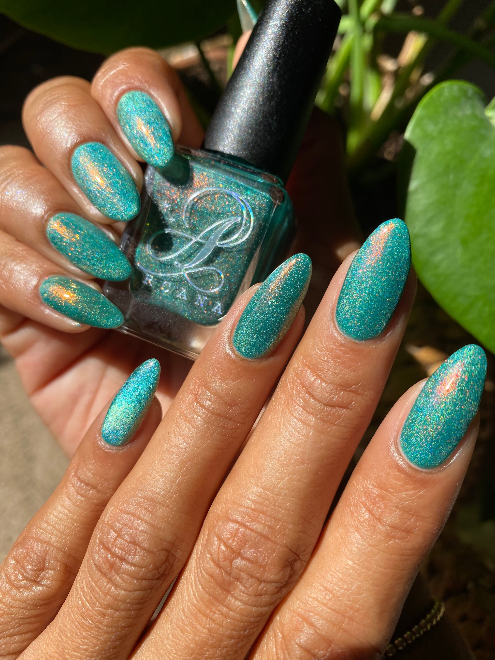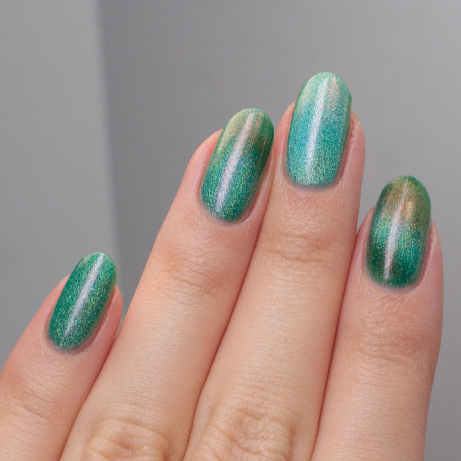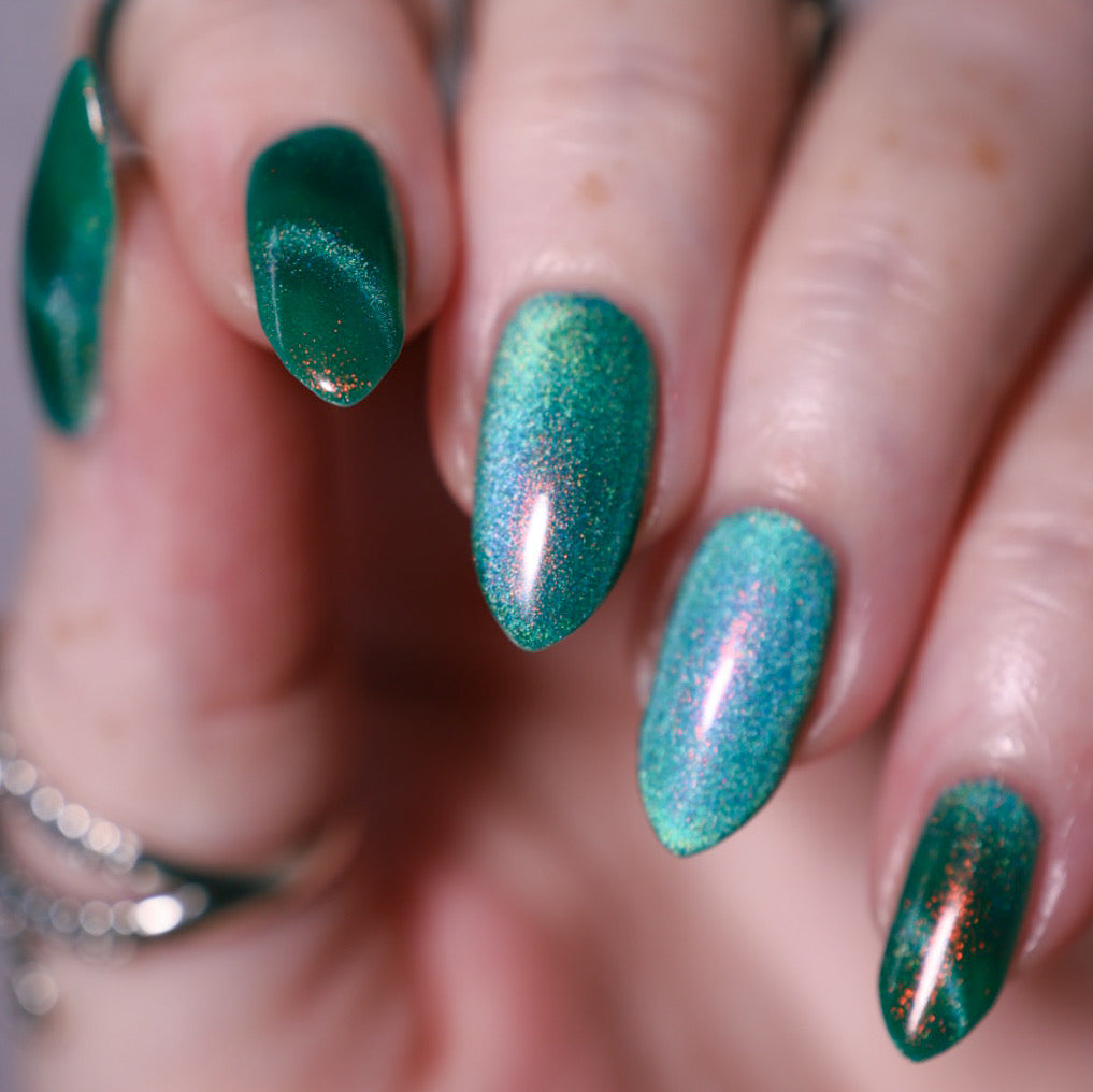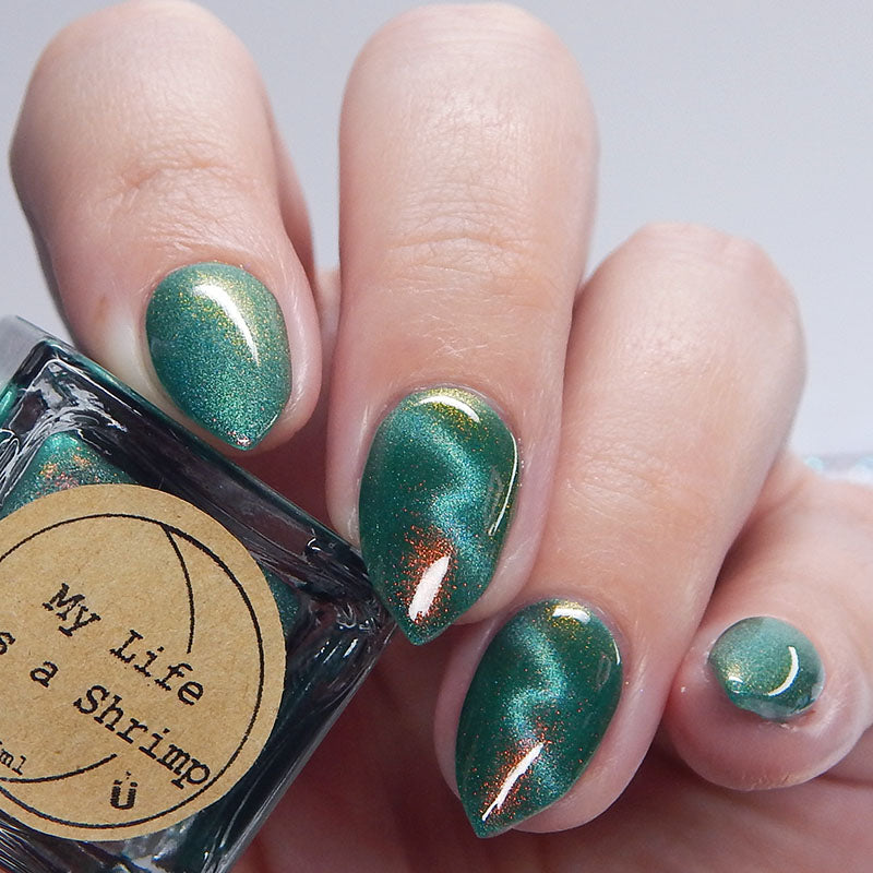 My Life as a Shrimp has a blue-green jelly base and red-orange aurora along with magnetic holo pigment! The magnetic holo in this is mesmerizing. It holds very well with little diffusion in our experience!