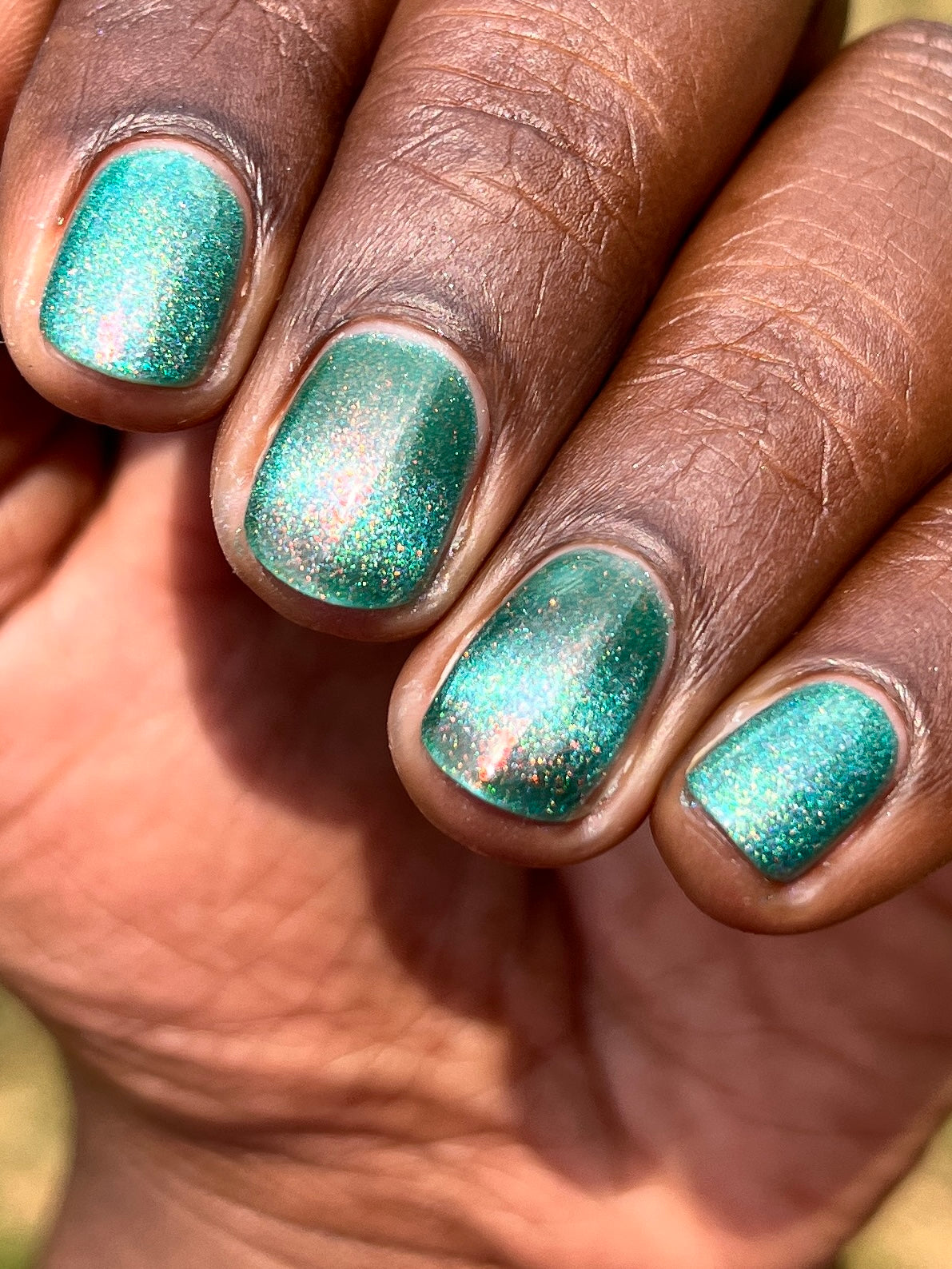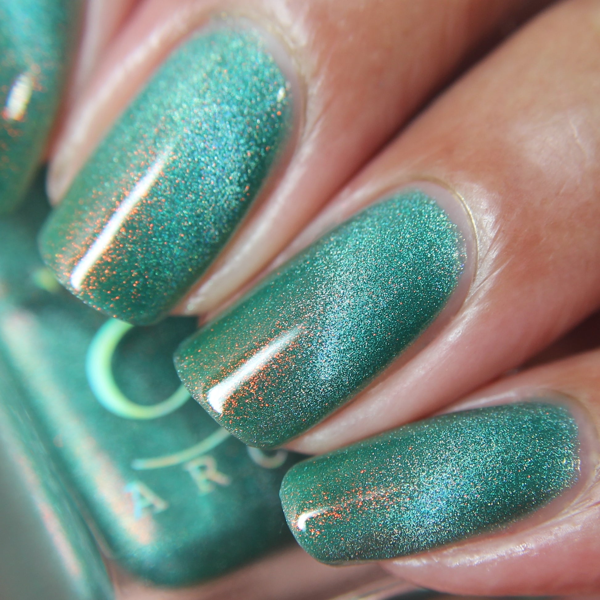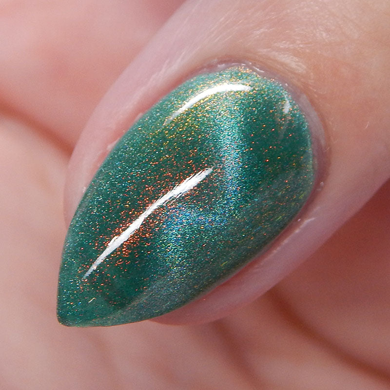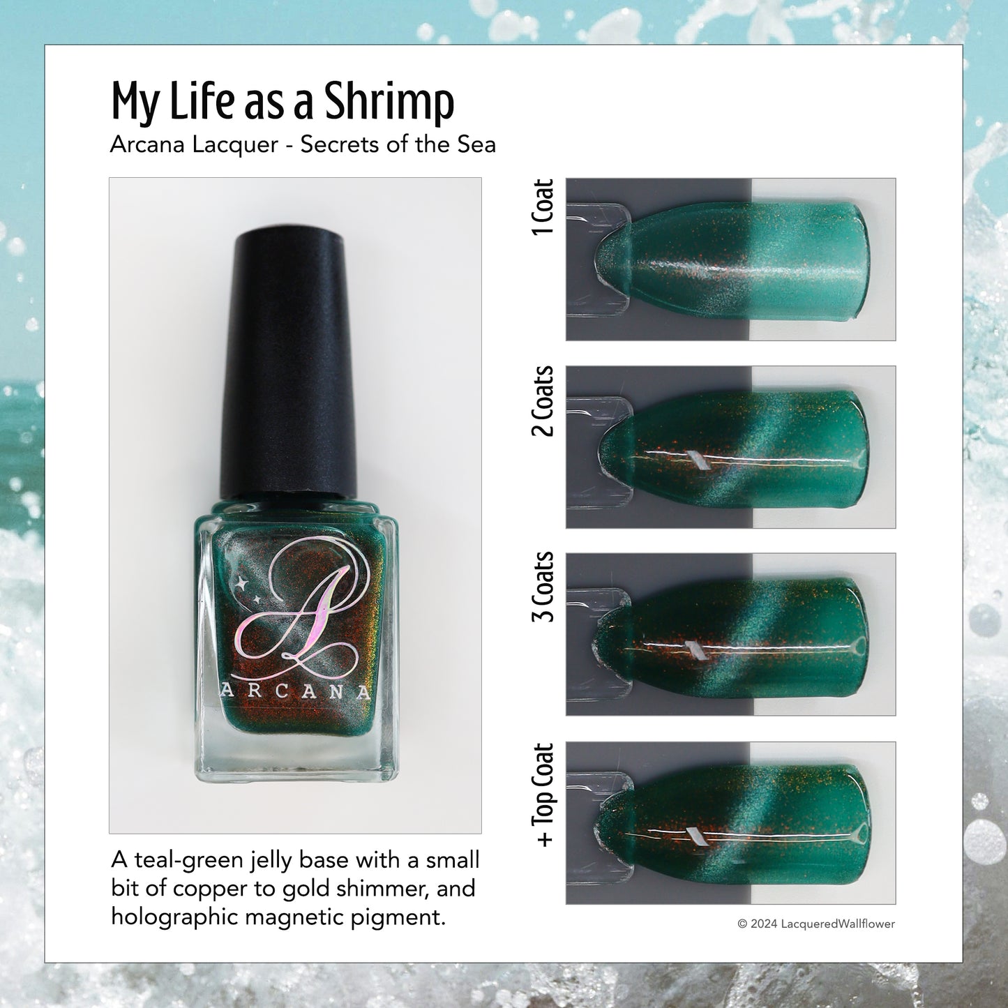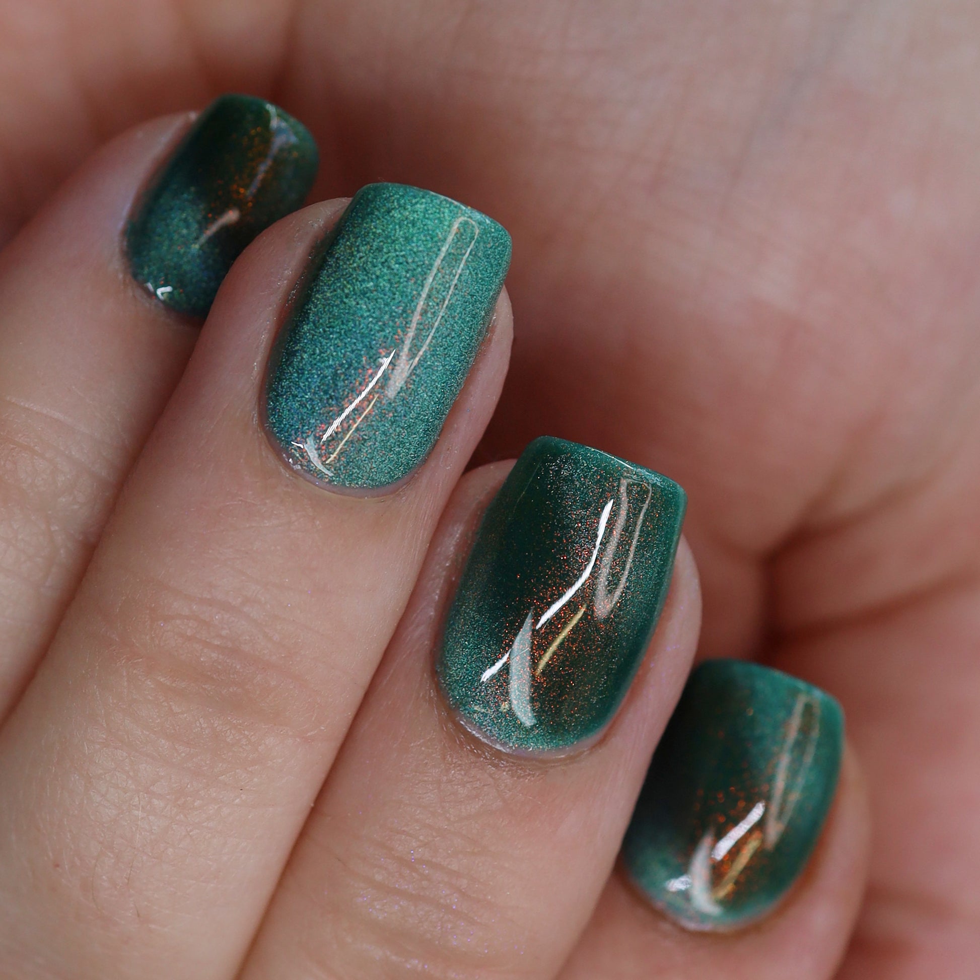My Life as a Shrimp has a blue-green jelly base and red-orange aurora along with magnetic holo pigment! The magnetic holo in this is mesmerizing. It holds very well with little diffusion in our experience!