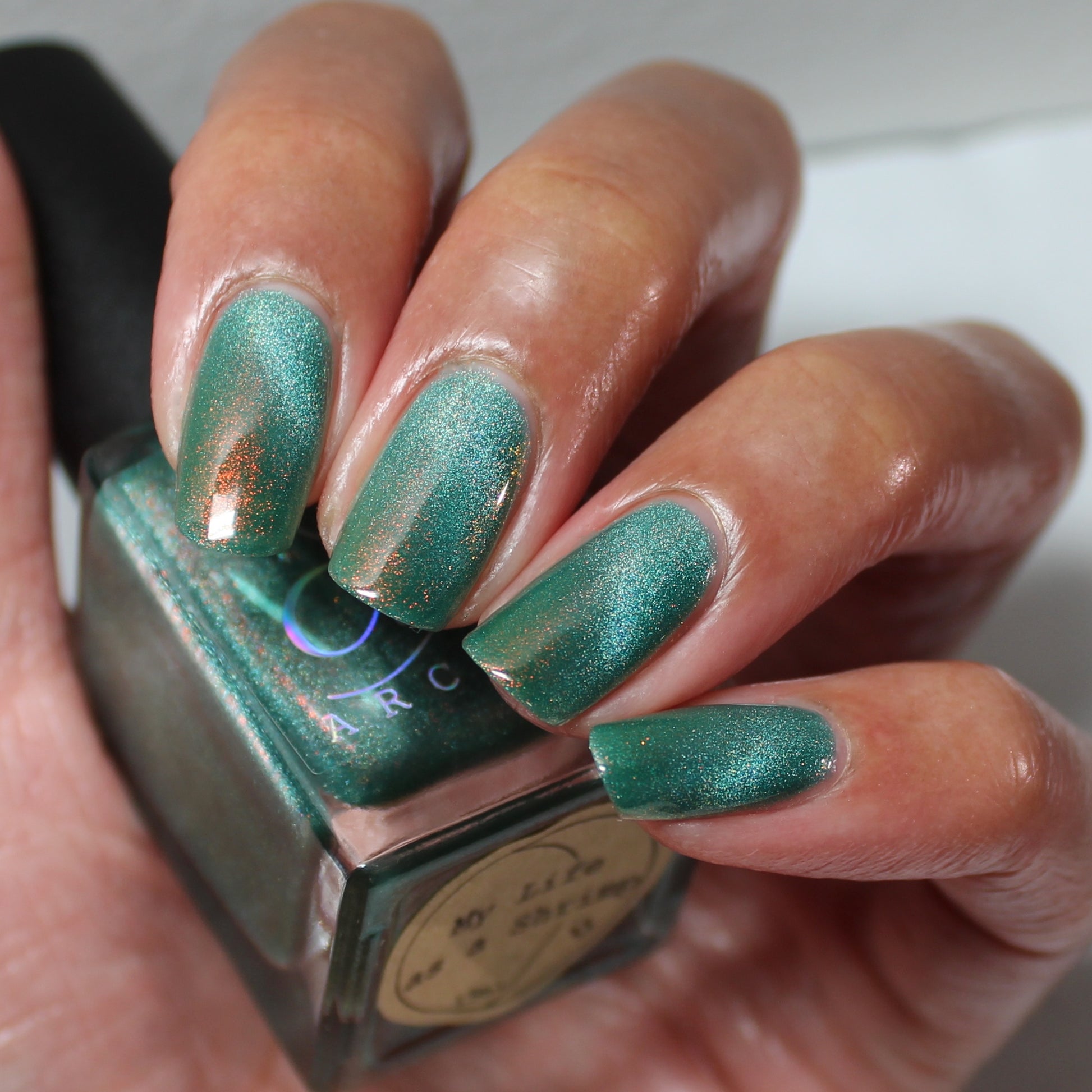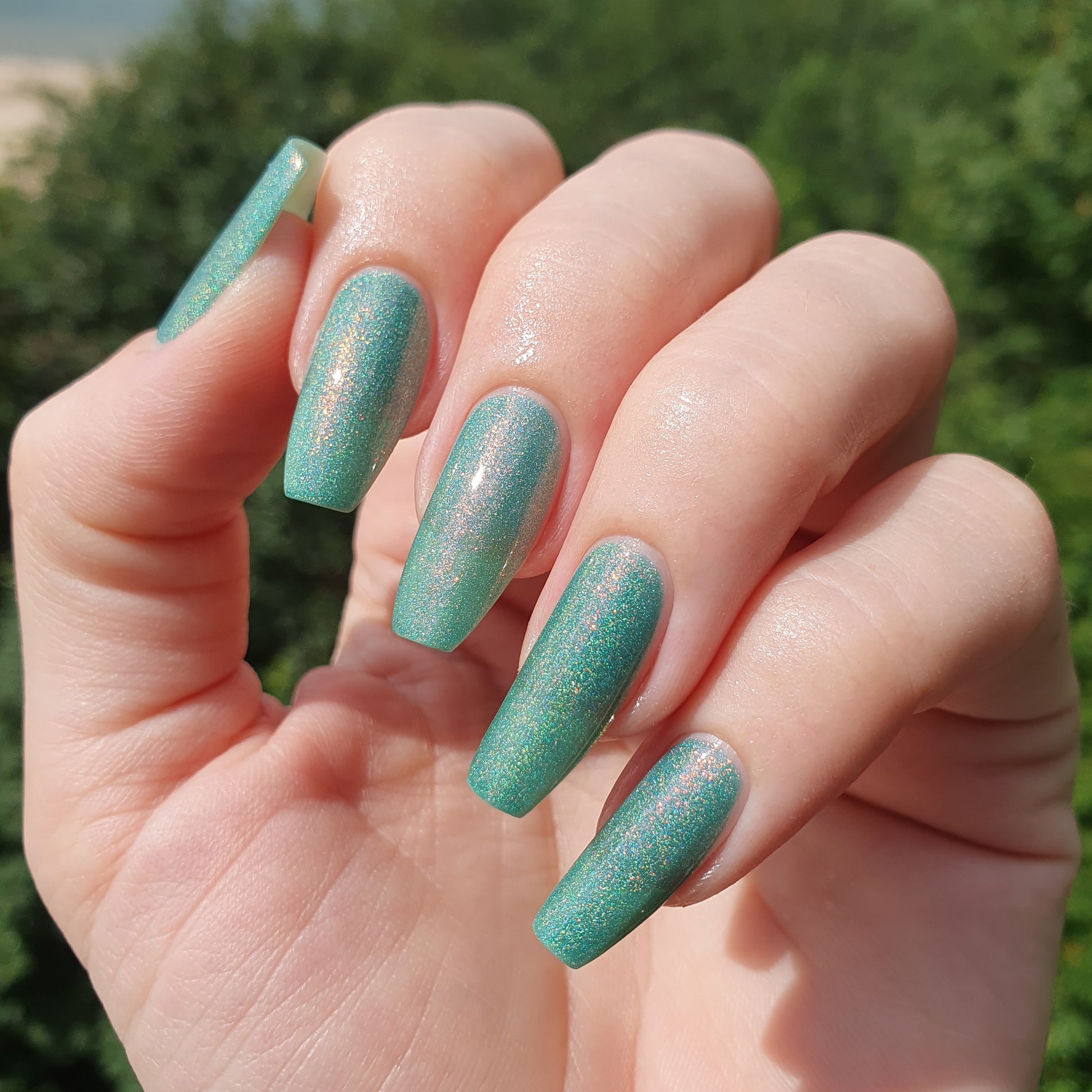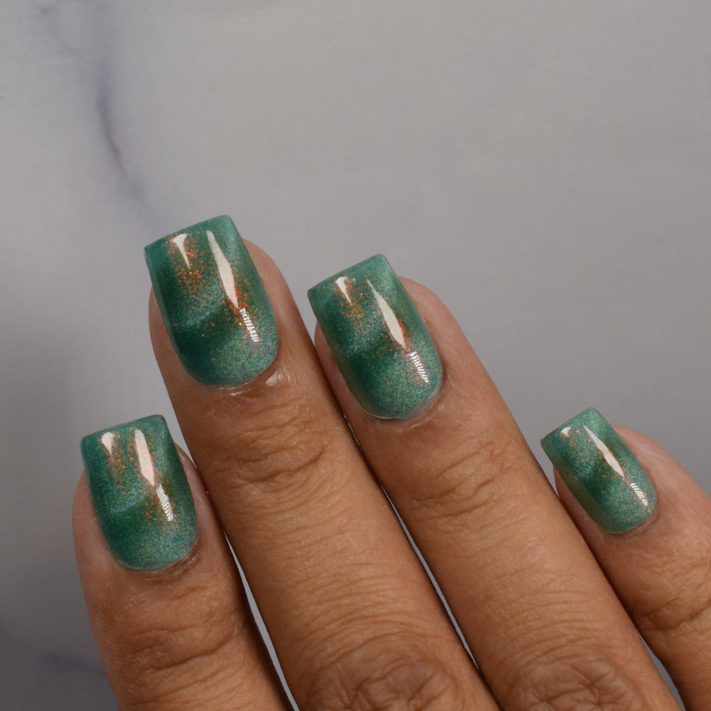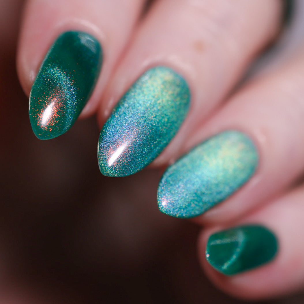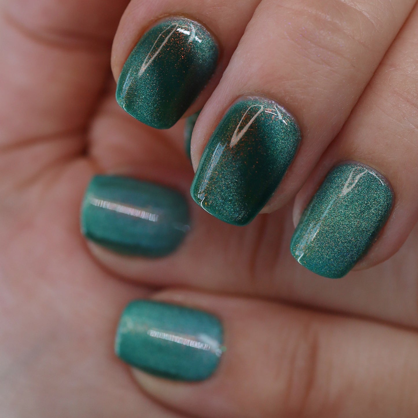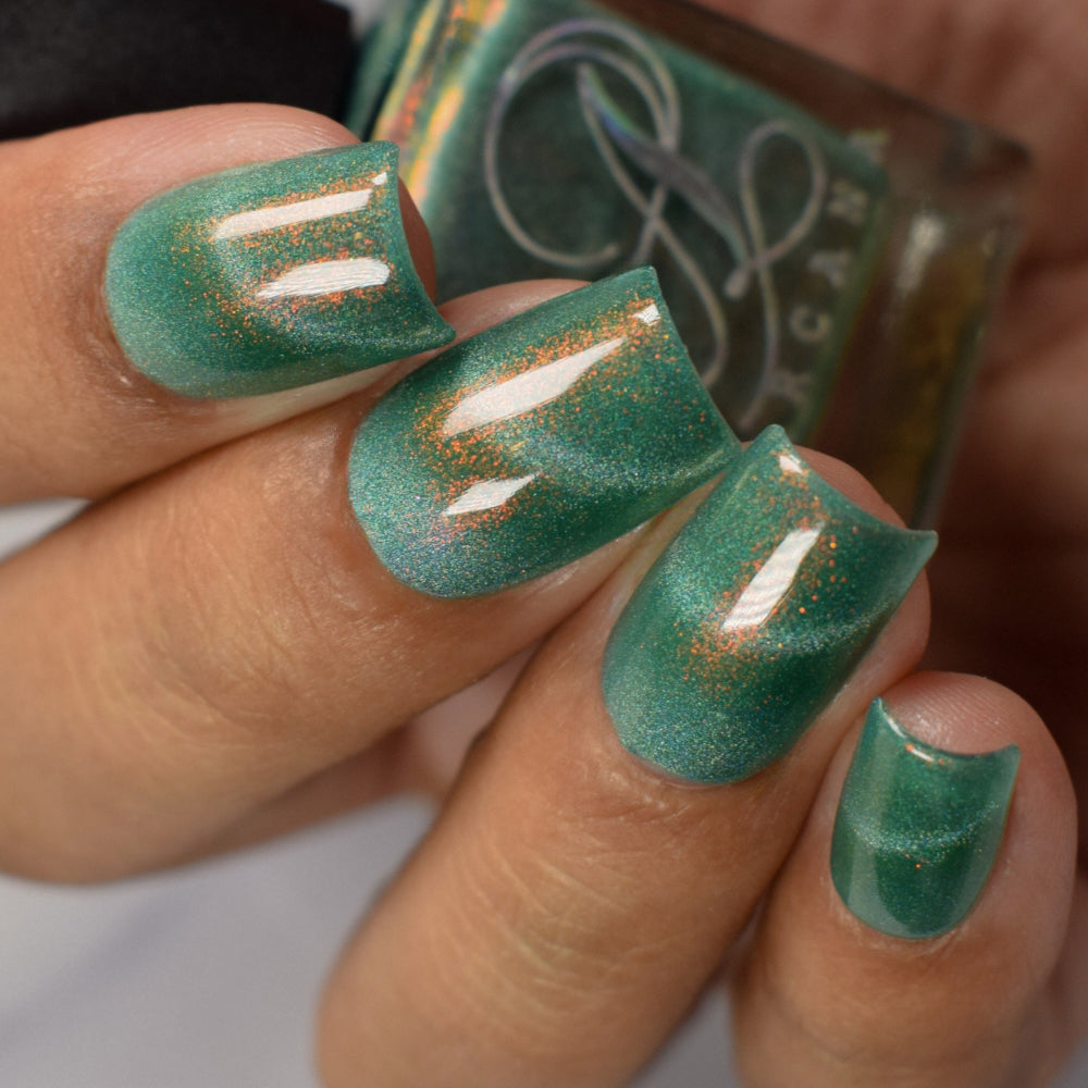 My Life as a Shrimp has a blue-green jelly base and red-orange aurora along with magnetic holo pigment! The magnetic holo in this is mesmerizing. It holds very well with little diffusion in our experience!