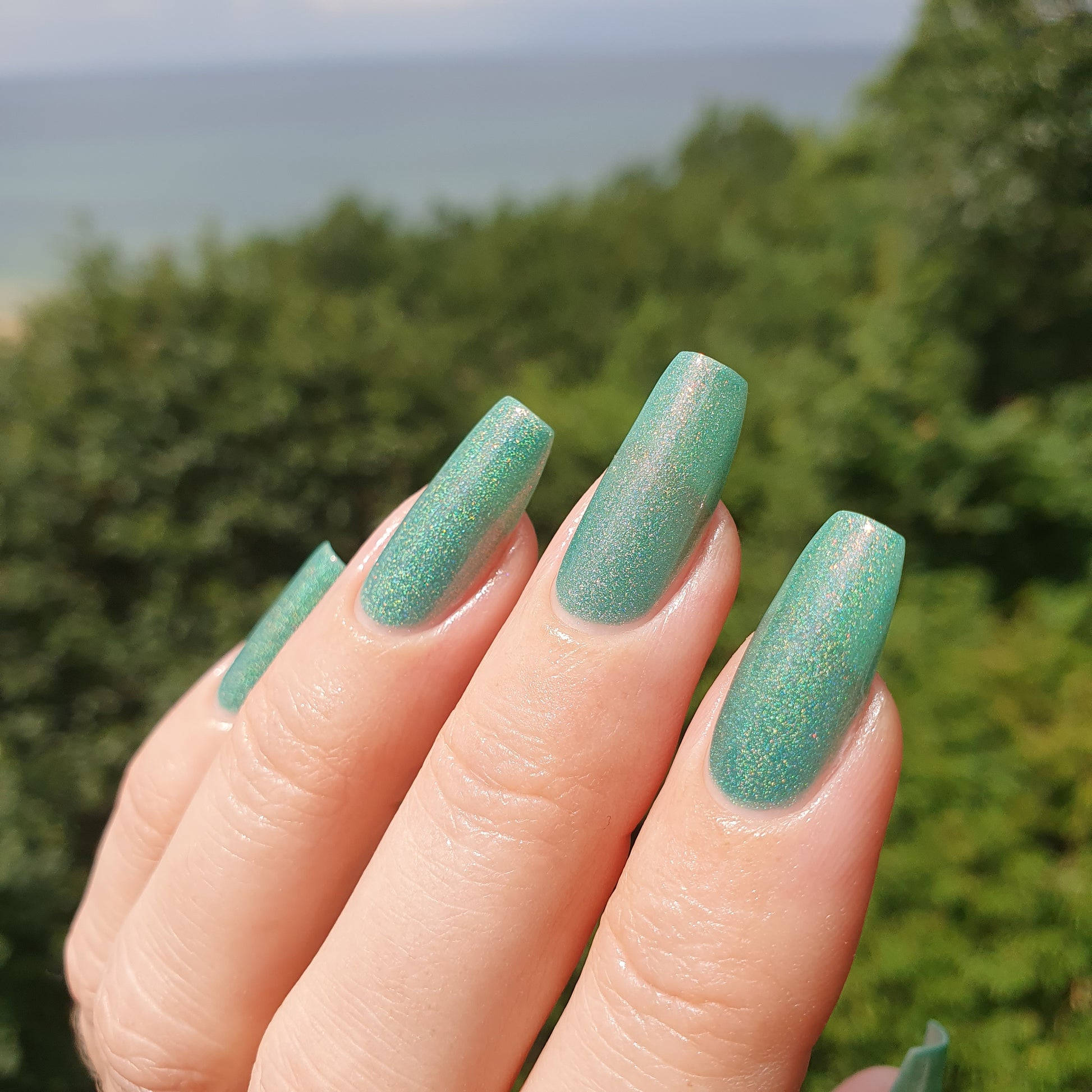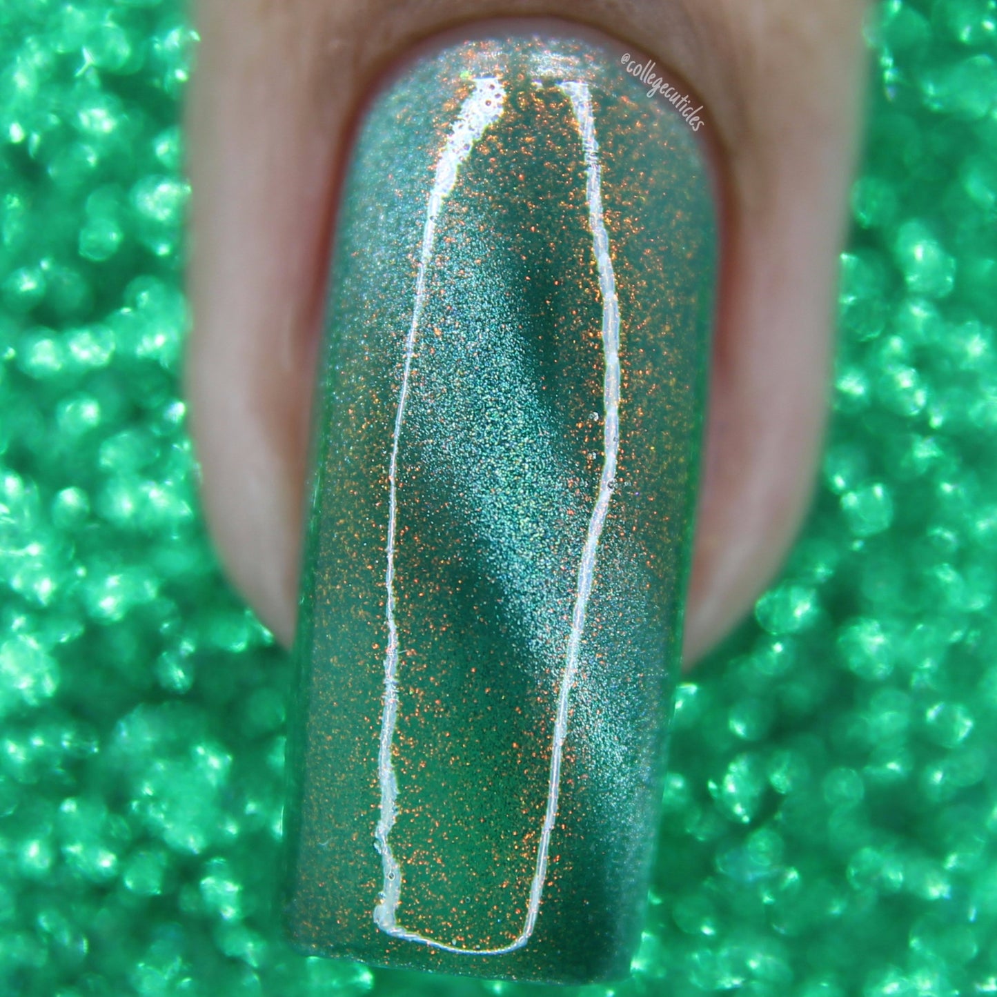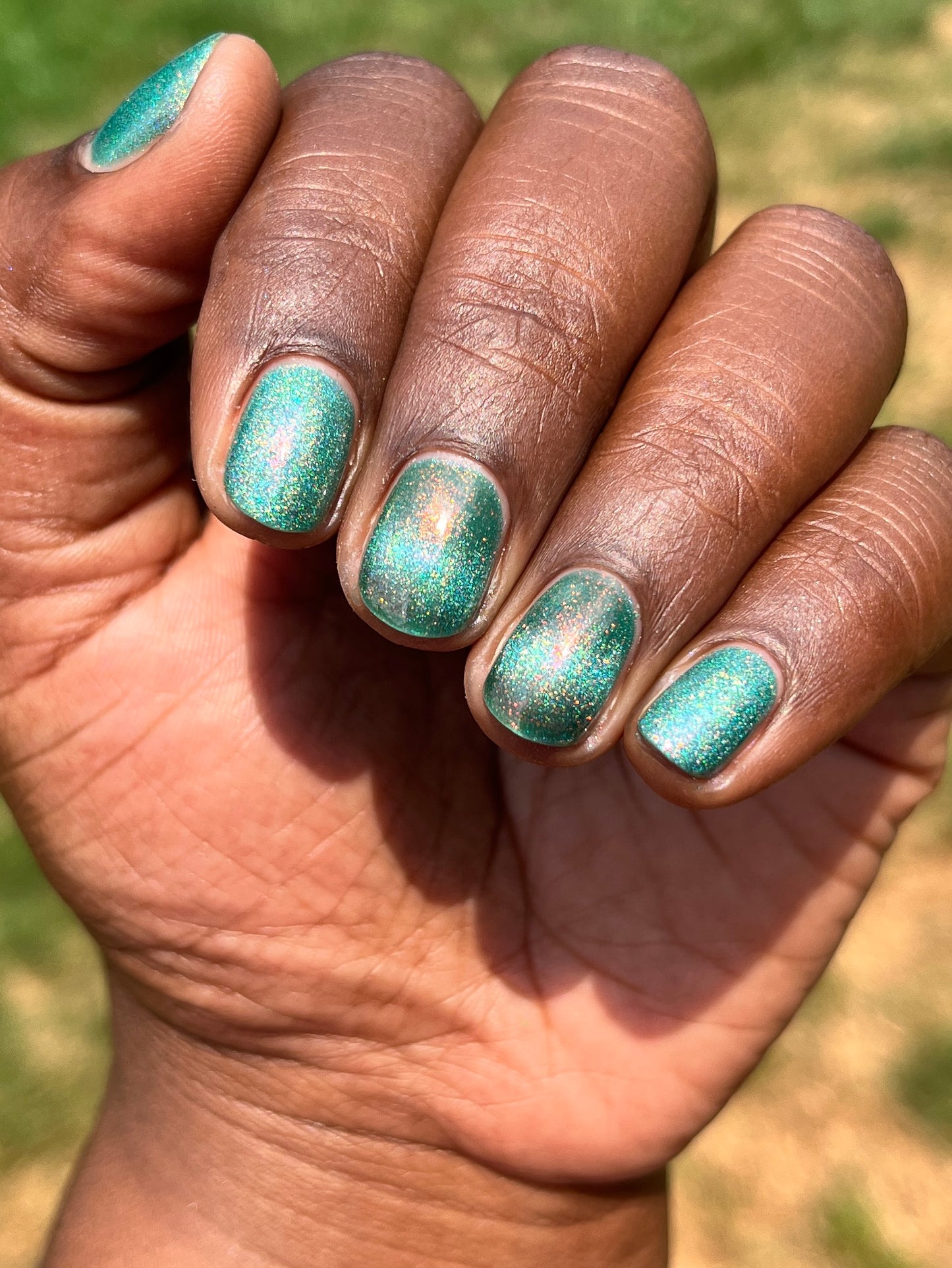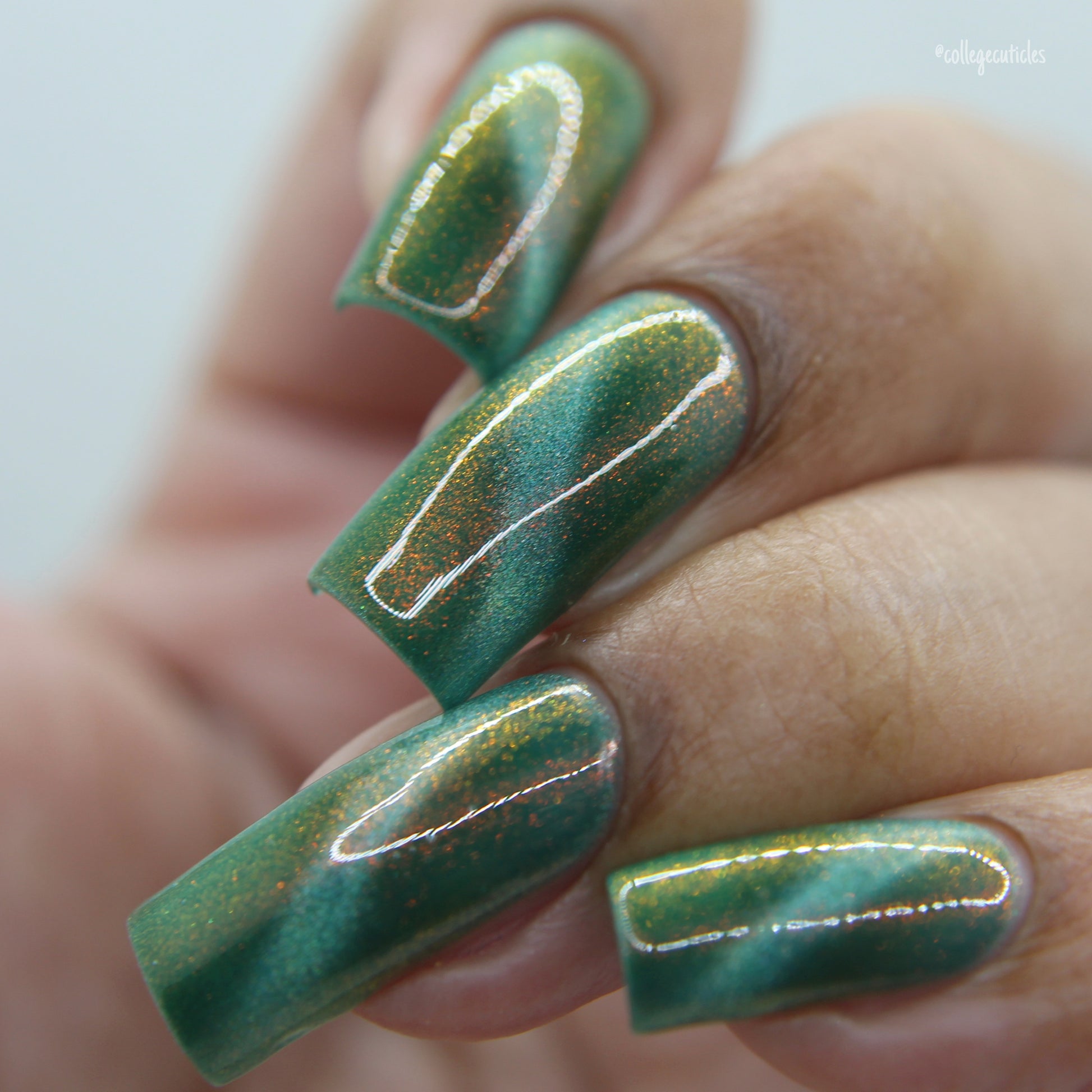 My Life as a Shrimp has a blue-green jelly base and red-orange aurora along with magnetic holo pigment! The magnetic holo in this is mesmerizing. It holds very well with little diffusion in our experience!