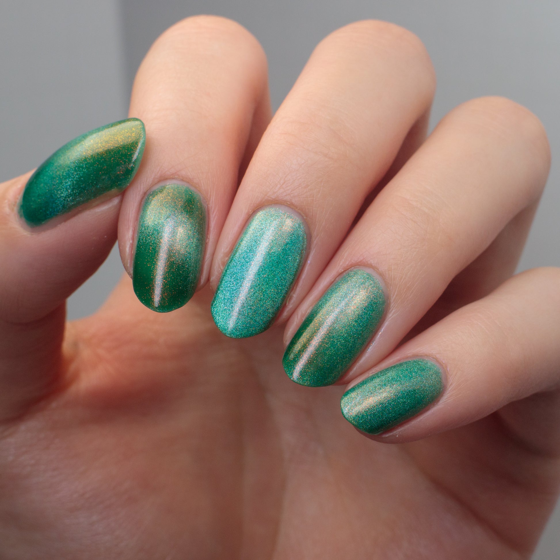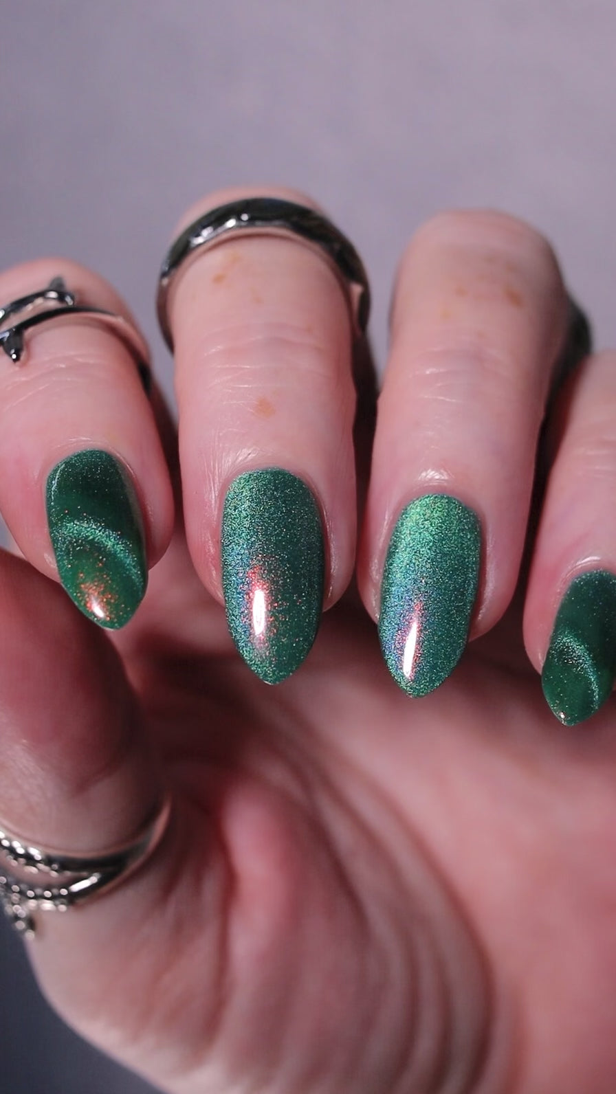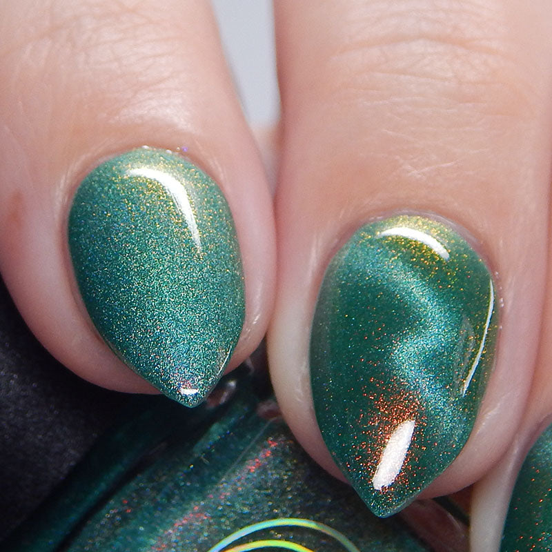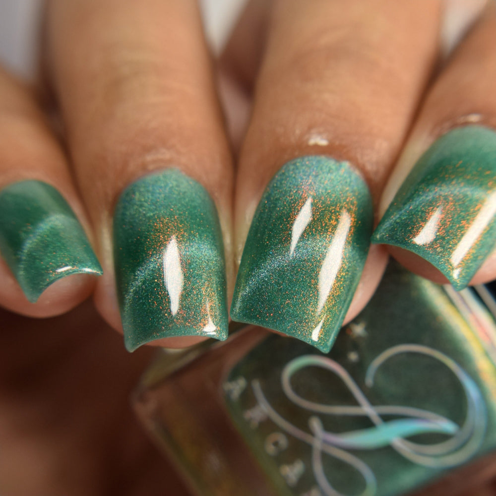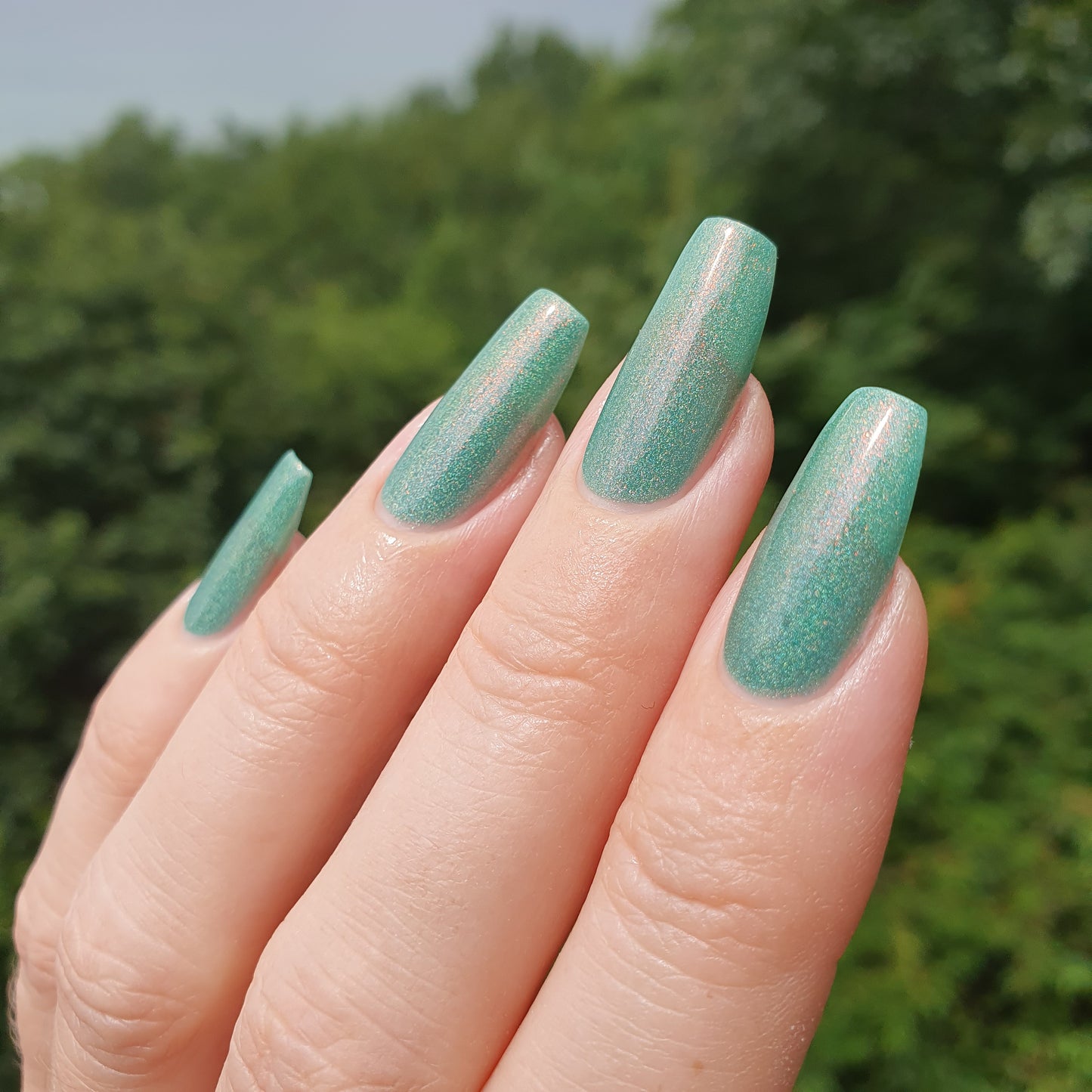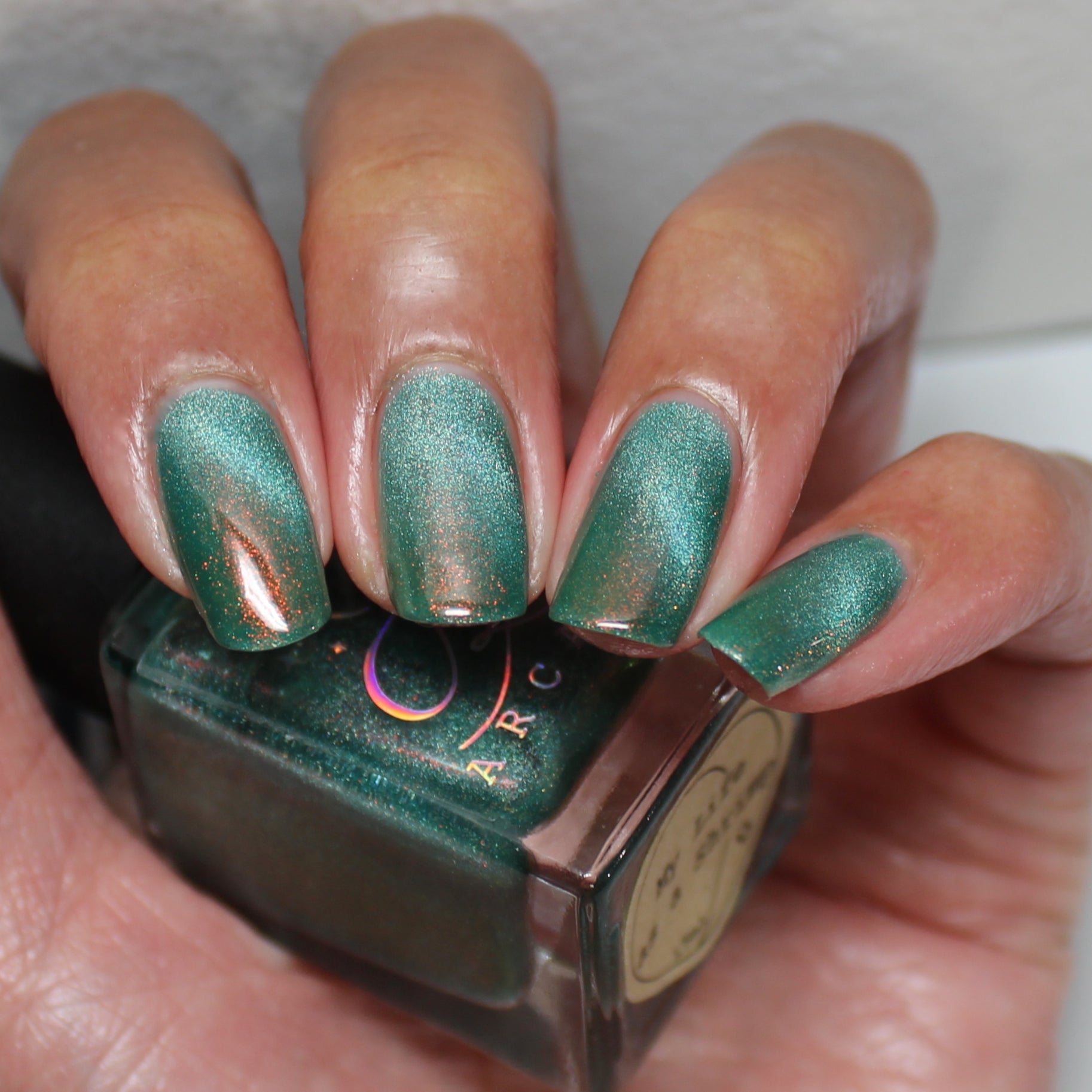 My Life as a Shrimp has a blue-green jelly base and red-orange aurora along with magnetic holo pigment! The magnetic holo in this is mesmerizing. It holds very well with little diffusion in our experience!
