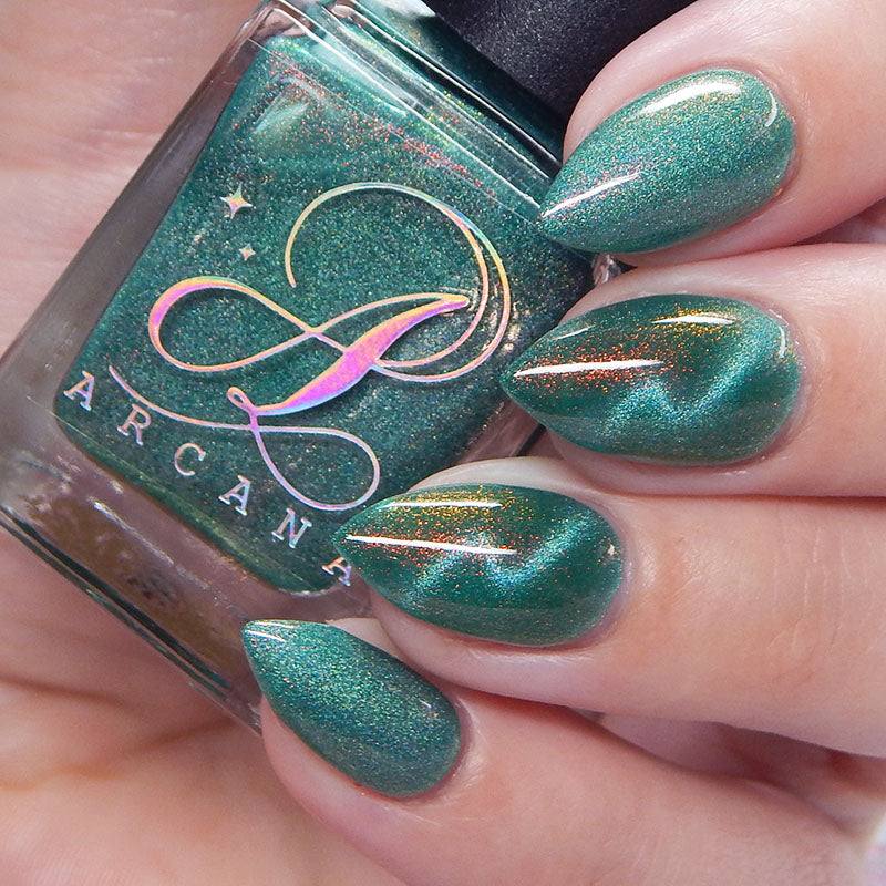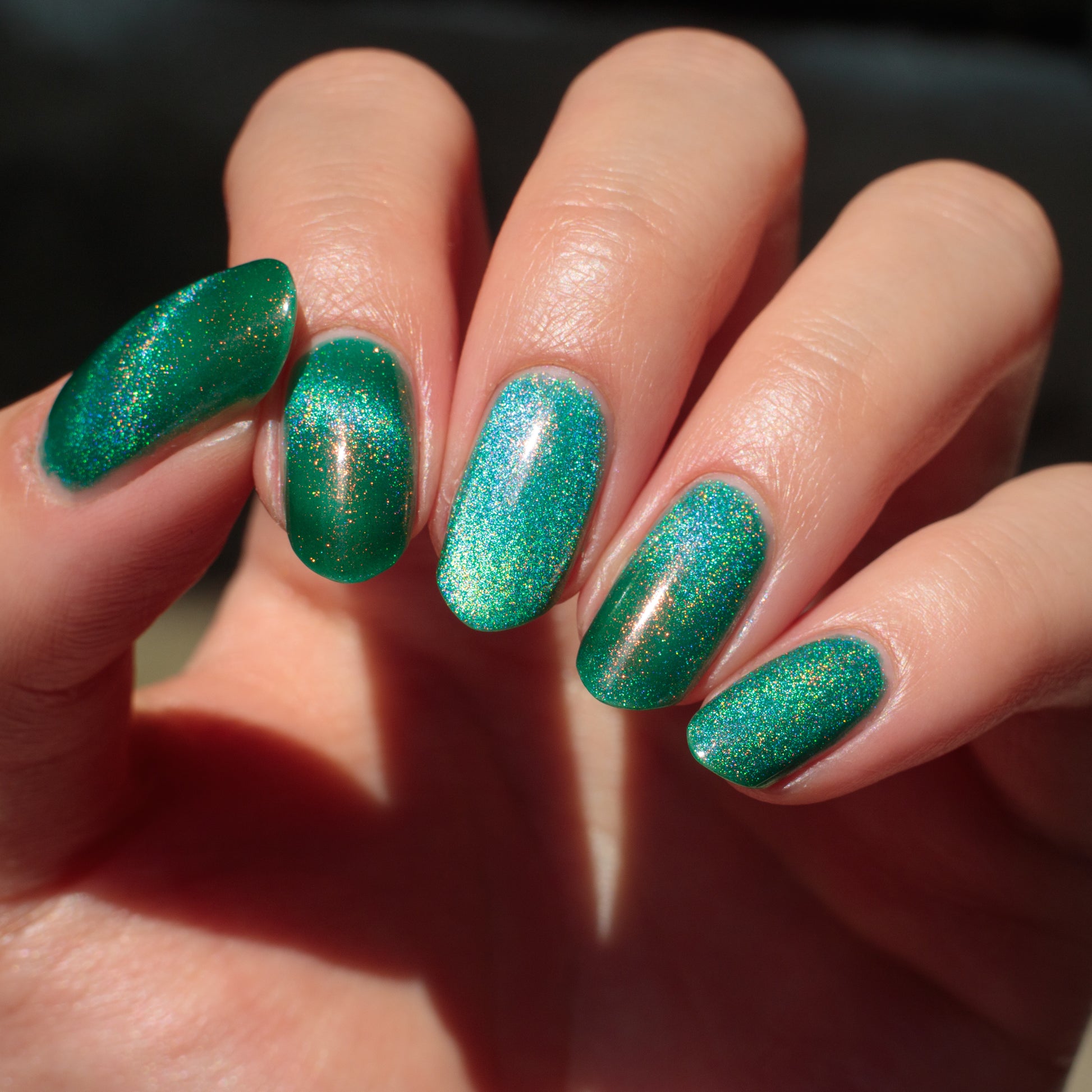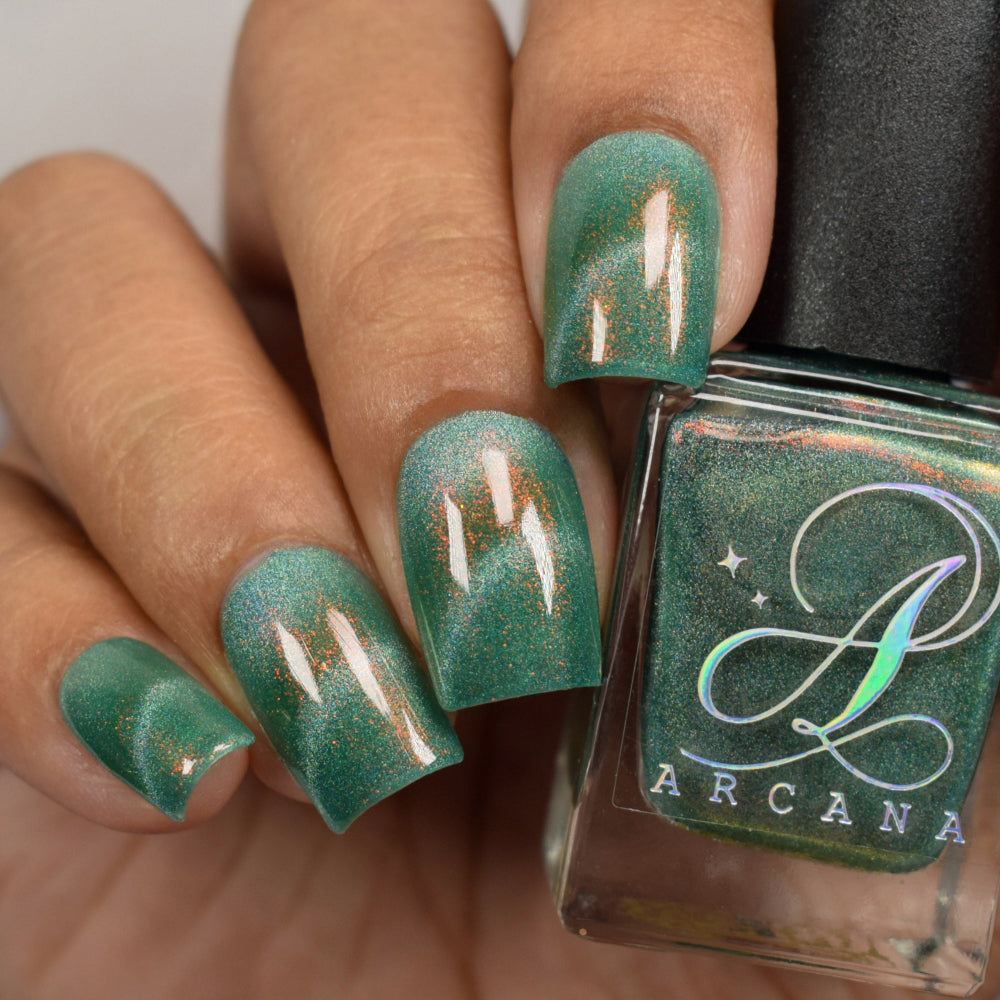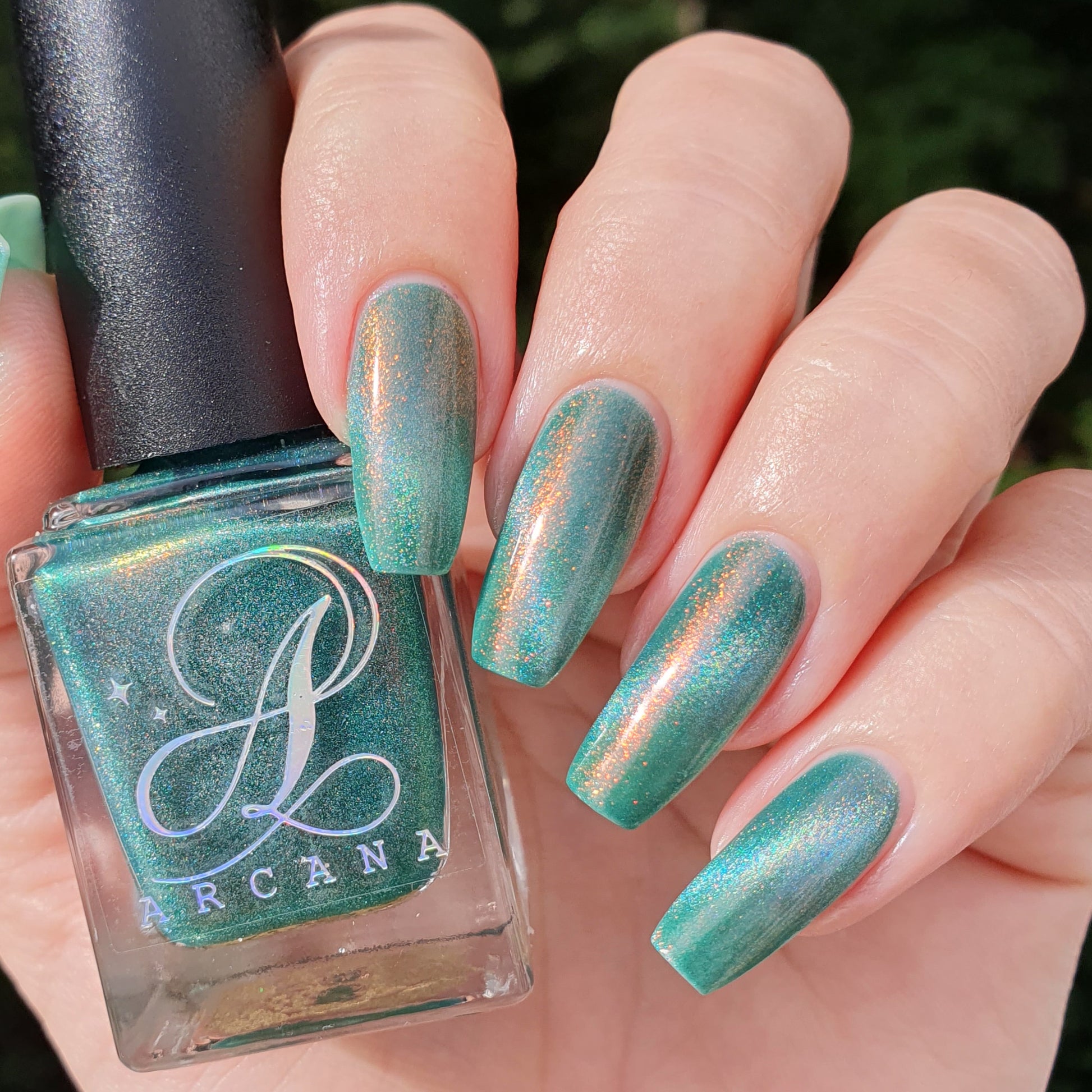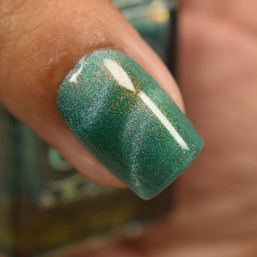 My Life as a Shrimp has a blue-green jelly base and red-orange aurora along with magnetic holo pigment! The magnetic holo in this is mesmerizing. It holds very well with little diffusion in our experience!