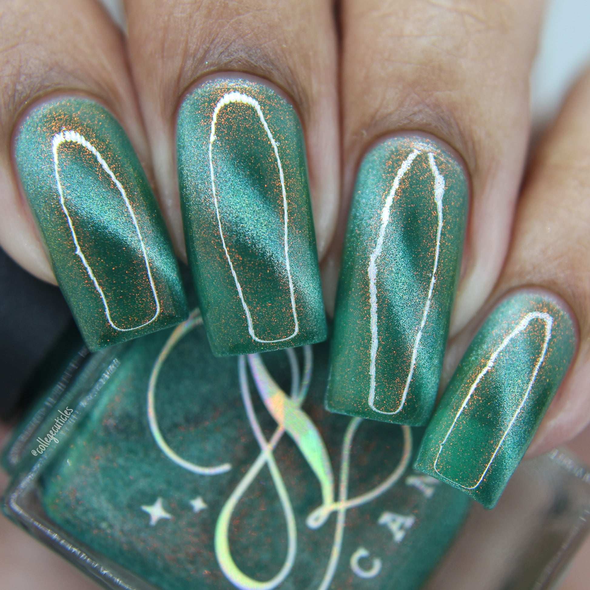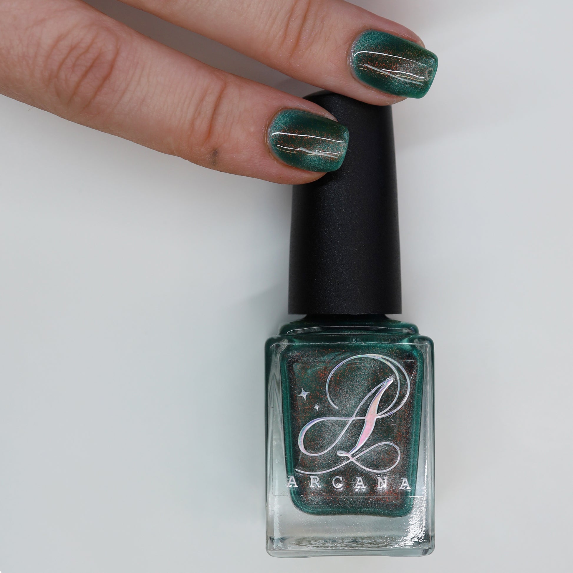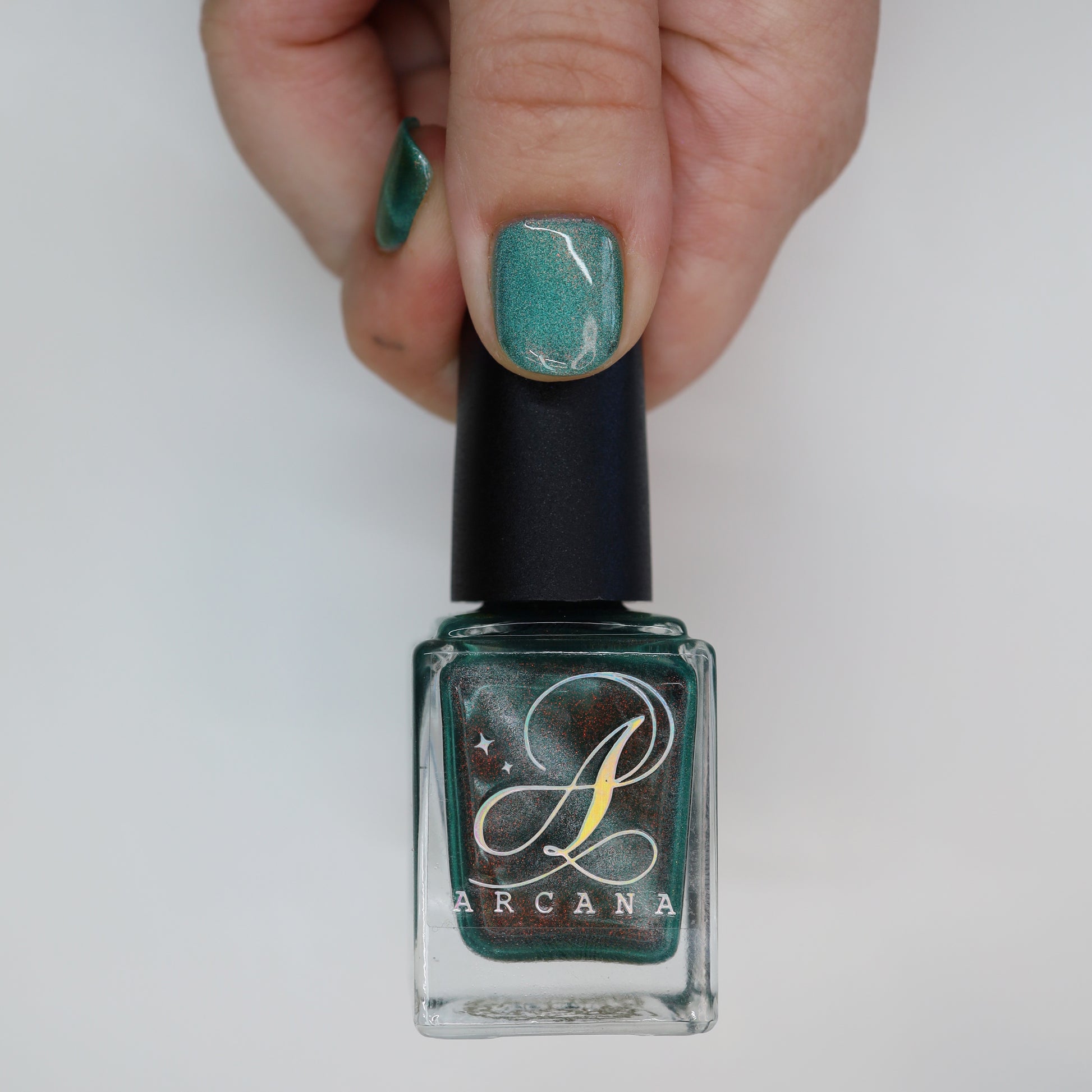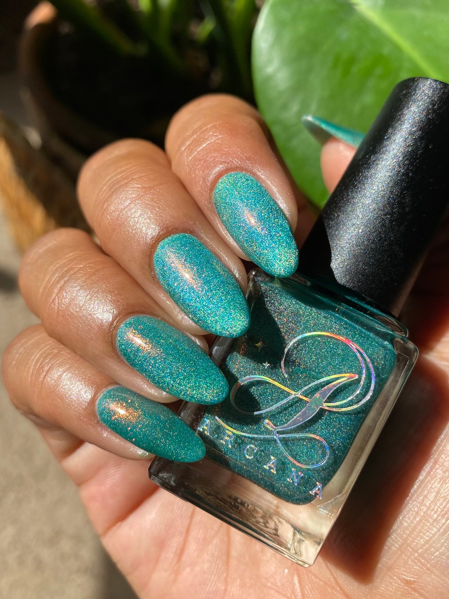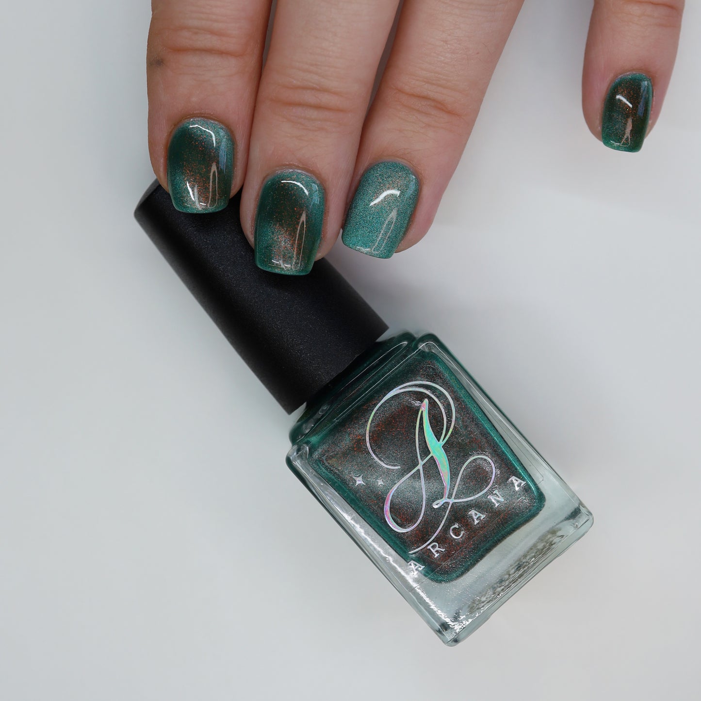 My Life as a Shrimp has a blue-green jelly base and red-orange aurora along with magnetic holo pigment! The magnetic holo in this is mesmerizing. It holds very well with little diffusion in our experience!