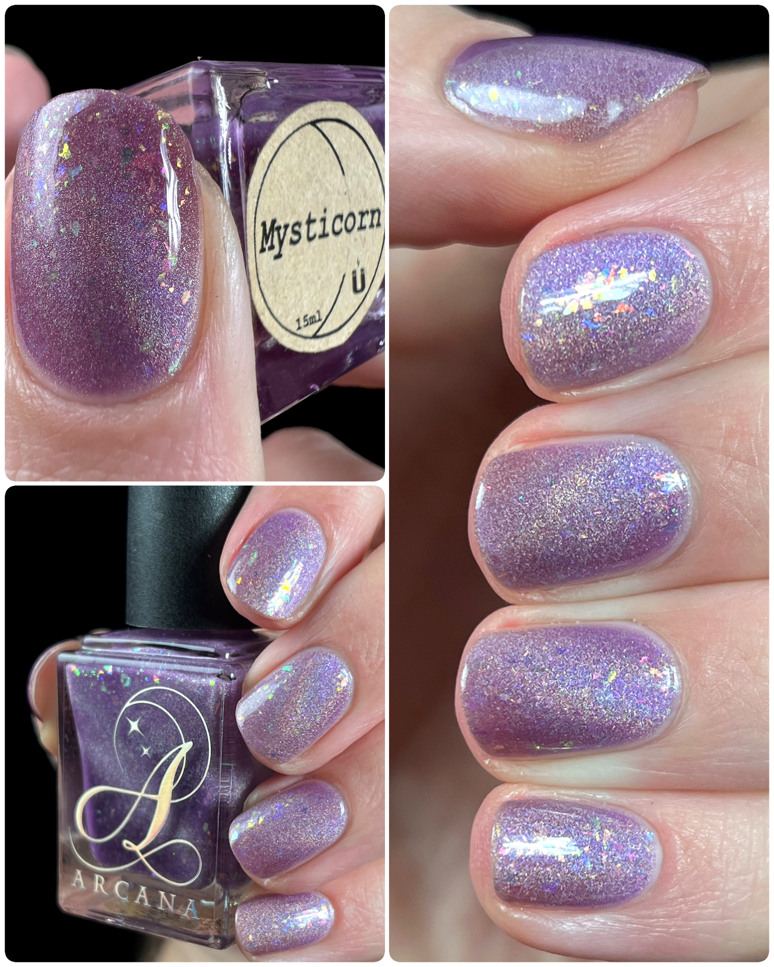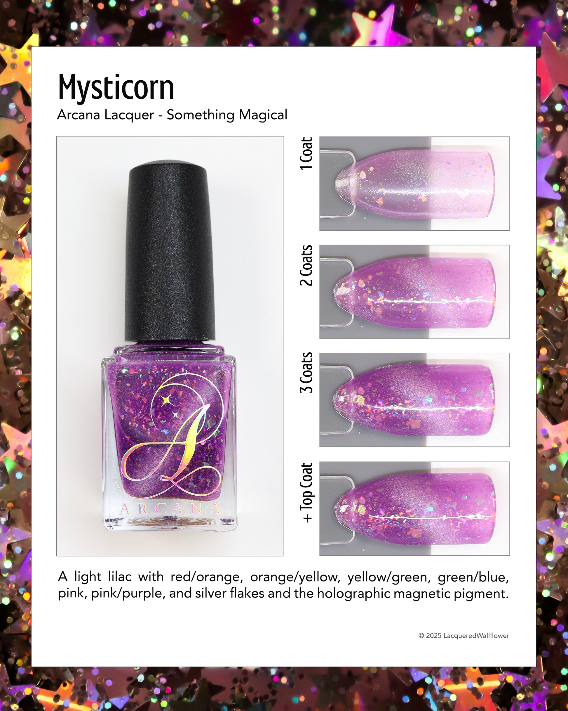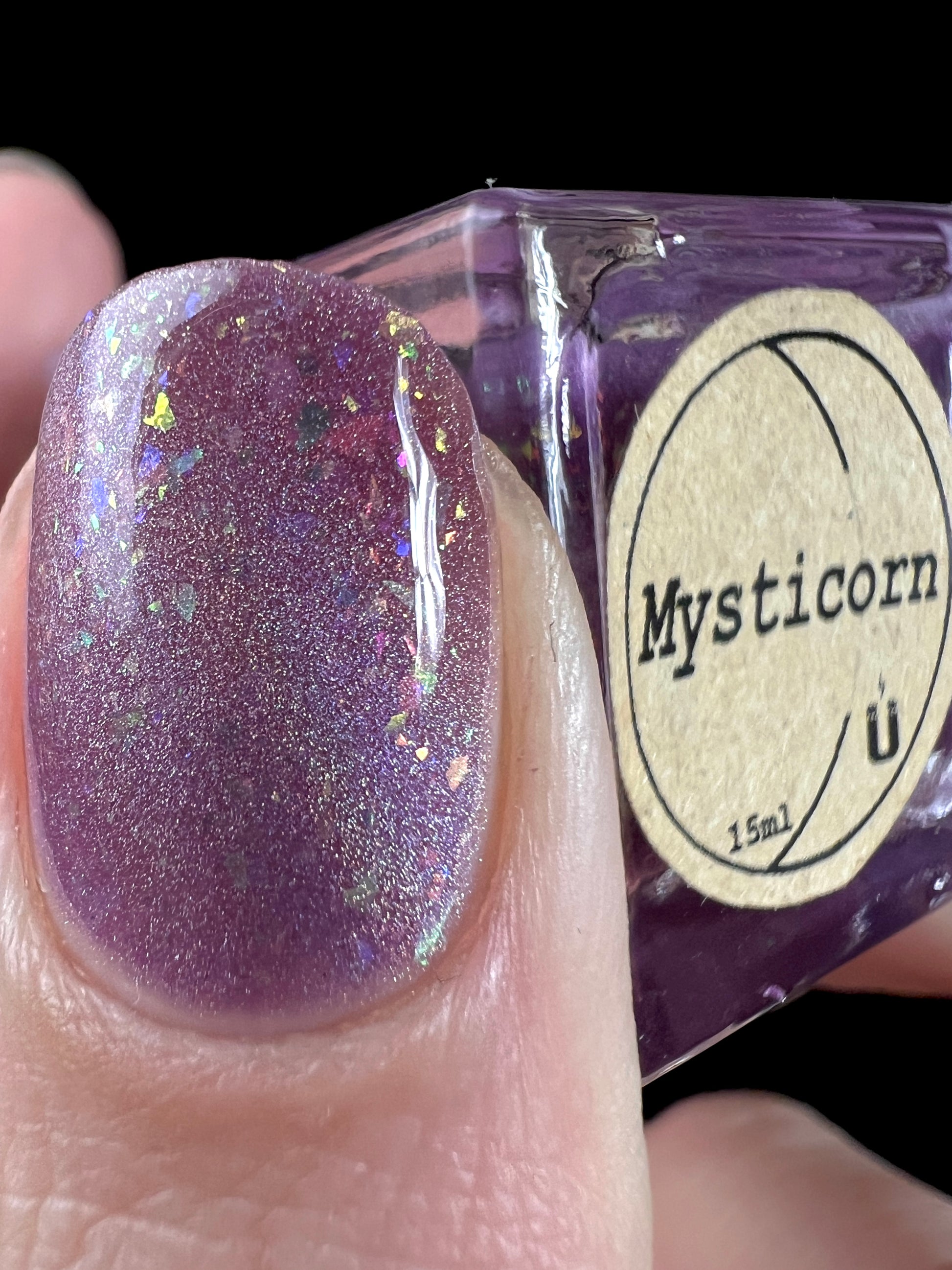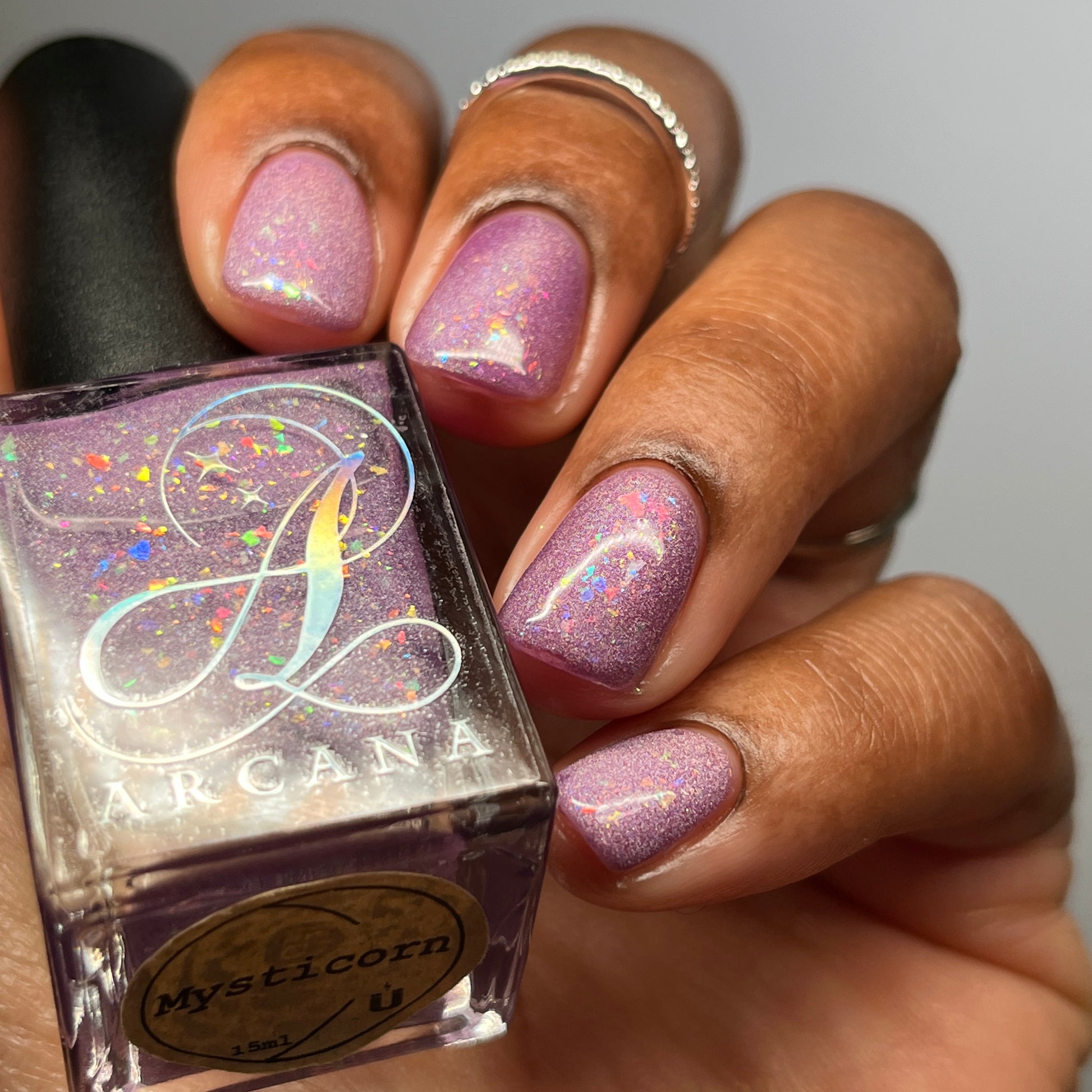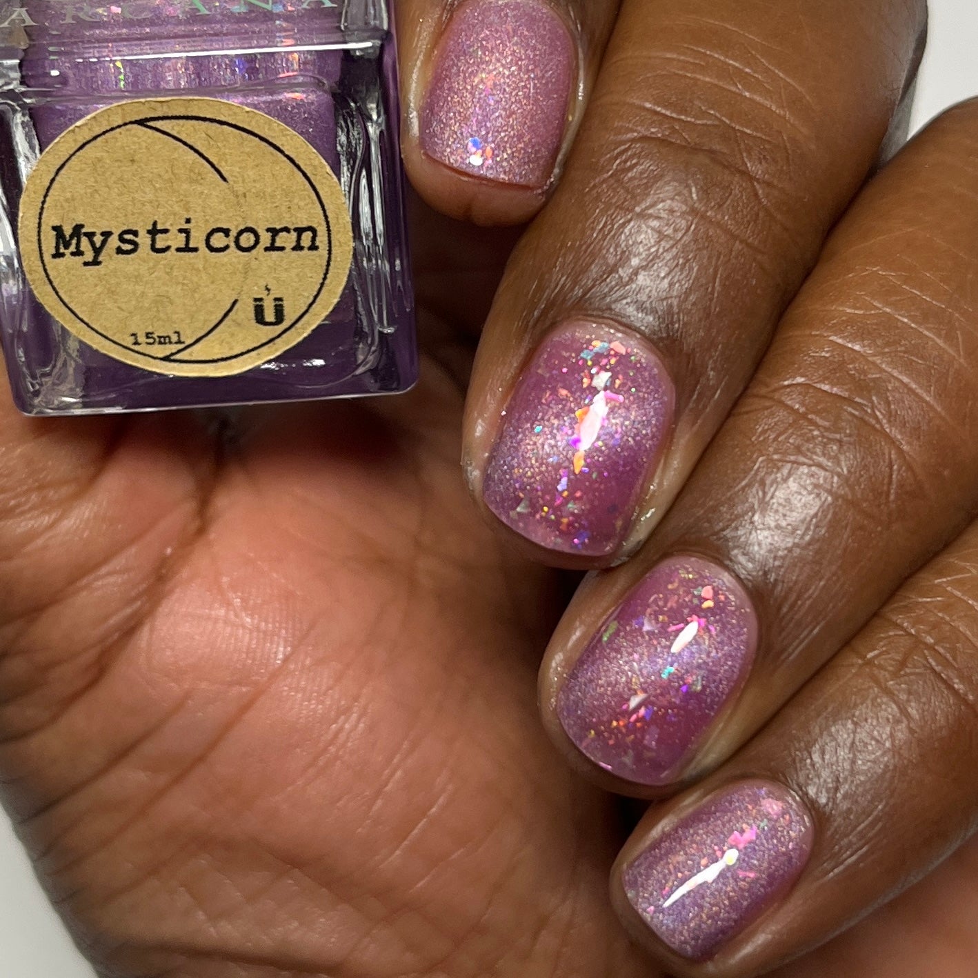 Mysticorn is a light lilac base with red/orange, orange/yellow, yellow/green, green/blue, pink, pink/purple, and silver flakes and holographic magnetic pigment.