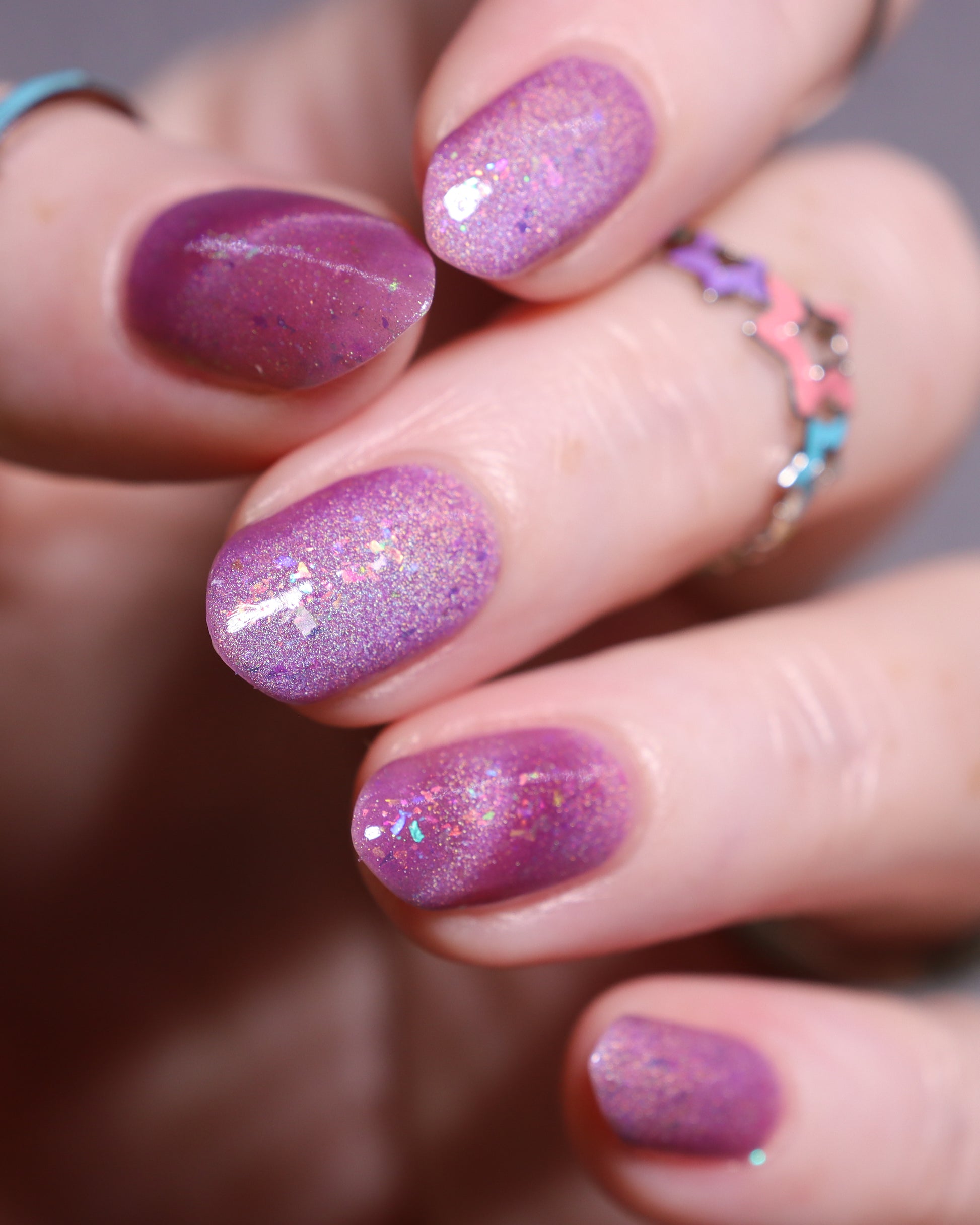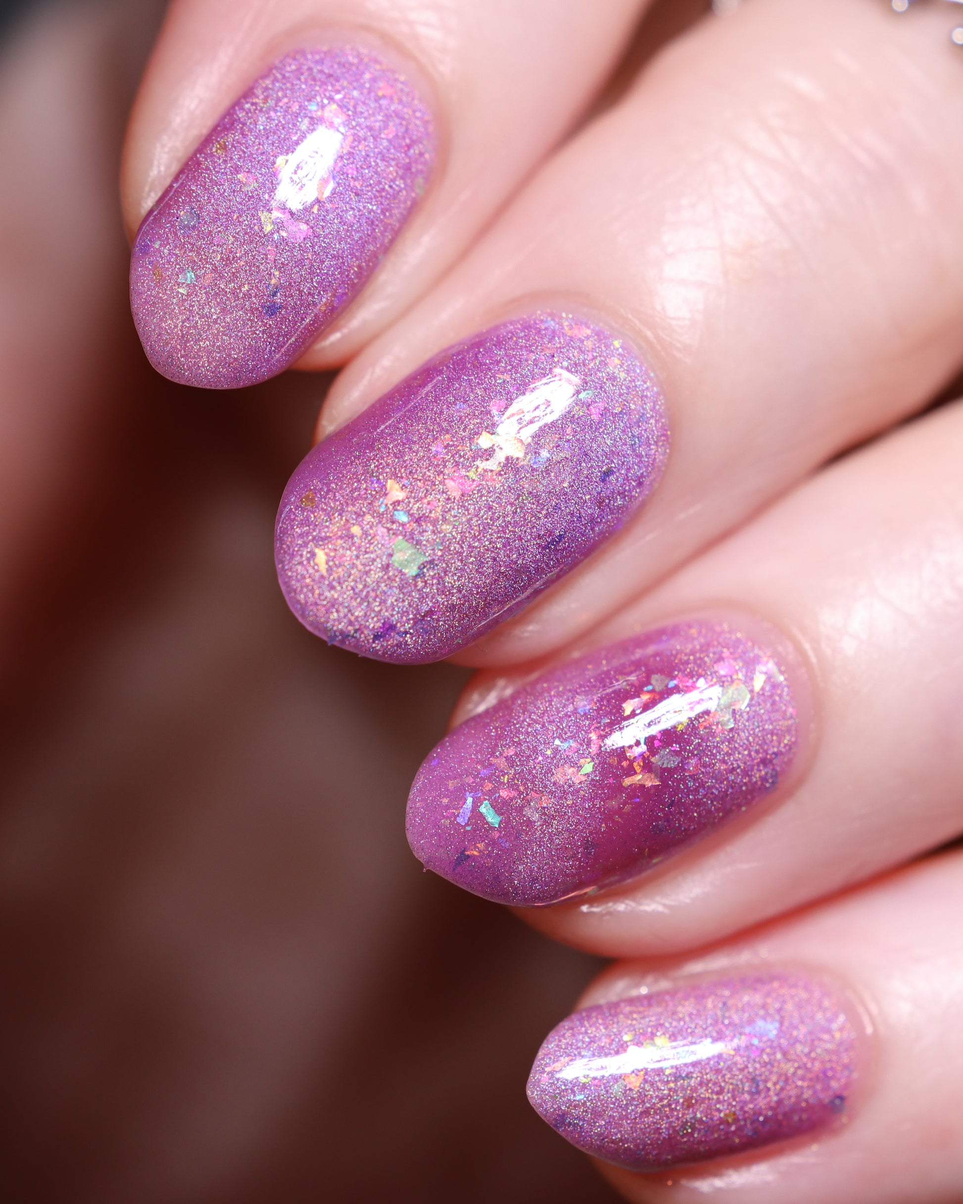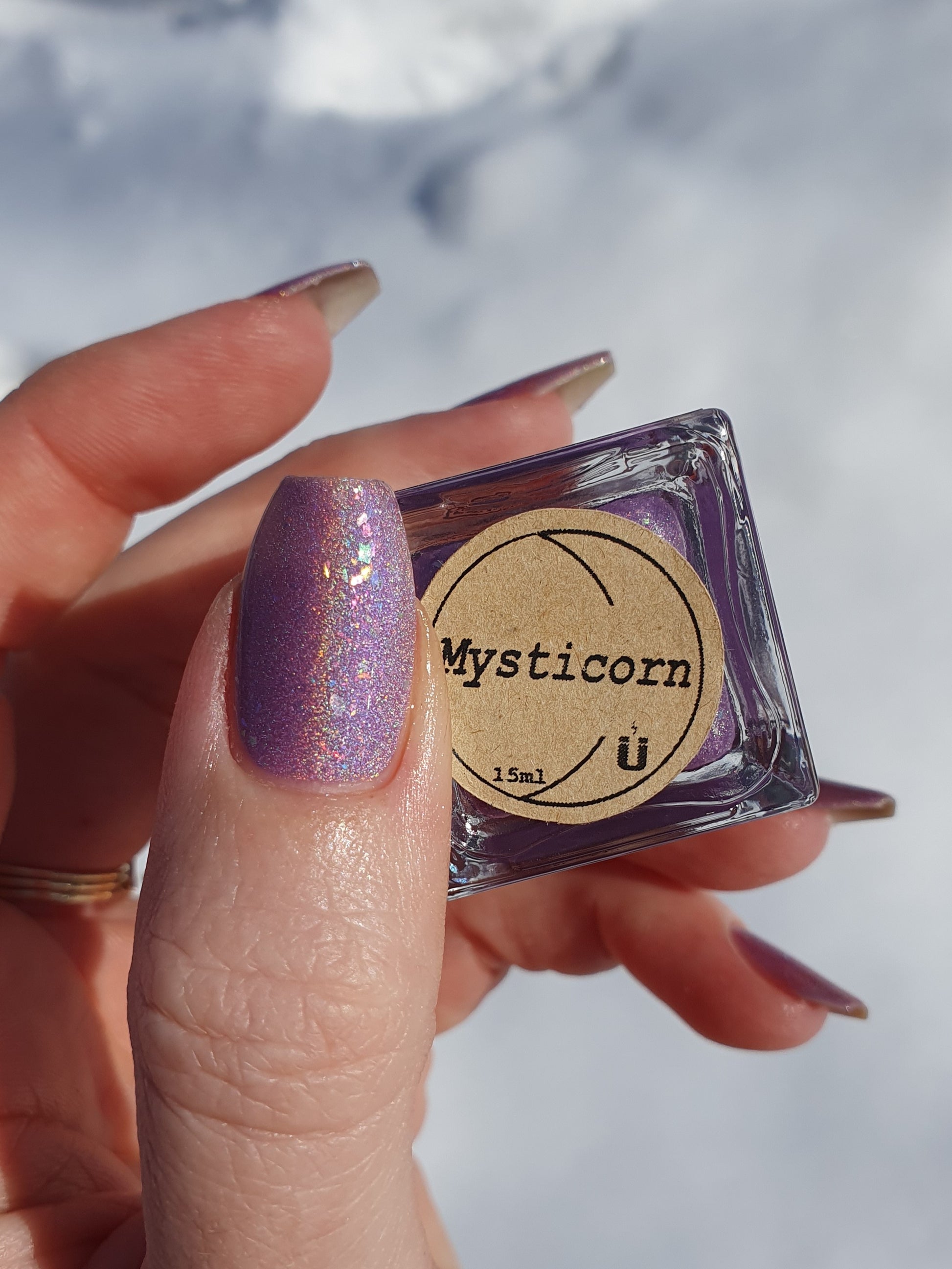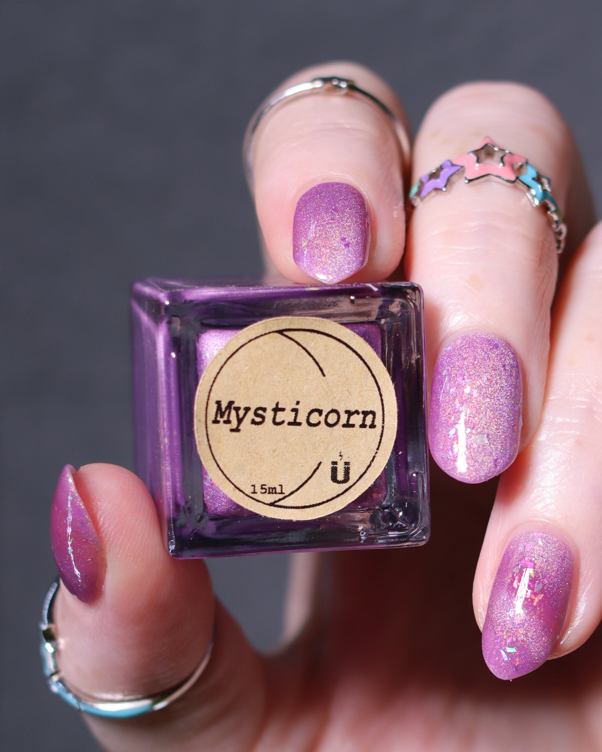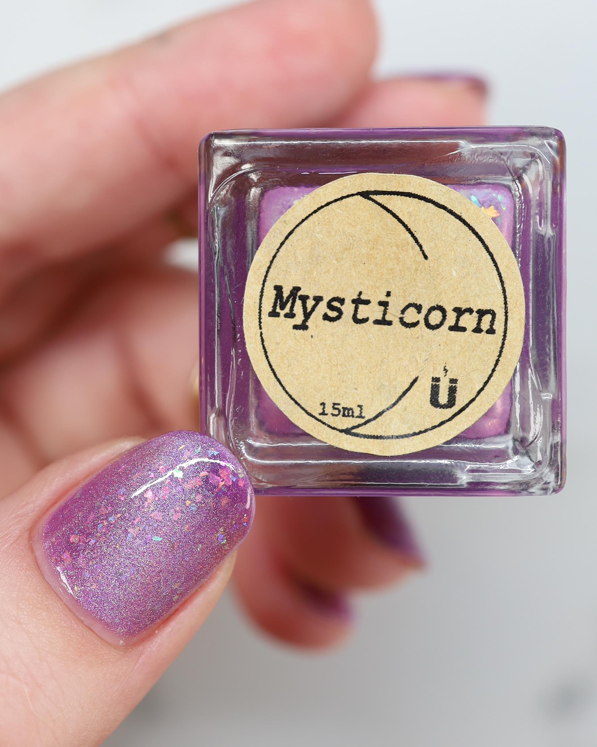 Mysticorn is a light lilac base with red/orange, orange/yellow, yellow/green, green/blue, pink, pink/purple, and silver flakes and holographic magnetic pigment.
