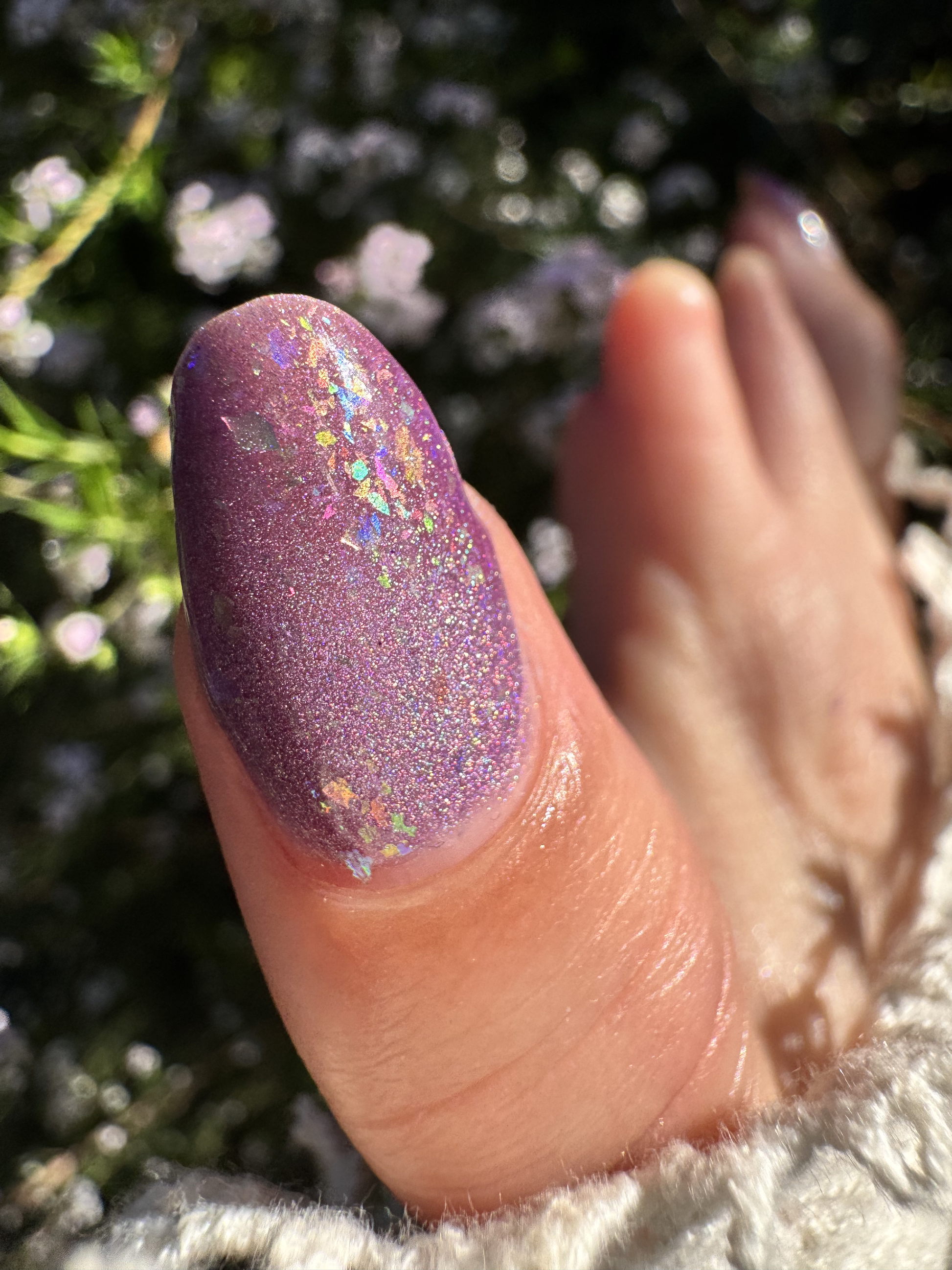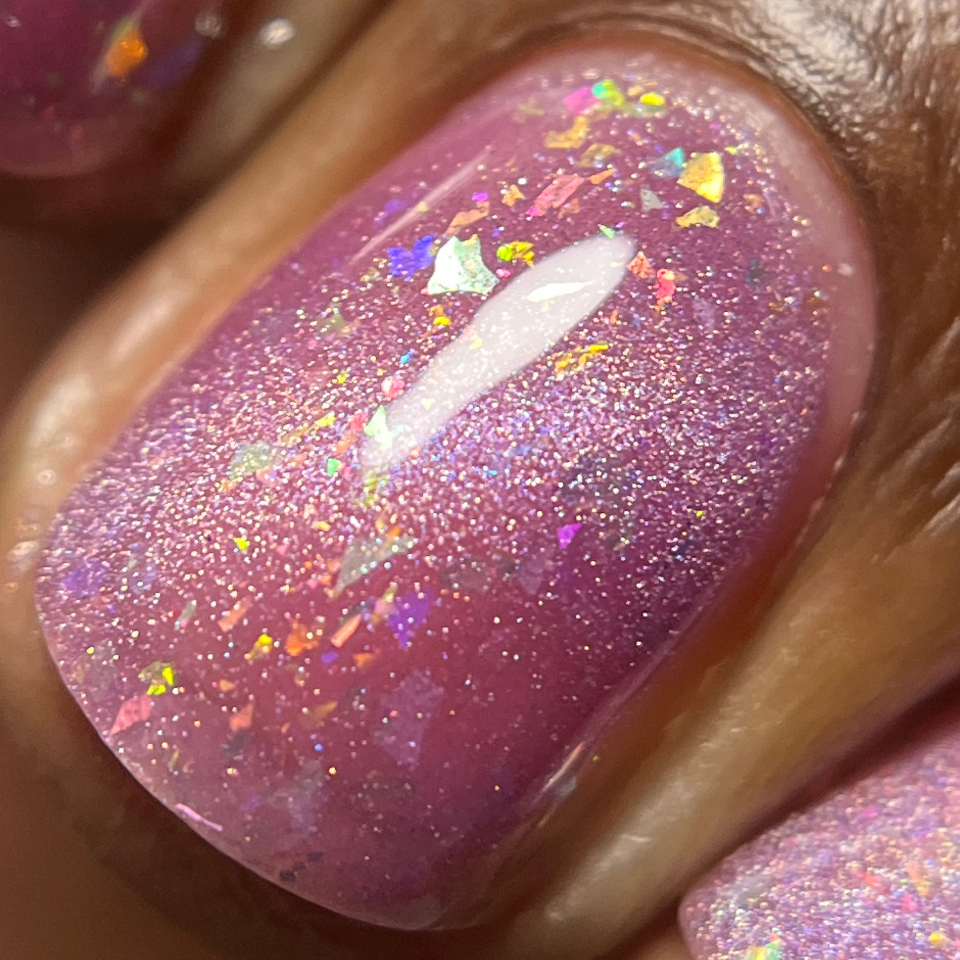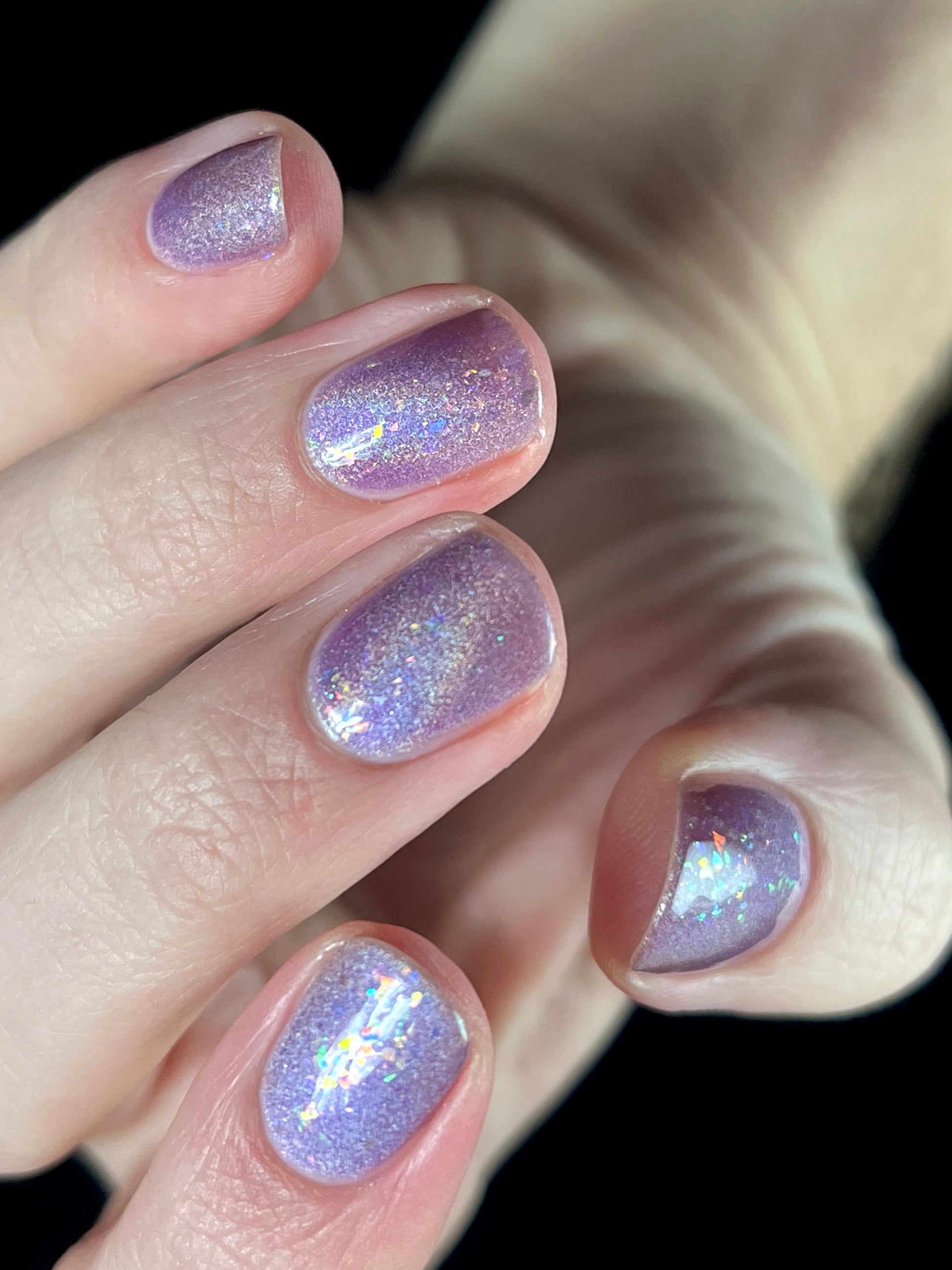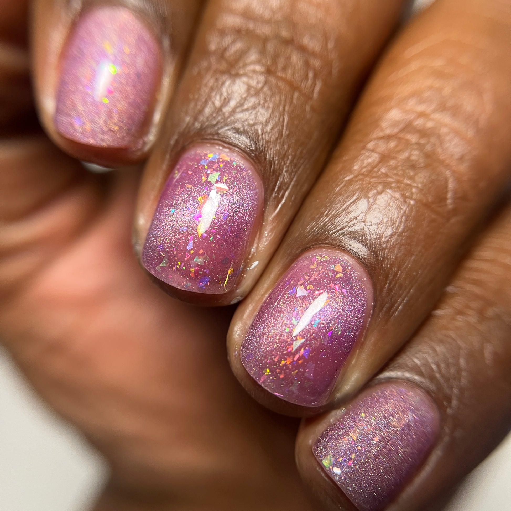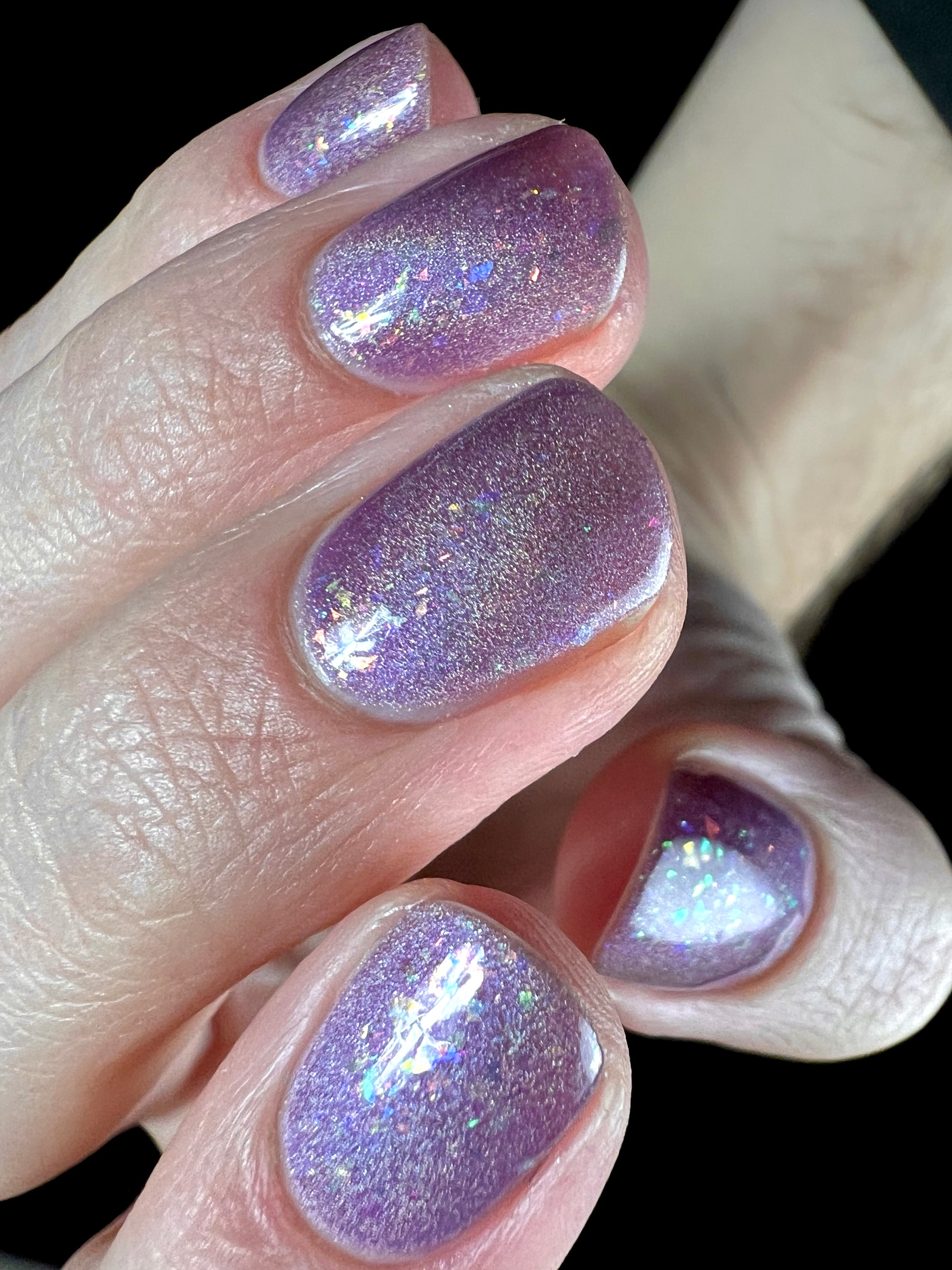Mysticorn is a light lilac base with red/orange, orange/yellow, yellow/green, green/blue, pink, pink/purple, and silver flakes and holographic magnetic pigment.