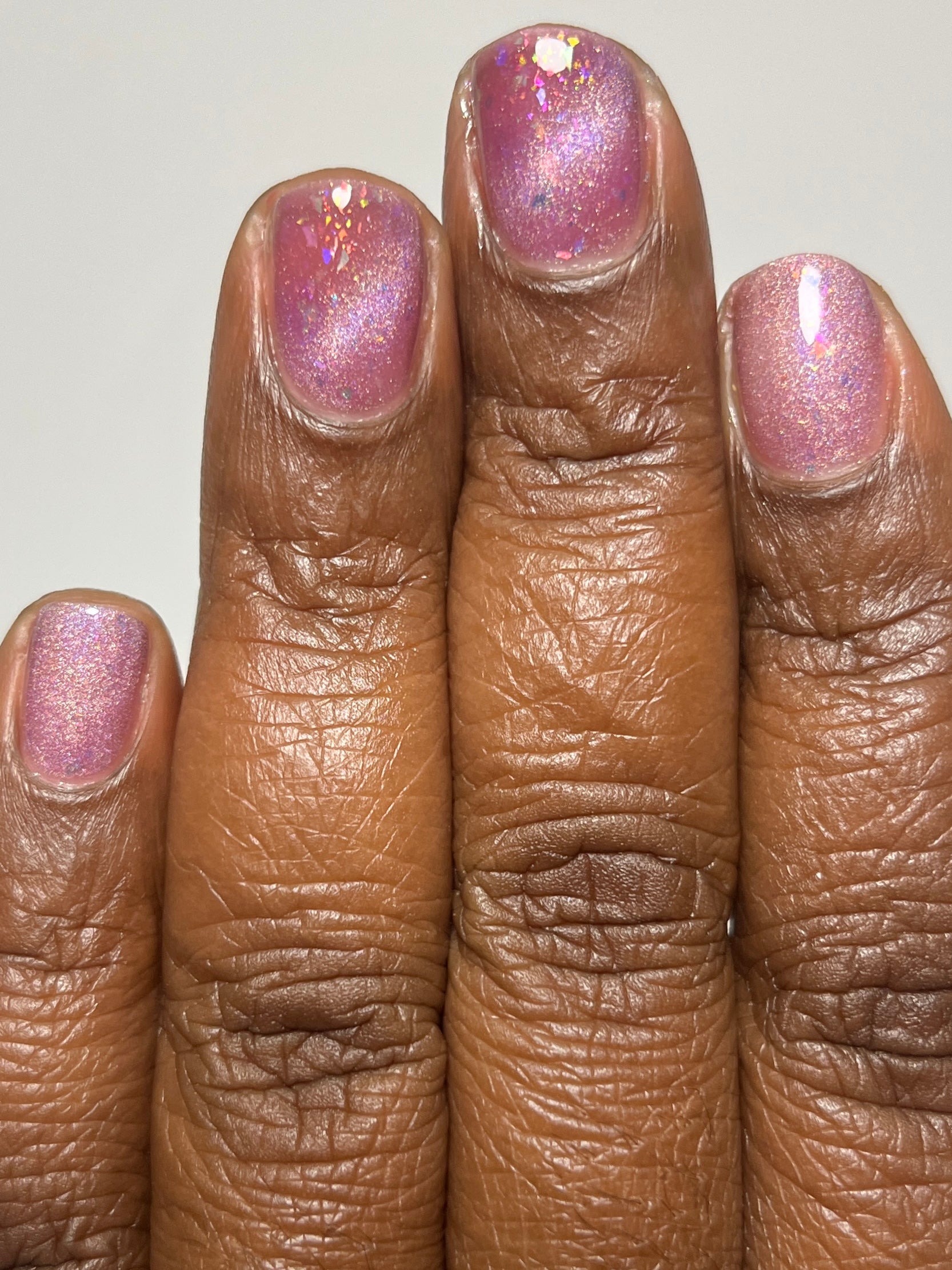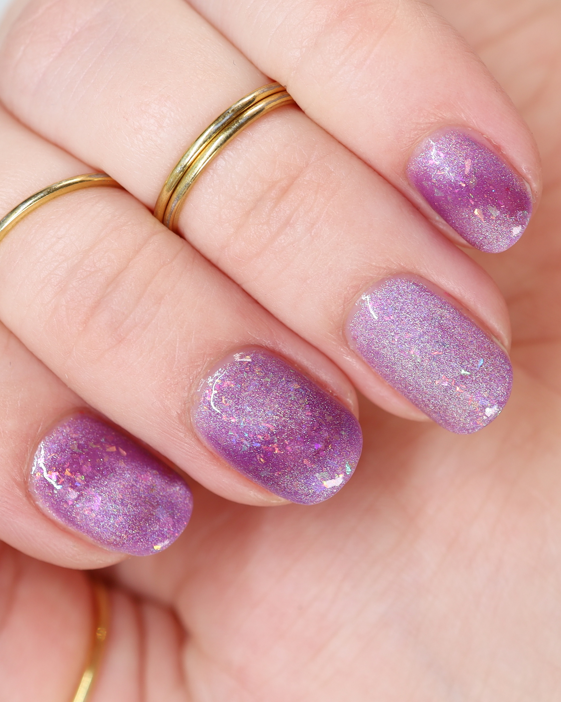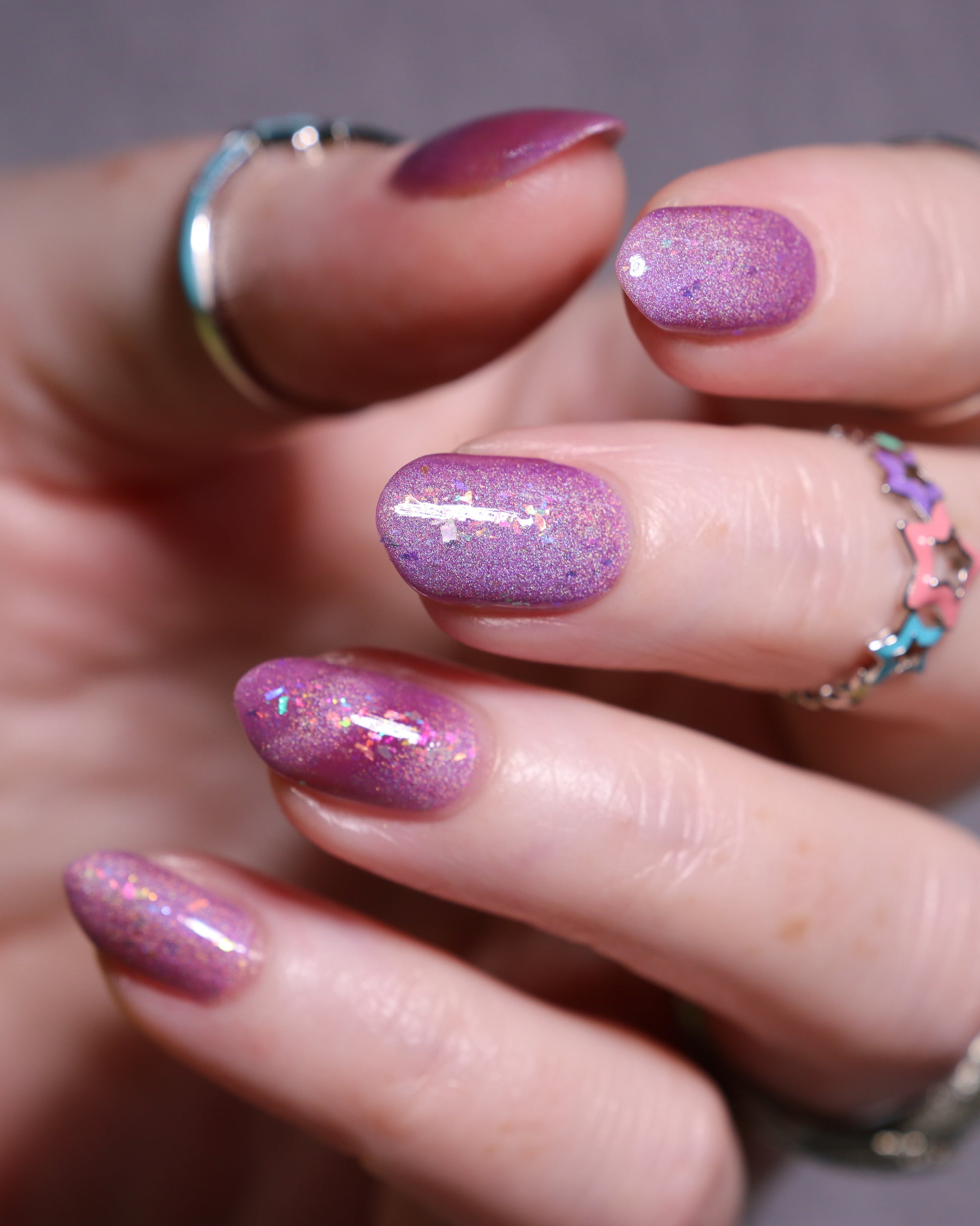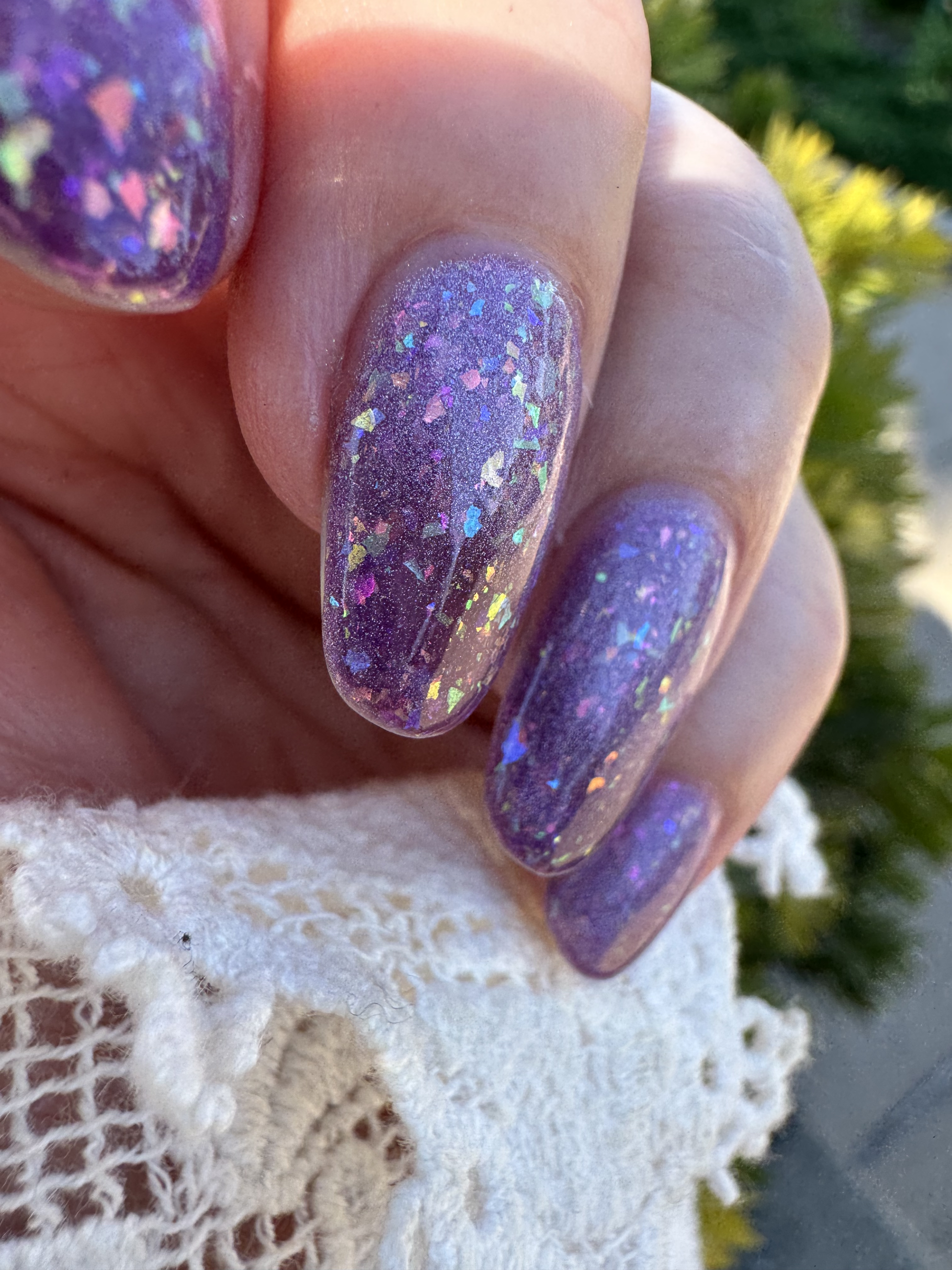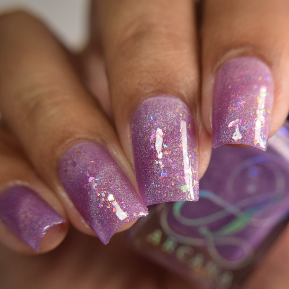 Mysticorn is a light lilac base with red/orange, orange/yellow, yellow/green, green/blue, pink, pink/purple, and silver flakes and holographic magnetic pigment.