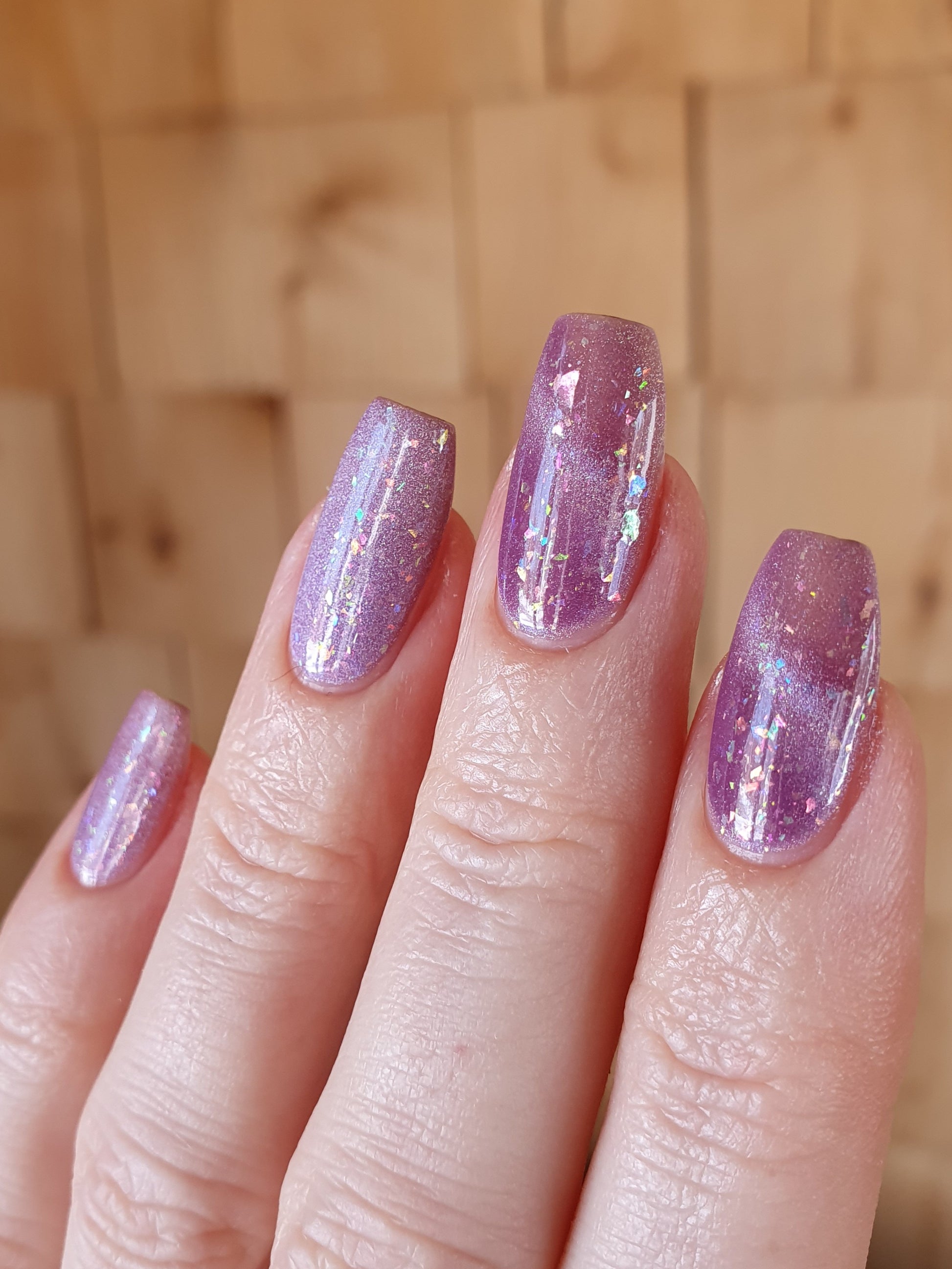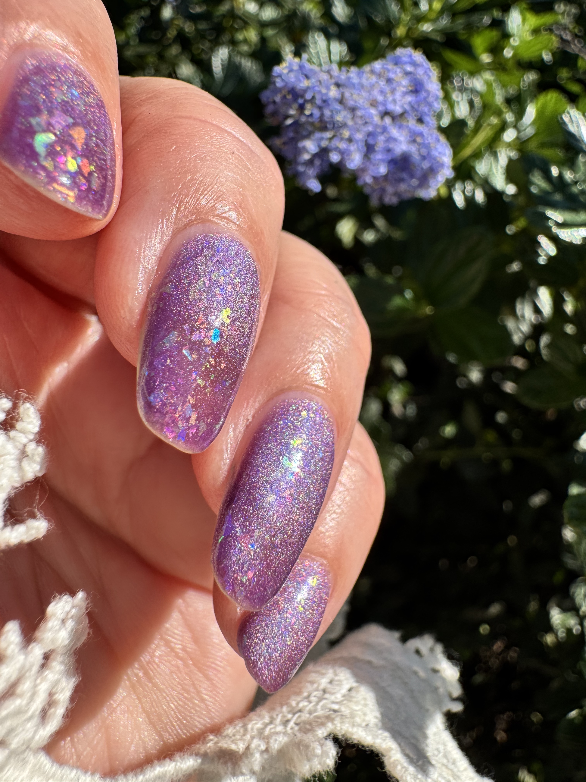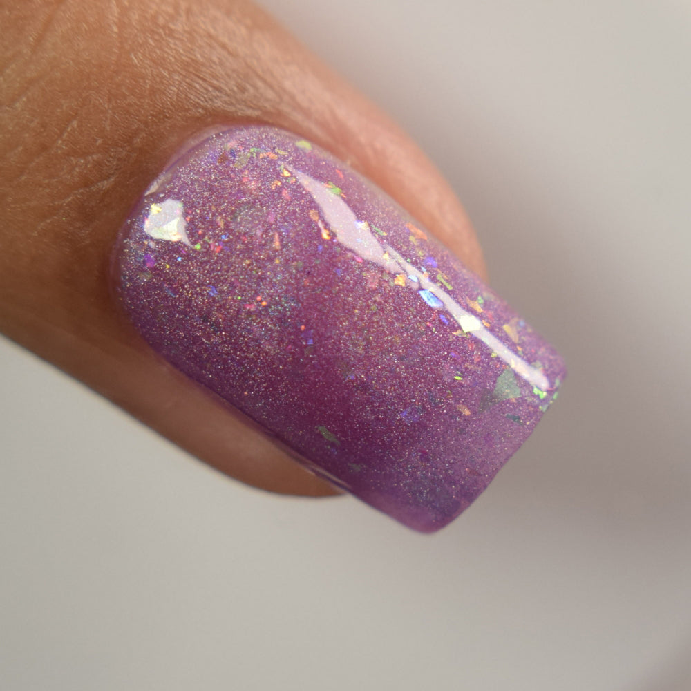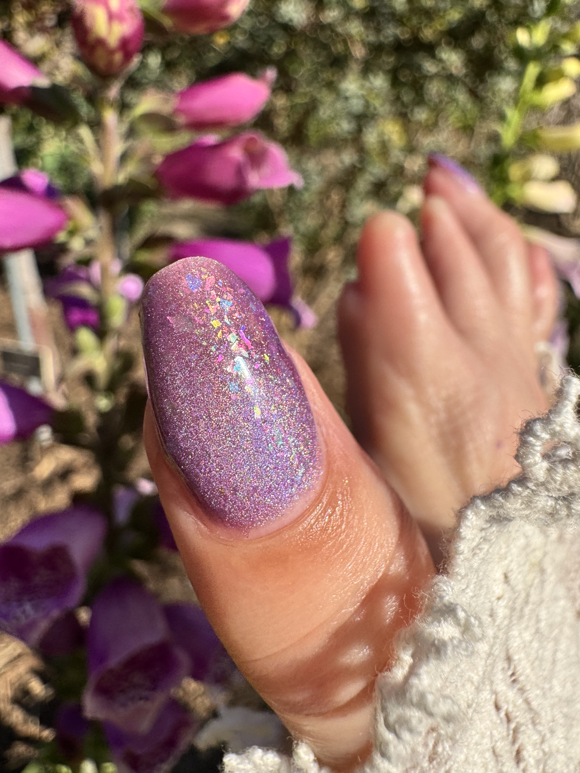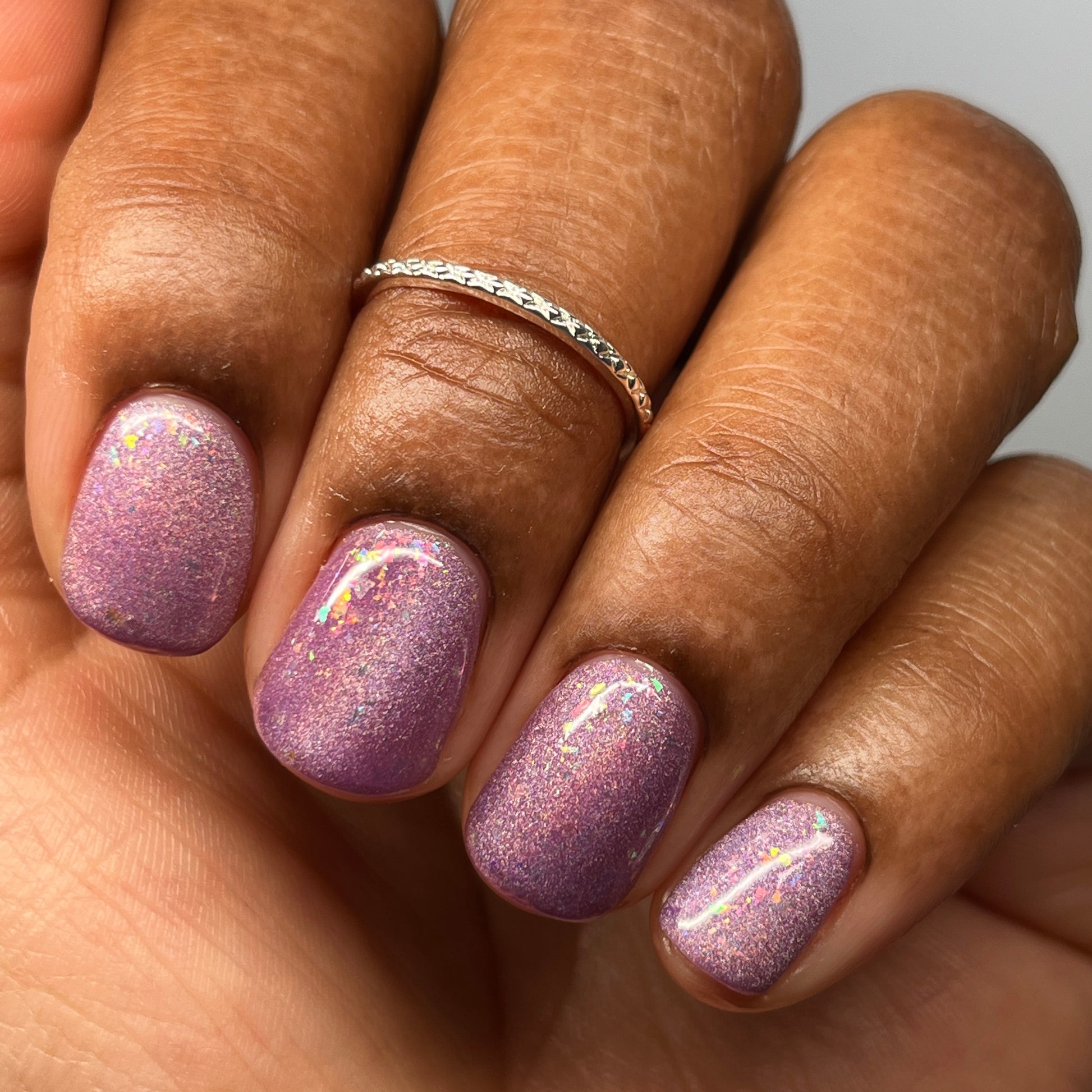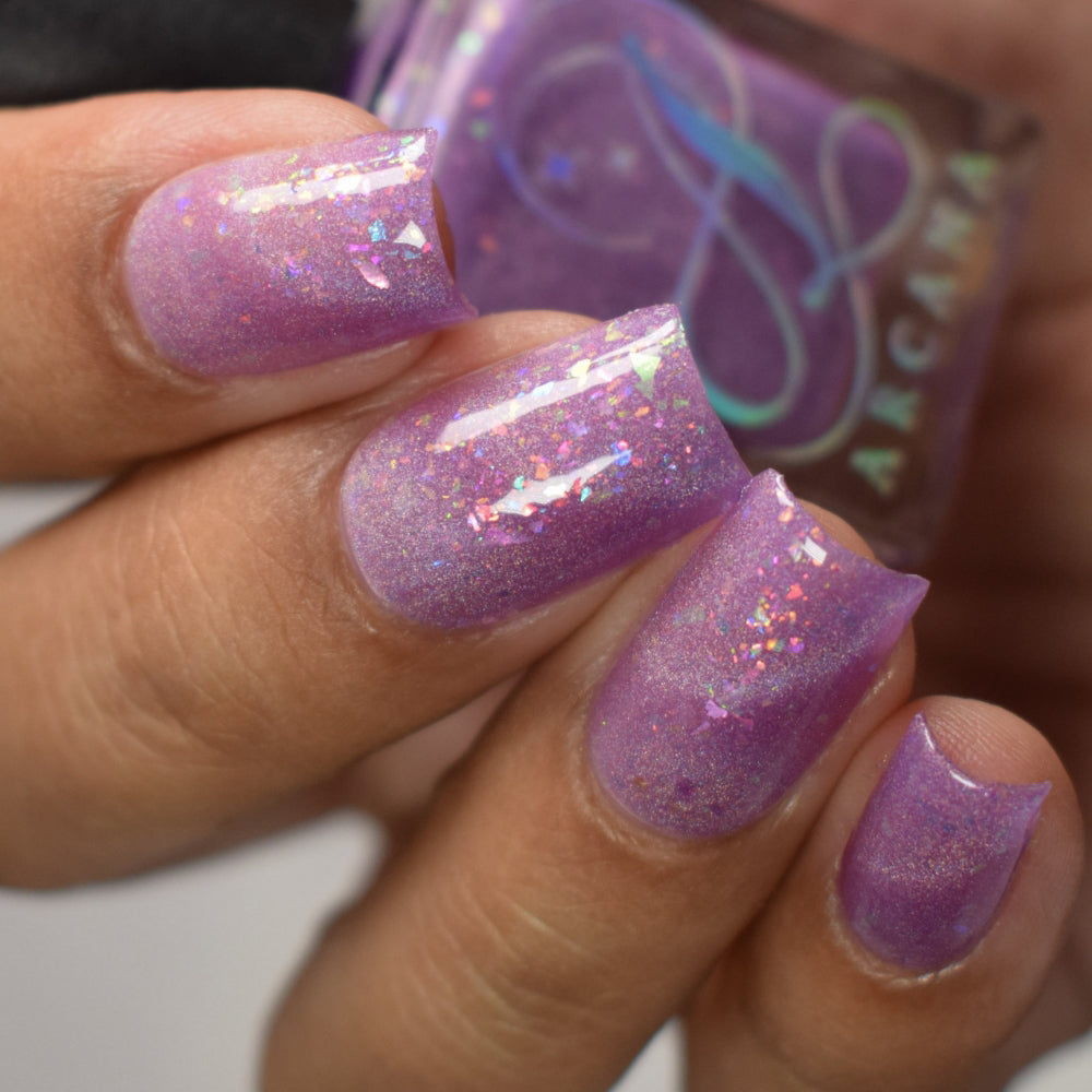 Mysticorn is a light lilac base with red/orange, orange/yellow, yellow/green, green/blue, pink, pink/purple, and silver flakes and holographic magnetic pigment.