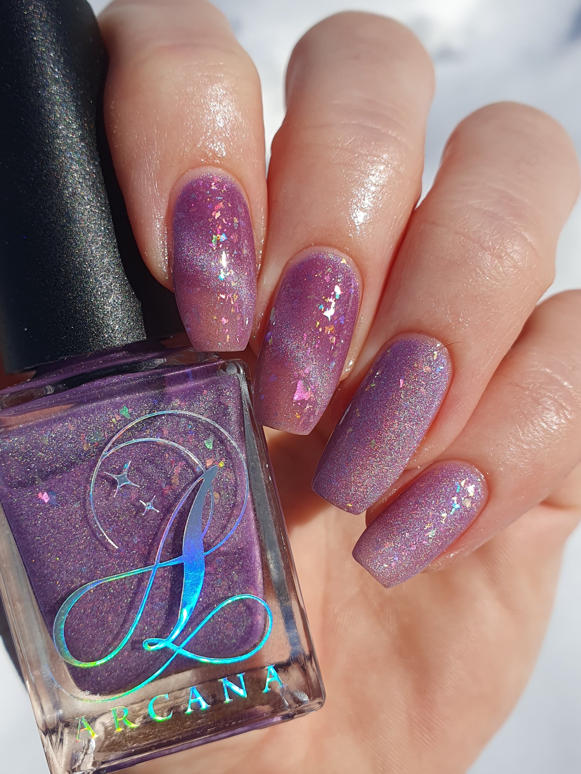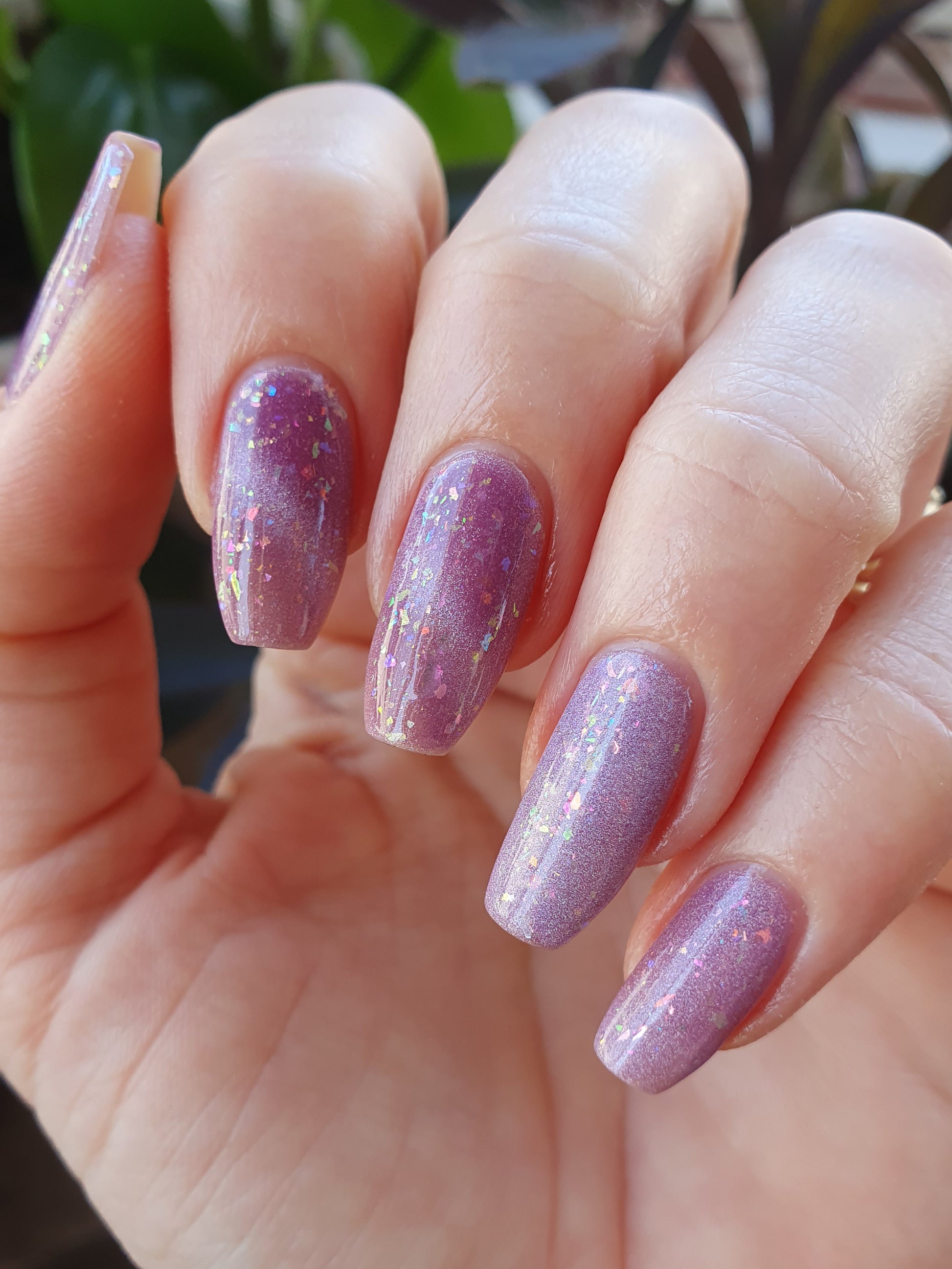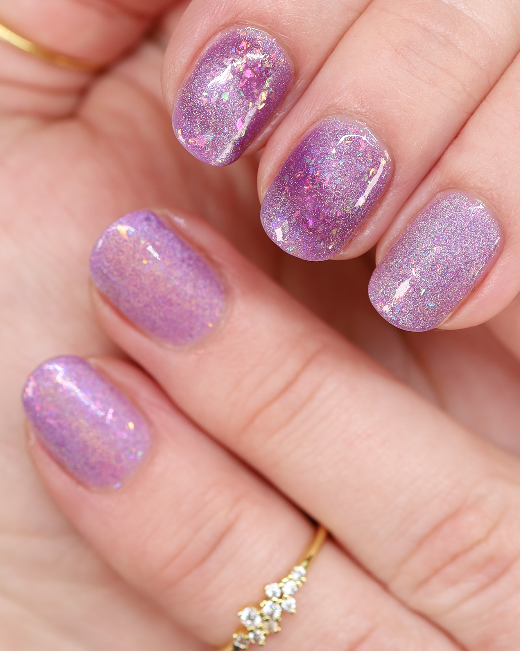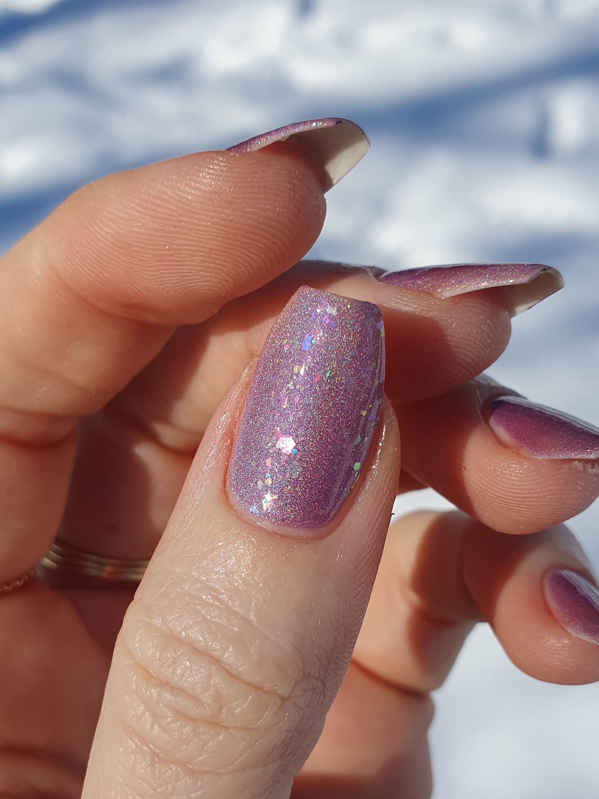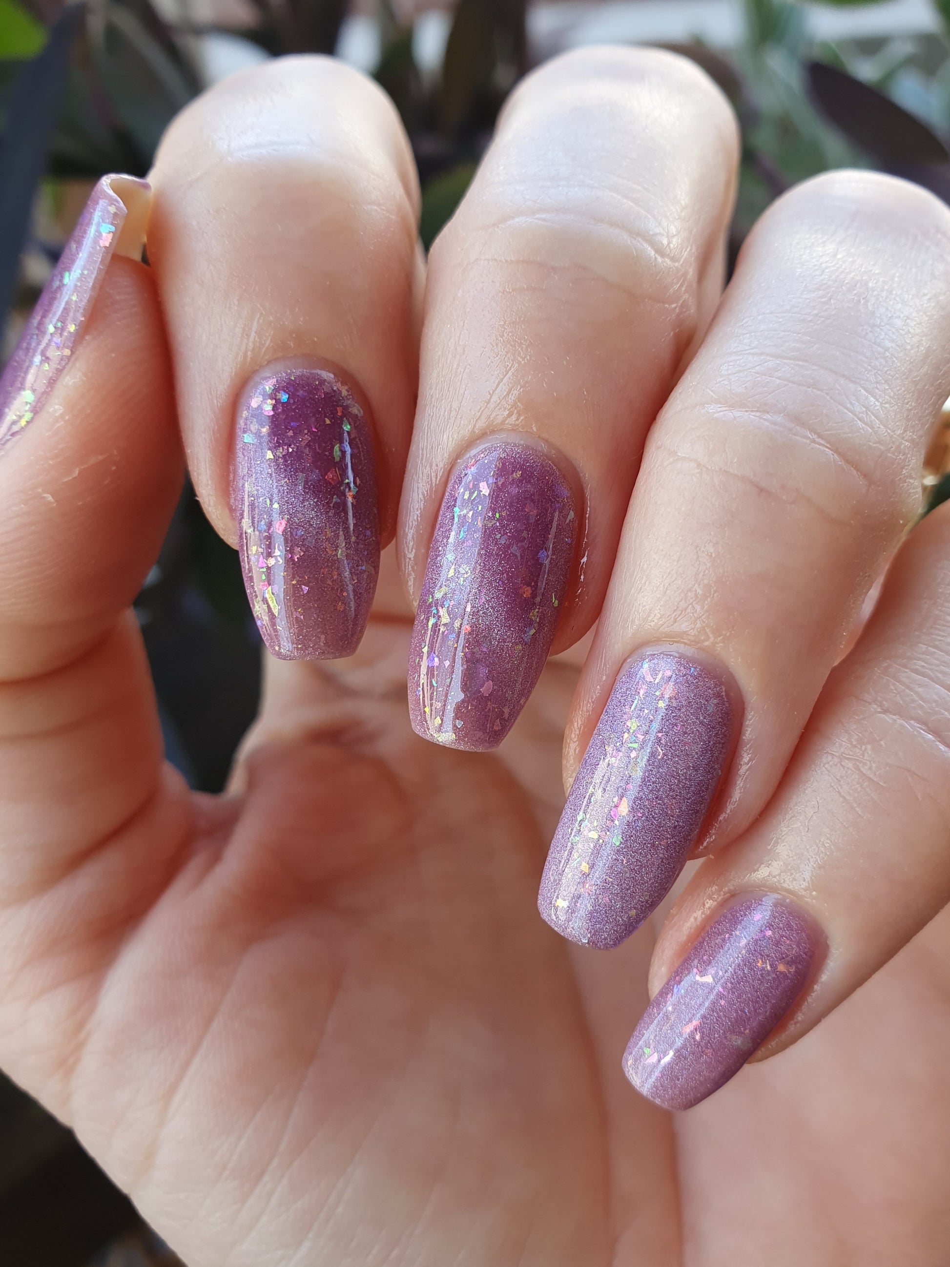 Mysticorn is a light lilac base with red/orange, orange/yellow, yellow/green, green/blue, pink, pink/purple, and silver flakes and holographic magnetic pigment.