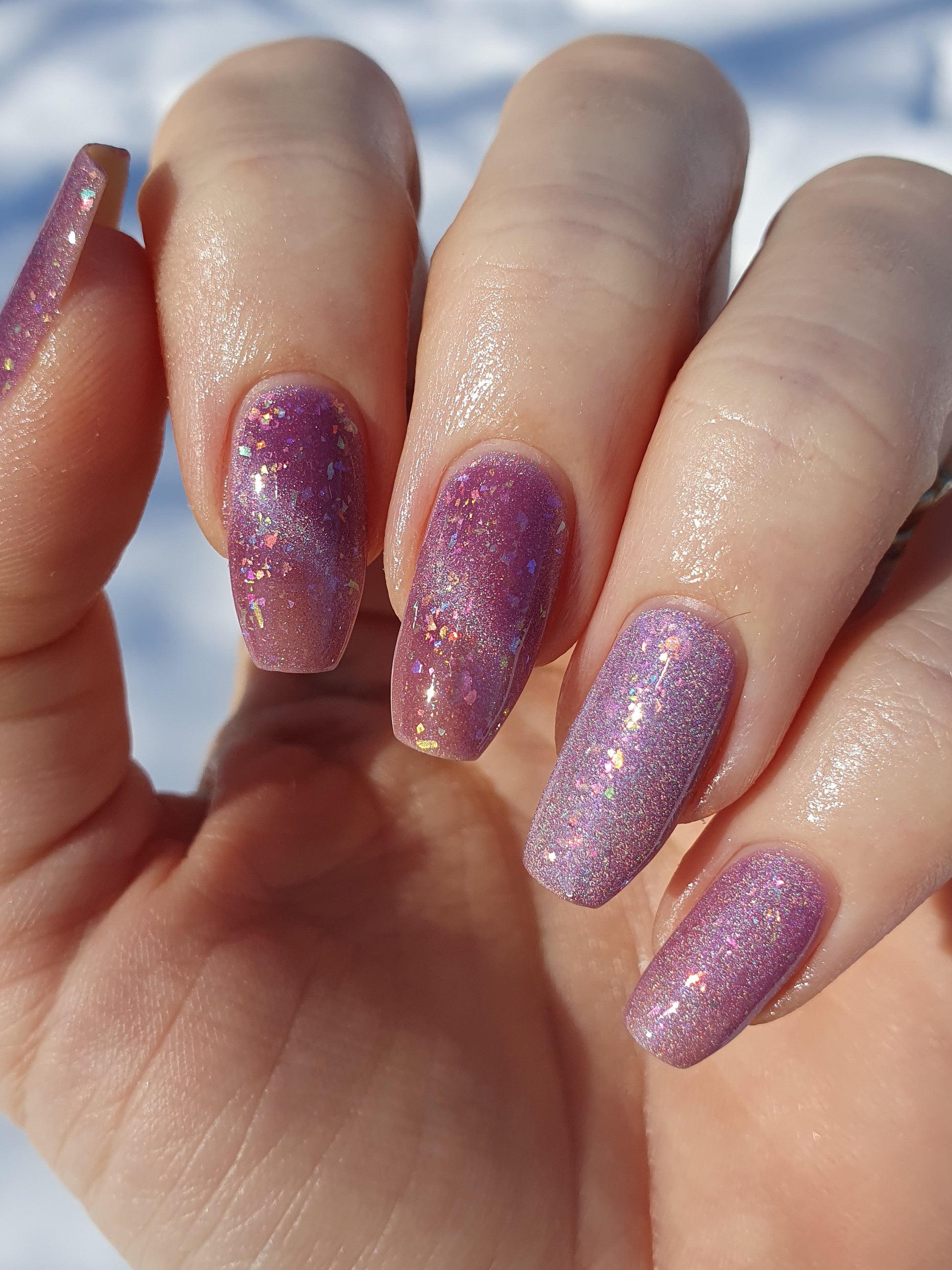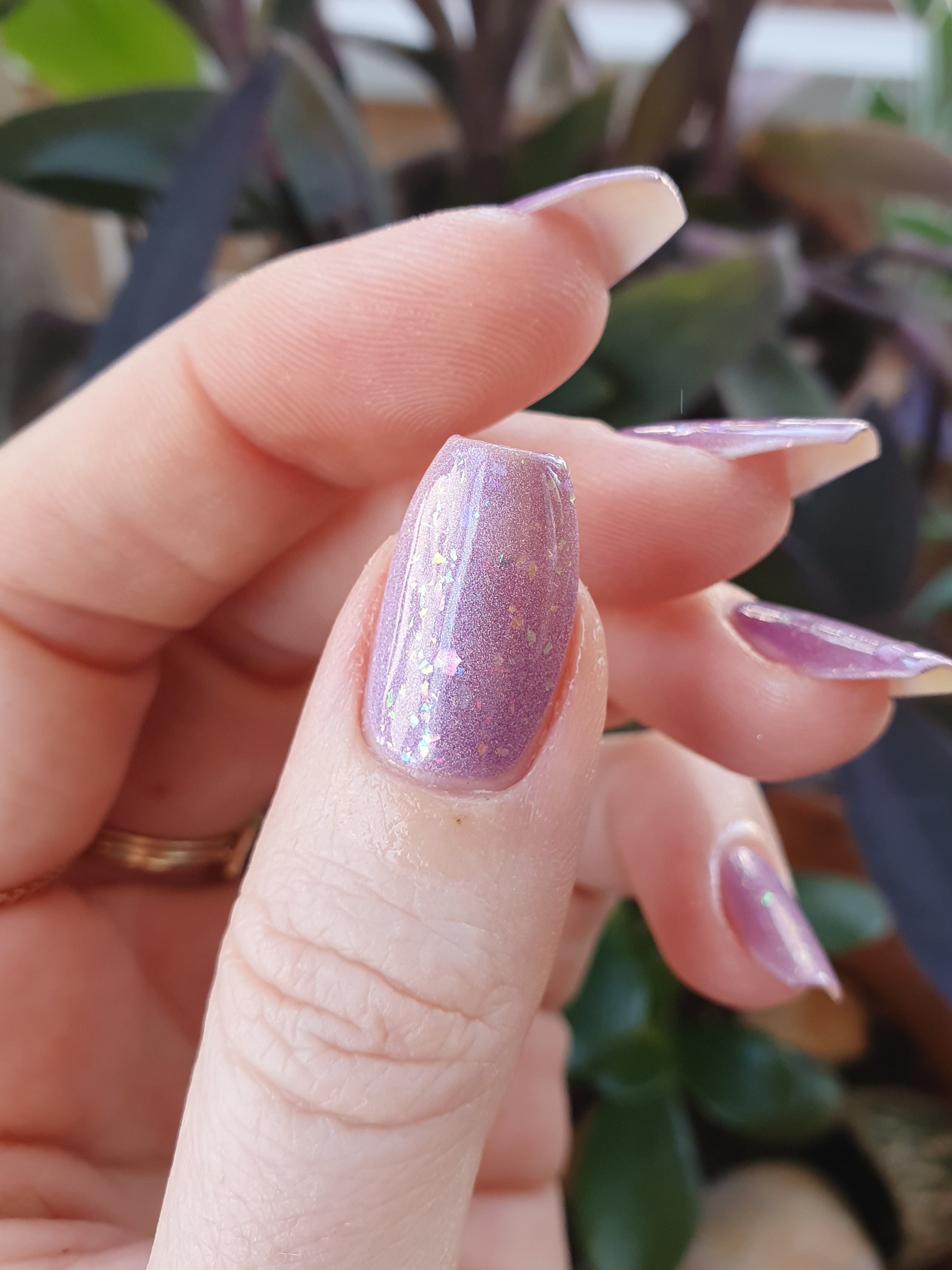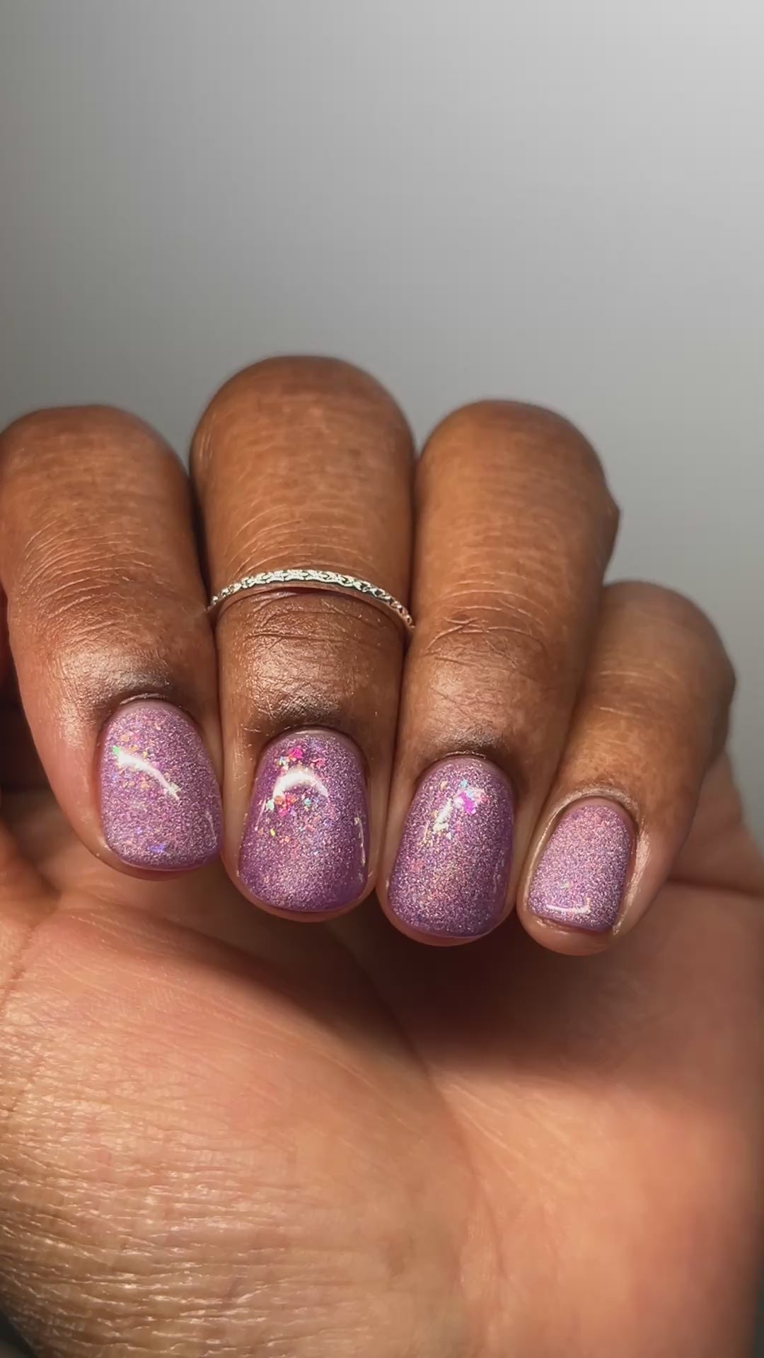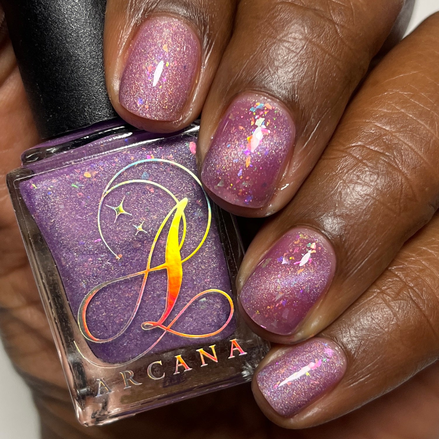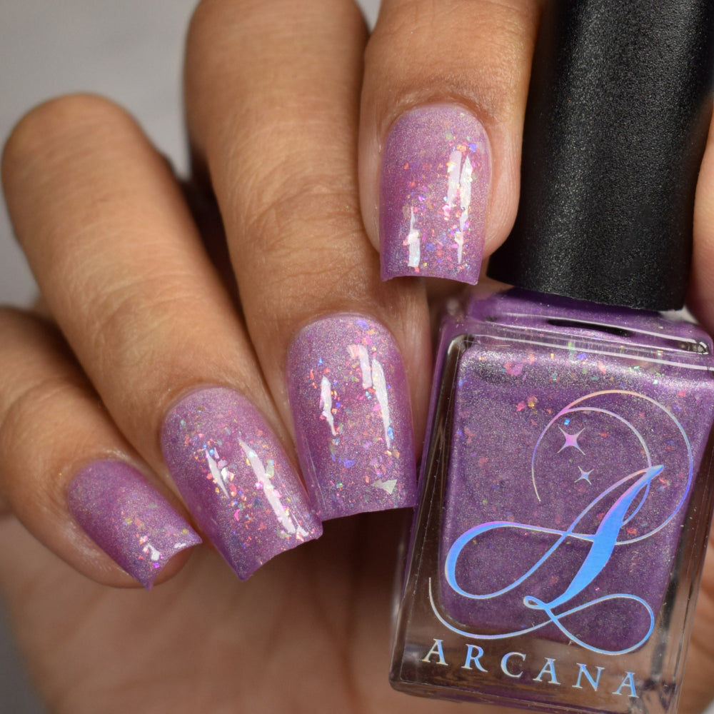 Mysticorn is a light lilac base with red/orange, orange/yellow, yellow/green, green/blue, pink, pink/purple, and silver flakes and holographic magnetic pigment.