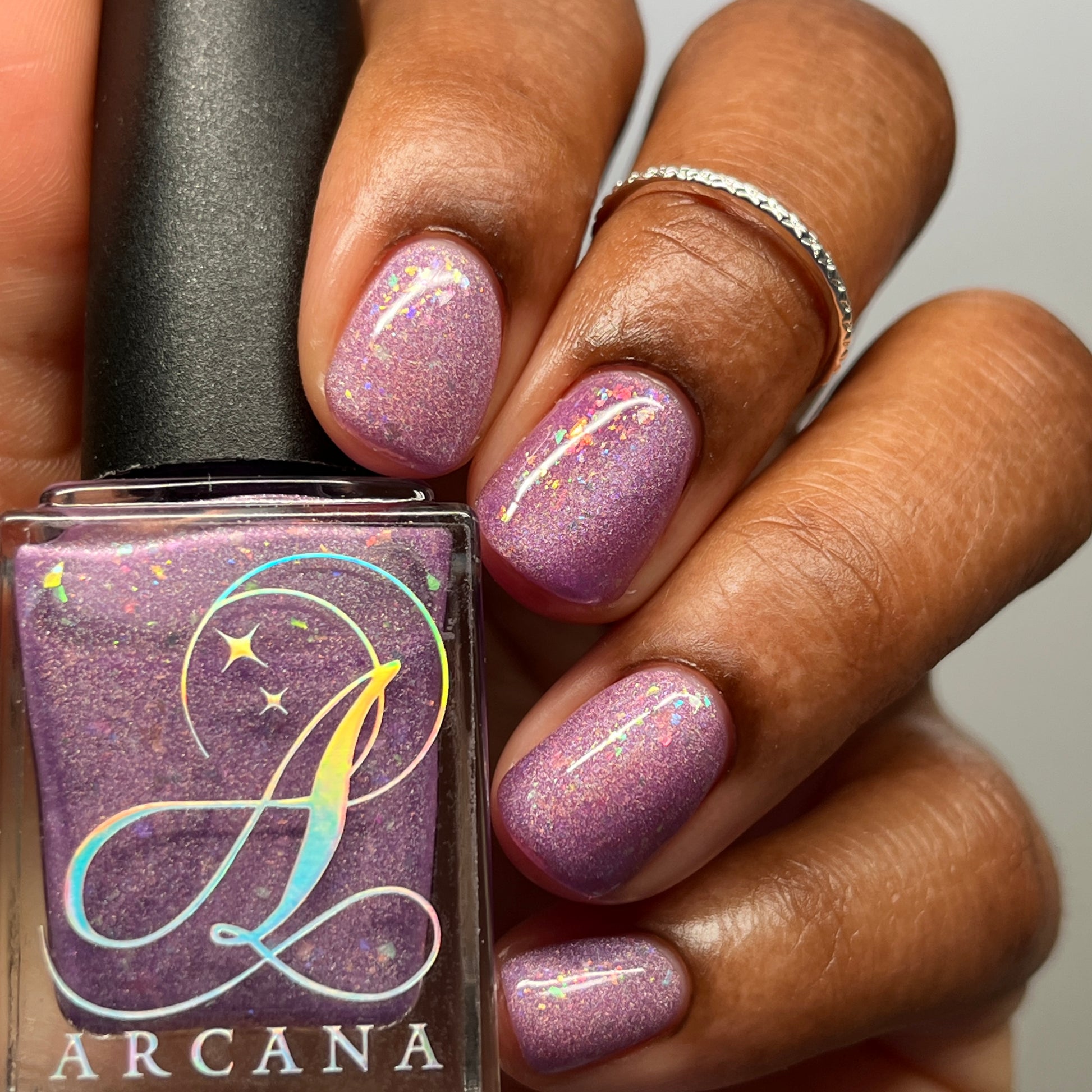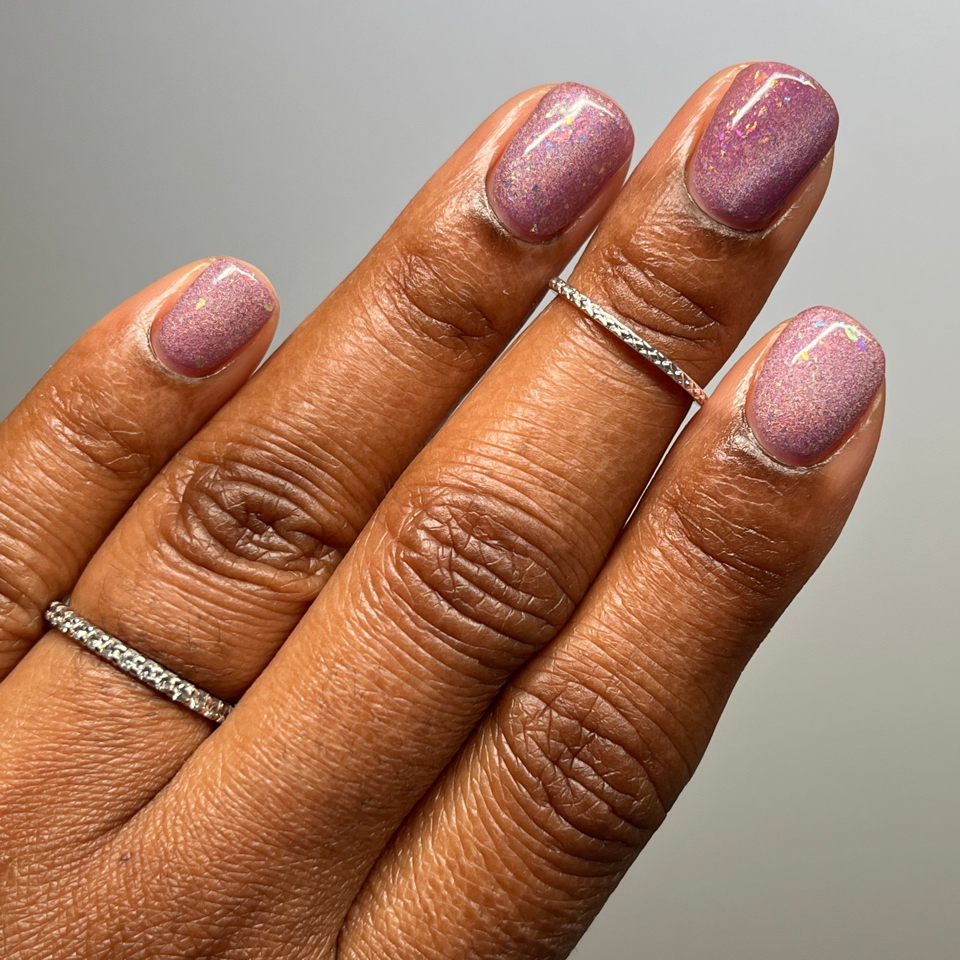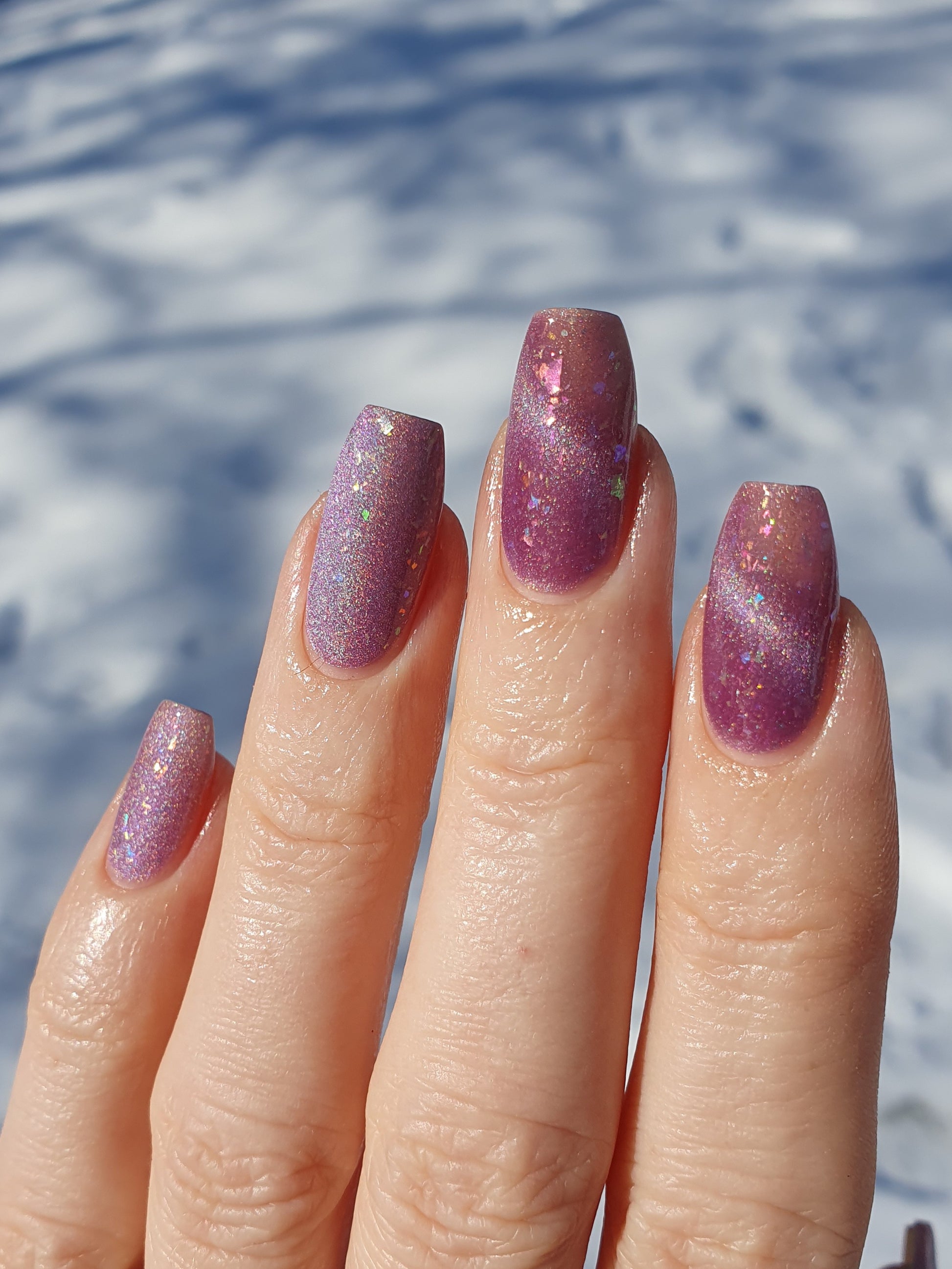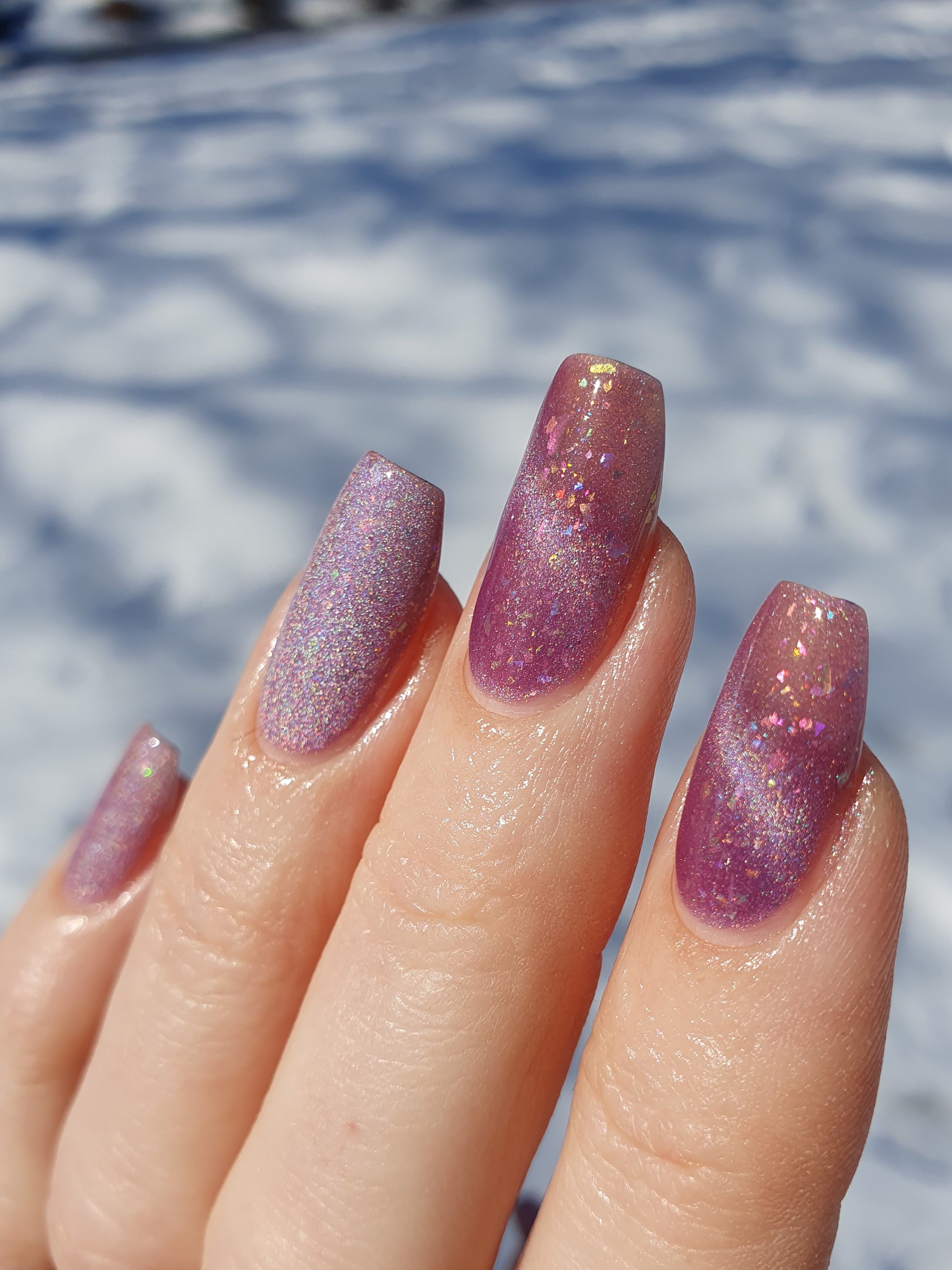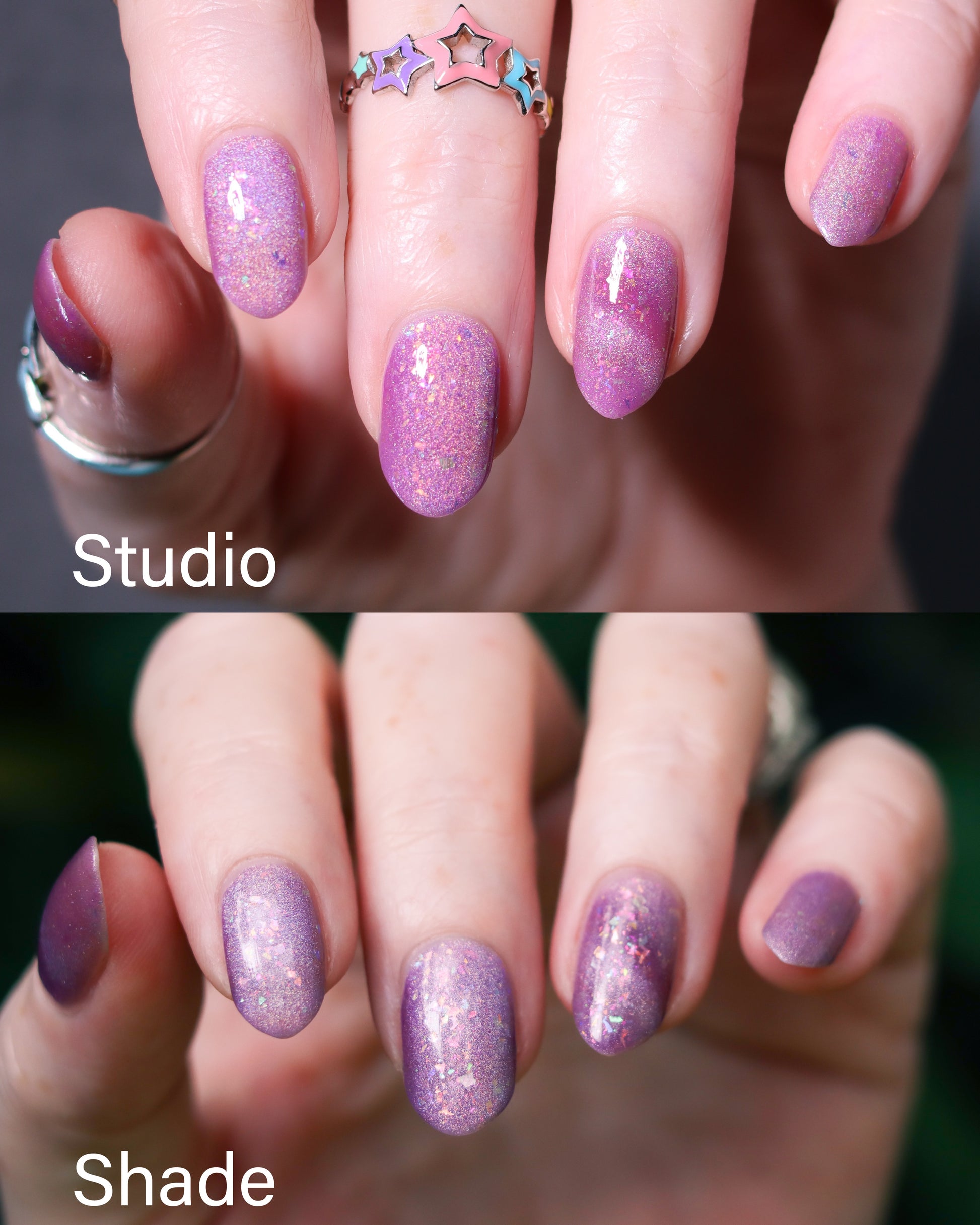Mysticorn is a light lilac base with red/orange, orange/yellow, yellow/green, green/blue, pink, pink/purple, and silver flakes and holographic magnetic pigment.