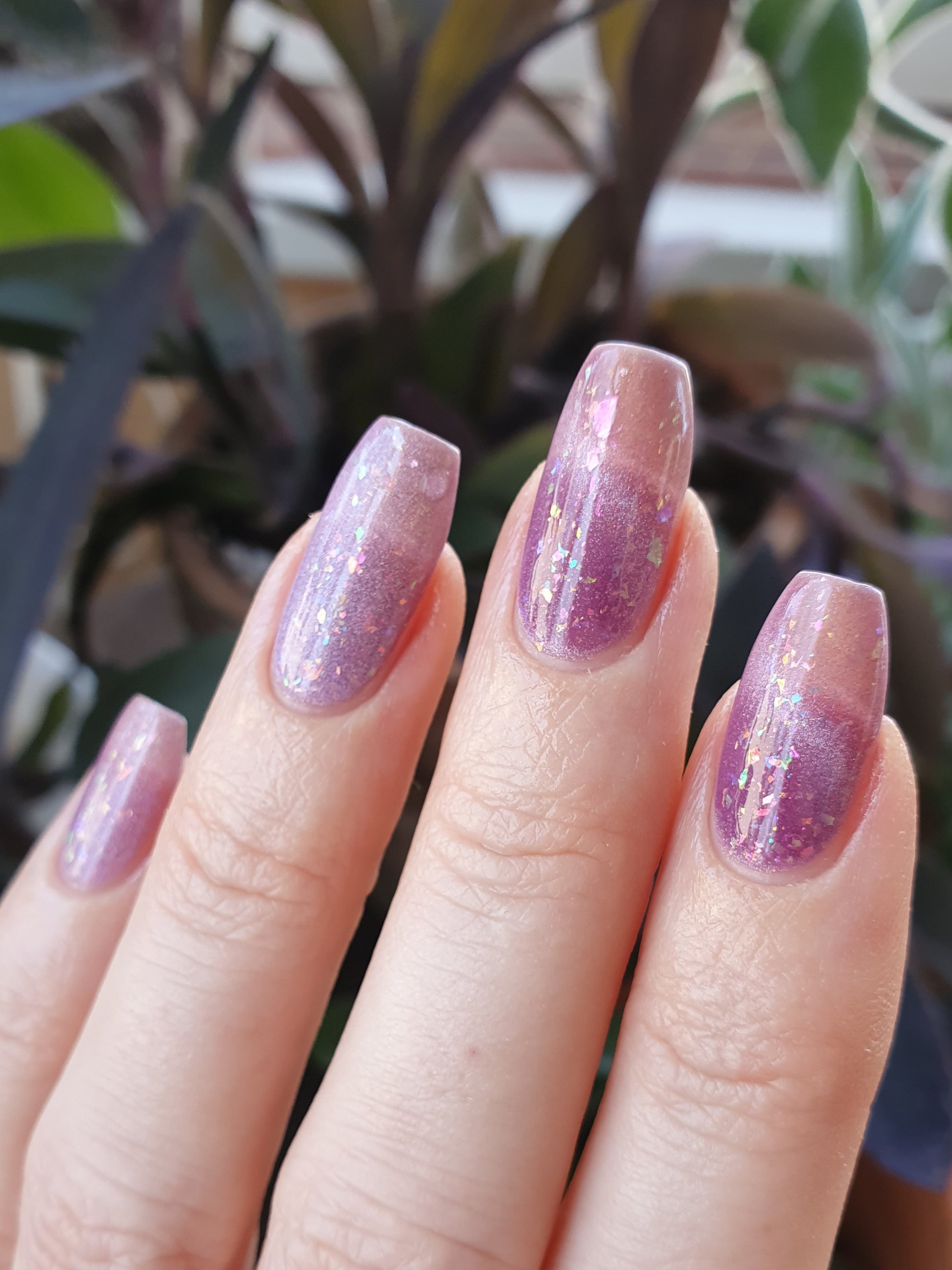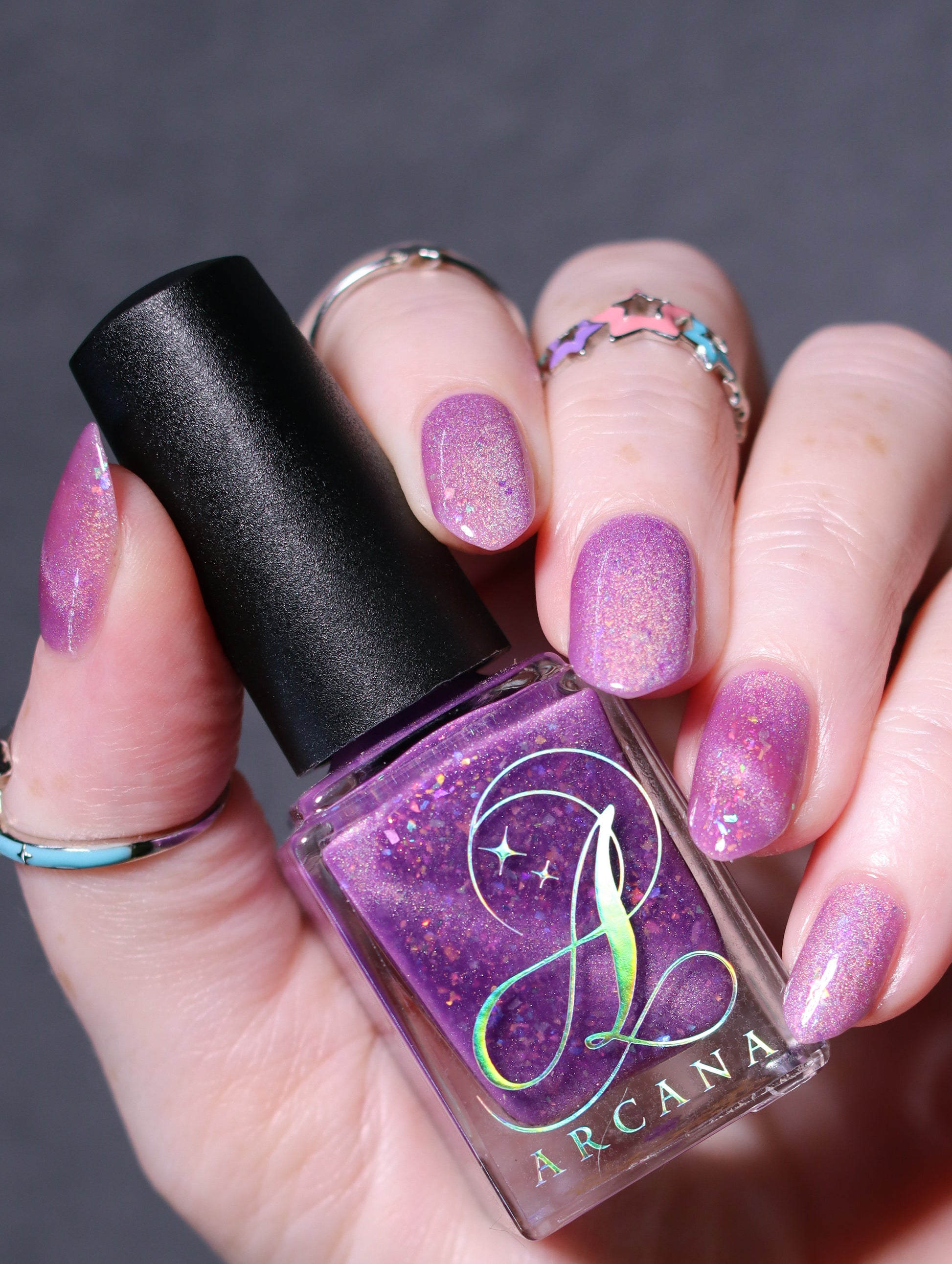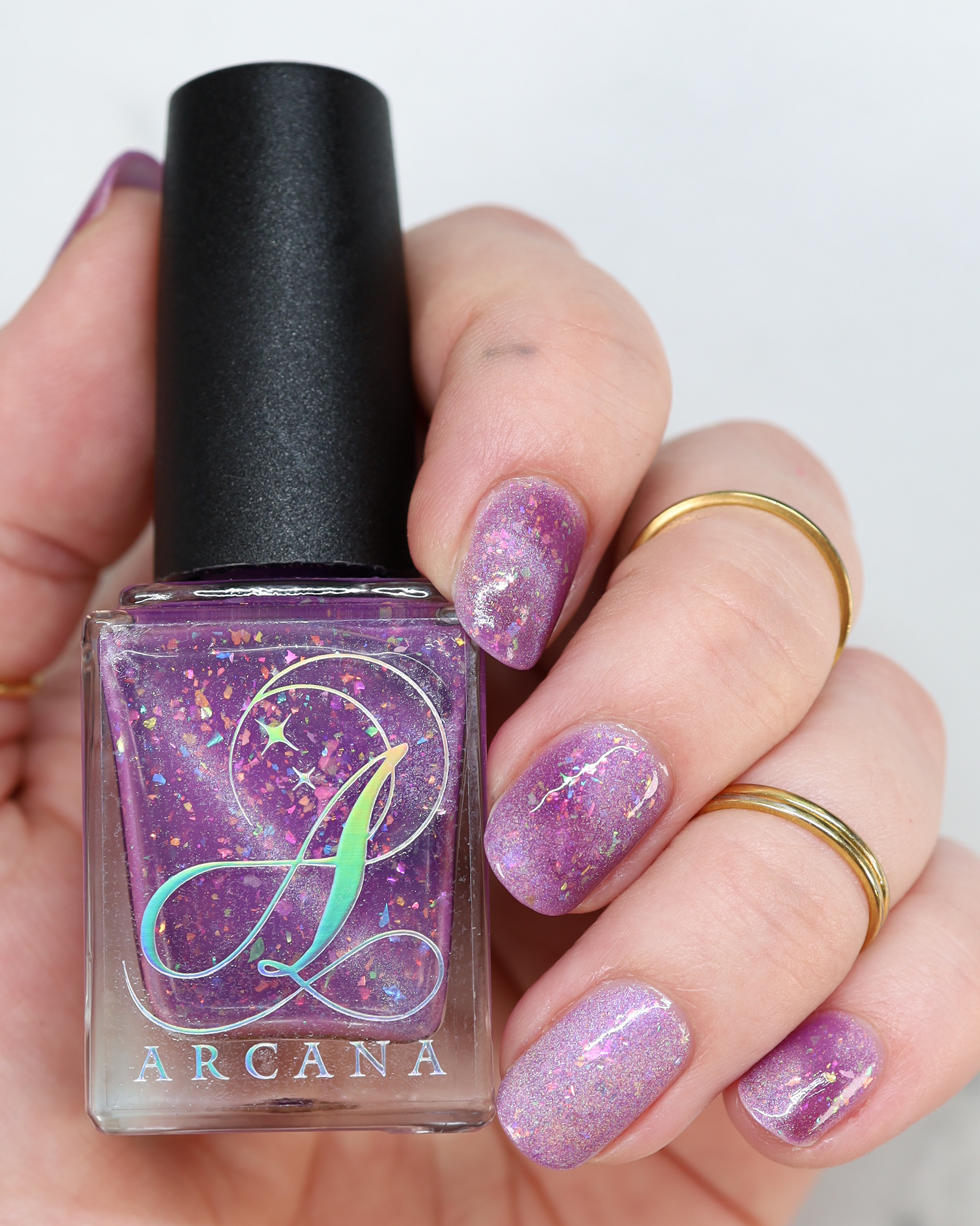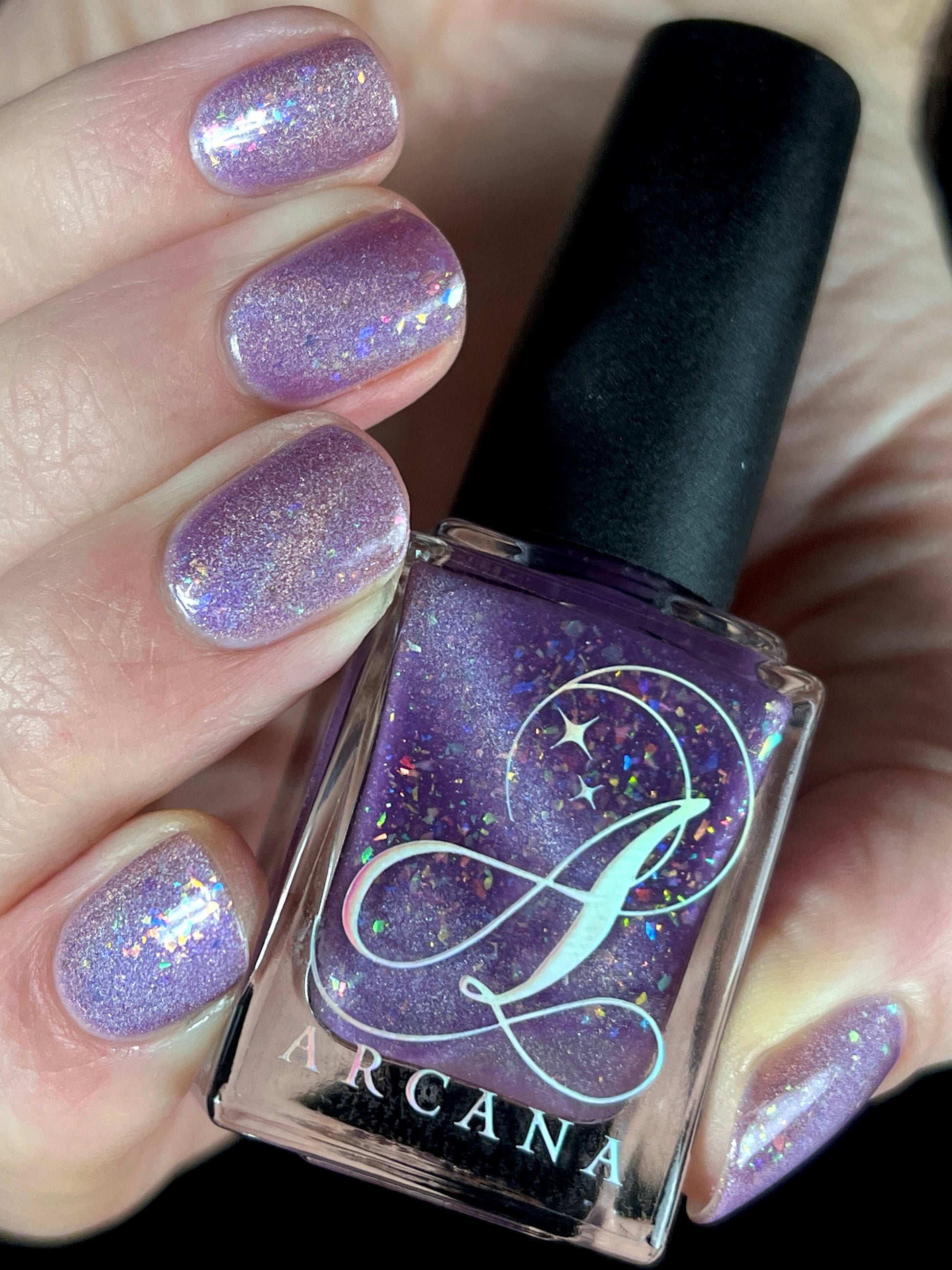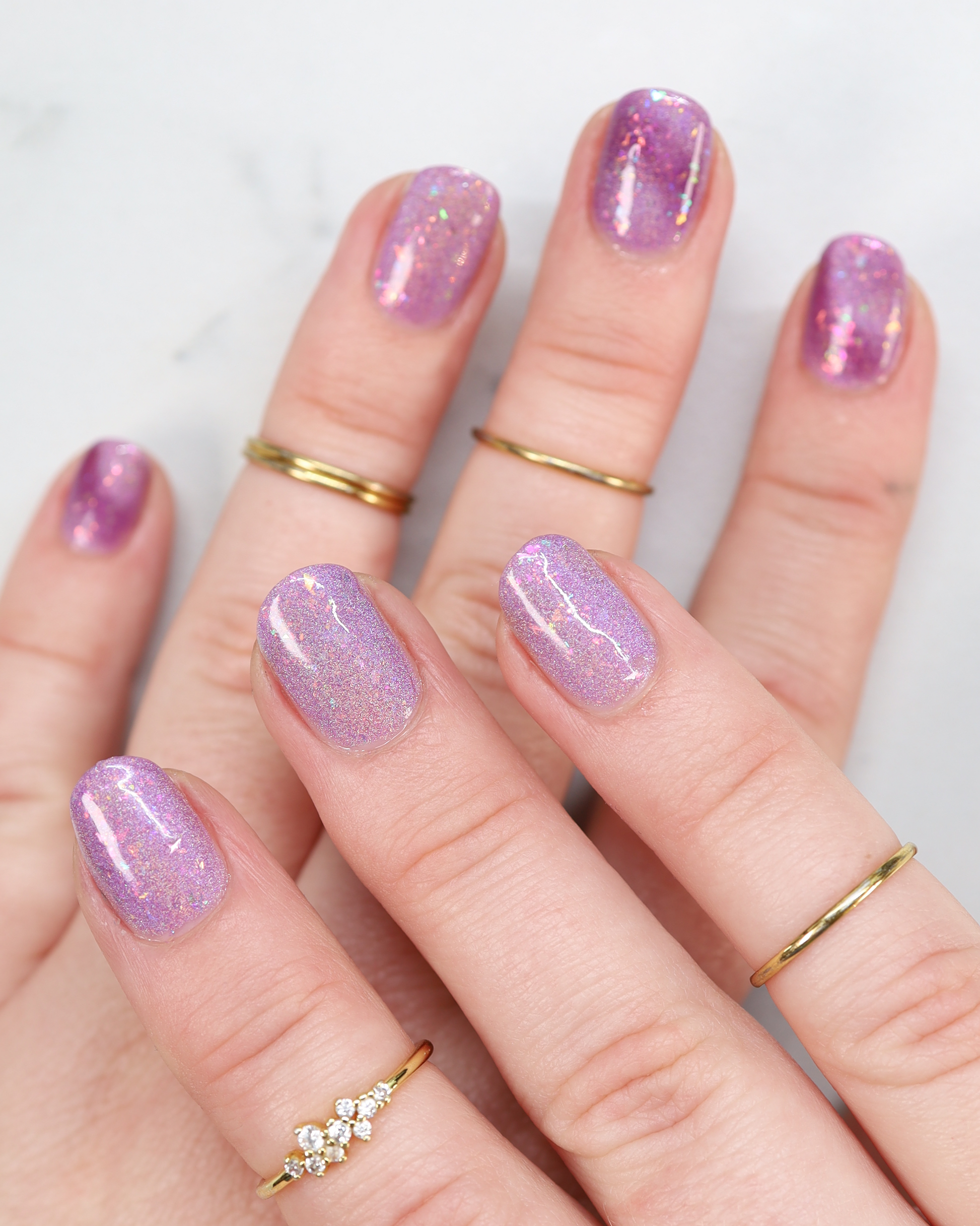 Mysticorn is a light lilac base with red/orange, orange/yellow, yellow/green, green/blue, pink, pink/purple, and silver flakes and holographic magnetic pigment.