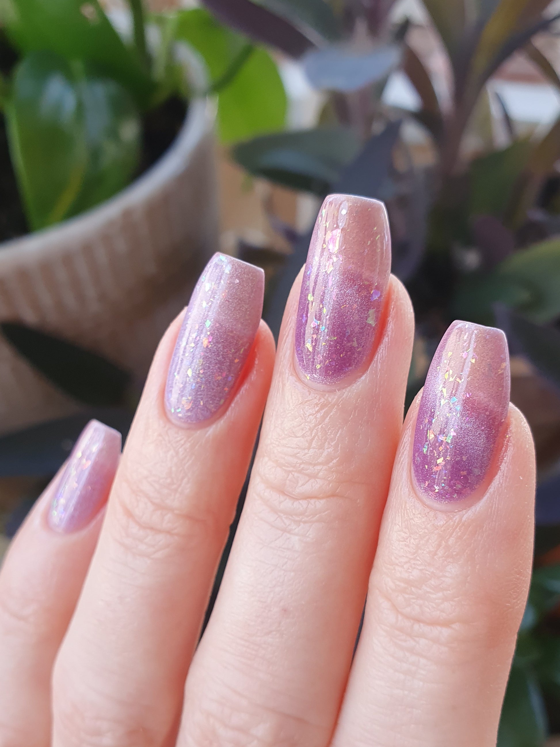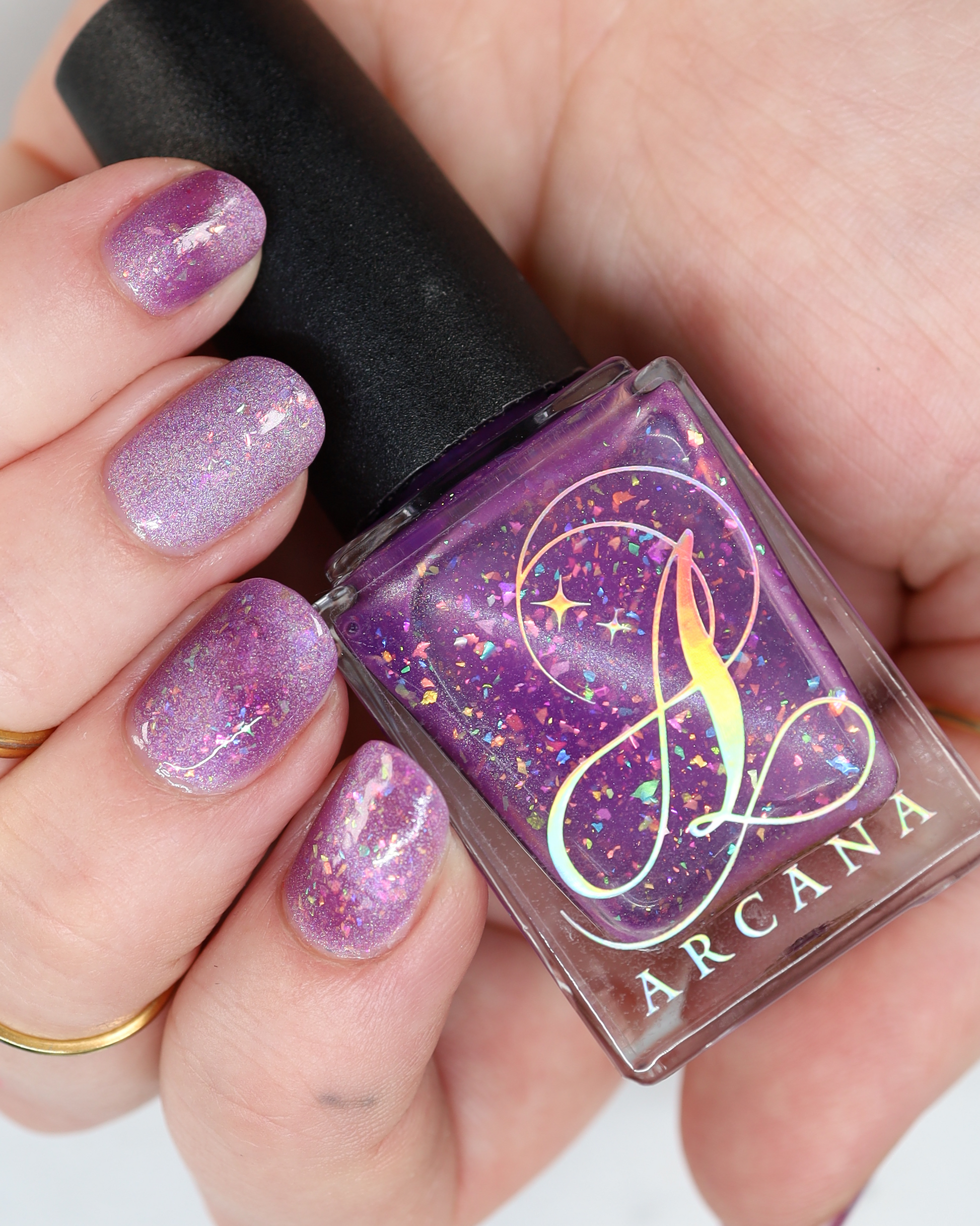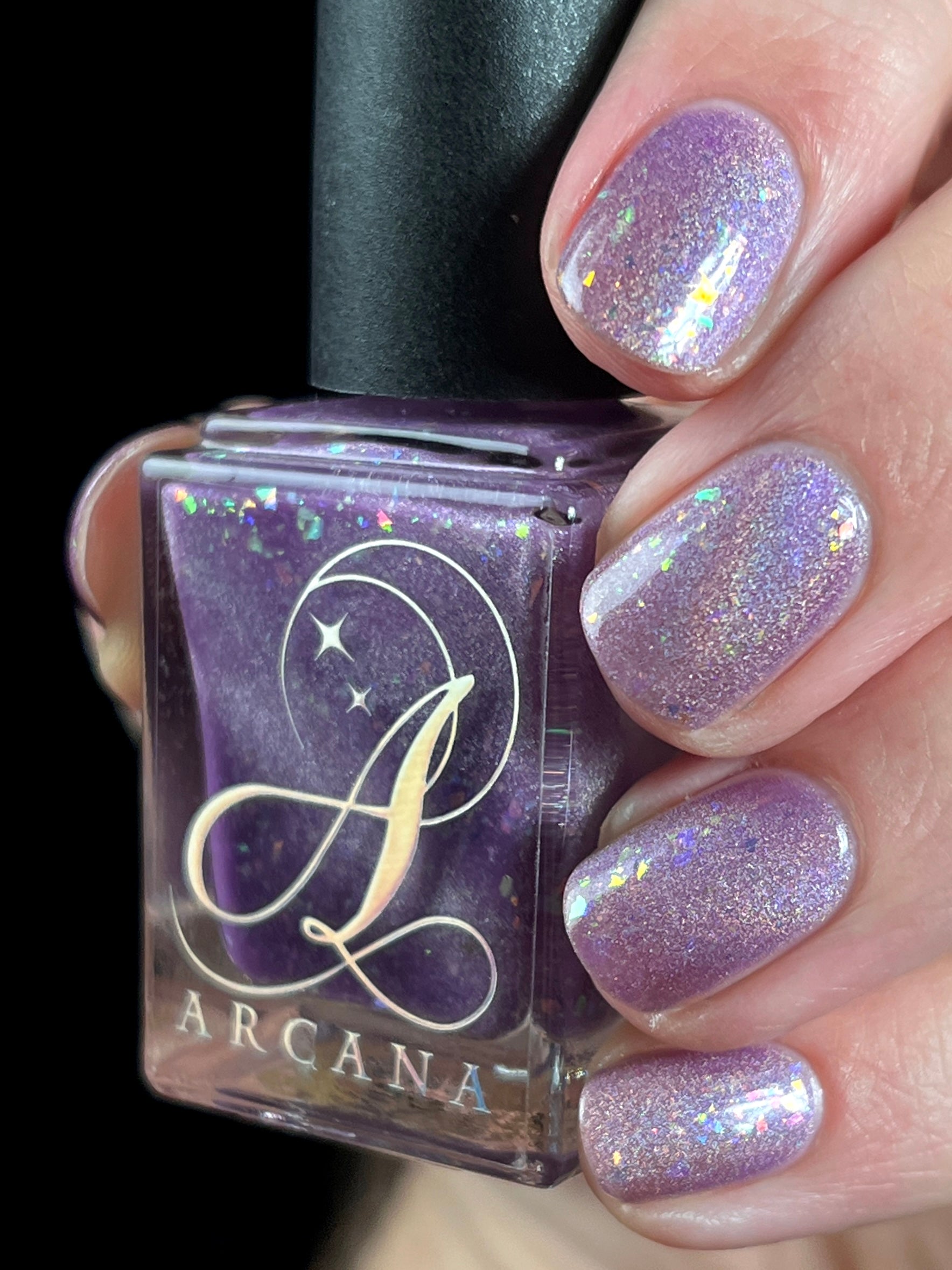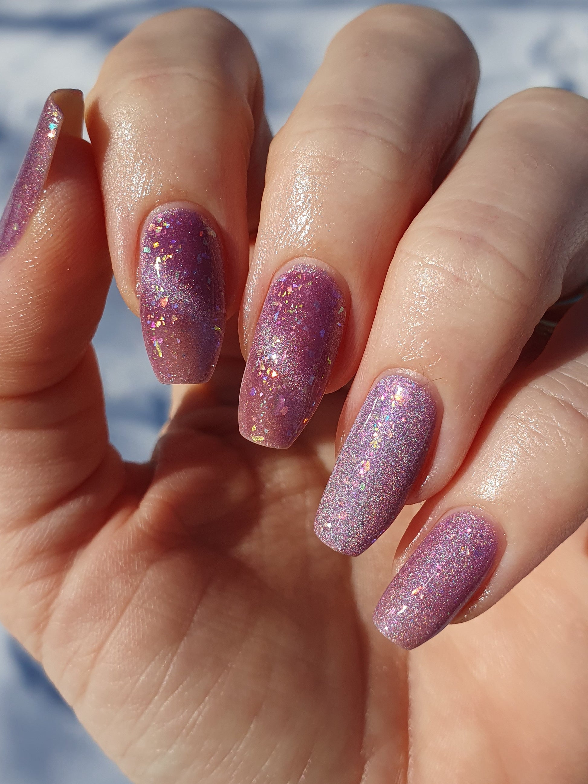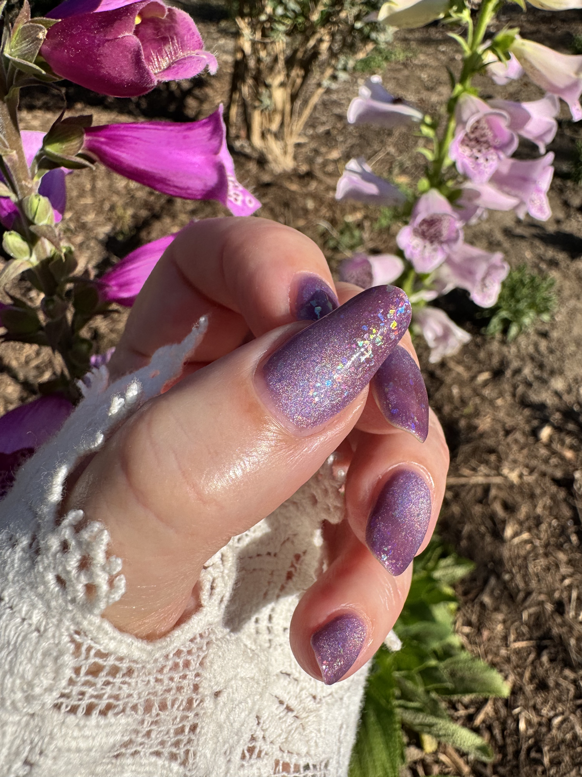 Mysticorn is a light lilac base with red/orange, orange/yellow, yellow/green, green/blue, pink, pink/purple, and silver flakes and holographic magnetic pigment.