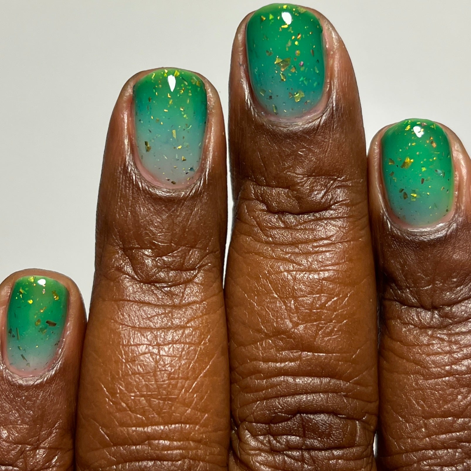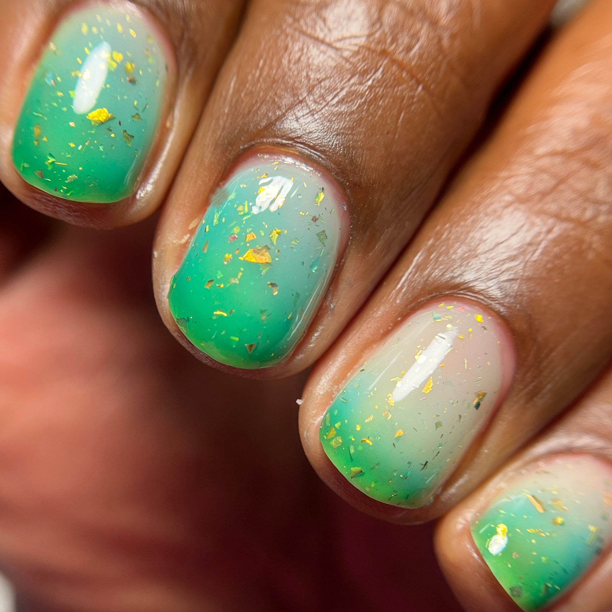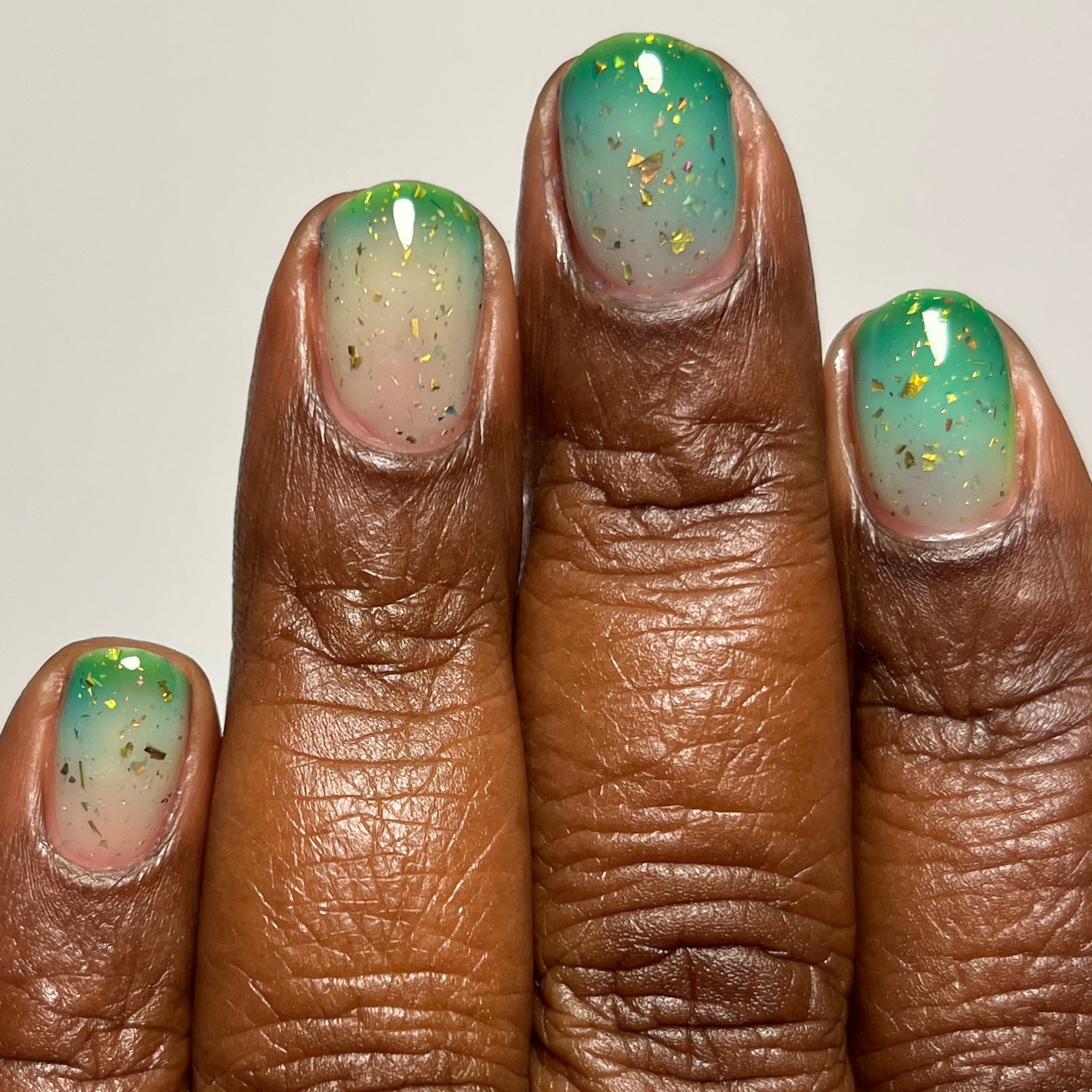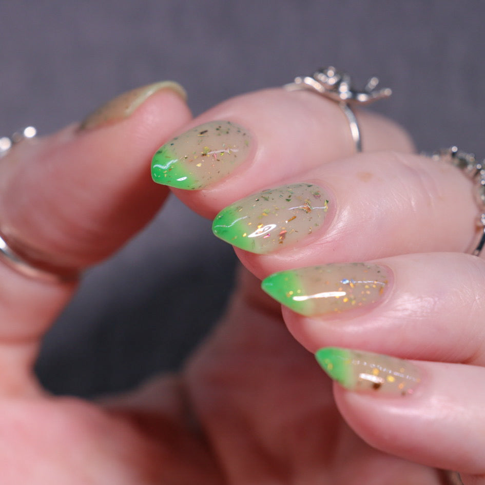 A bright green (cold) to yellow (in-between) to white (warm) tri-thermal with copper to bronze flakes!