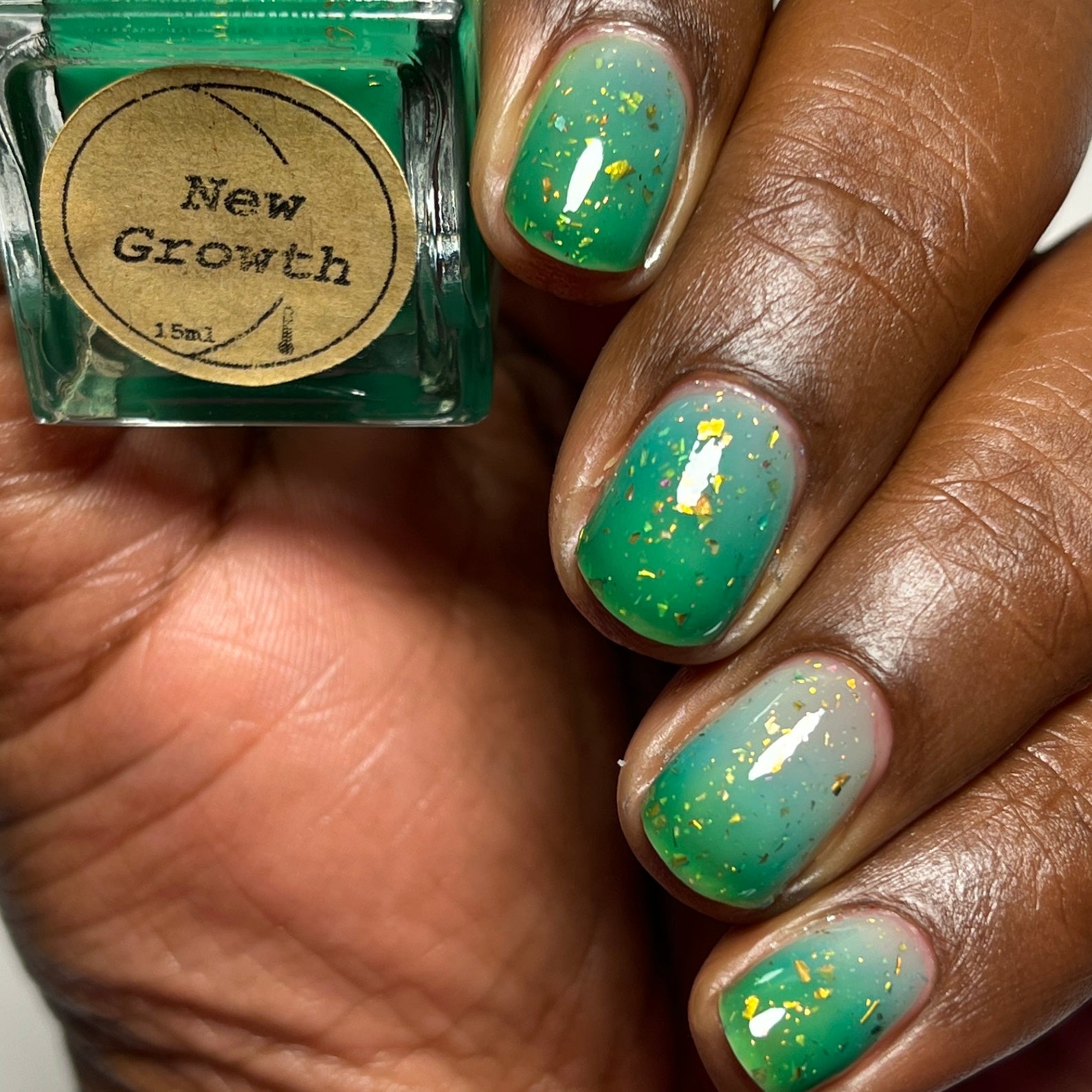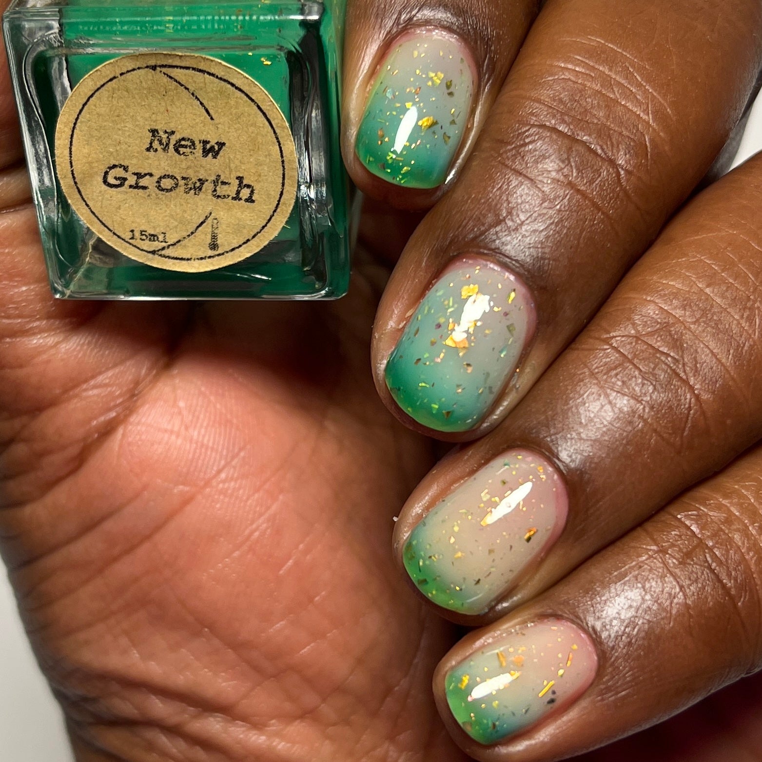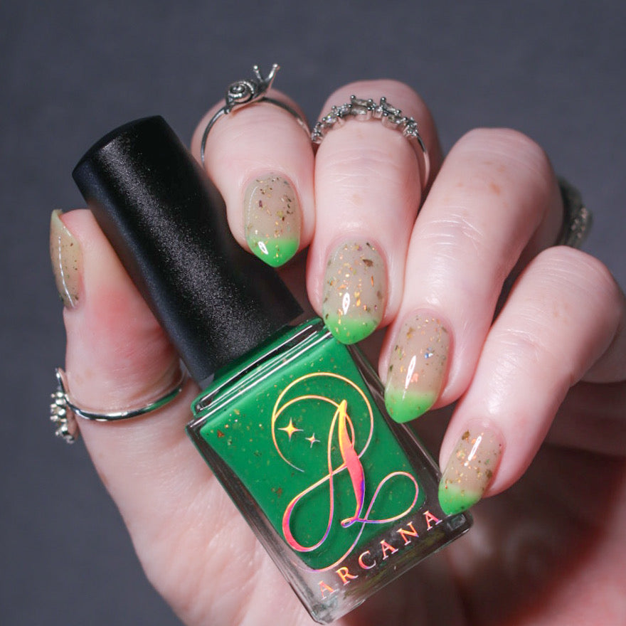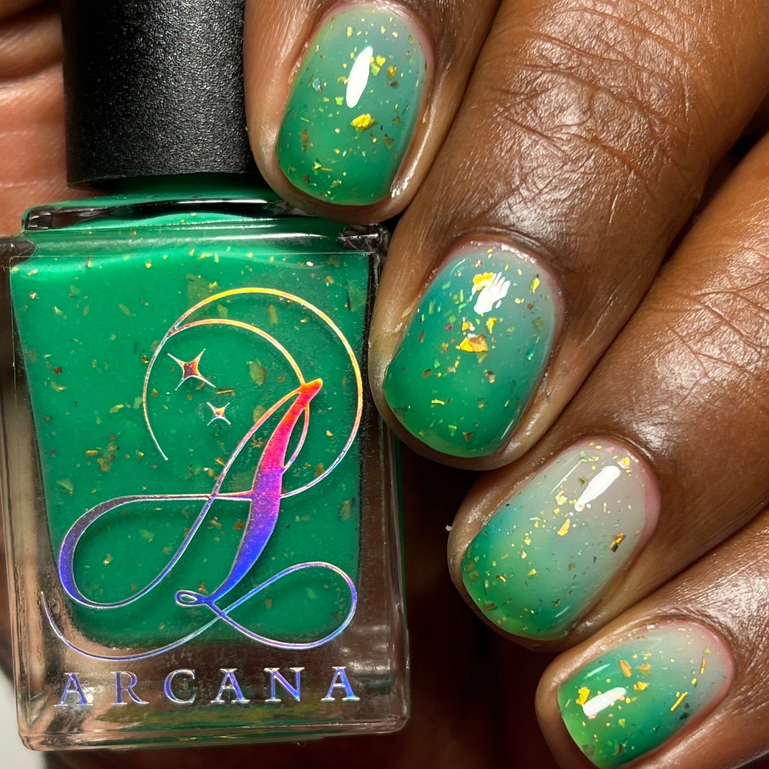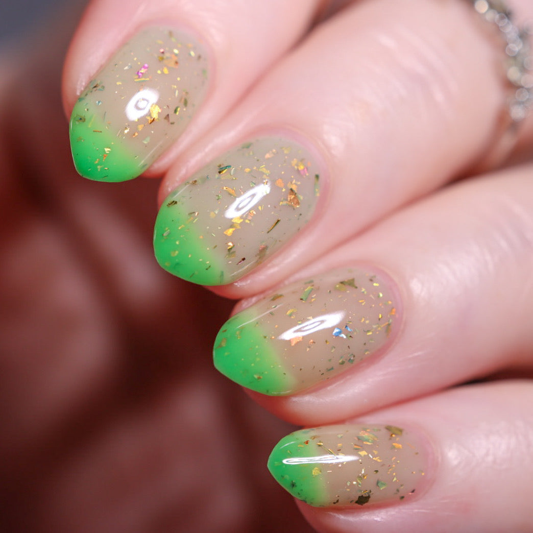 A bright green (cold) to yellow (in-between) to white (warm) tri-thermal with copper to bronze flakes!