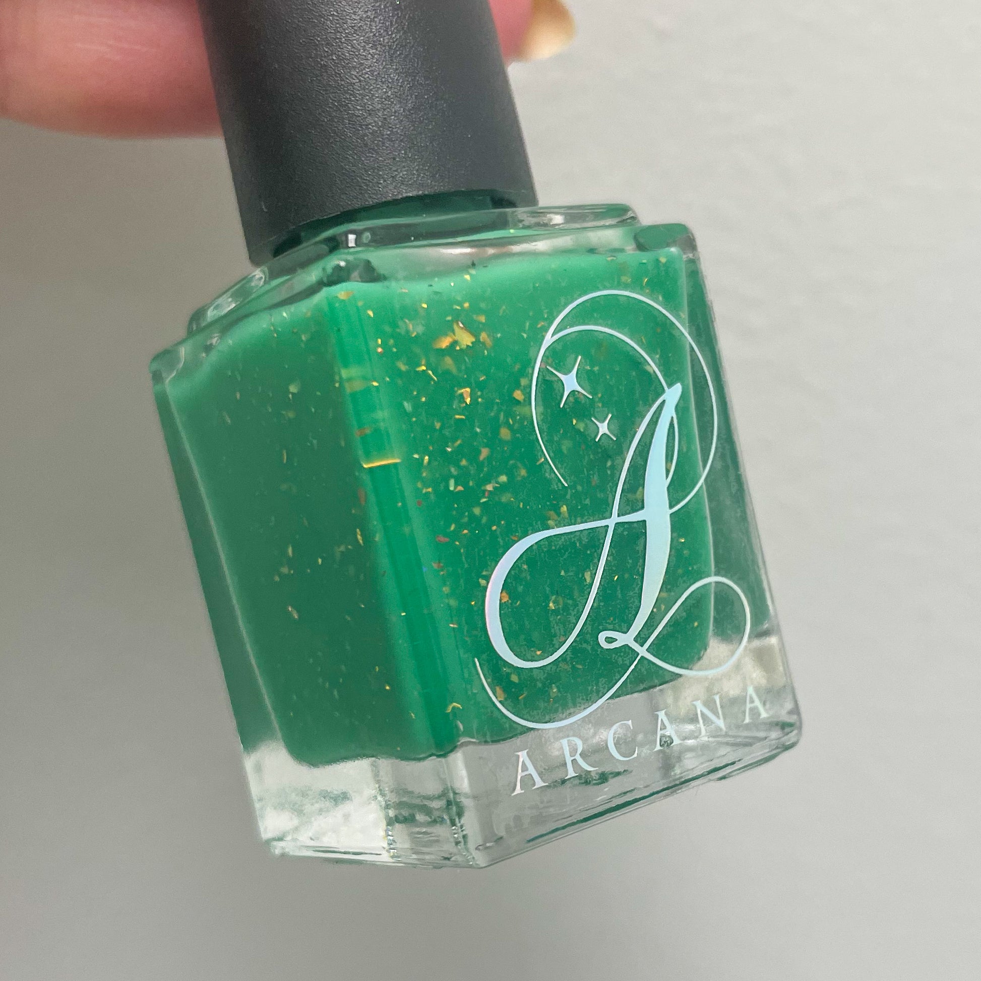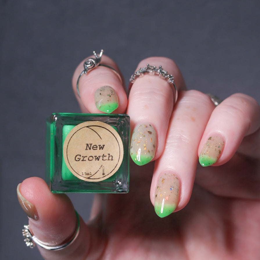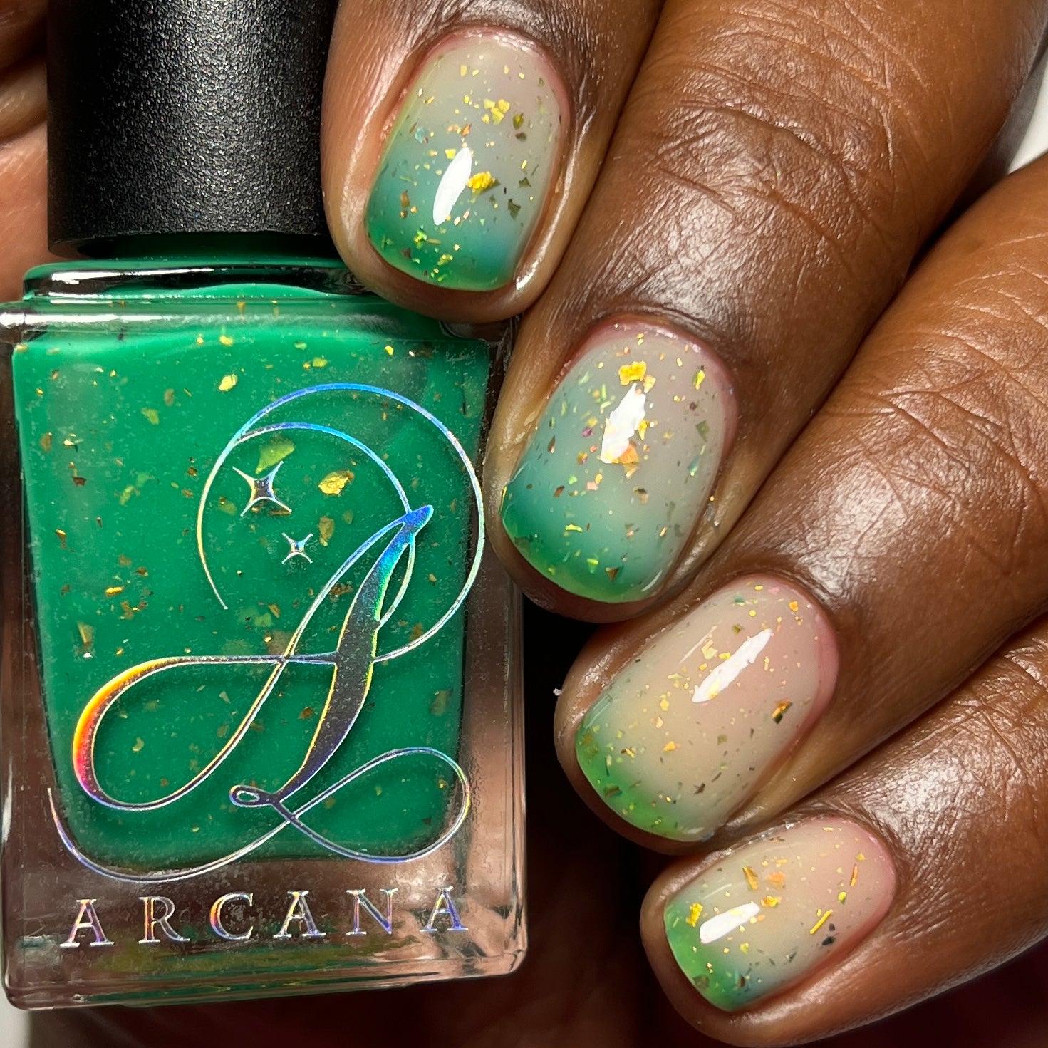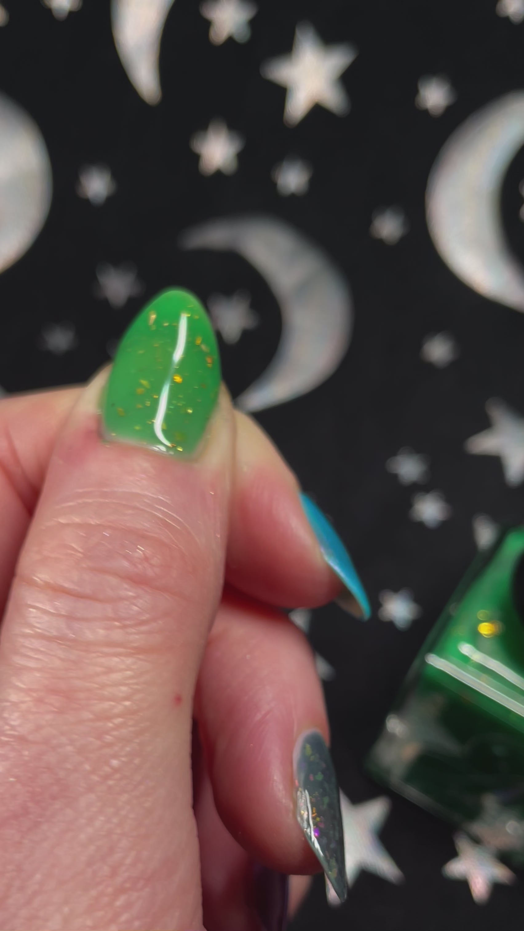 A bright green (cold) to yellow (in-between) to white (warm) tri-thermal with copper to bronze flakes!