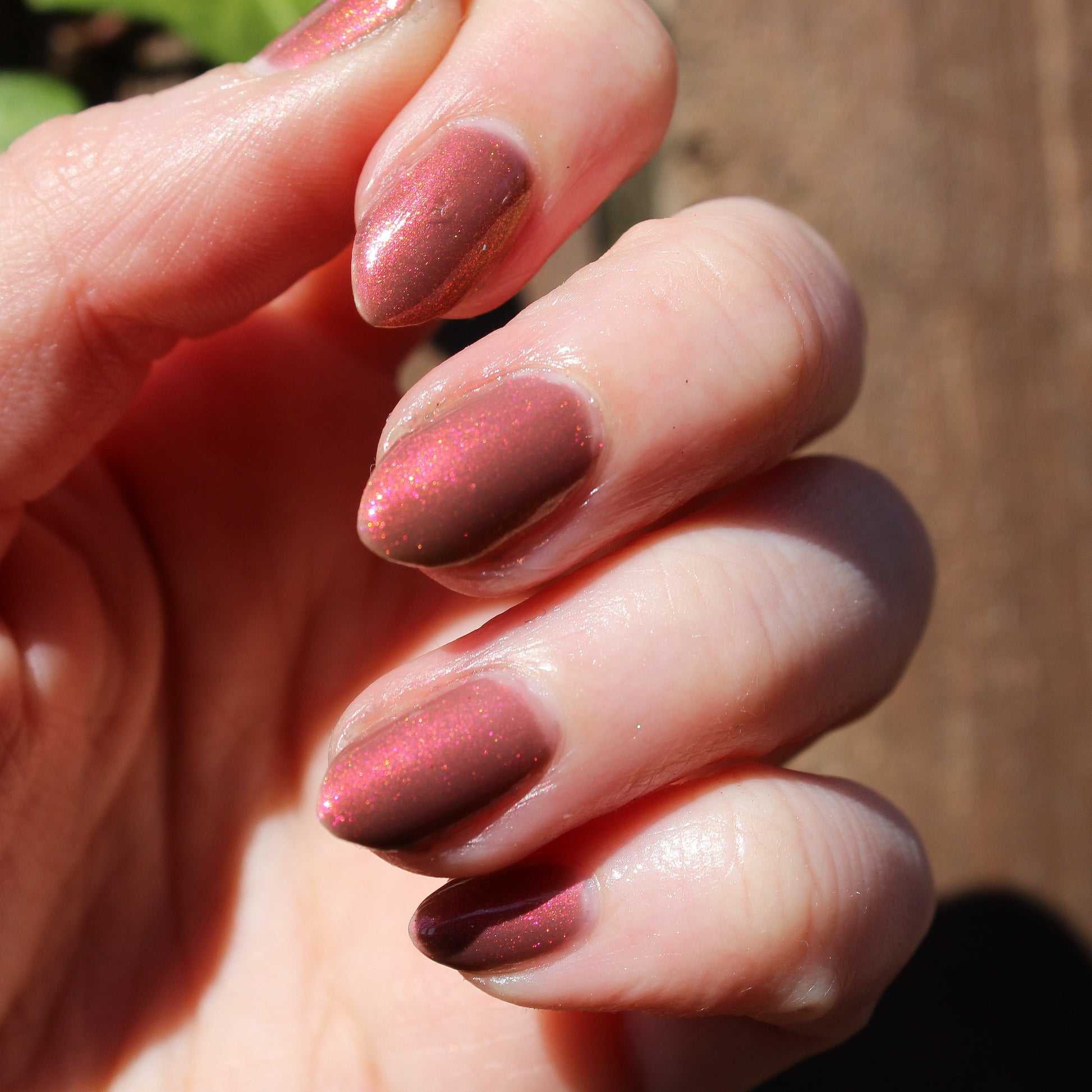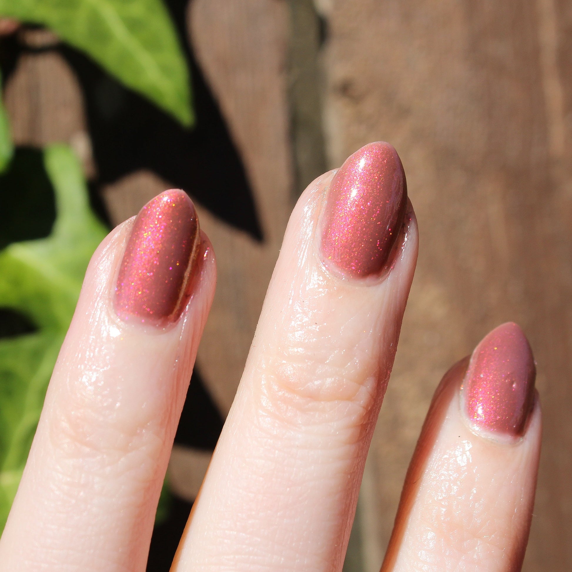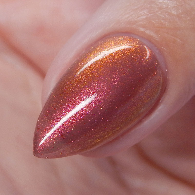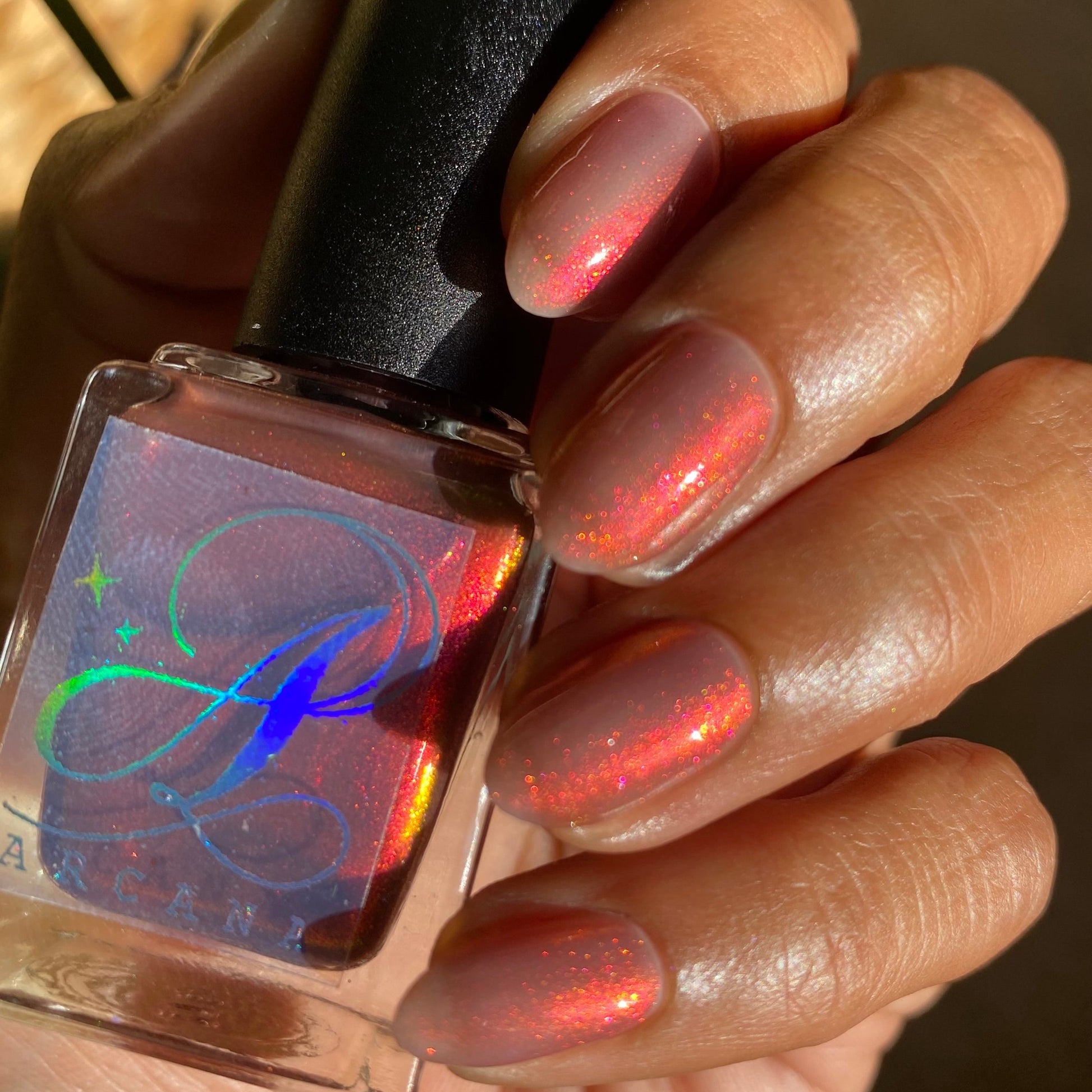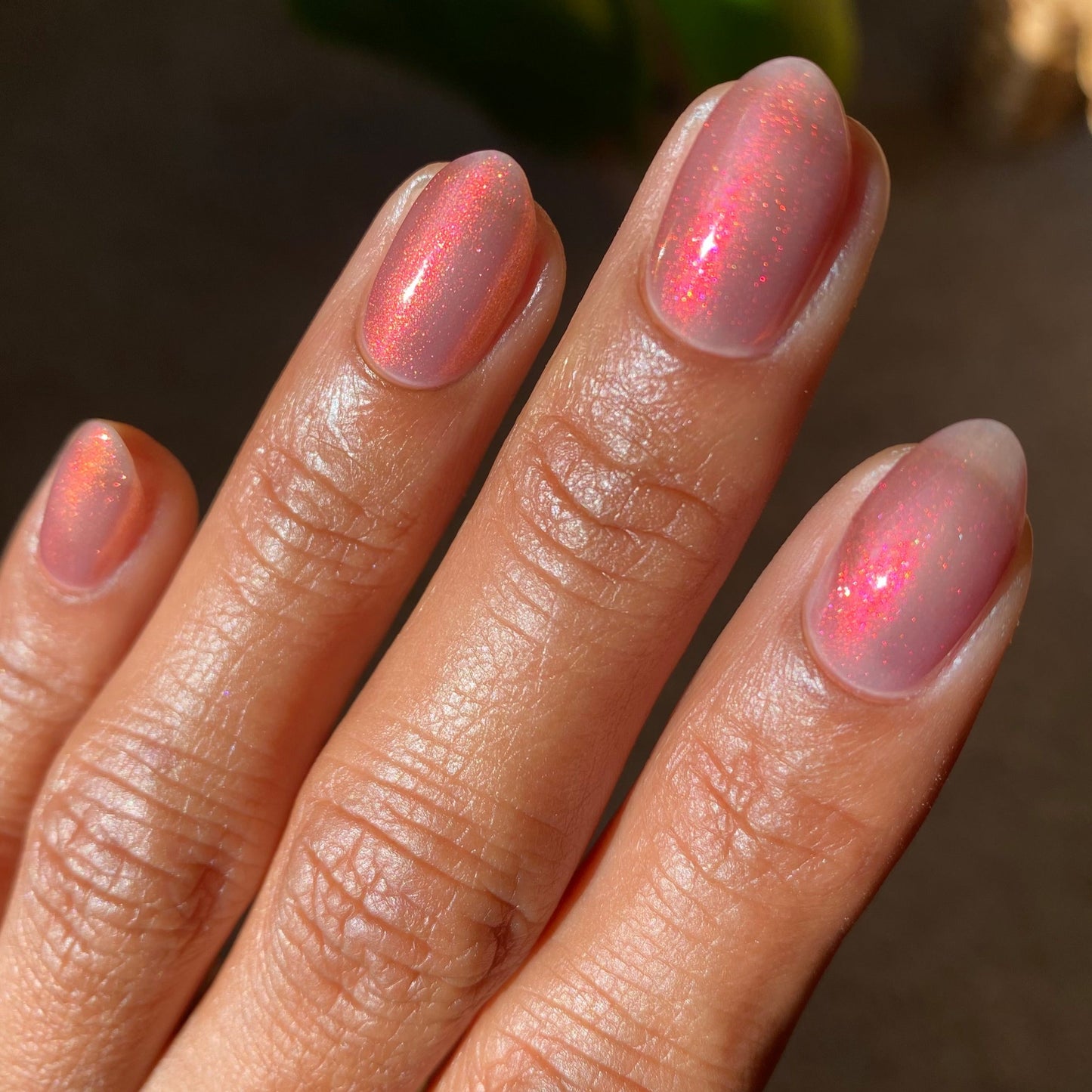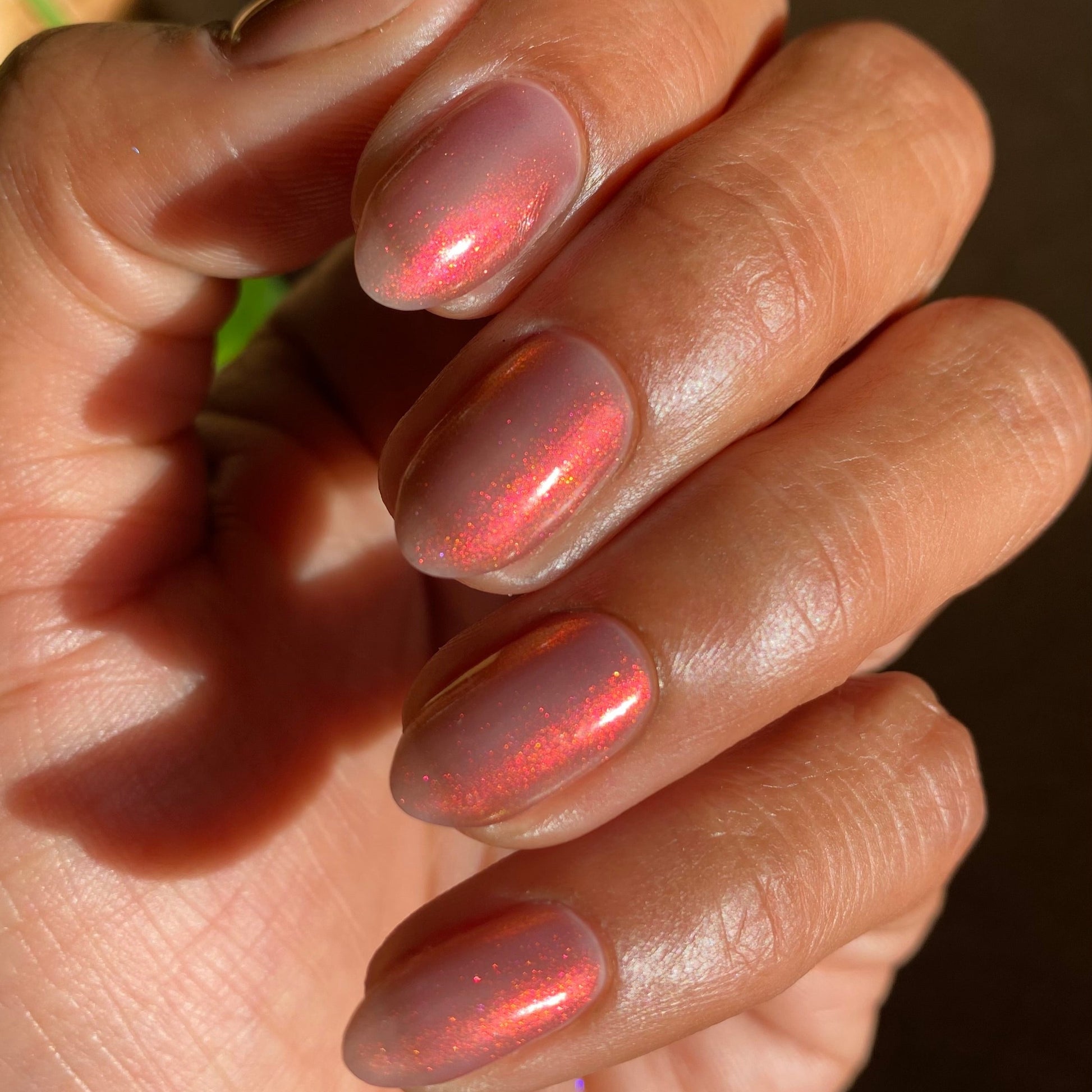 A light taupe/dusty rose jelly base filled with pink to orange to yellow shimmer that reads much more red in direct light.