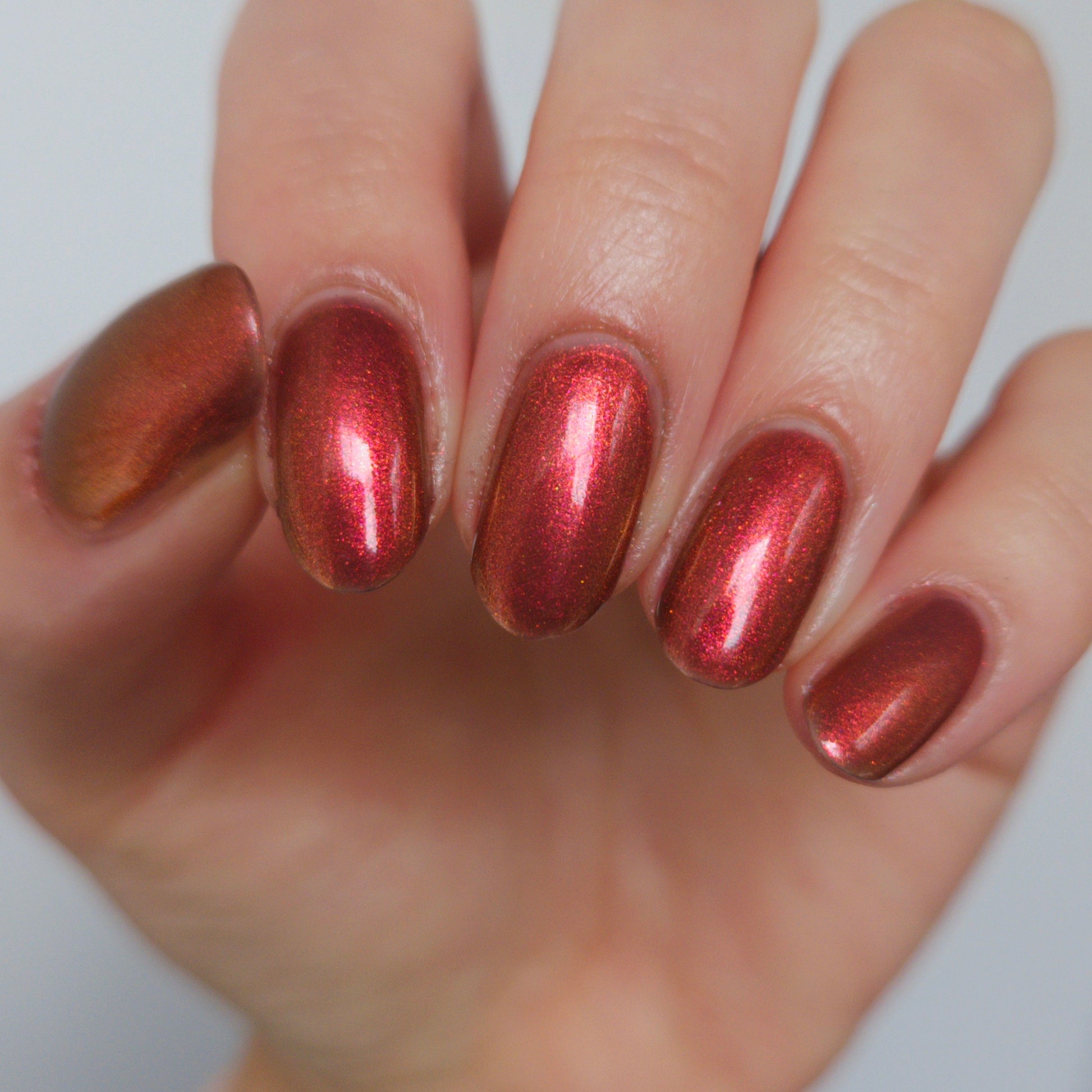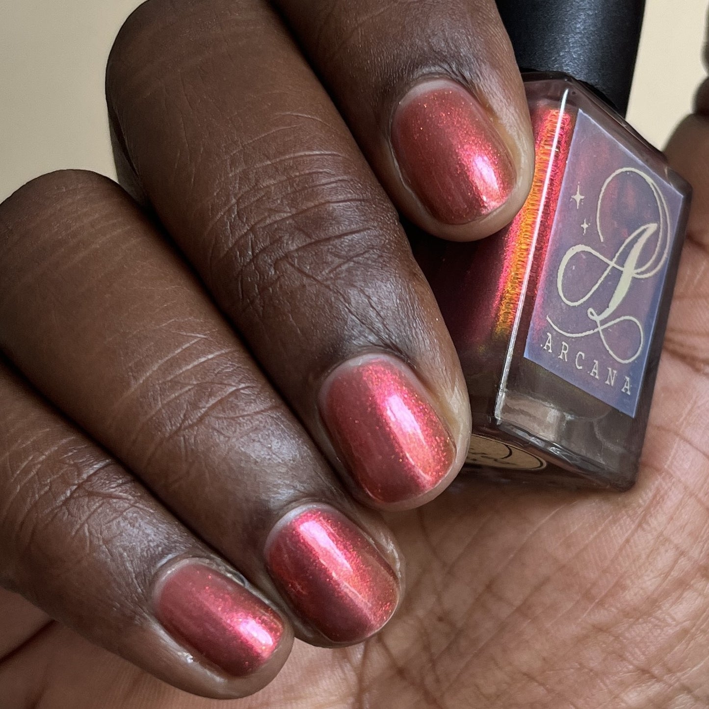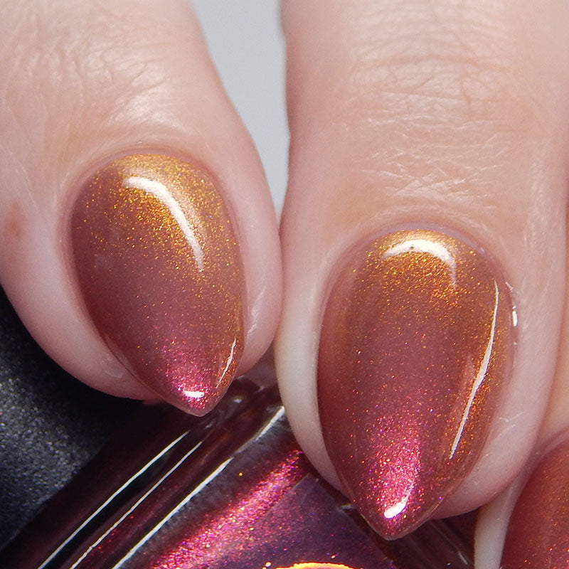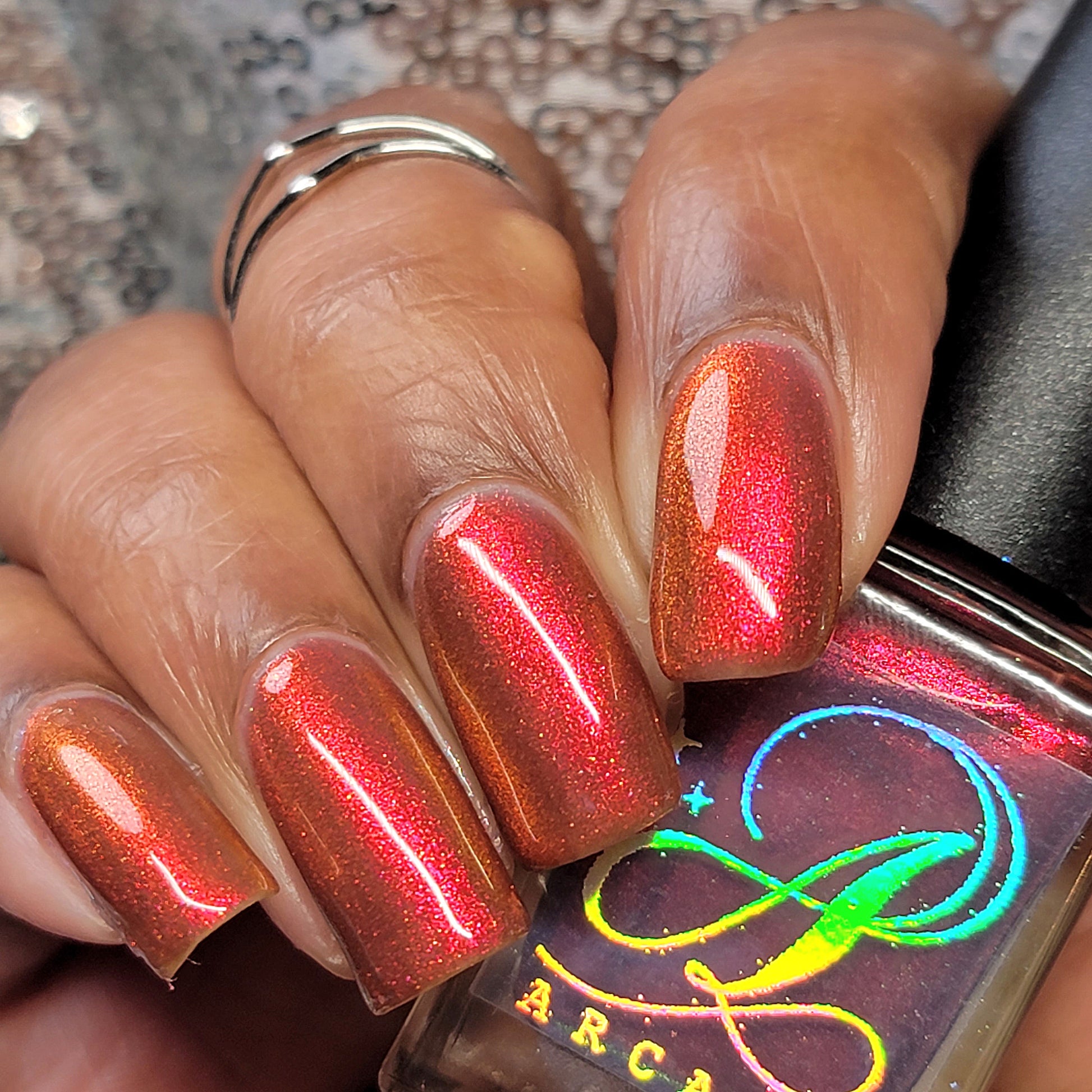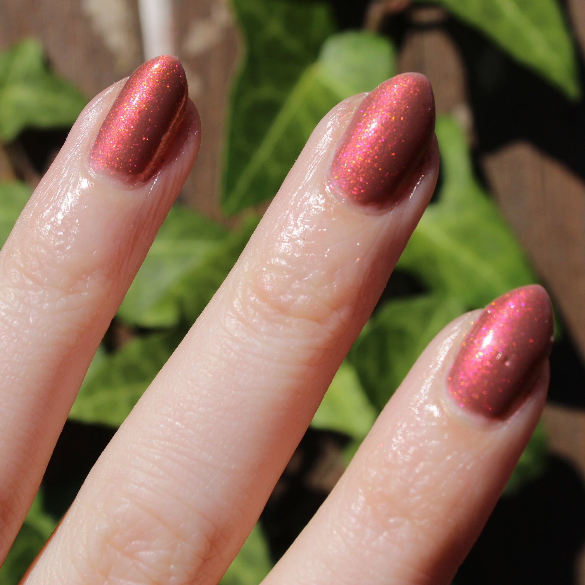 A light taupe/dusty rose jelly base filled with pink to orange to yellow shimmer that reads much more red in direct light.