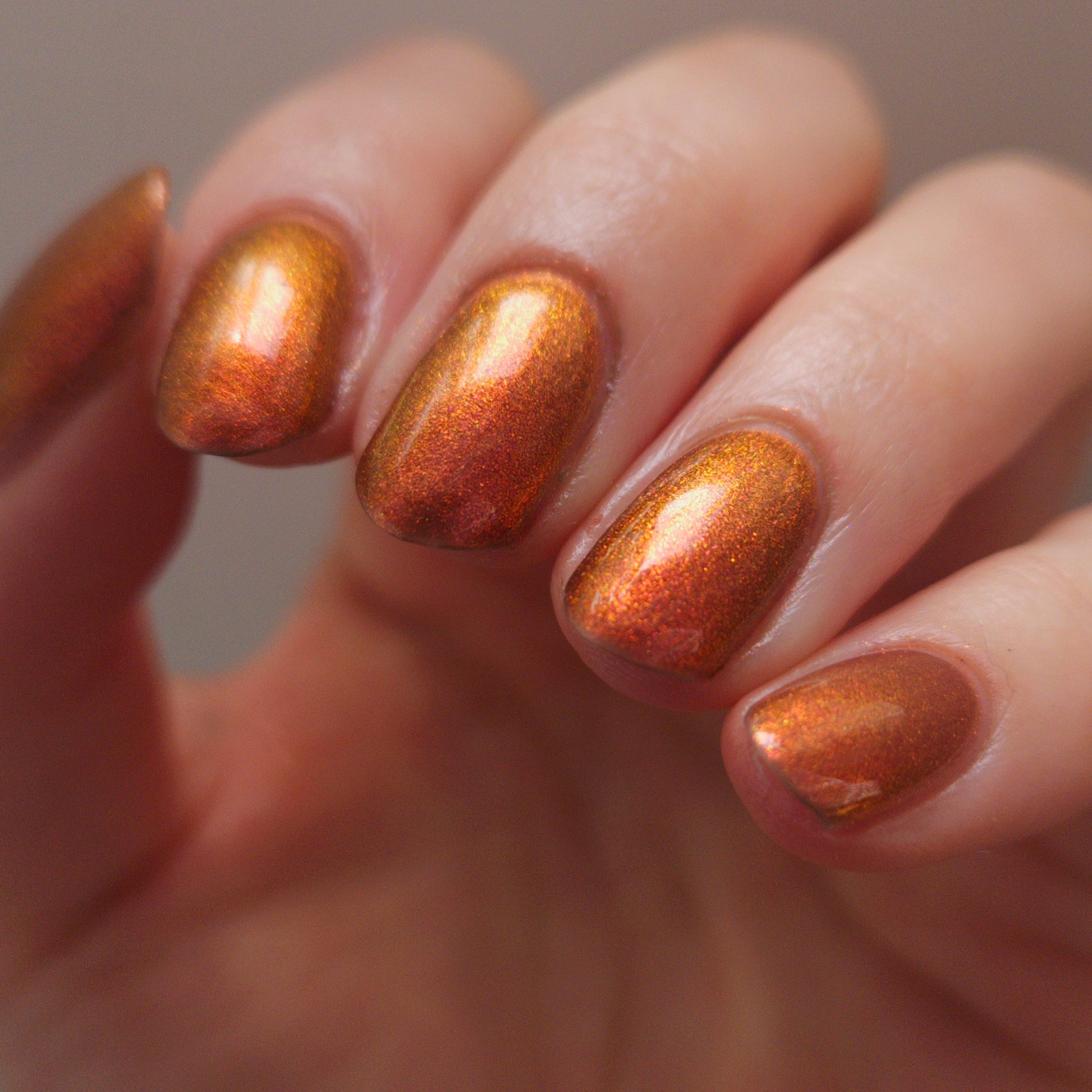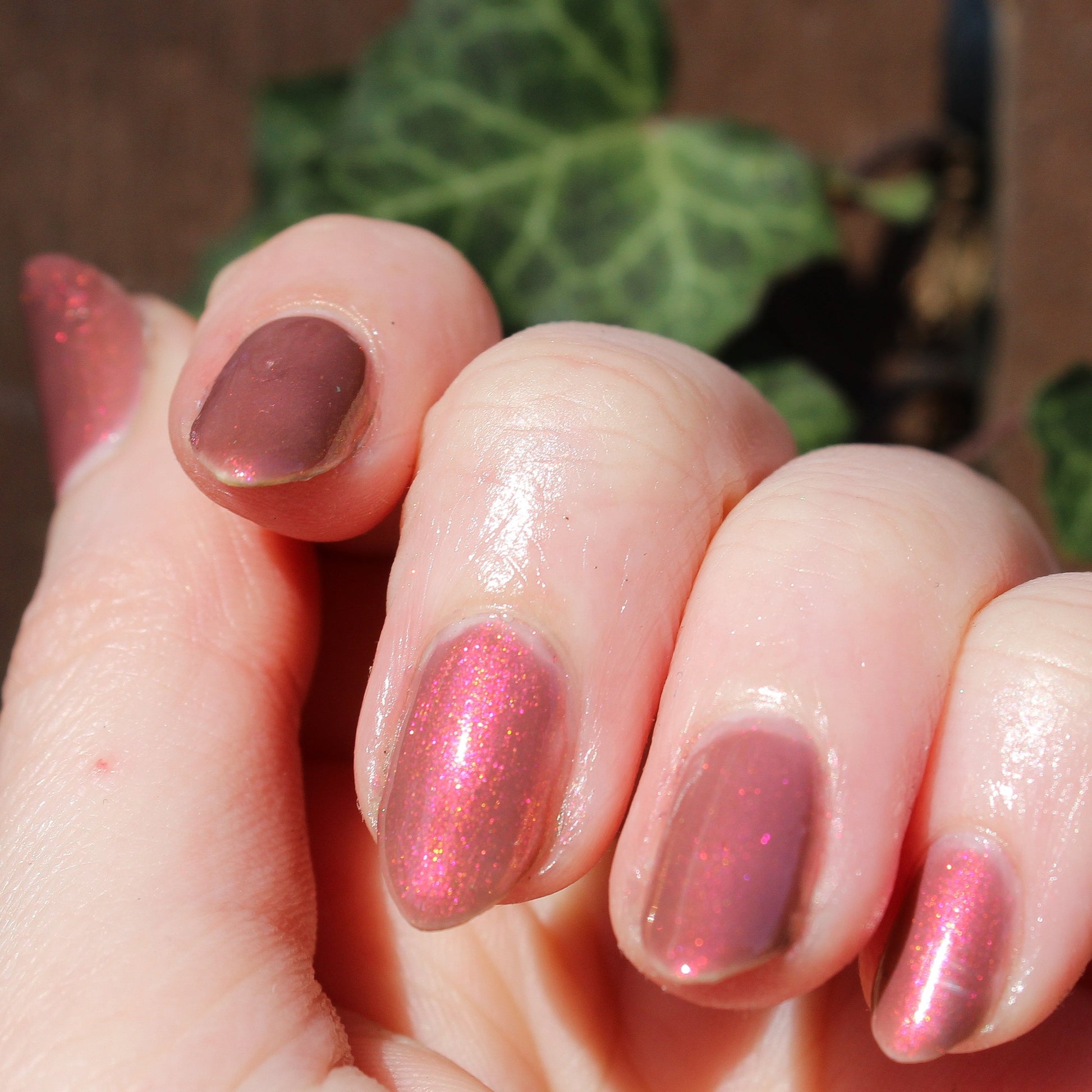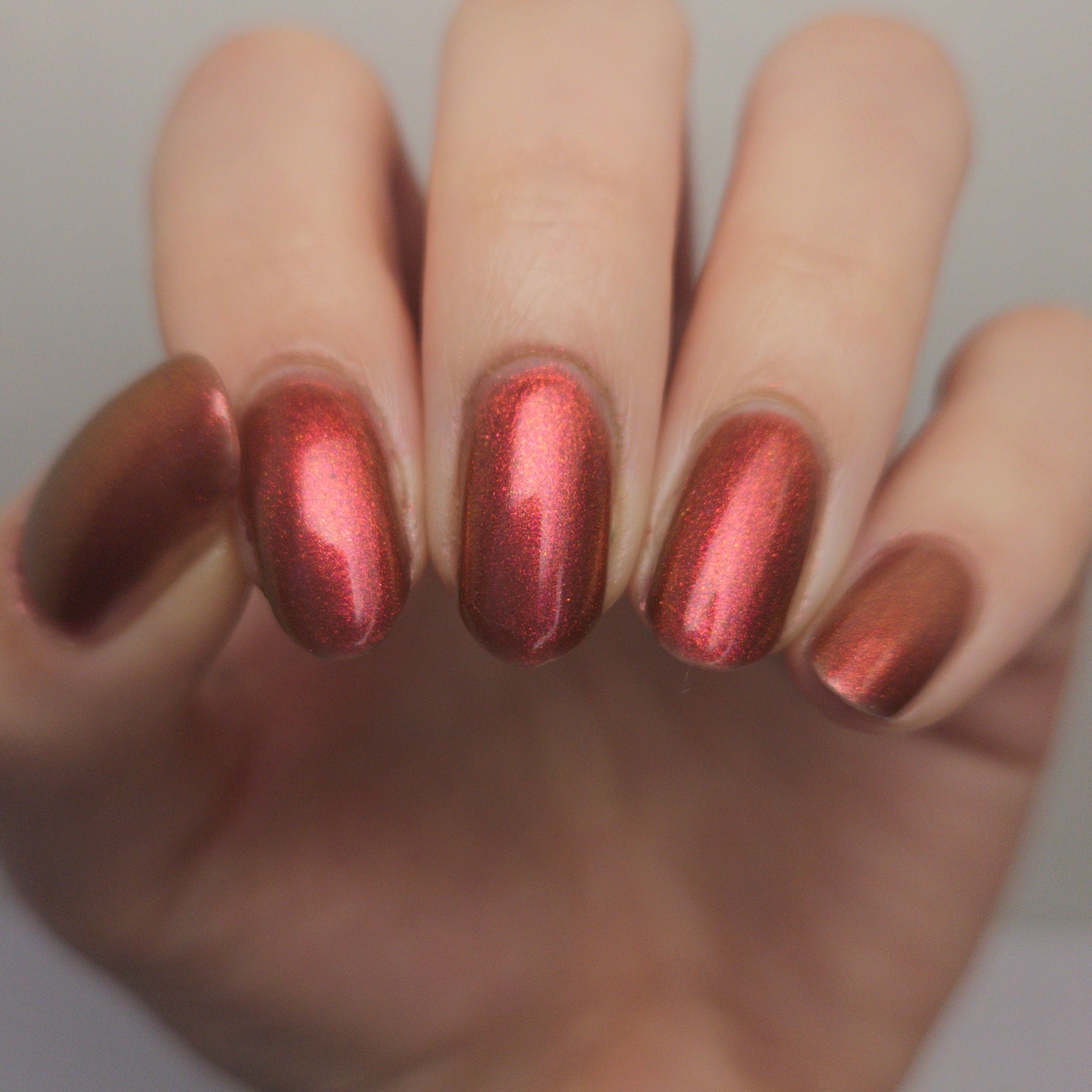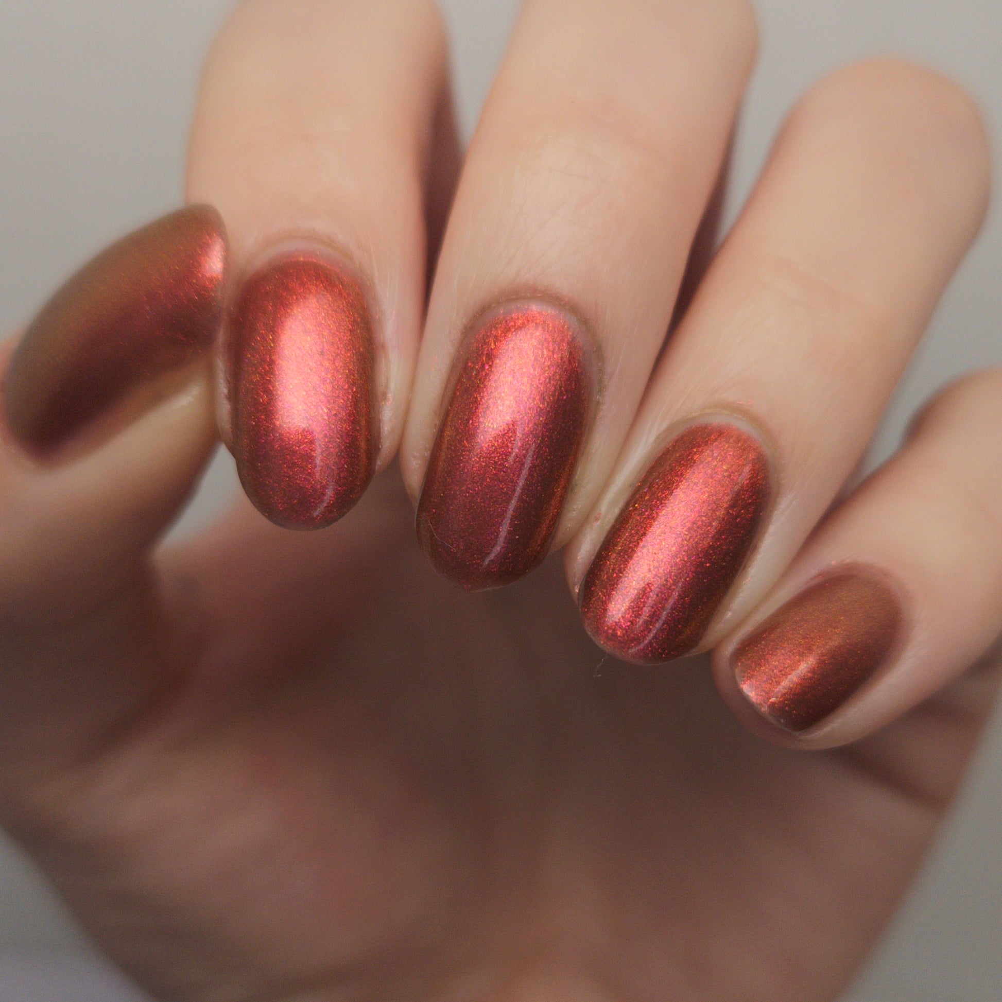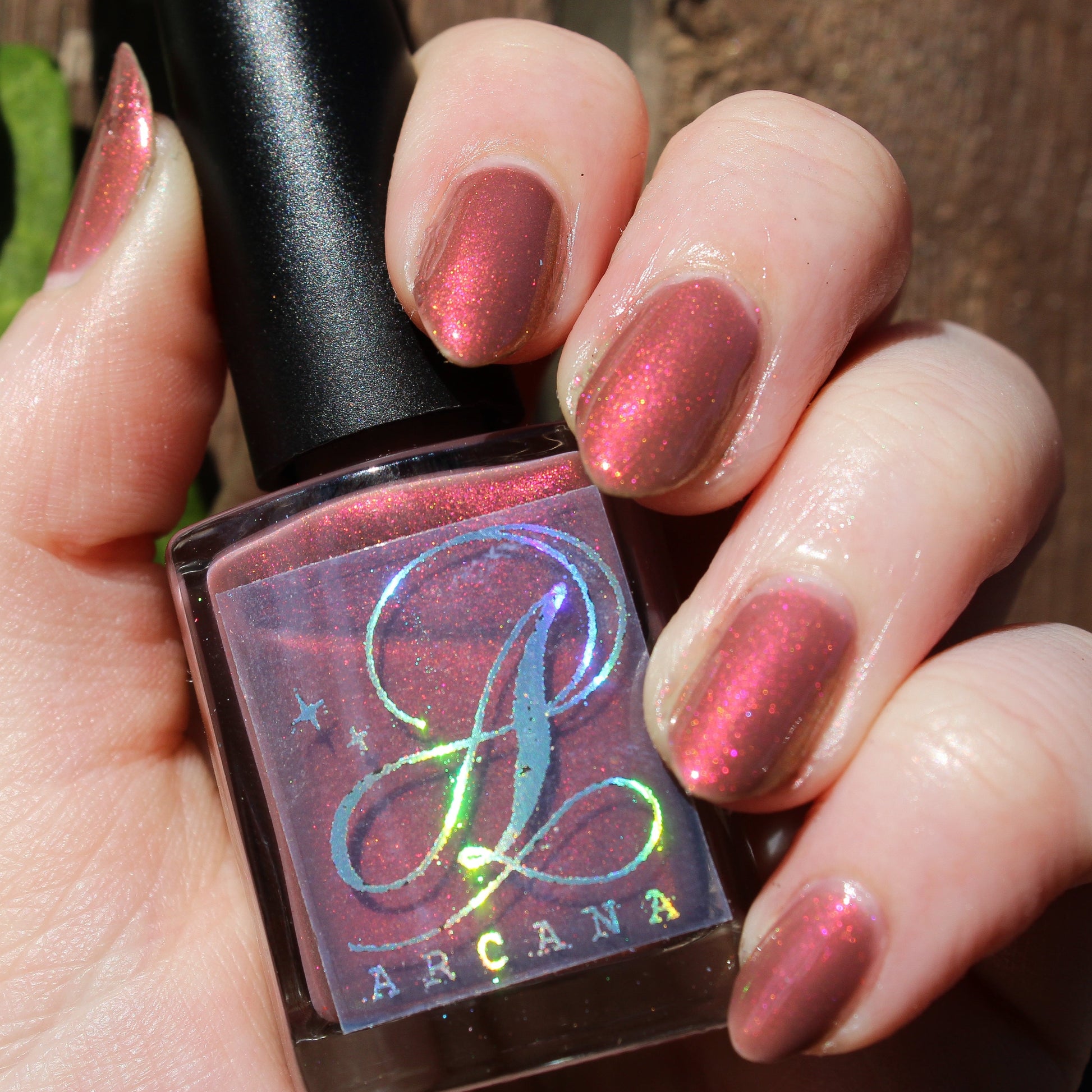A light taupe/dusty rose jelly base filled with pink to orange to yellow shimmer that reads much more red in direct light.