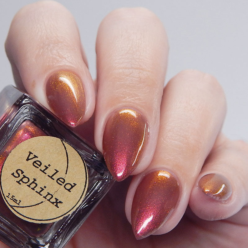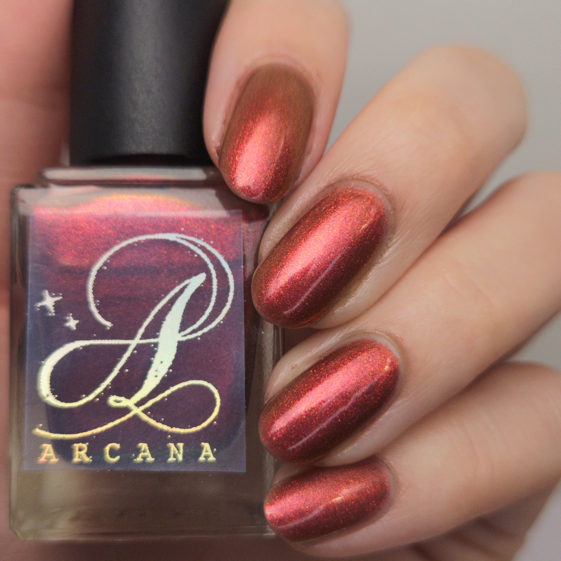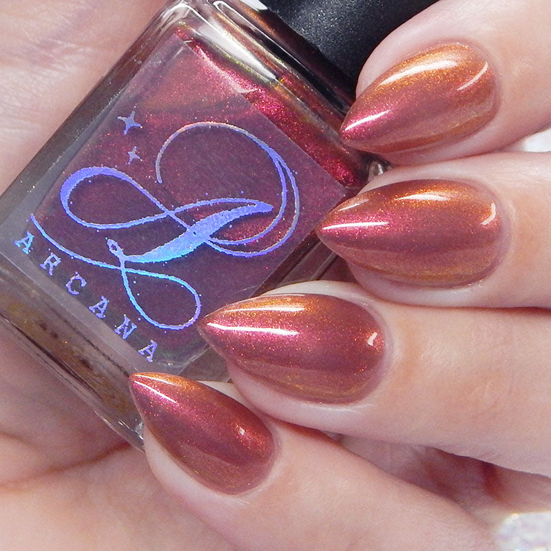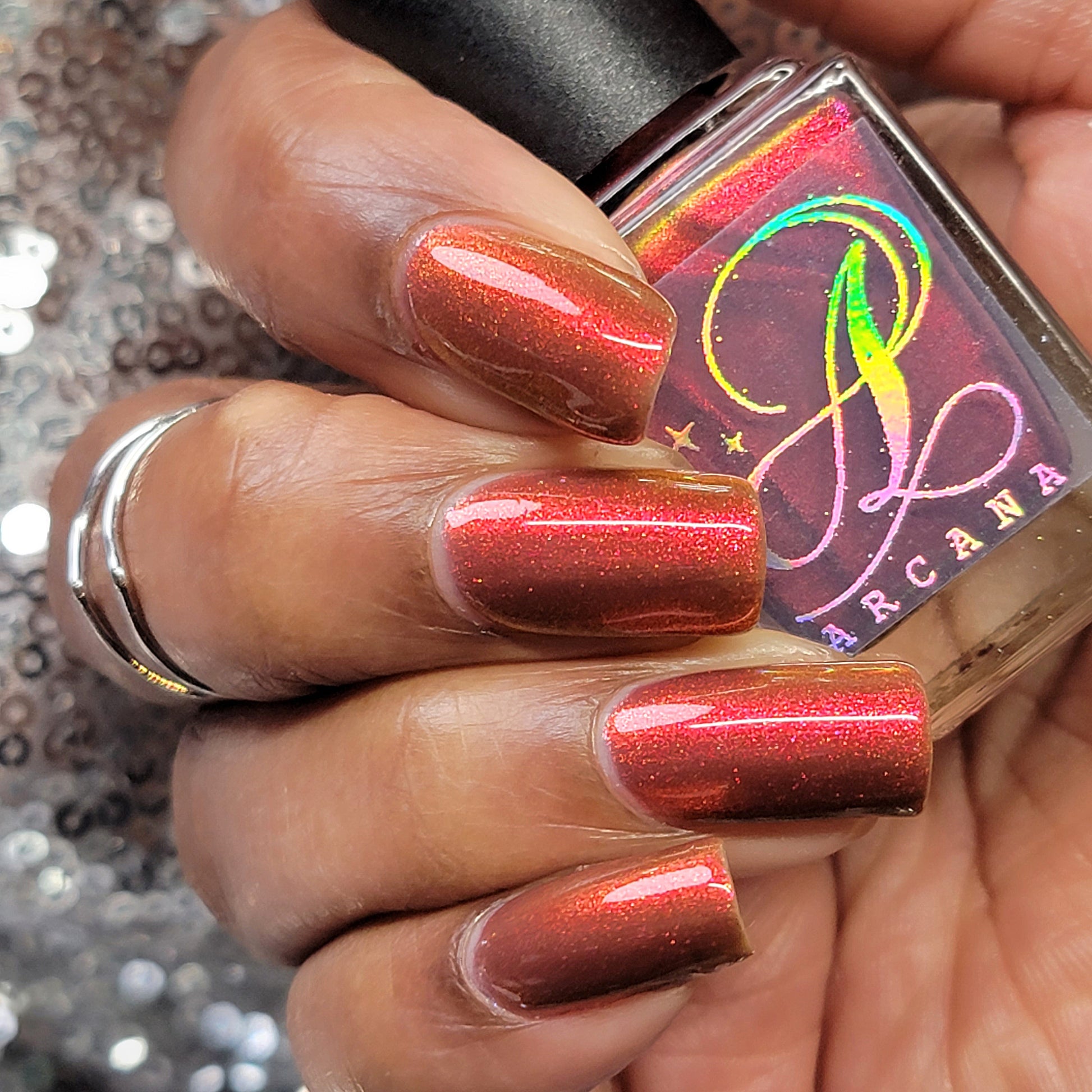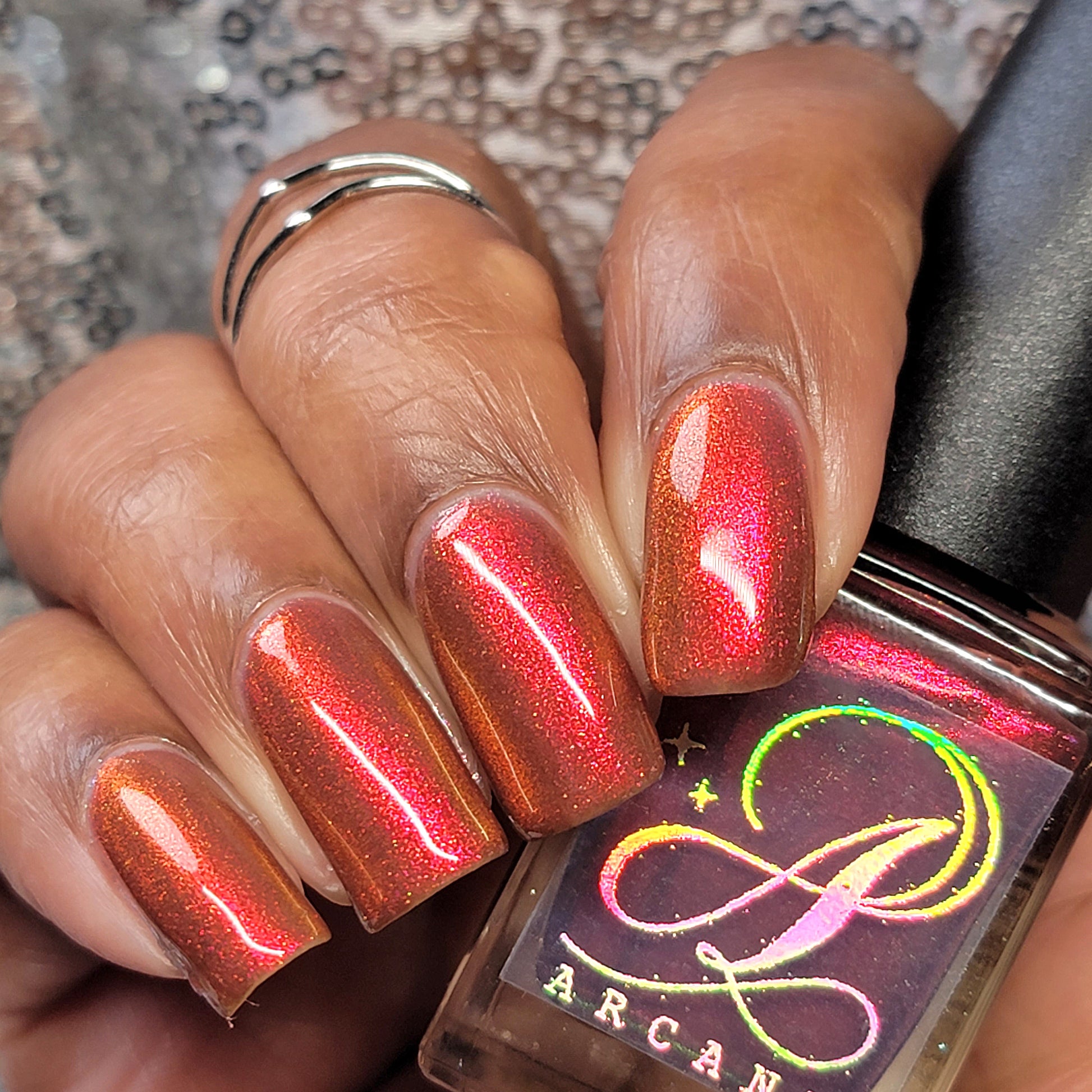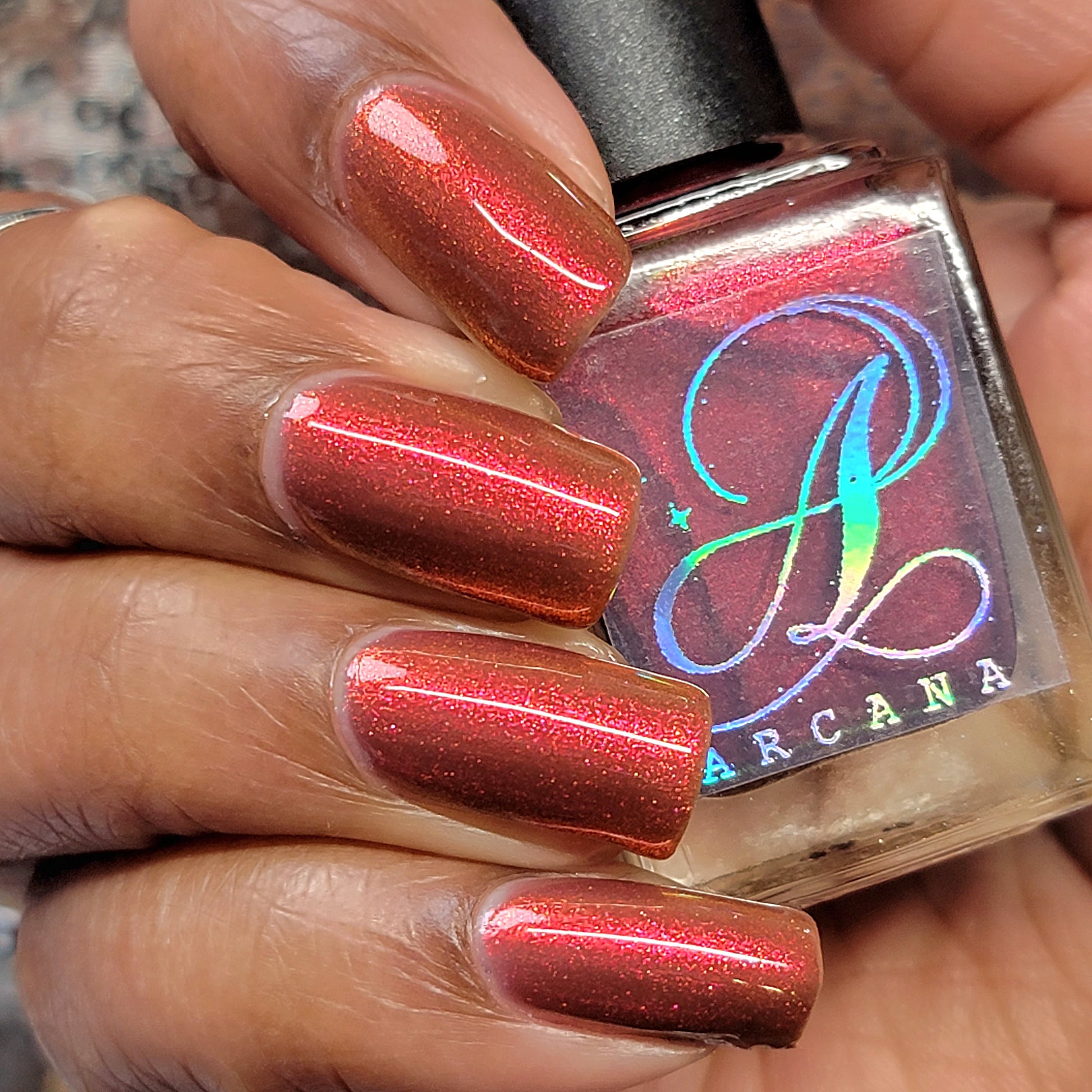 A light taupe/dusty rose jelly base filled with pink to orange to yellow shimmer that reads much more red in direct light.