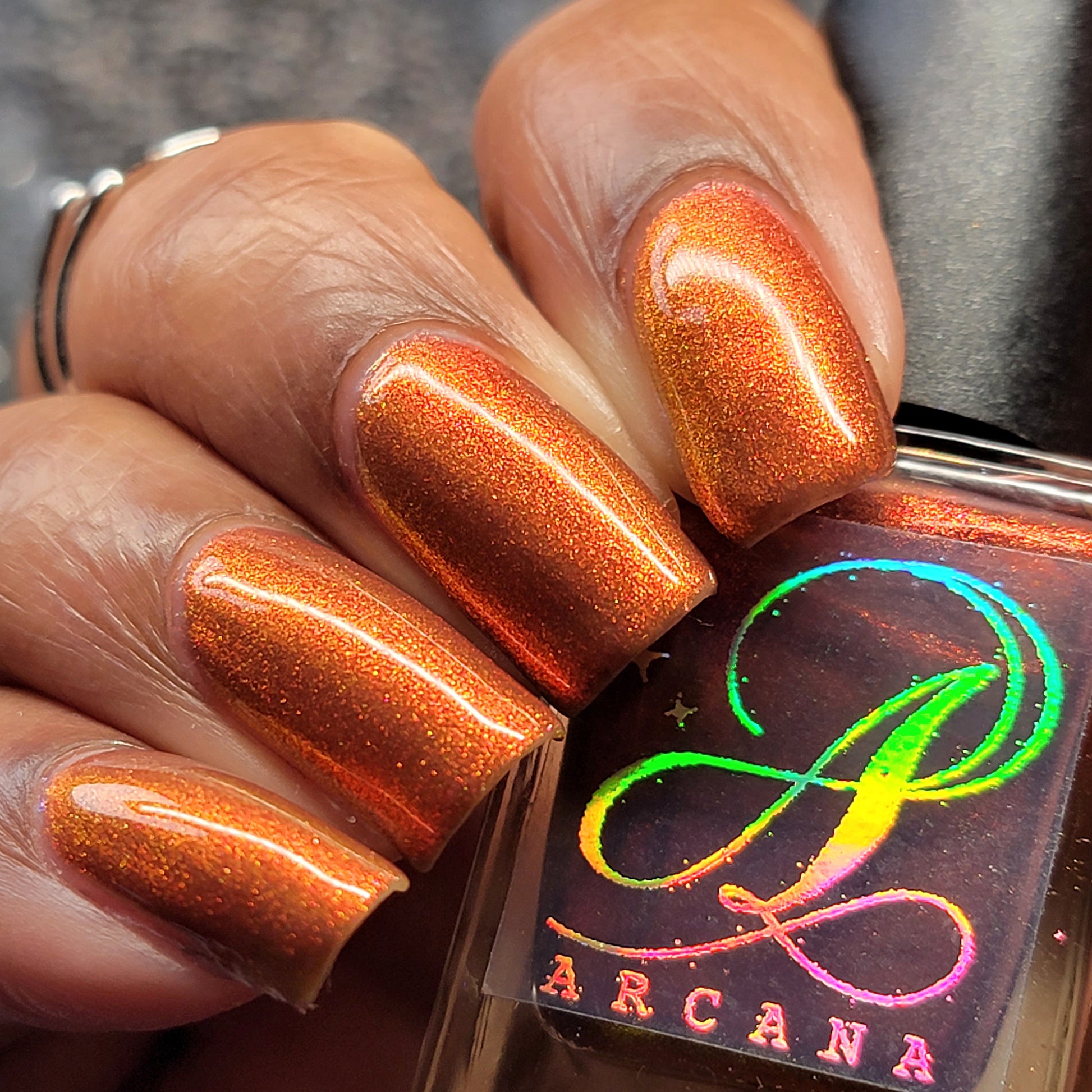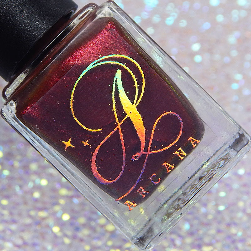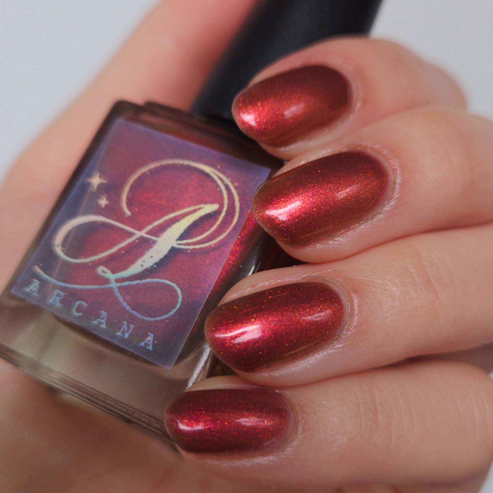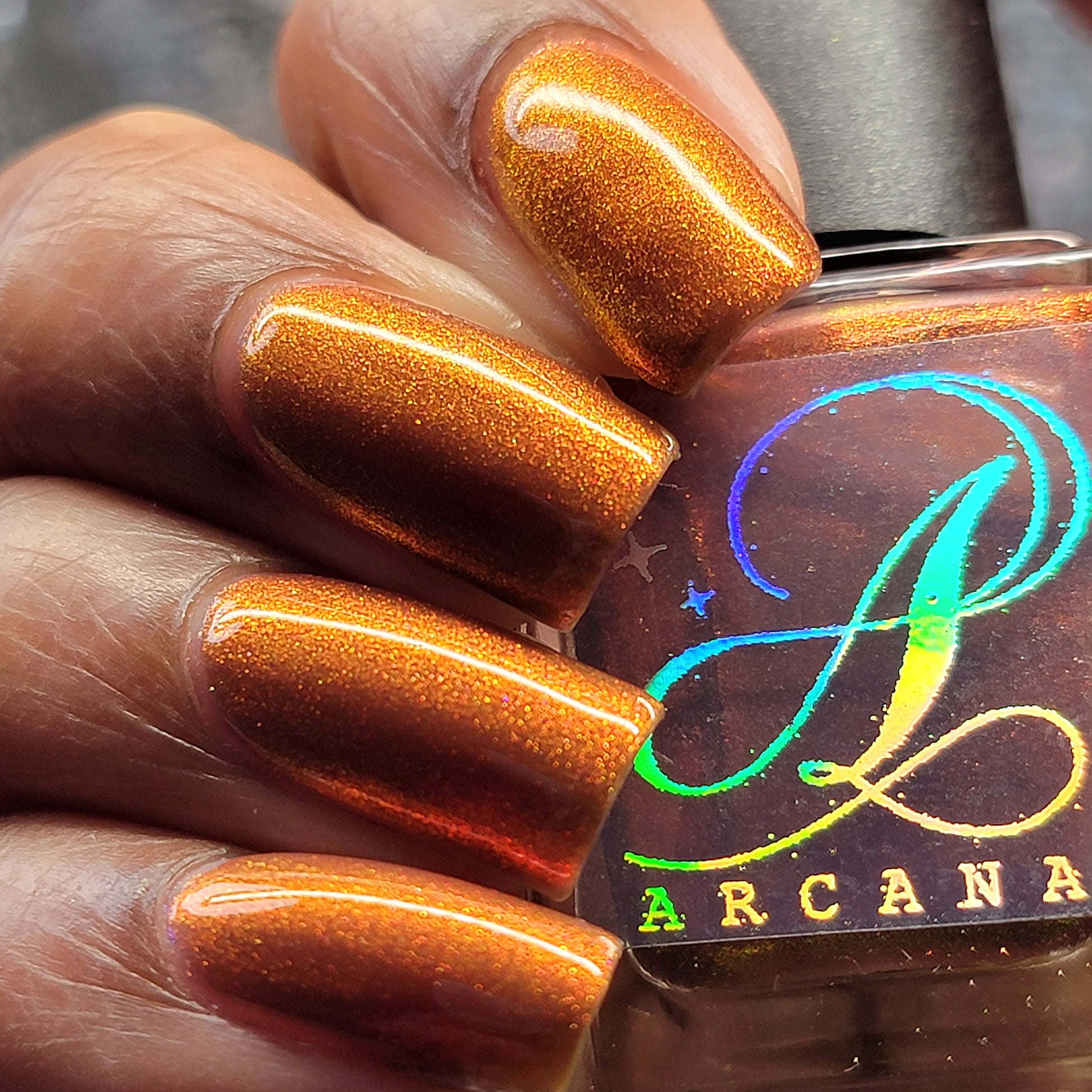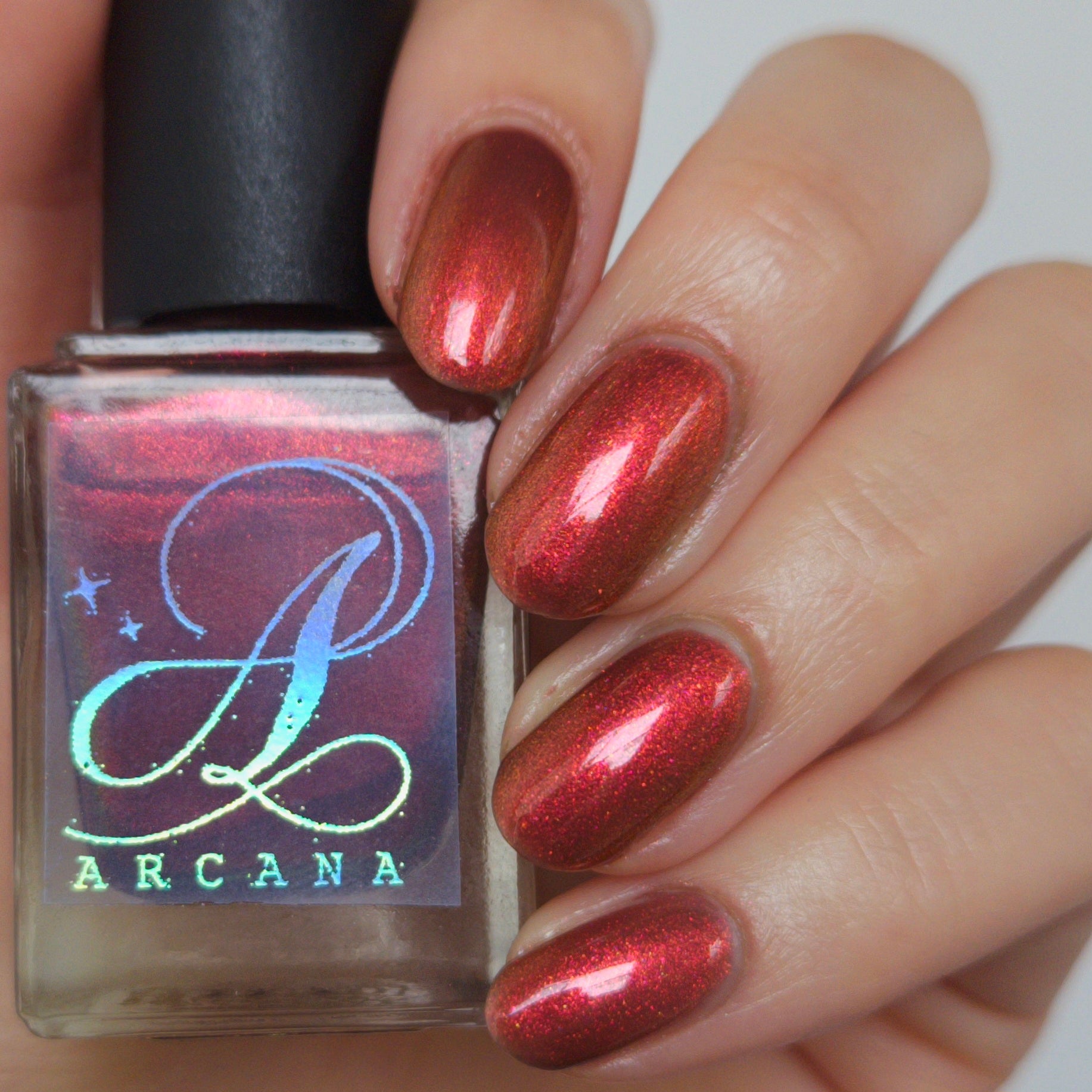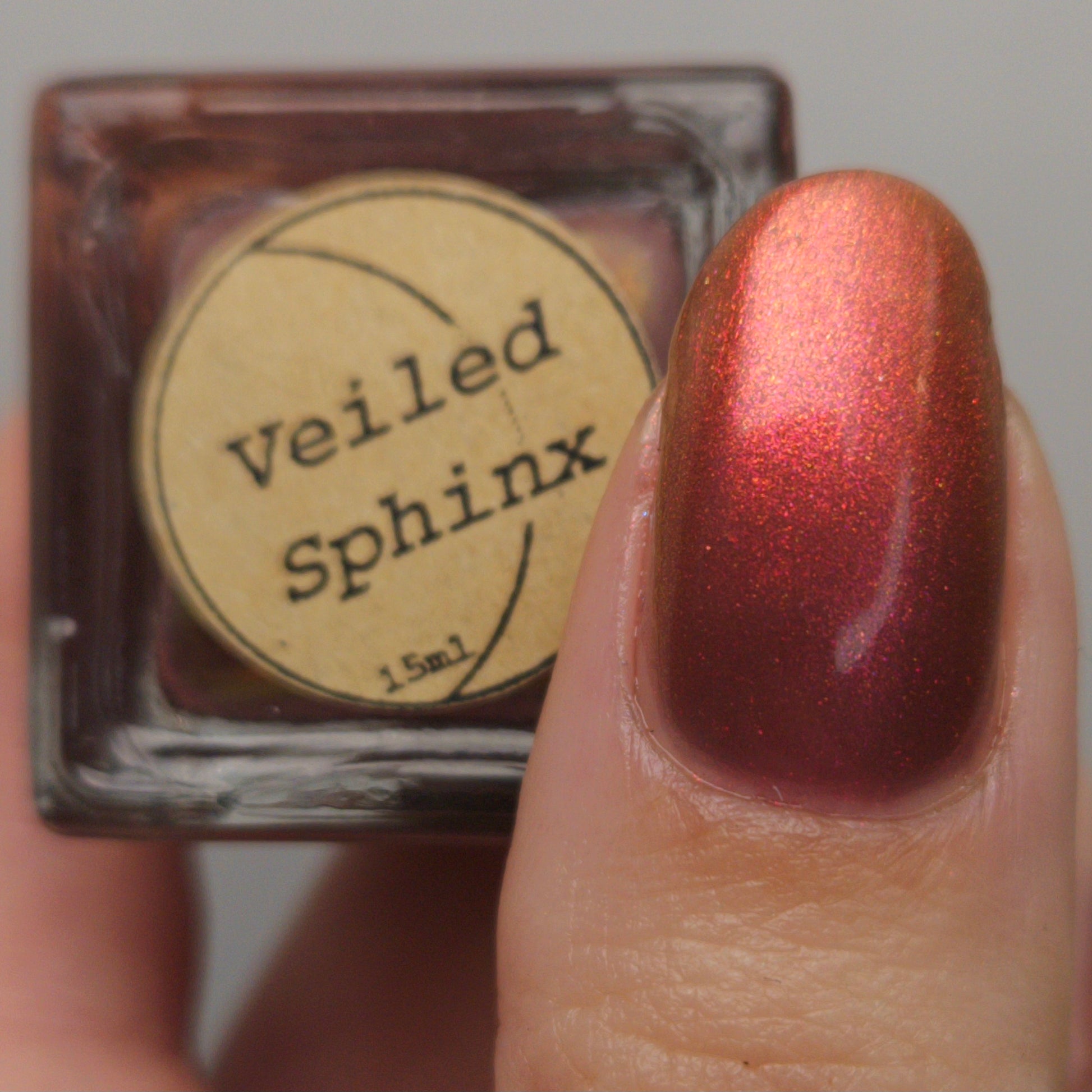 A light taupe/dusty rose jelly base filled with pink to orange to yellow shimmer that reads much more red in direct light.