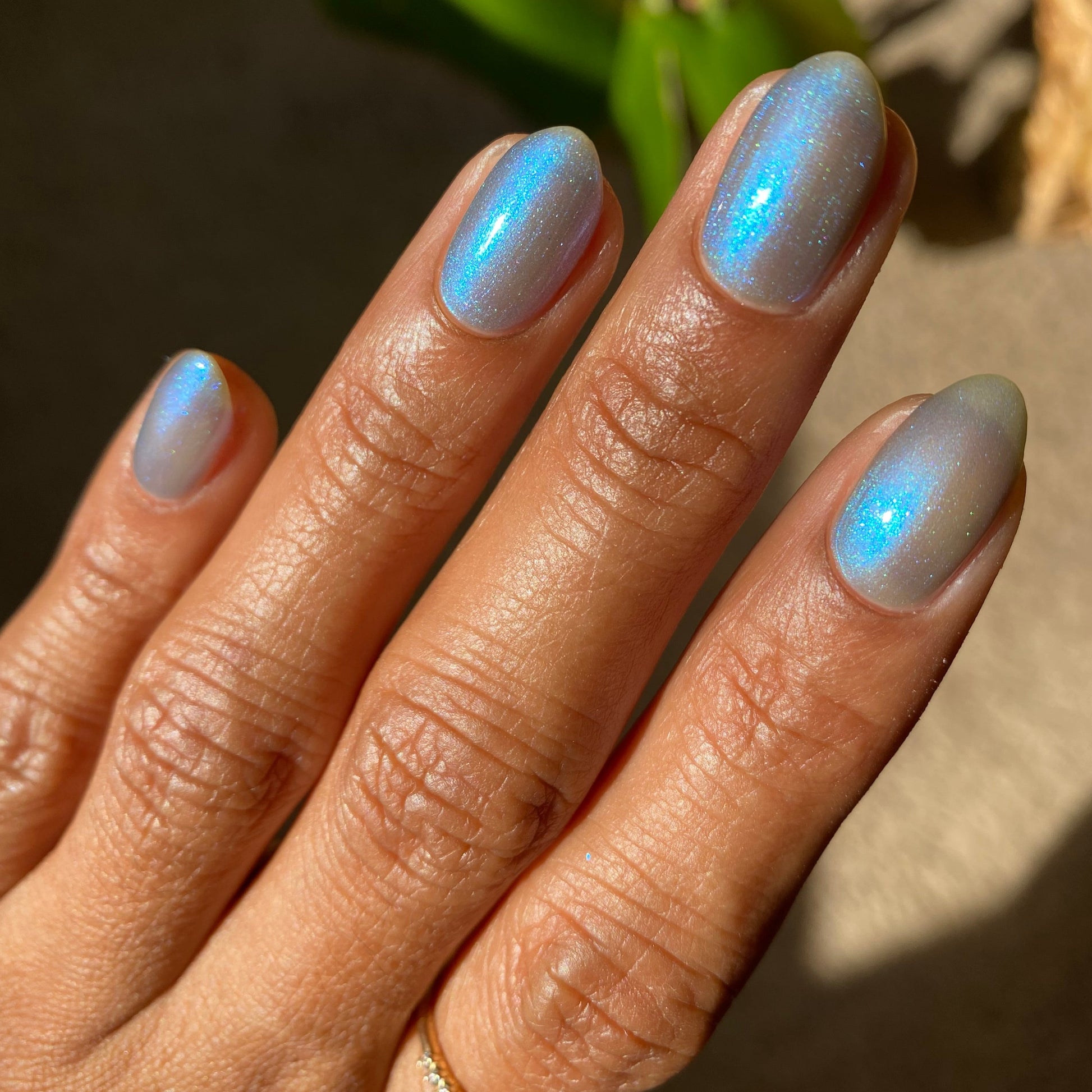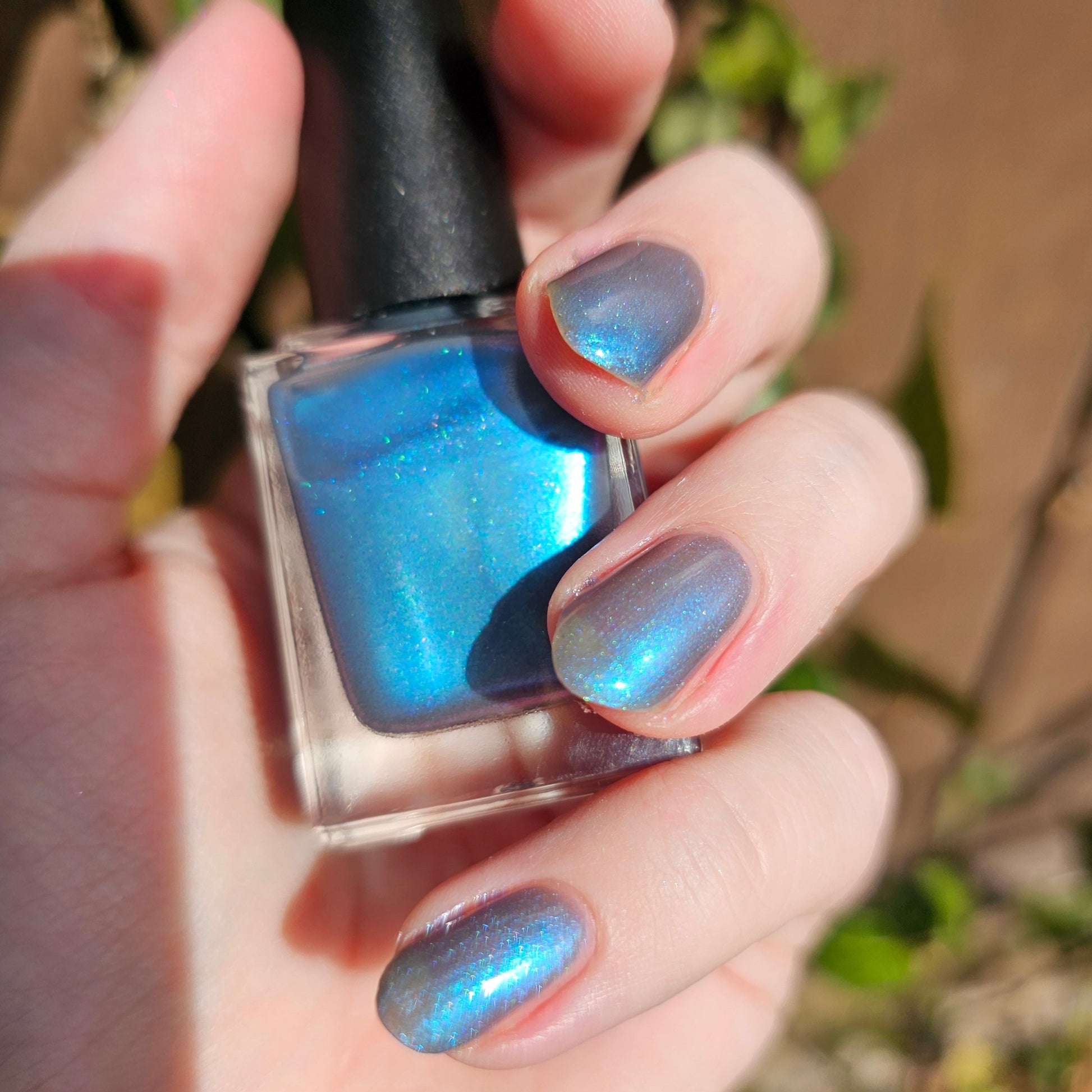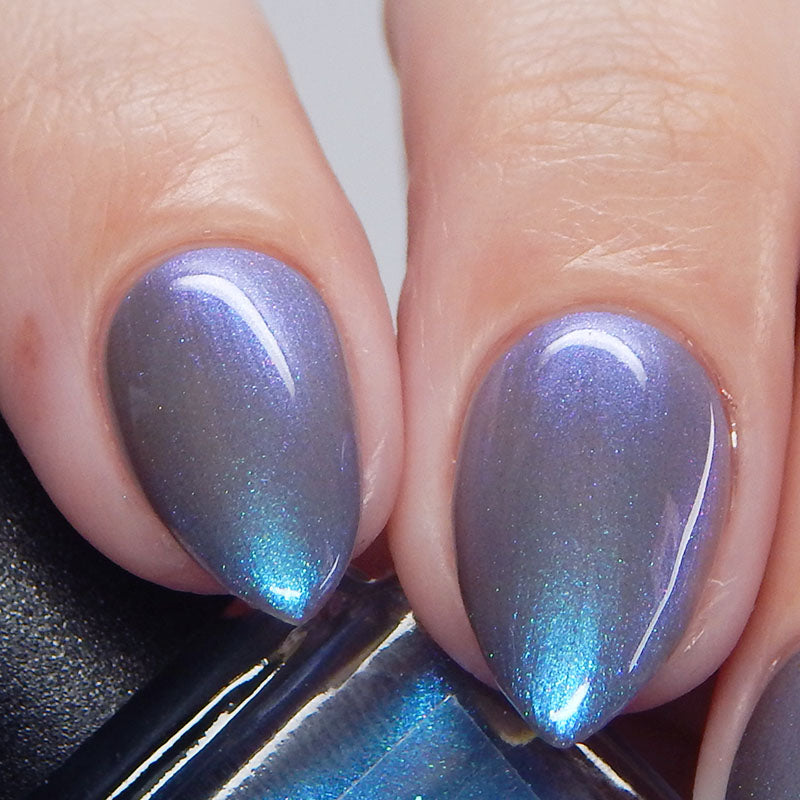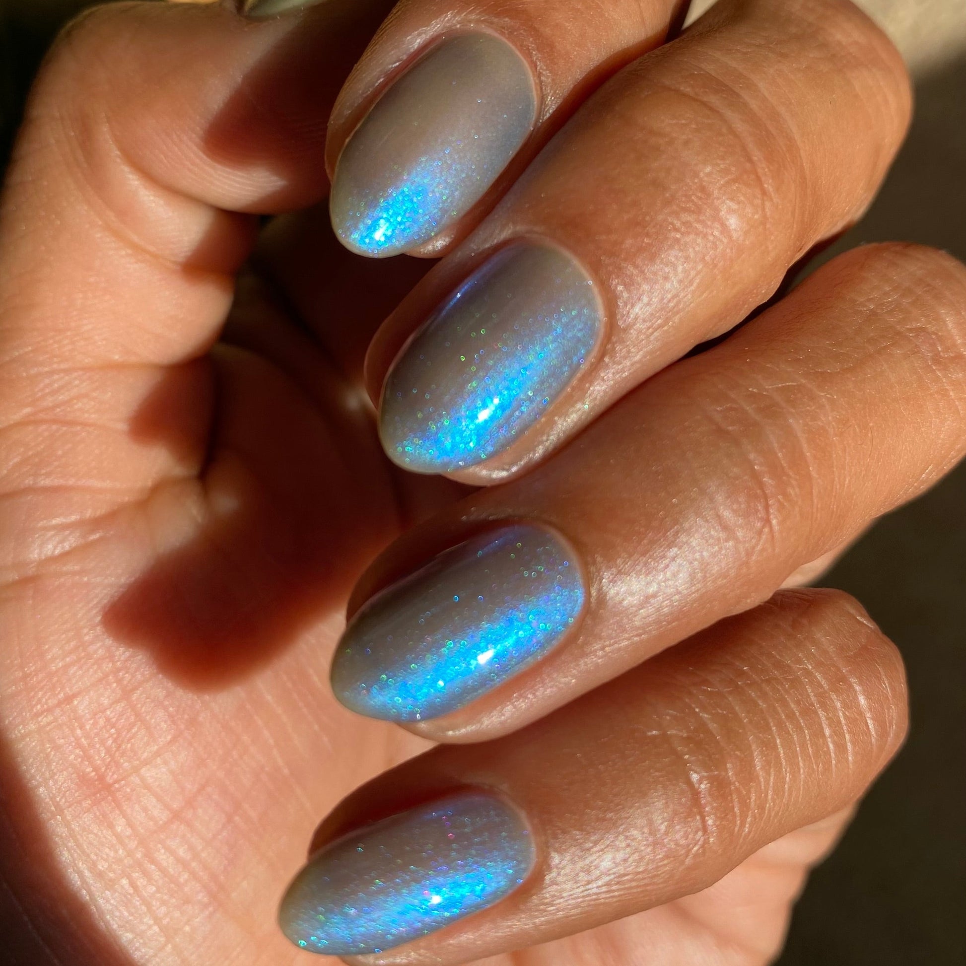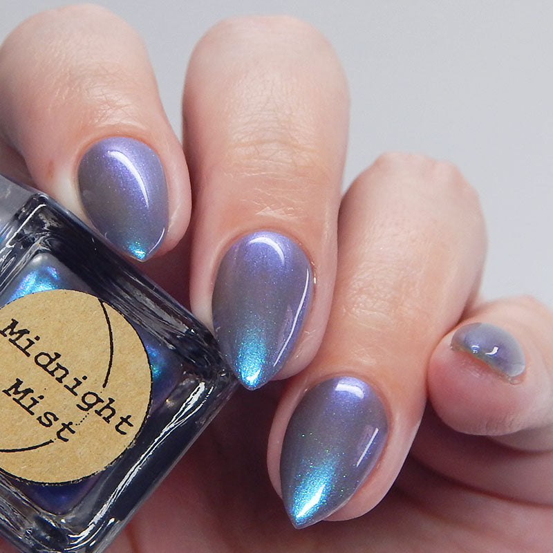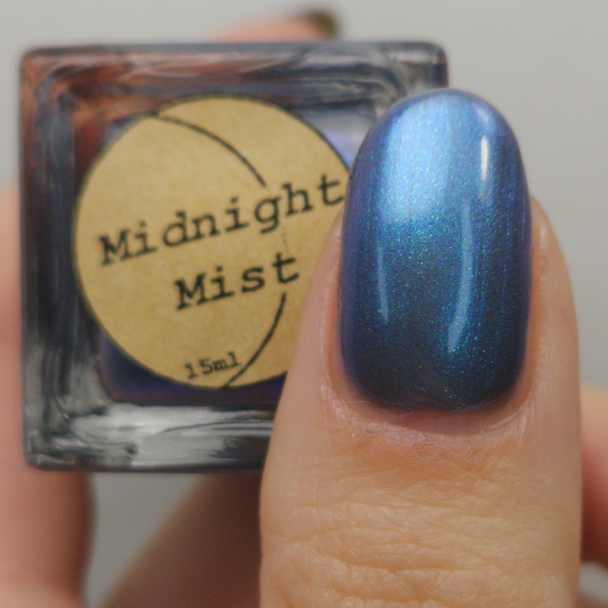 Midnight Mist has a gray jelly base with a shifty blue-purple pearl effect that glows bright blue in direct light.